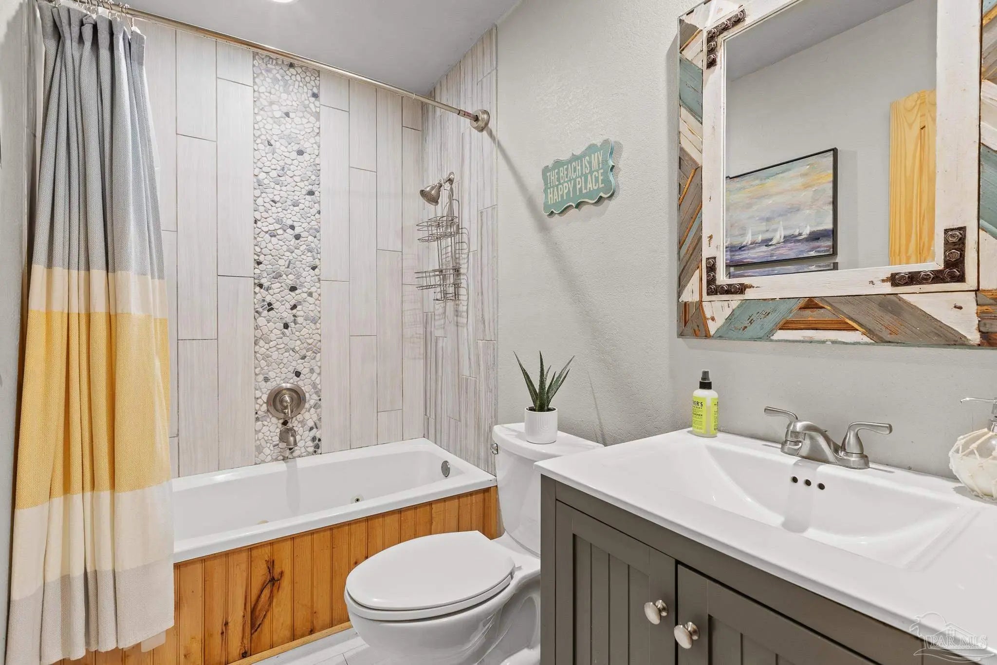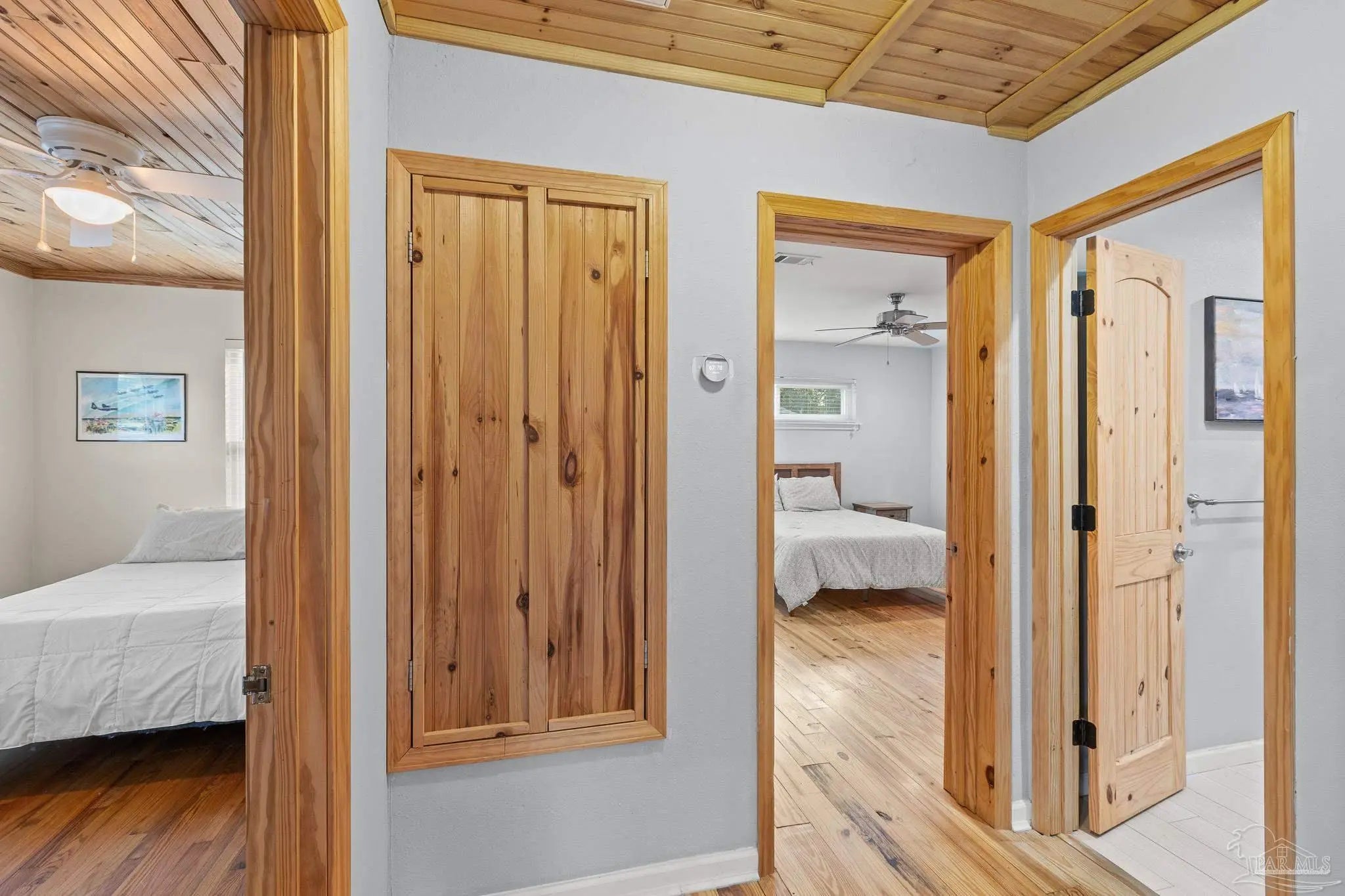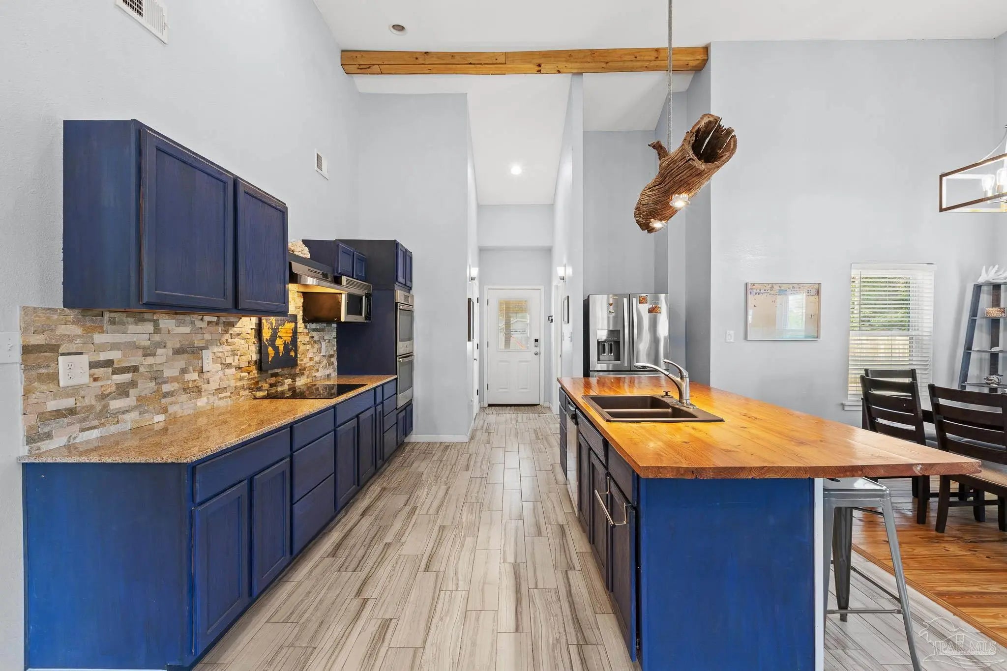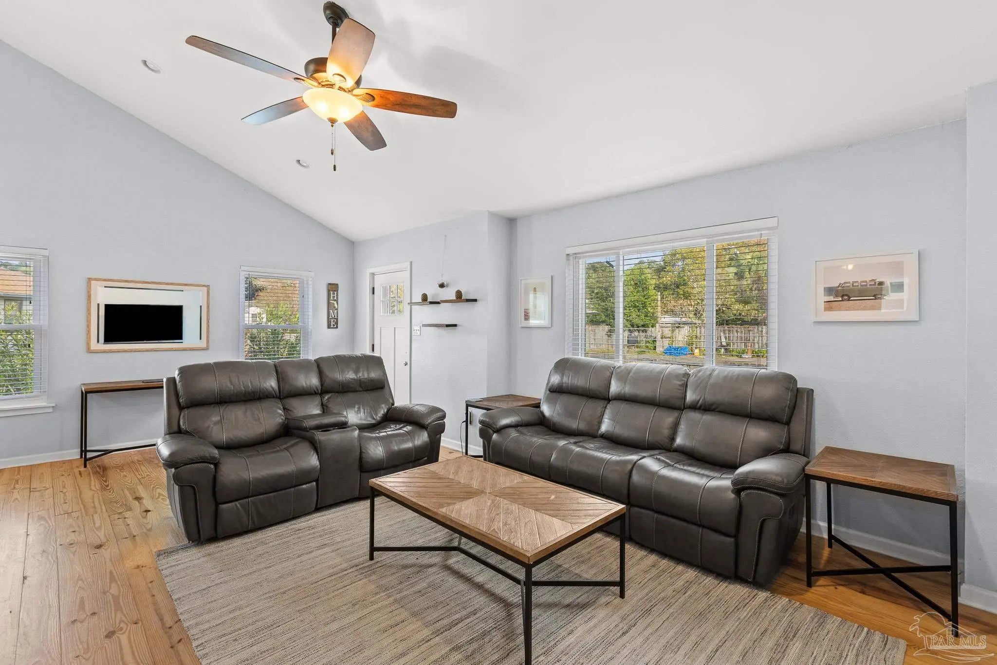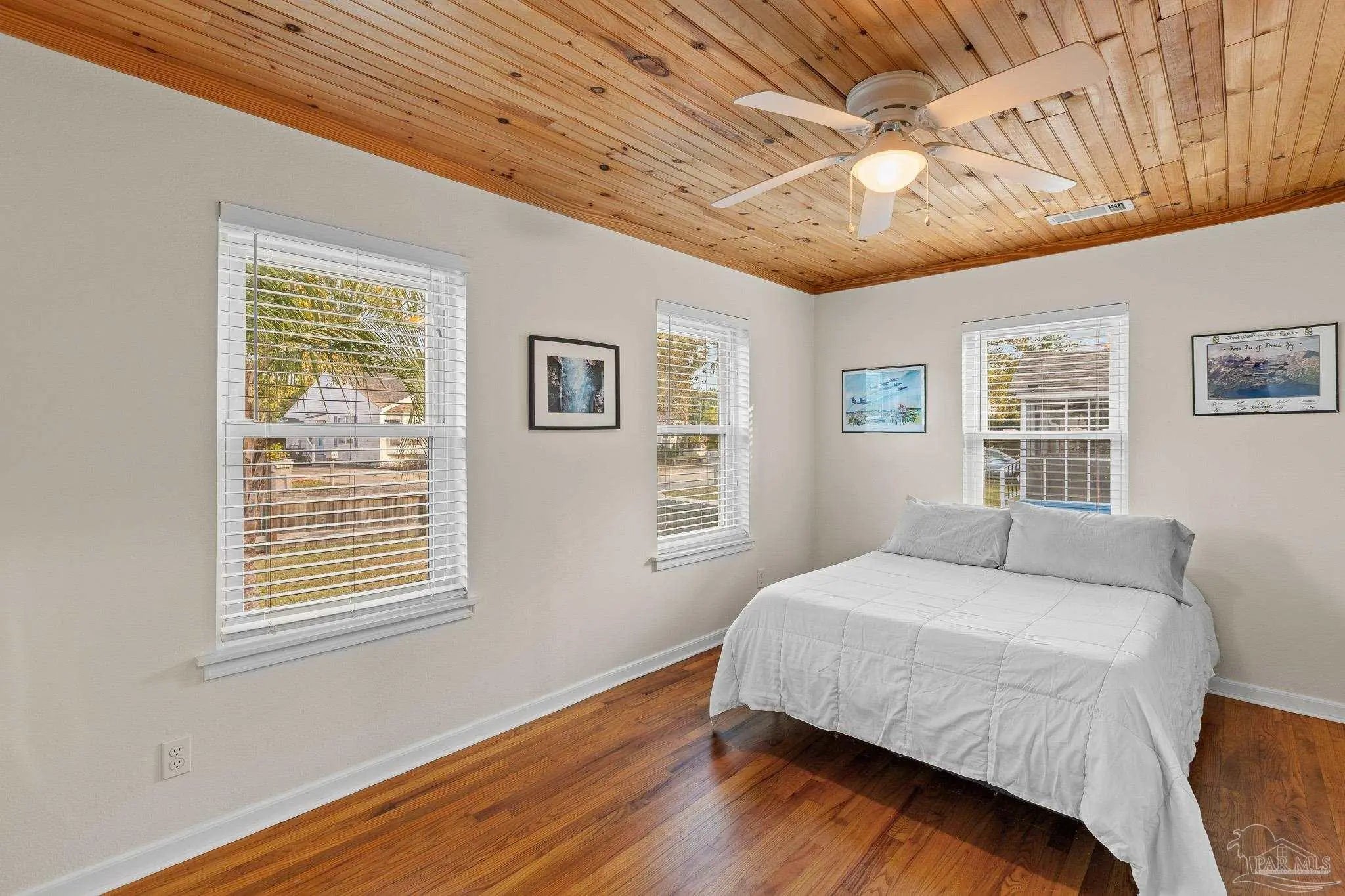 Gorgeous Navy Point home just one block from the beautiful waters of Bayou Grande, Pensacola Bay, and the Gulf! This 2 bedroom, 2 bath home was completely rebuilt in 2015 with new roof, plumbing, HVAC, and electrical. Since then, the owners have added new solar panels, hurricane-resistant windows, new exterior doors with a front storm door, and metal hurricane shutters. Inside, you’ll find an open floor plan with 20-ft ceilings and hardwood floors throughout. The kitchen features granite countertops, stainless steel appliances, and double ovens, along with a walk-in pantry and separate laundry room. spacious primary suite offers dual vanities, two walk-in closets, and an oversized custom-tiled walk-in shower. The attic was built with a potential third bedroom and bathroom in mind, complete with vaulted ceilings and plumbing. A detached building with a closet makes an ideal office or guest space. Enjoy exceptional privacy in the oversized fenced backyard with an end-to-end deck, fire pit, and partial water view. The long driveway and reinforced parking pad are ready for a future carport or garage. Living in Navy Point means access to a waterfront walking and biking trail, boat launch, playground, and multiple beach access points—all maintained by Escambia County. This highly sought-after neighborhood offers a true coastal lifestyle.