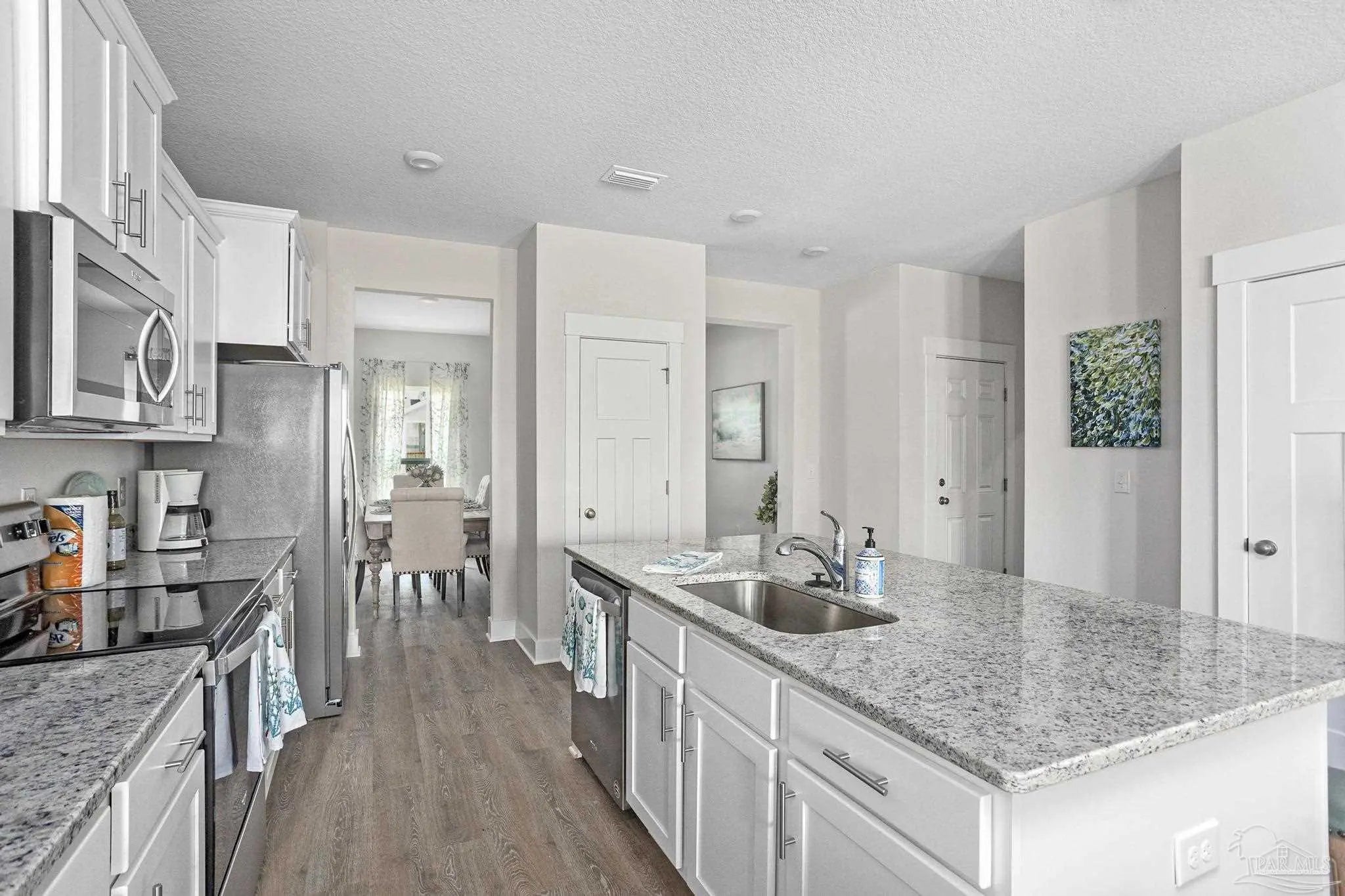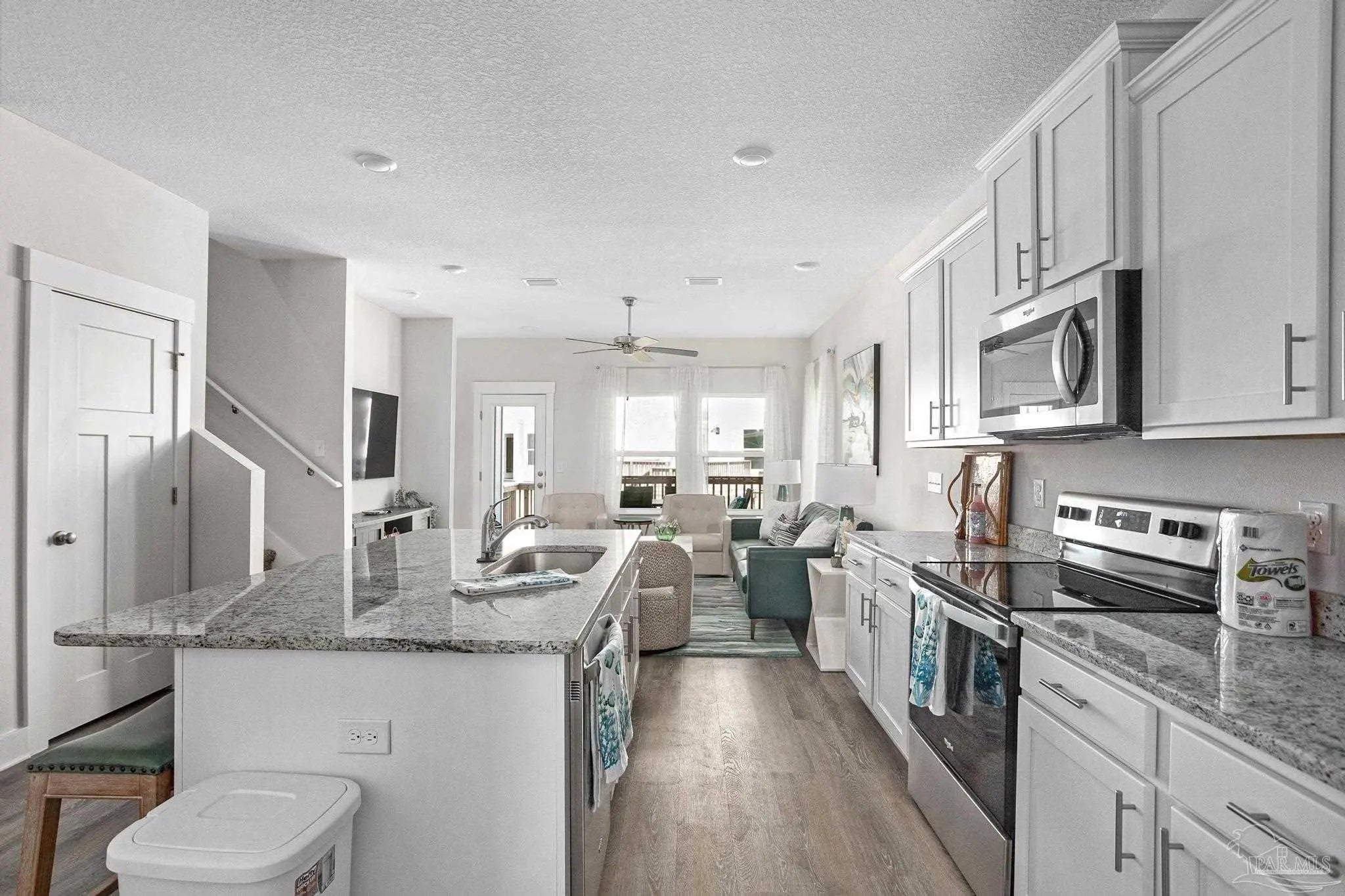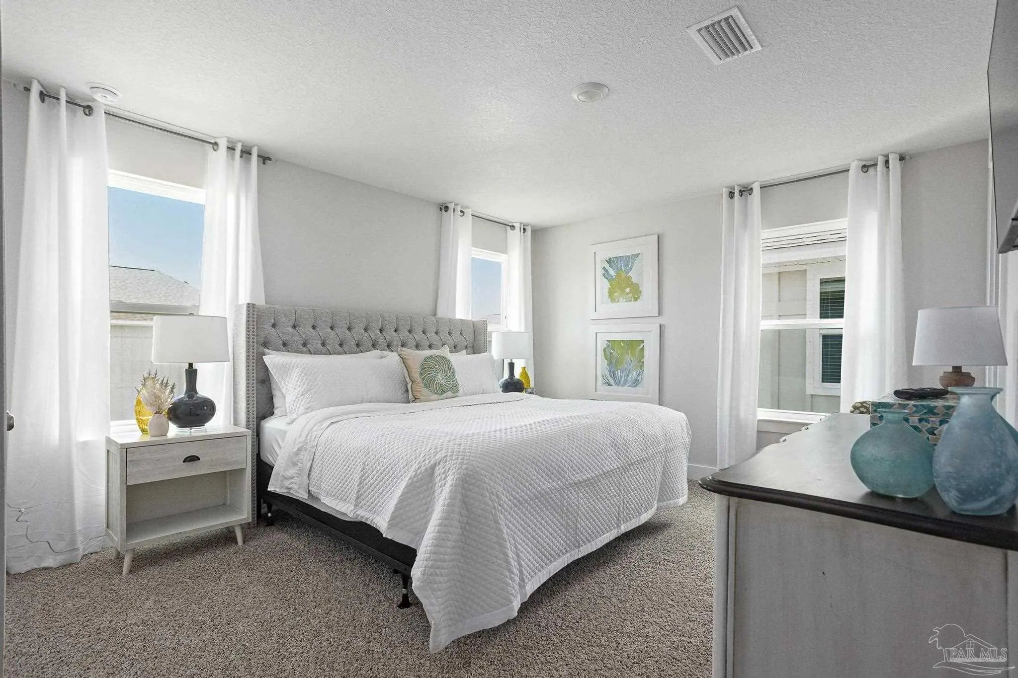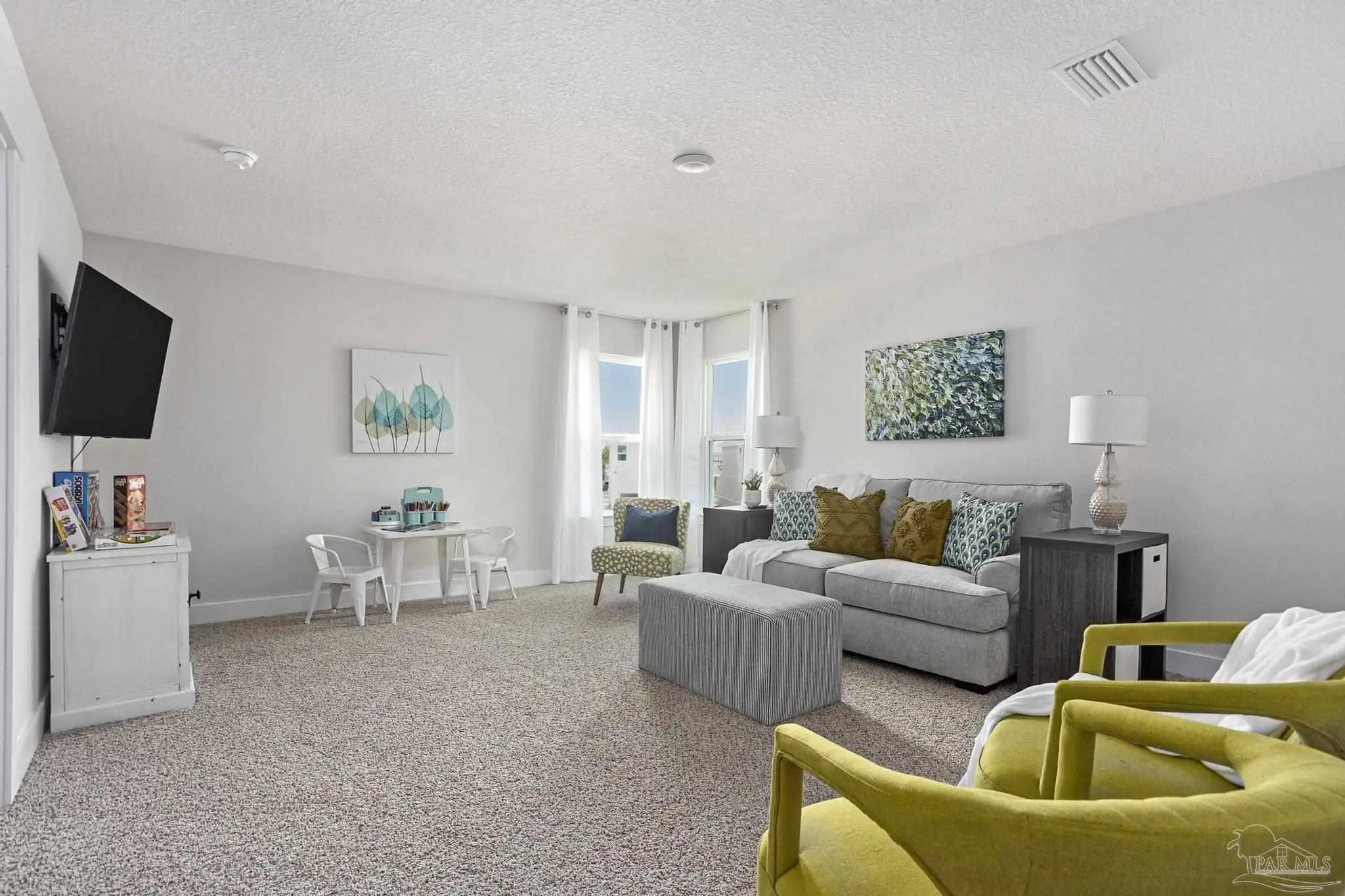 Built in 2022, this beautifully maintained 4-bedroom, 3.5-bath home offers a fantastic blend of modern design and coastal charm. With two spacious living areas, there's room for everyone to spread out and relax. You'll love the light wood-look LVP flooring throughout the main spaces, complemented by cozy carpeting in the bedrooms and second living area. The kitchen is a dream — featuring stainless steel appliances, sleek granite countertops, stylish white cabinetry, and a large island with breakfast bar seating. A formal dining room flows directly into the kitchen, making it ideal for entertaining. The spacious master suite is filled with natural light and boasts a luxurious ensuite bathroom with double granite vanities and a glass-enclosed standing shower. Enjoy year-round outdoor living on the covered back patio, offering plenty of room for an al fresco dining area. Built for peace of mind, this home includes hurricane protection features like double-pane windows, insulated ceilings, durable Hardiplank siding, and fabric shutters ready for quick installation. Plus, with newer major components like the roof, HVAC, and hot water heater, you can move in with confidence.