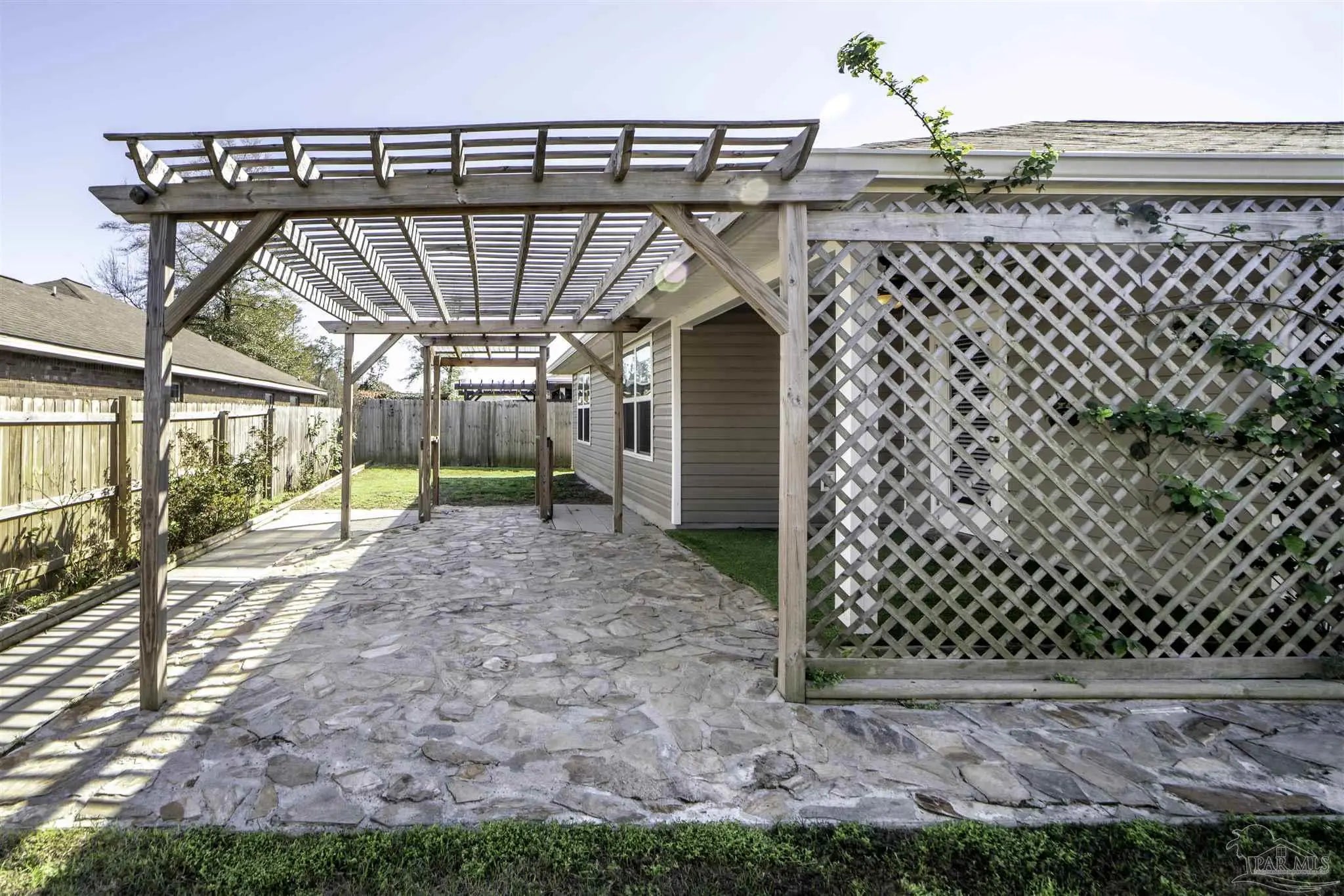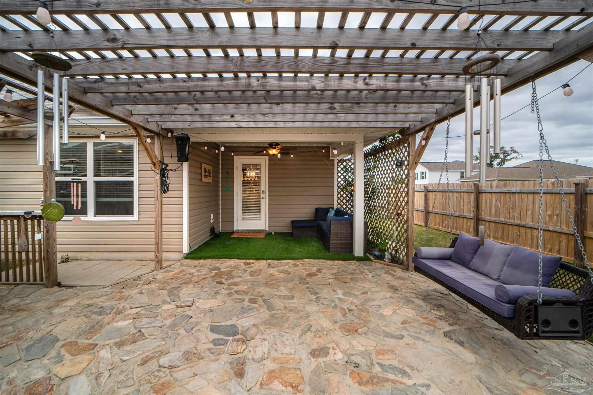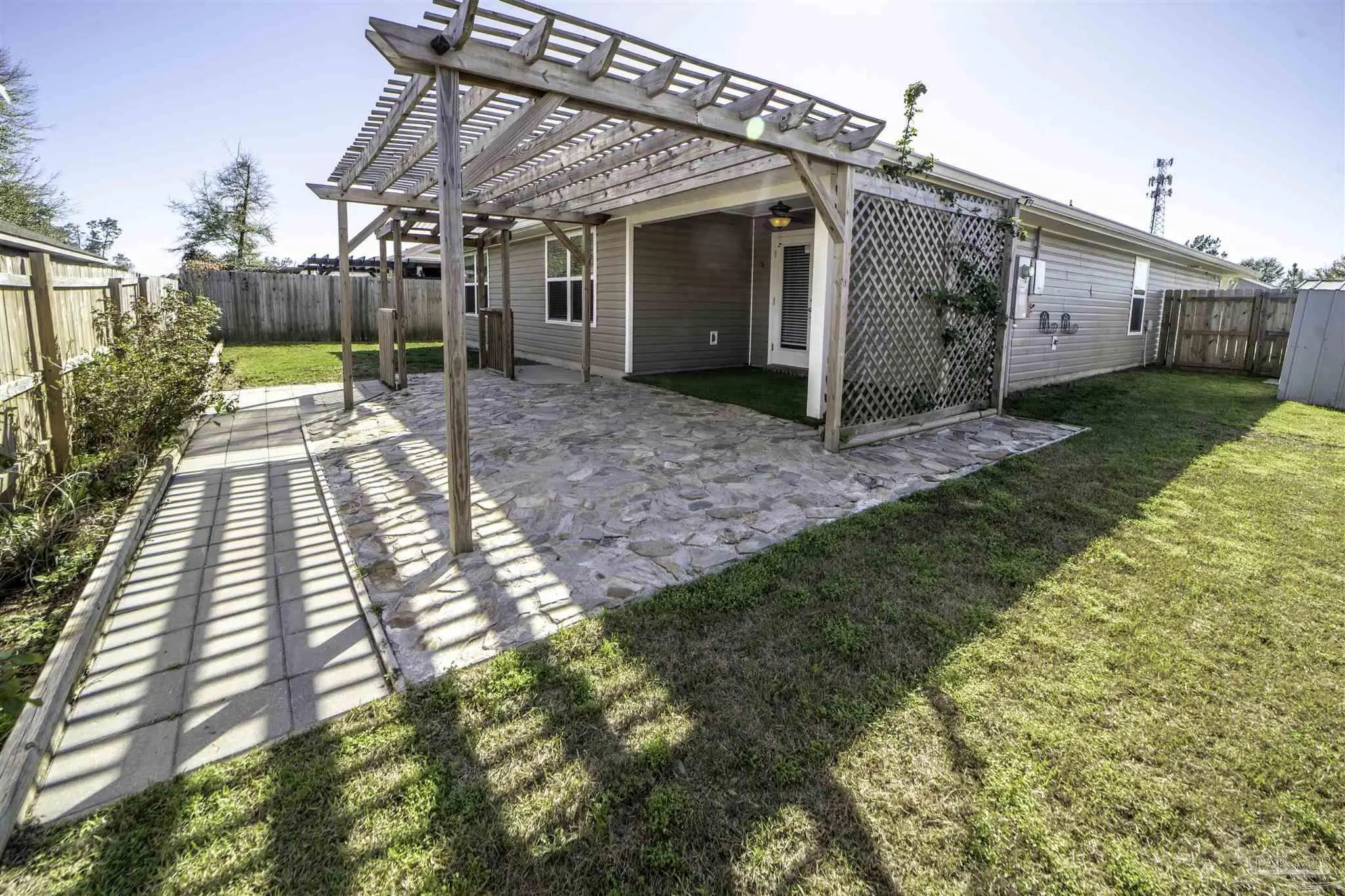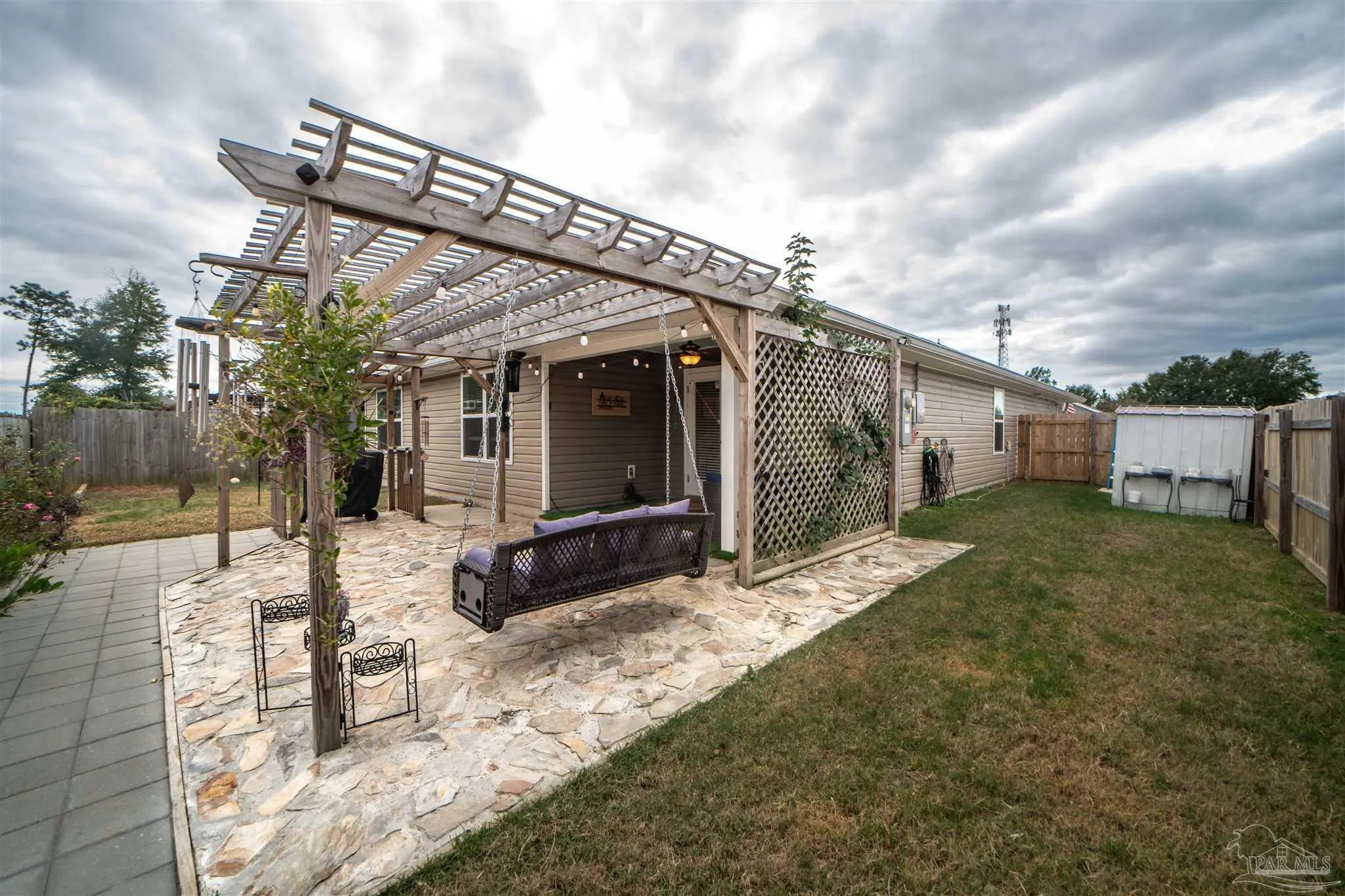 Welcome to this spacious 4 bedroom, 2 bathroom home located in Bridlewood in the Beulah area. A welcoming covered front porch leads into the carefully maintained home and into the split bedroom plan. Stepping down the hall, the kitchen features a kitchen island, stainless steel appliances, and plenty of cabinet storage, flowing seamlessly into the dining and living areas. The private primary suite includes a walk-in closet and a double vanity bath, while three additional bedrooms provide flexibility for guests, family, or a home office. Step into the back yard and enjoy a covered porch and extended patio with lots of space for outdoor seating. Enjoy low energy bills thanks to the solar panel system. Additional highlights include a two-car garage, Tesla charger in garage, smart home features, and a low annual HOA. Conveniently located near Beulah schools, Navy Federal, shopping and I-10, this home combines modern comfort with a convenient location.