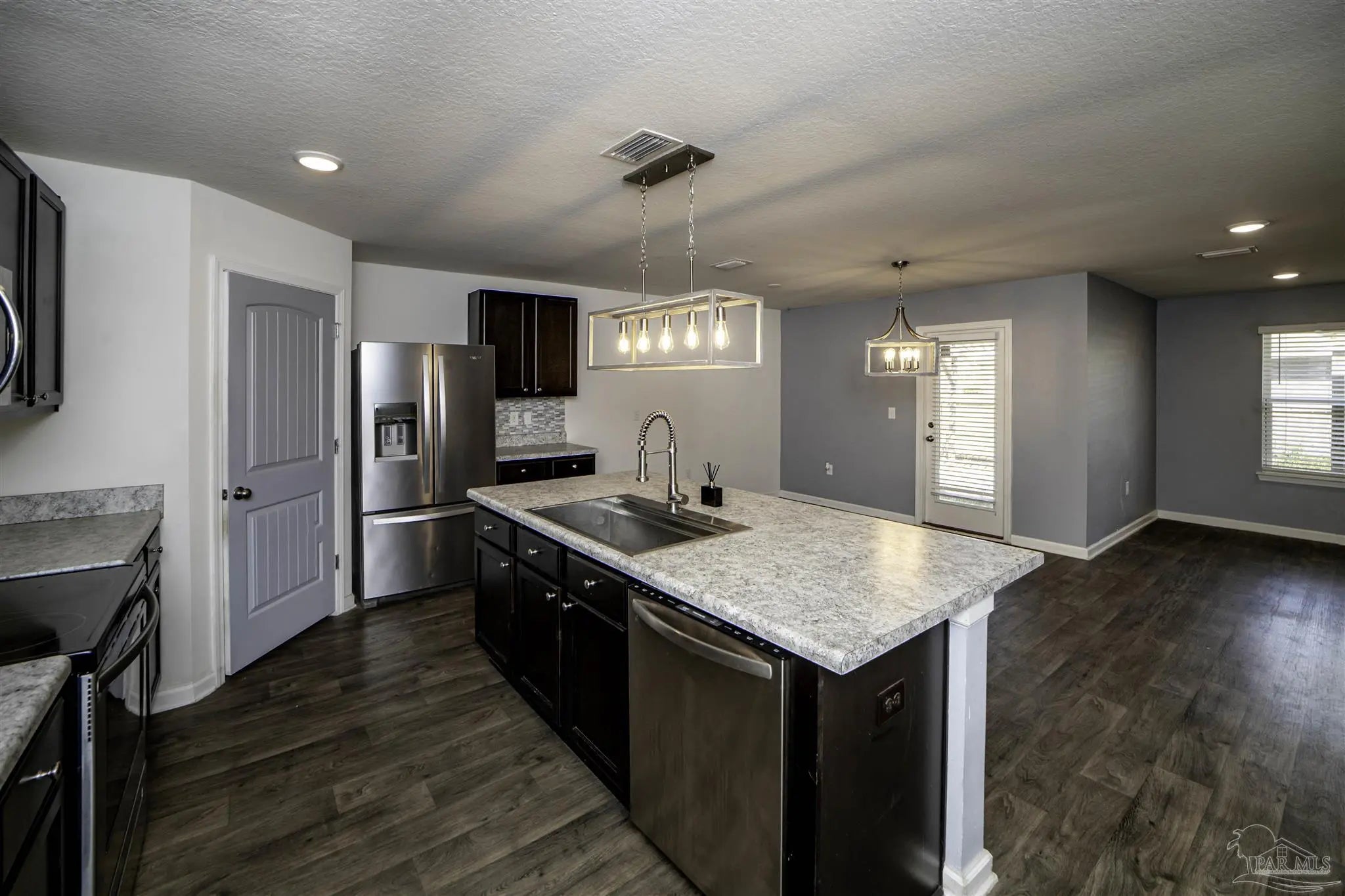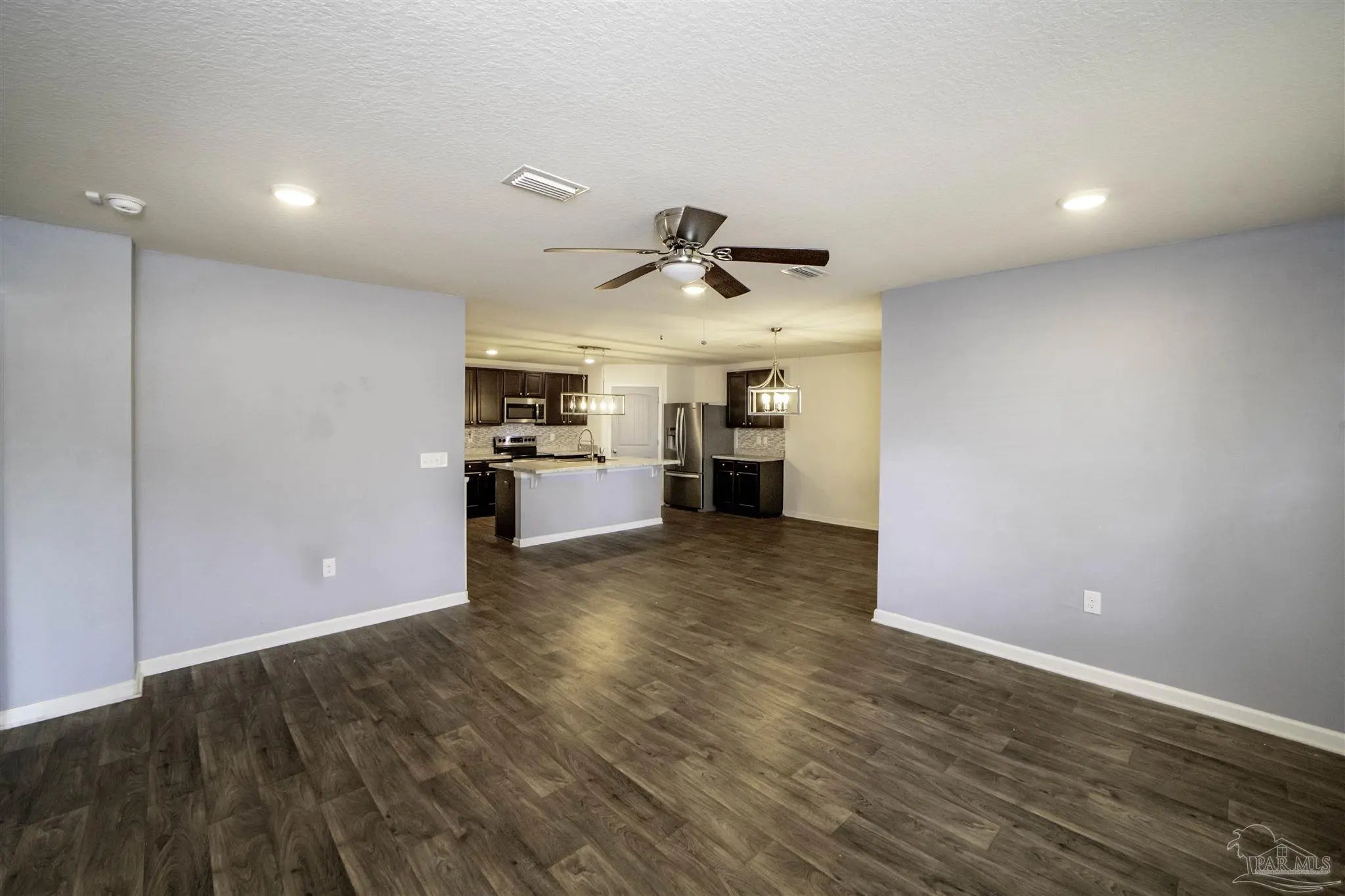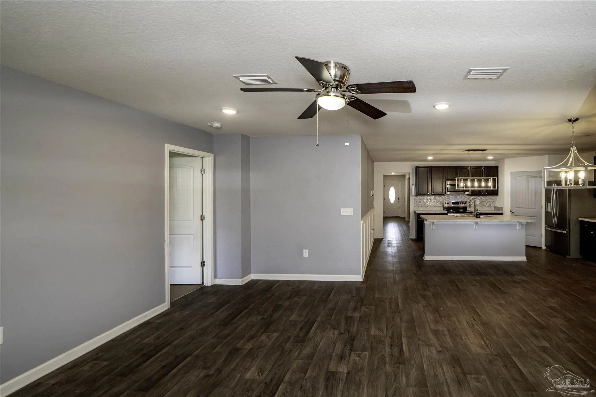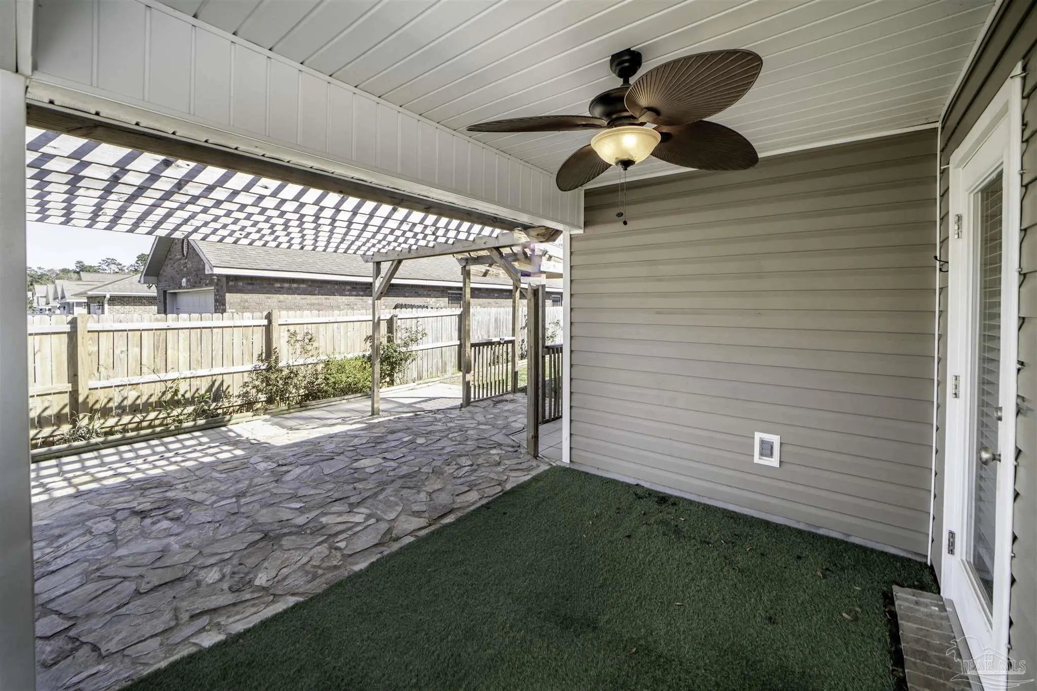 Welcome to this spacious 4 bedroom, 2 bathroom home located in Bridlewood in the Beulah area. A welcoming covered front porch leads into the carefully maintained home and into the split bedroom plan. Stepping down the hall, the kitchen features a kitchen island, stainless steel appliances, and plenty of cabinet storage, flowing seamlessly into the dining and living areas. The private primary suite includes a walk-in closet and a double vanity bath, while three additional bedrooms provide flexibility for guests, family, or a home office. Step into the back yard and enjoy a covered porch and extended patio with lots of space for outdoor seating. Enjoy low energy bills thanks to the solar panel system. Additional highlights include a two-car garage, Tesla charger in garage, smart home features, and a low annual HOA. Conveniently located near Beulah schools, Navy Federal, shopping and I-10, this home combines modern comfort with a convenient location.