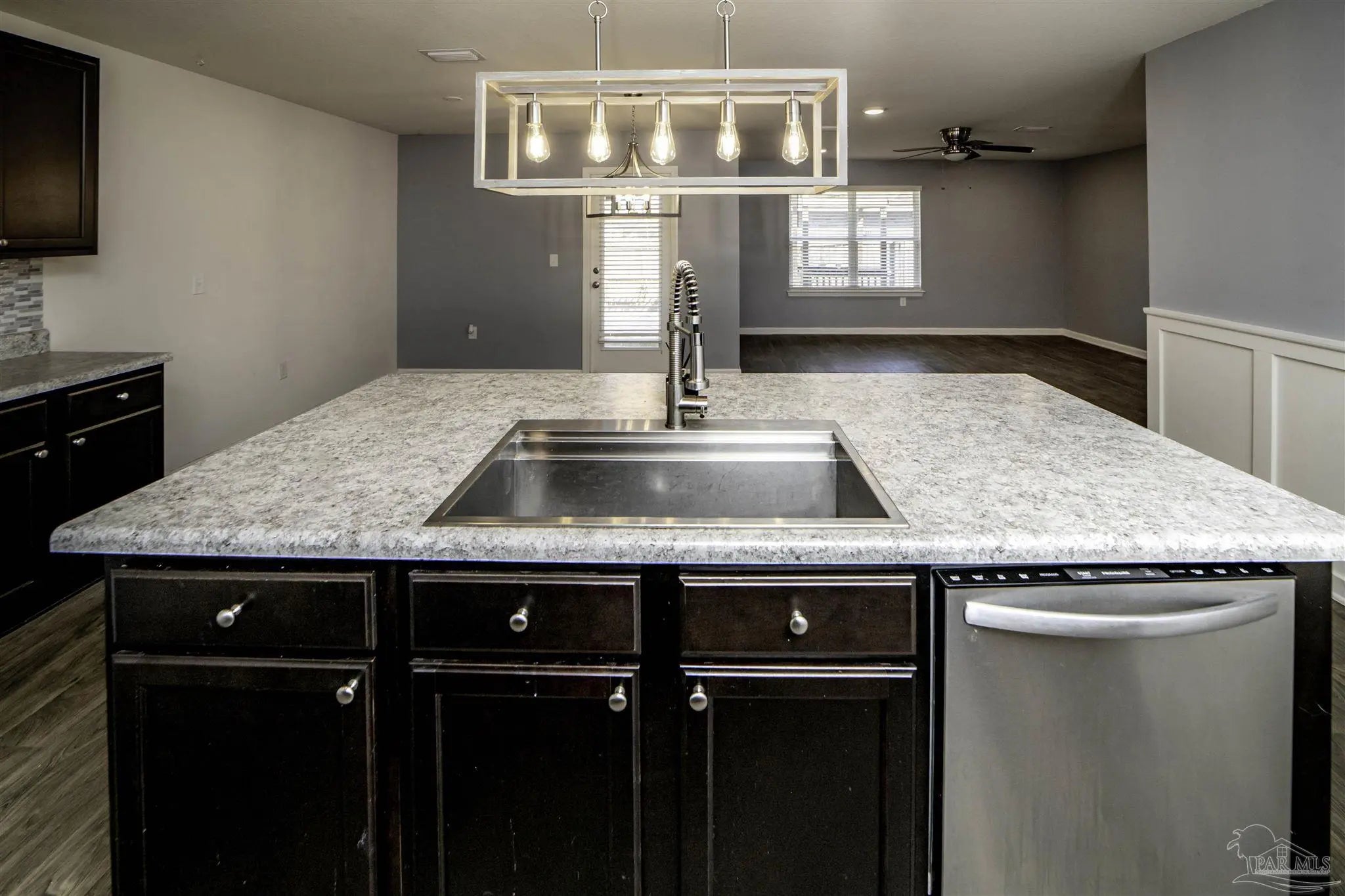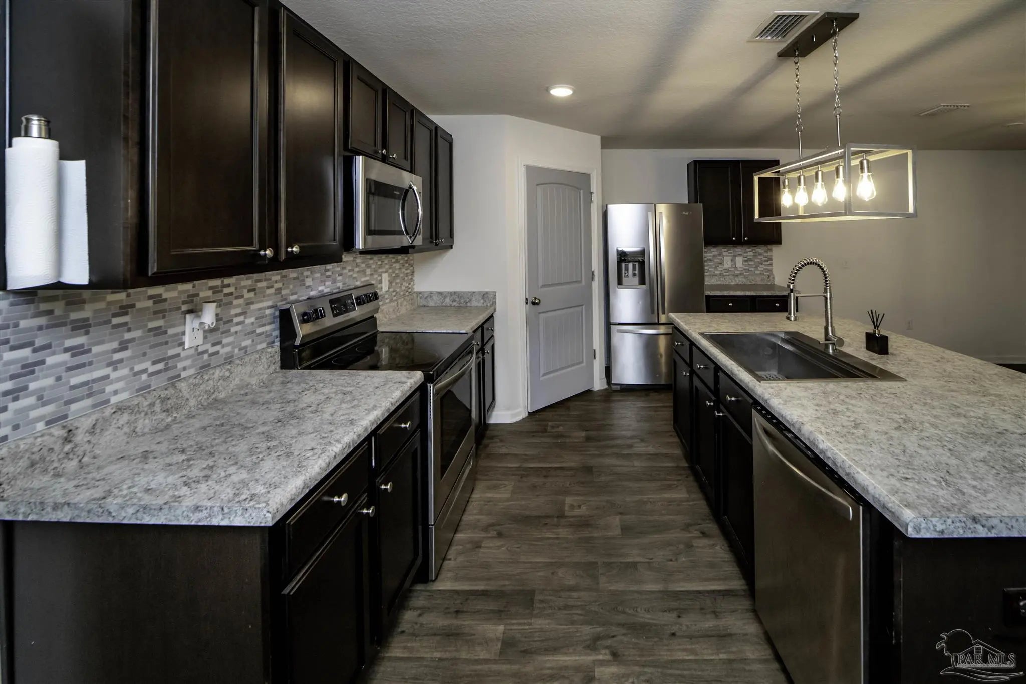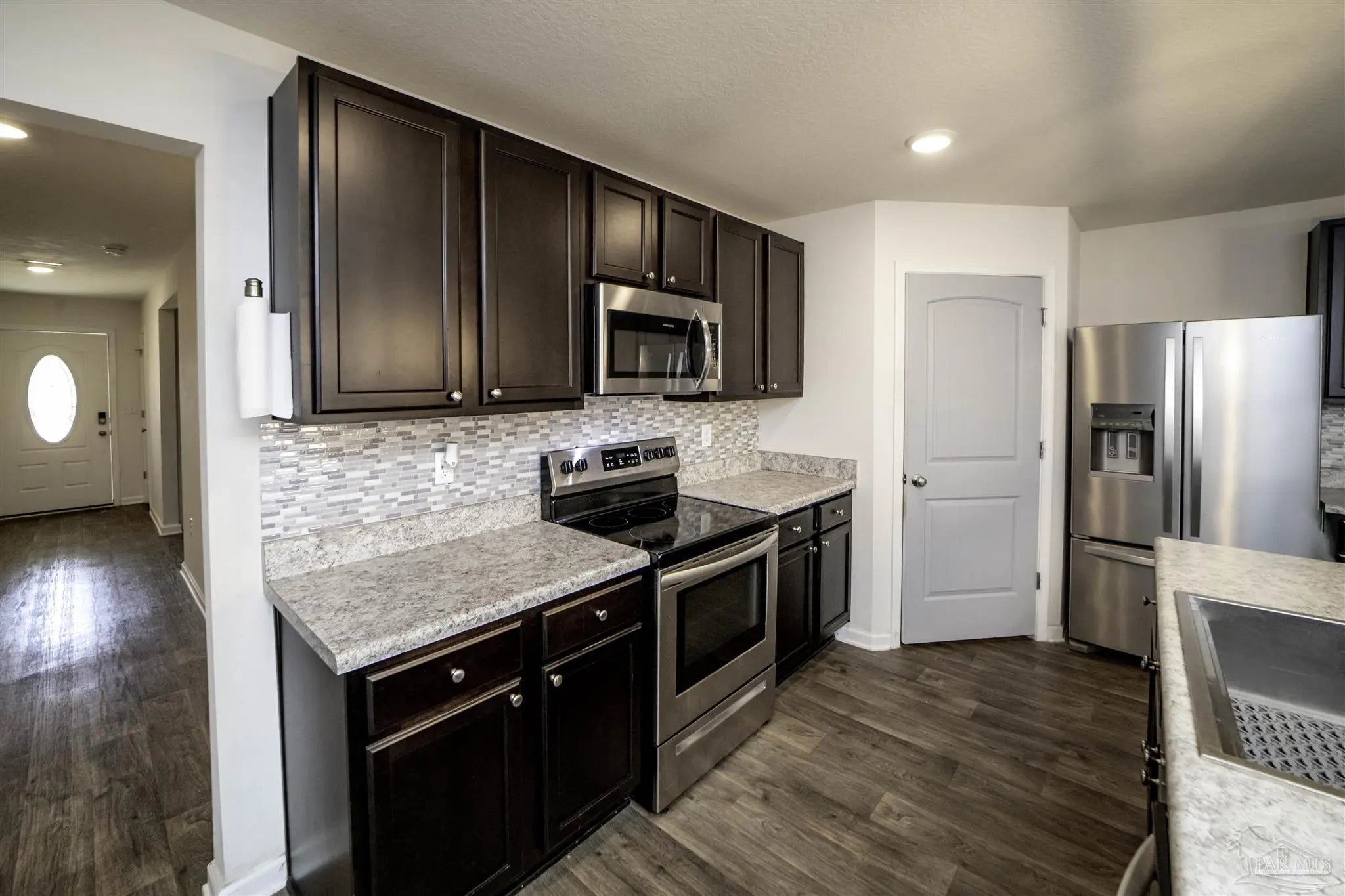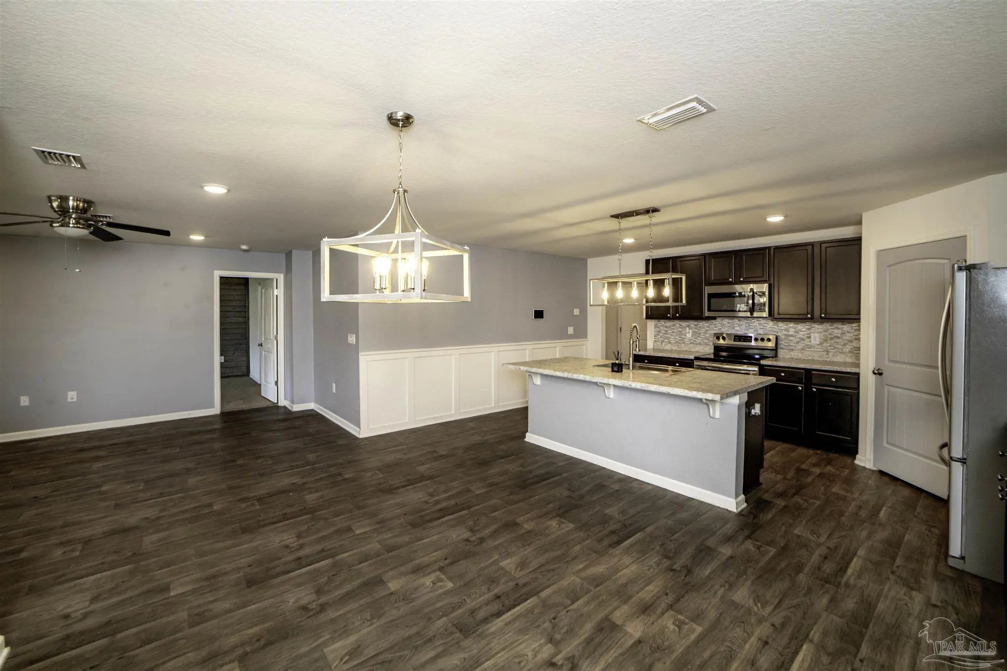 Welcome to this spacious 4 bedroom, 2 bathroom home located in Bridlewood in the Beulah area. A welcoming covered front porch leads into the carefully maintained home and into the split bedroom plan. Stepping down the hall, the kitchen features a kitchen island, stainless steel appliances, and plenty of cabinet storage, flowing seamlessly into the dining and living areas. The private primary suite includes a walk-in closet and a double vanity bath, while three additional bedrooms provide flexibility for guests, family, or a home office. Step into the back yard and enjoy a covered porch and extended patio with lots of space for outdoor seating. Enjoy low energy bills thanks to the solar panel system. Additional highlights include a two-car garage, Tesla charger in garage, smart home features, and a low annual HOA. Conveniently located near Beulah schools, Navy Federal, shopping and I-10, this home combines modern comfort with a convenient location.