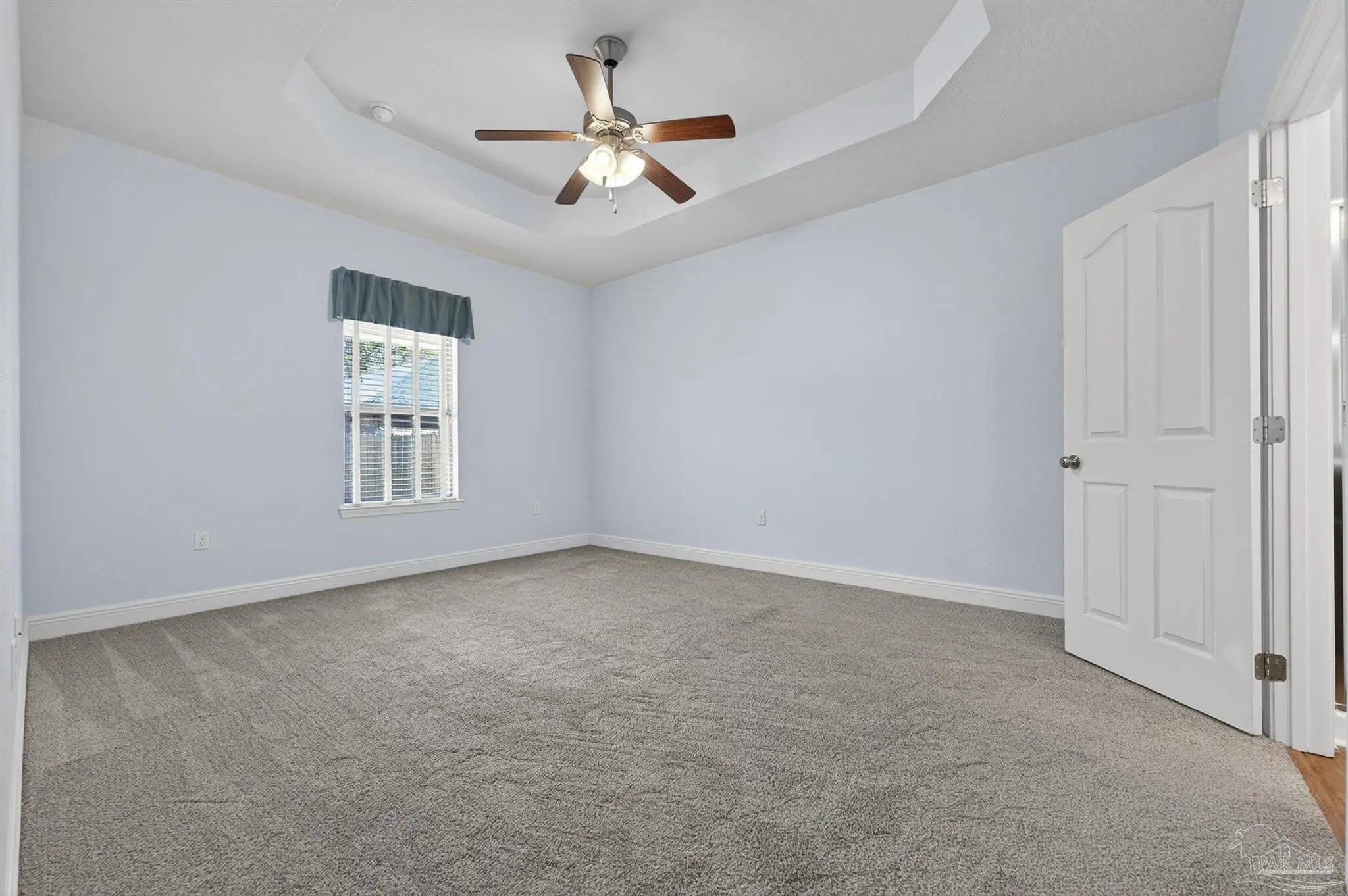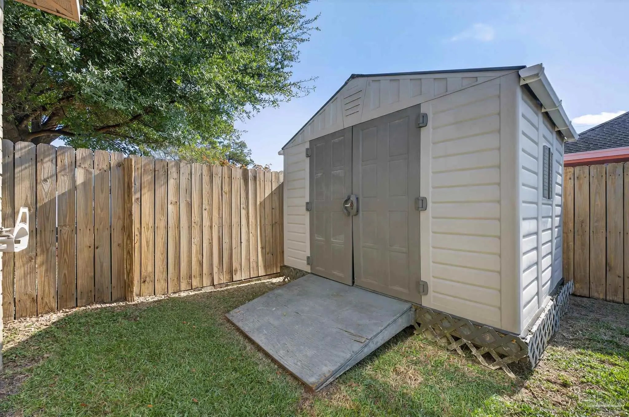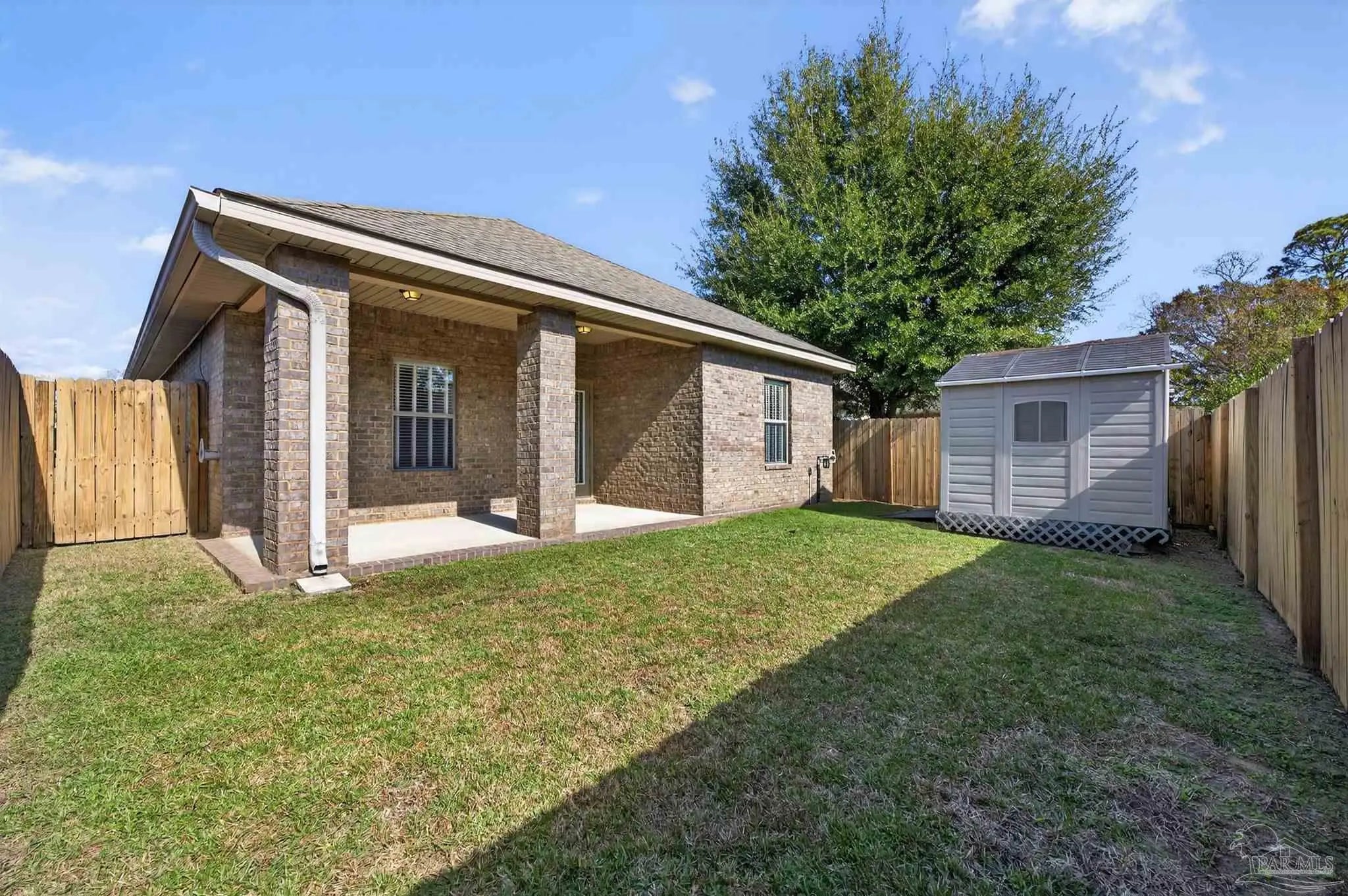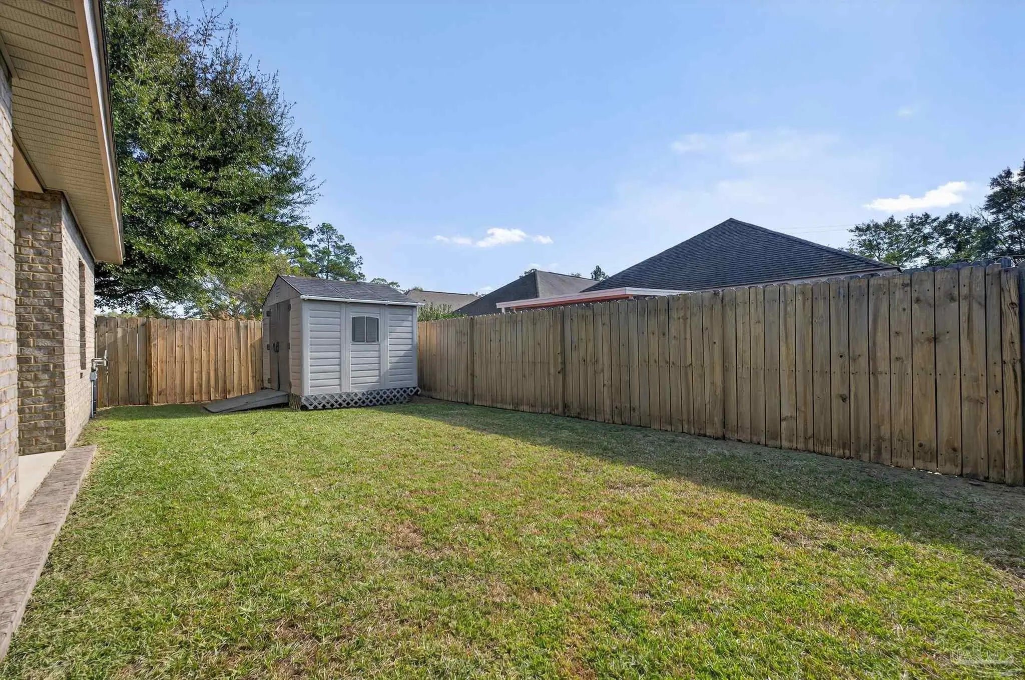 Welcome to this clean, beautifully maintained 2011-built home in Pensacola, near Nine Mile & I-10! Nestled in a tidy, well cared for neighborhood with no HOA, this home gives you added flexibility. The home features a 2021 roof, a two-car garage, and a fully fenced backyard. Inside, the open floor plan creates an inviting flow; the bright and airy living room boasts a tray ceiling and opens seamlessly to the kitchen. There you’ll find a breakfast bar, ample cabinetry, a pantry, and a built-in microwave. A formal dining room with dimmable lighting and an extra storage closet, just off the kitchen, offers even more flexibility for hosting. The spacious primary suite includes a tray ceiling, a large walk-in closet, and the bathroom features a double vanity, relaxing garden tub beneath a bright frosted window, and a separate standing shower. Two additional bedrooms are situated side-by-side with a full bathroom between them, featuring a tub/shower combo. Step outside to a backyard designed for enjoyment, offering a privacy fence, covered patio, and a storage shed (7'10" x 9'10"). Additional features include easy-to-clean pivot windows and hurricane shutters for peace of mind. From entertaining guests to spending quality time at home, this property offers comfort for any family!