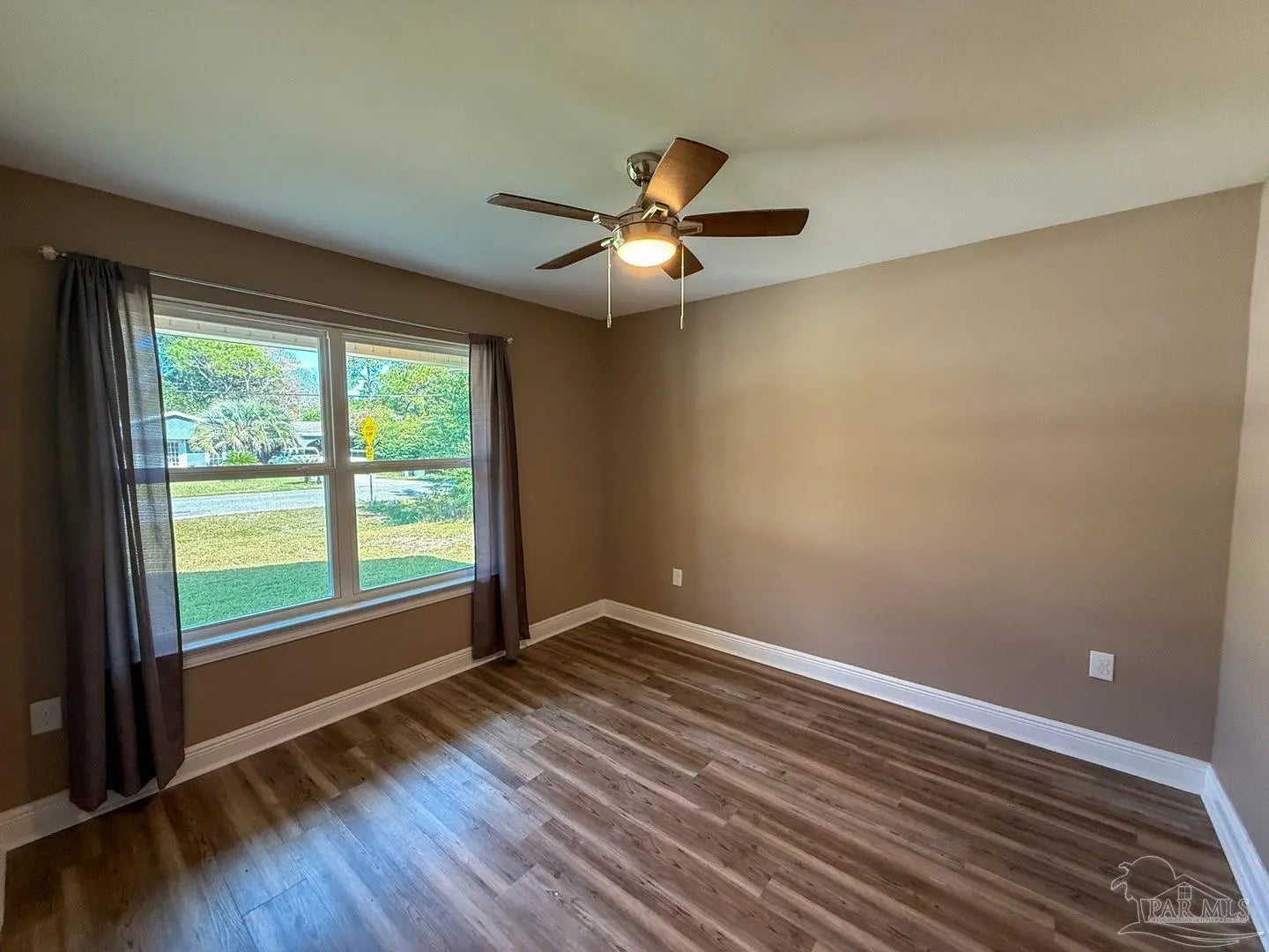 Step inside this 3 bedroom, 2 bathroom home located just minutes from NAS Pensacola, Perdido Key, Big Lagoon State Park, and Johnson Beach. Situated on a spacious quarter acre lot, this property offers plenty of room to enjoy both indoor and outdoor living. As you walk up, the covered front porch sets a warm first impression. Inside, the open living area welcomes you with vaulted ceilings and luxury vinyl plank flooring that runs throughout the home. The main living space features two sets of French doors that fill the room with natural light and lead out to an impressive 40-foot covered back porch, giving you a seamless indoor/outdoor flow. The kitchen is designed with both style and function in mind, offering granite countertops, shaker style cabinetry with soft-close features, stainless steel appliances, recessed lighting, and plenty of storage. It opens right into the dining and living areas, creating an easy layout for entertaining or relaxing at home. The primary suite offers a spacious walk in closet and an ensuite bathroom featuring a double vanity, a beautifully tiled walk in shower with glass door, and a separate soaking tub with custom tile surround. Two additional guest bedrooms are located down the hall, along with a second full bathroom and ample closet space. Every bedroom includes a ceiling fan for added comfort. Out back, the covered porch overlooks the backyard. A two car garage provides plenty of room for vehicles and extra storage. This home is pet friendly up to 1 small pet under 35 lbs. Prior approval and nonrefundable pet fee required. No restricted breeds. Tenant responsible for all utilities. Ask us about our military special!