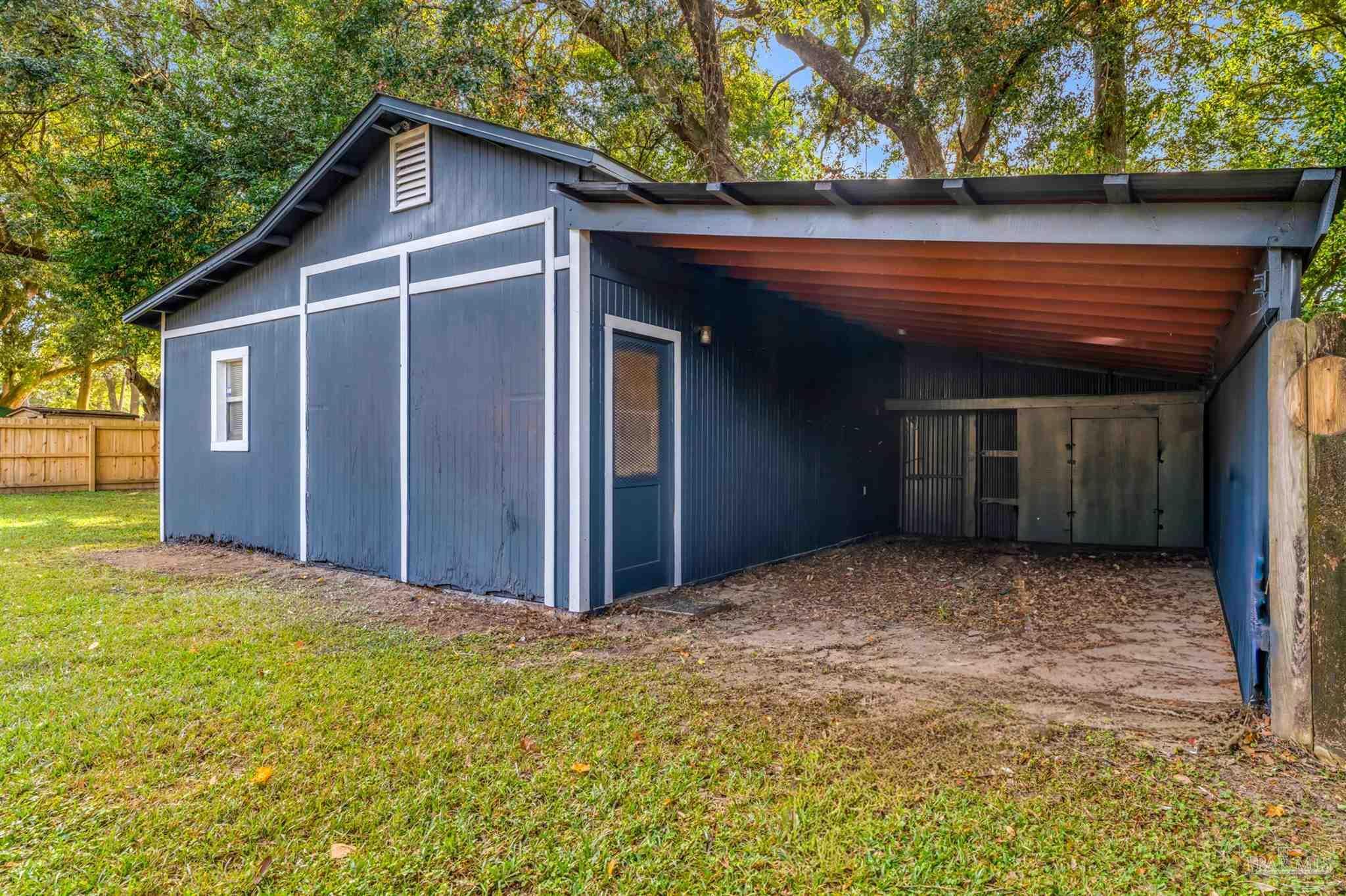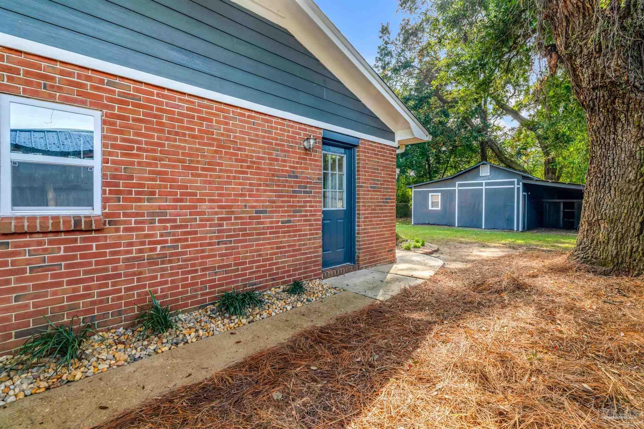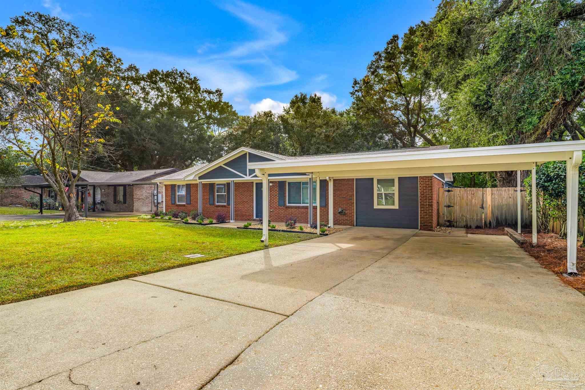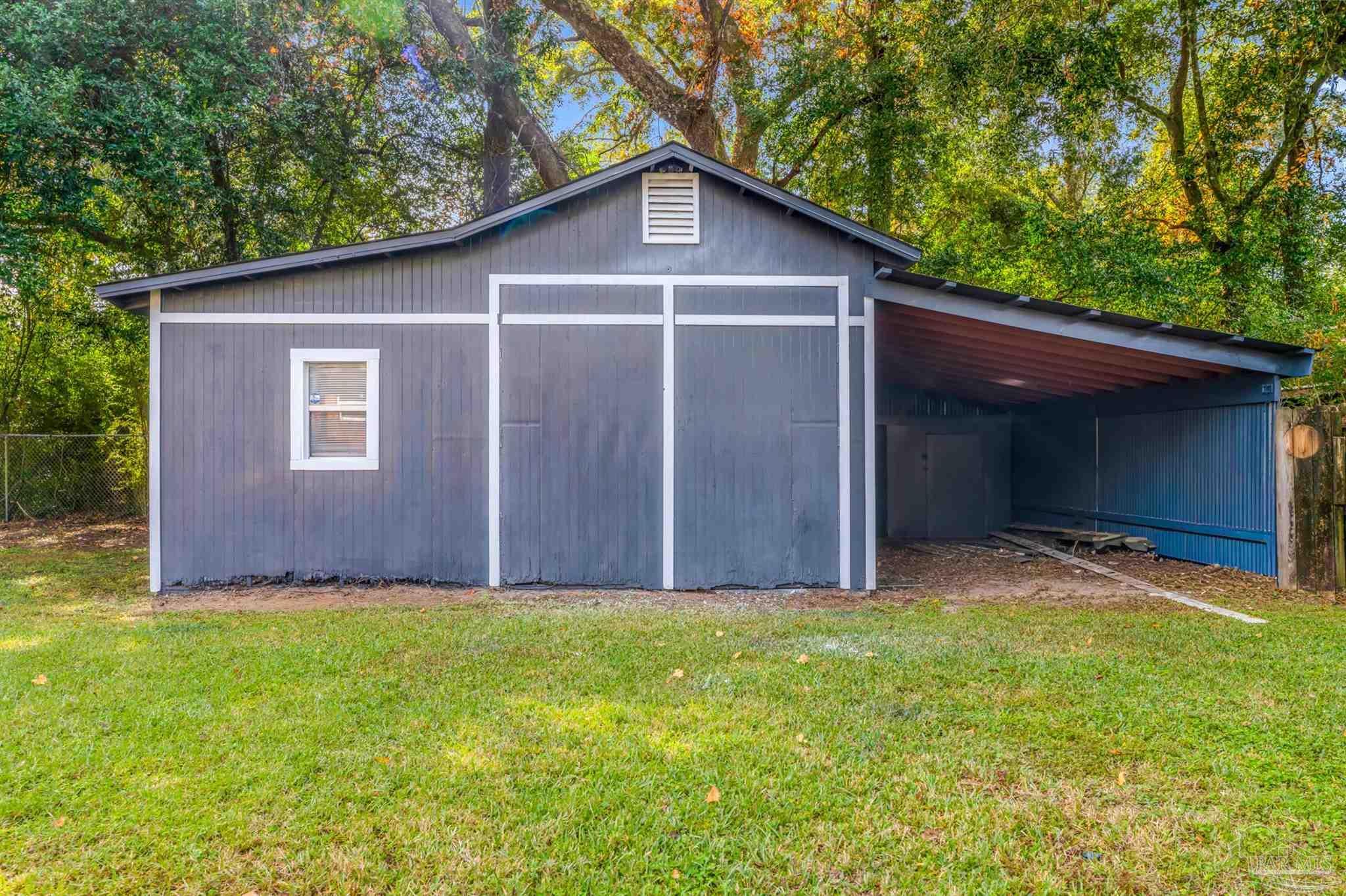 All-brick home on a generous lot in an exceptionally convenient location. This property has been completely remodeled offering almost the fresh feel of a new build while retaining the quality and craftsmanship of an older, better-built home. The Impact Windows installed during the remodel will save you a lot of money on your home owners insurance. The spacious 4th bedroom is oversized and can easily serve as a second living area, media room, or flex space to fit your needs. Out back, you’ll find a large 498 sq. ft. powered workshop perfect for hobbies, storage, or projects along with an additional barn for even more storage options. The updated landscaping, hardboard siding accents, and mature trees create a peaceful, inviting setting. A large front carport provides covered parking and easy access. Major updates include all-copper wiring completed in 2018, along with new outlets, switches, and electrical boxes for added peace of mind. This property is ideally located near I-10 and the rapidly growing 9 Mile corridor, offering quick access to new restaurants, shops, boutiques, medical offices, salons, and the expanding Navy Federal Credit Union campus. Barn Sold AS-IS