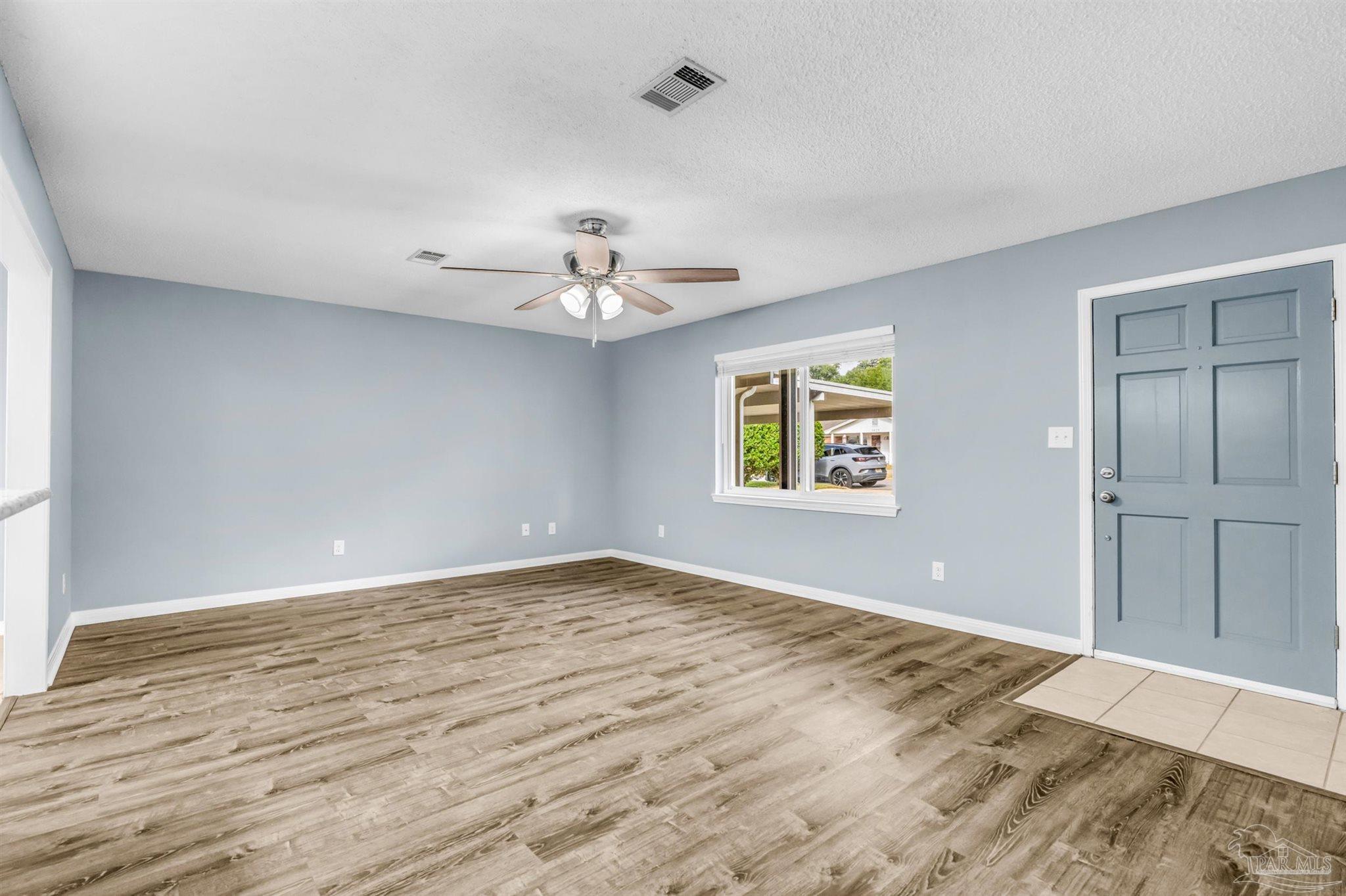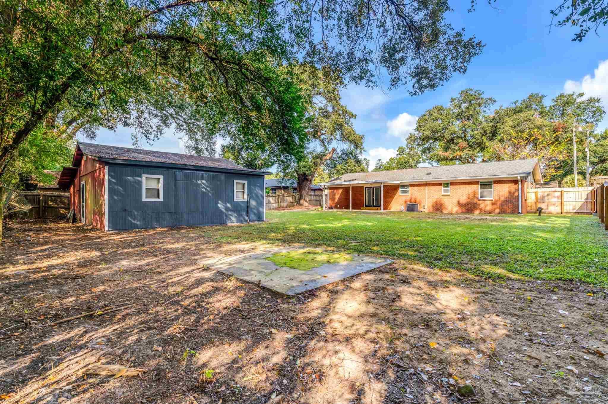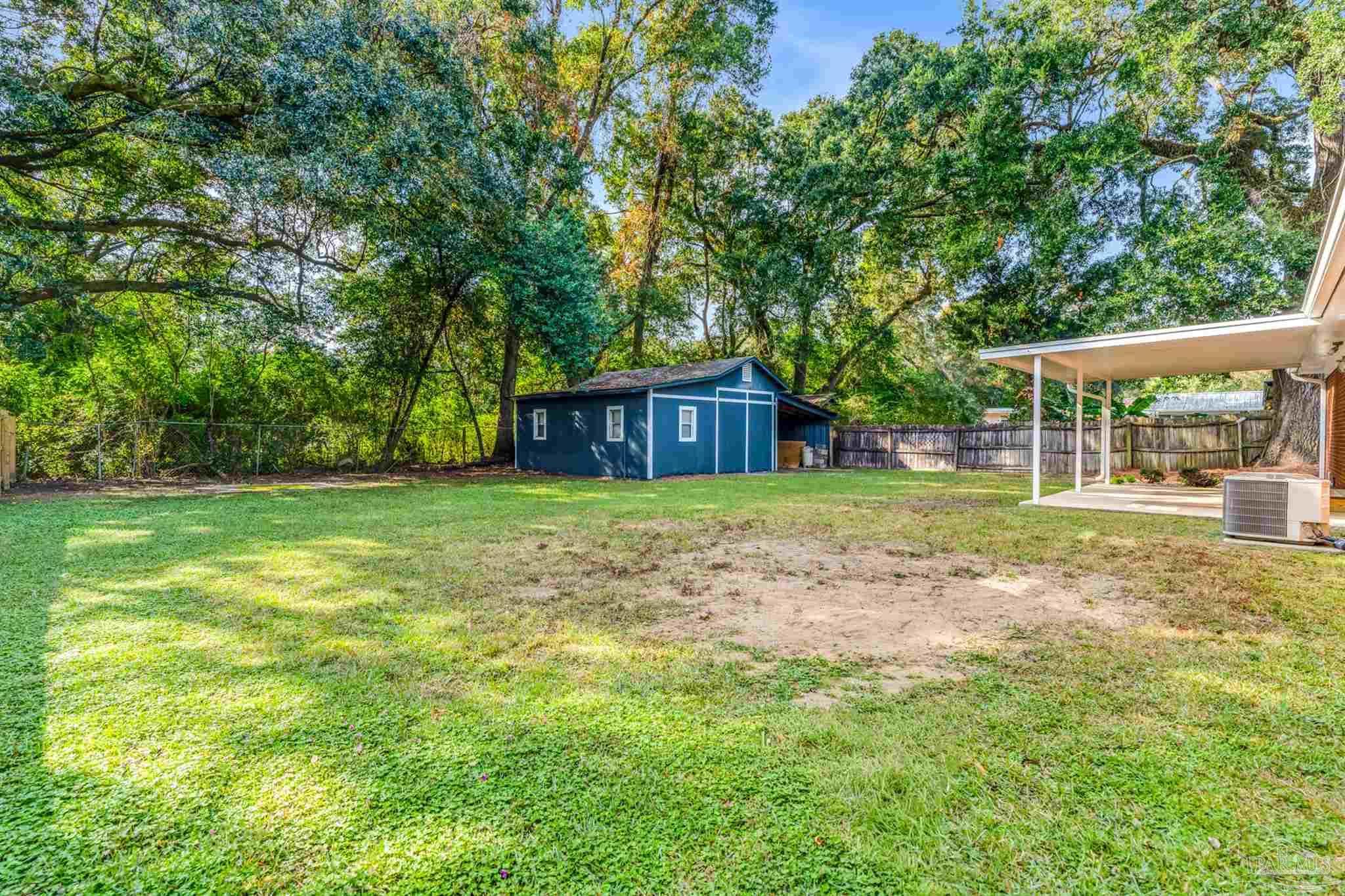 All-brick home on a generous lot in an exceptionally convenient location. This property has been completely remodeled offering almost the fresh feel of a new build while retaining the quality and craftsmanship of an older, better-built home. The Impact Windows installed during the remodel will save you a lot of money on your home owners insurance. The spacious 4th bedroom is oversized and can easily serve as a second living area, media room, or flex space to fit your needs. Out back, you’ll find a large 498 sq. ft. powered workshop perfect for hobbies, storage, or projects along with an additional barn for even more storage options. The updated landscaping, hardboard siding accents, and mature trees create a peaceful, inviting setting. A large front carport provides covered parking and easy access. Major updates include all-copper wiring completed in 2018, along with new outlets, switches, and electrical boxes for added peace of mind. This property is ideally located near I-10 and the rapidly growing 9 Mile corridor, offering quick access to new restaurants, shops, boutiques, medical offices, salons, and the expanding Navy Federal Credit Union campus. Barn Sold AS-IS