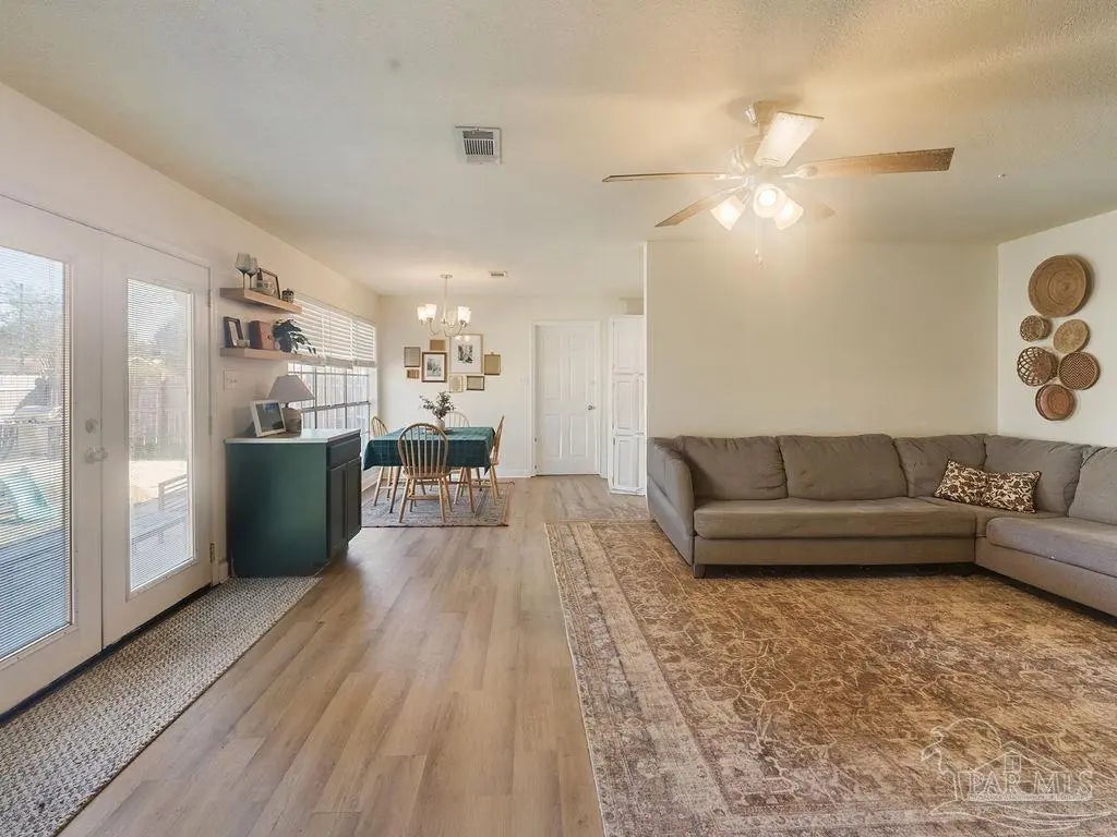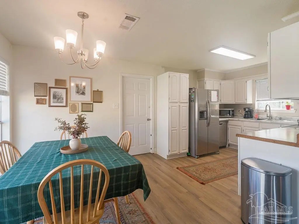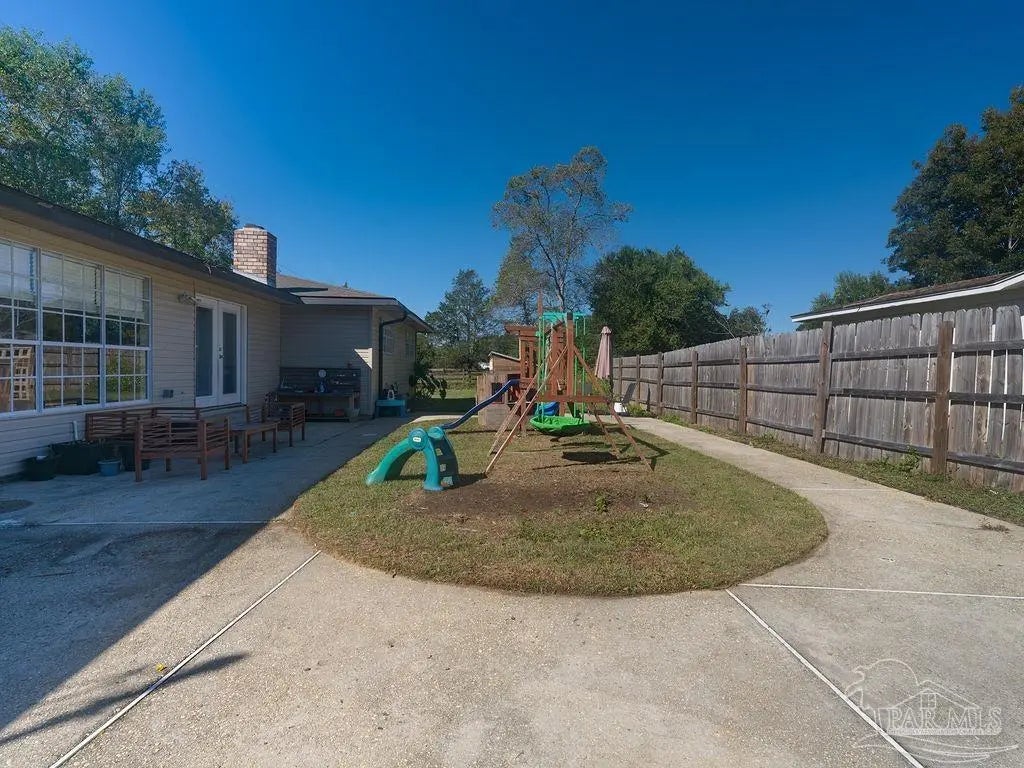 The charm of this home must be seen and experienced! This beautifully updated 4-bedroom, 2-bath home is filled with warmth and character. You’ll love the cozy modern fireplace, elegant arches, and inviting spaces throughout. The kitchen and bathrooms have been tastefully updated, and the spacious dining area features large windows that let in plenty of natural light. The primary bedroom offers direct access to a private, heated and cooled screened-in sunroom — the perfect spot for your morning coffee or to unwind as the sun sets. The oversized fourth bedroom provides flexibility for a playroom, office, or guest suite. Step outside to a fenced backyard ideal for BBQs, bonfires, and fun with kids or pets. Conveniently located near Navy Federal, I-10, shopping, restaurants, and the beach — this home truly has it all!