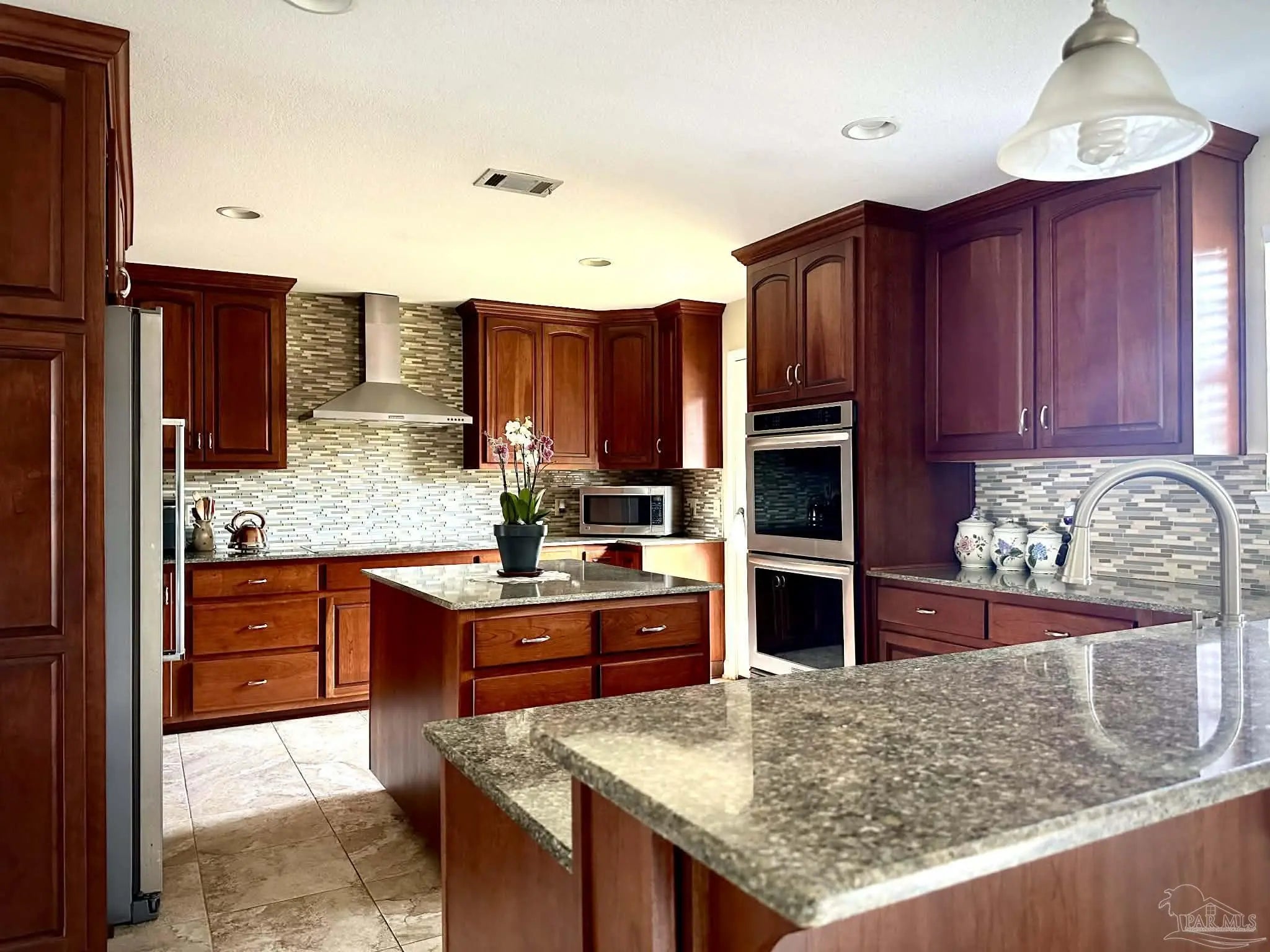 This beautiful all-brick home has been meticulously cared for by its homeowners and it truly shows. The kitchen has been thoughtfully remodeled into a gourmet space, featuring a 3x4 island for extra prep and counter space, abundant cabinet storage—including 52-inch upper cabinets—granite countertops, a double oven and a full KitchenAid appliance package. Both bathrooms have been tastefully updated with granite countertops and modern finishes. The hall bath offers a relaxing jacuzzi tub with tile surround, while the master bath features a walk-in shower with elegant tile detailing. The home is equipped with a geothermal heating and cooling system for exceptional comfort and efficiency. Additional features include a 2-car garage and a sprinkler system for easy lawn maintenance. Nestled in a peaceful, tree-lined neighborhood, the property sits on a generous 1/3-acre lot with a spacious front and backyard. The backyard is large enough to add a swimming pool and is perfect for gatherings and outdoor entertaining. Conveniently located just minutes from NAS Pensacola, downtown and our stunning white-sand, emerald beaches, this home offers comfort, tranquility and unbeatable access to Pensacola’s best attractions. With 3 generous bedrooms, 2 full baths and a charming wood-burning brick fireplace, this home is ready to welcome its next proud owners.