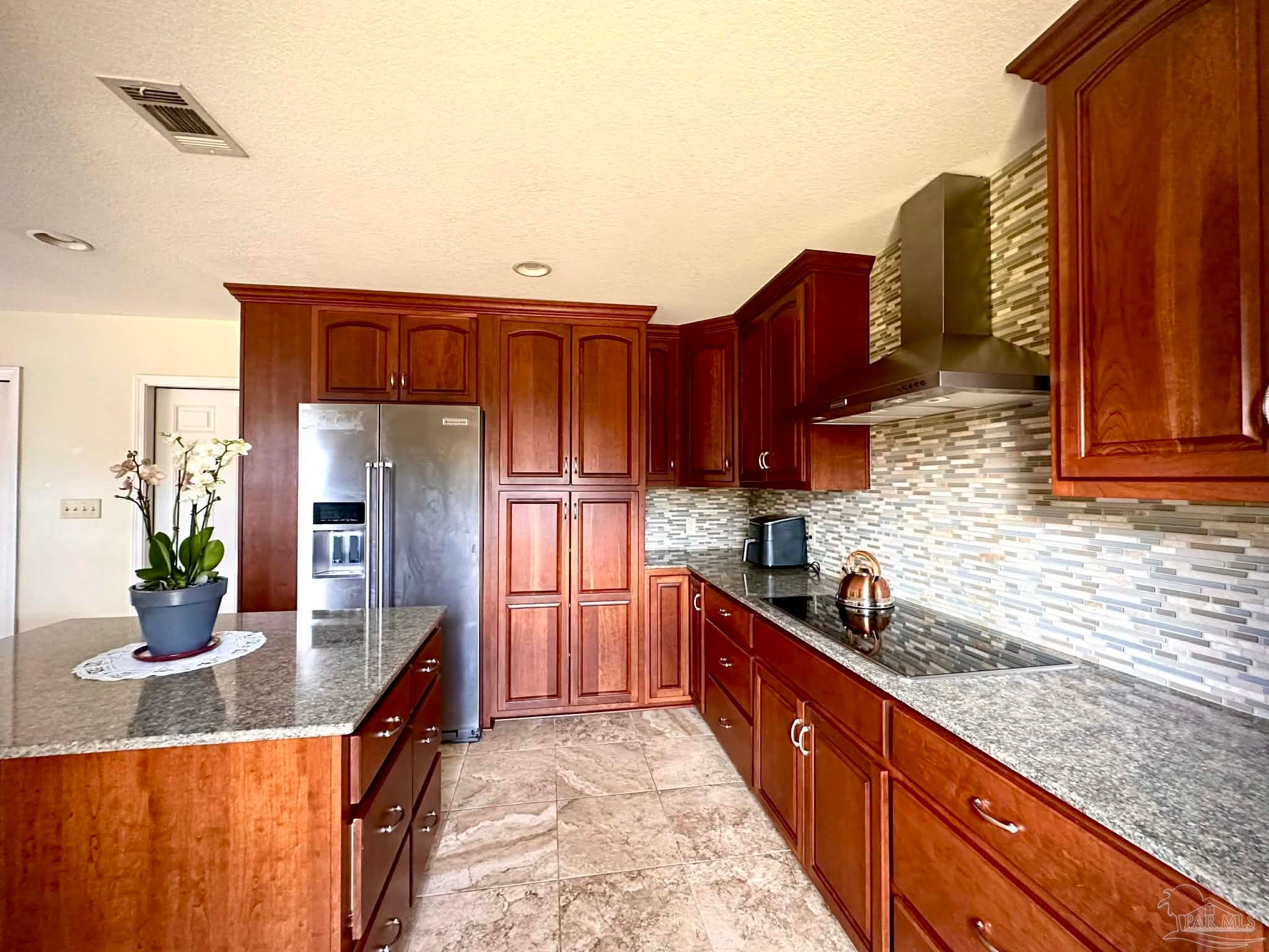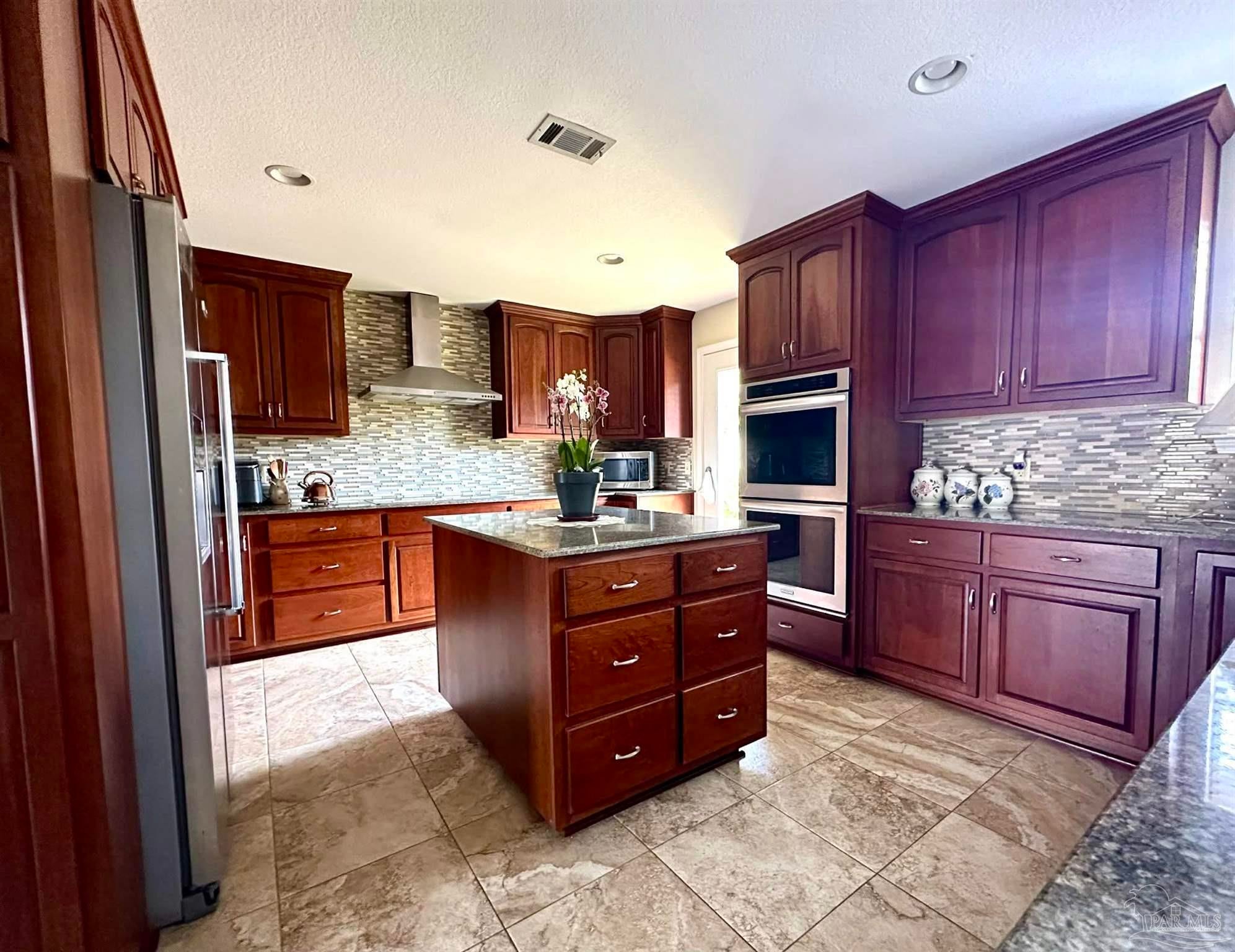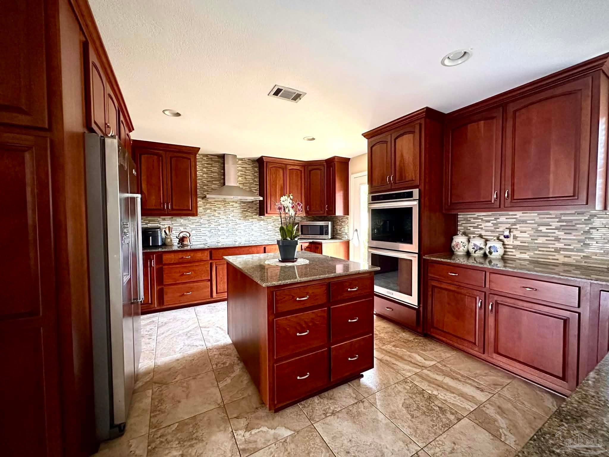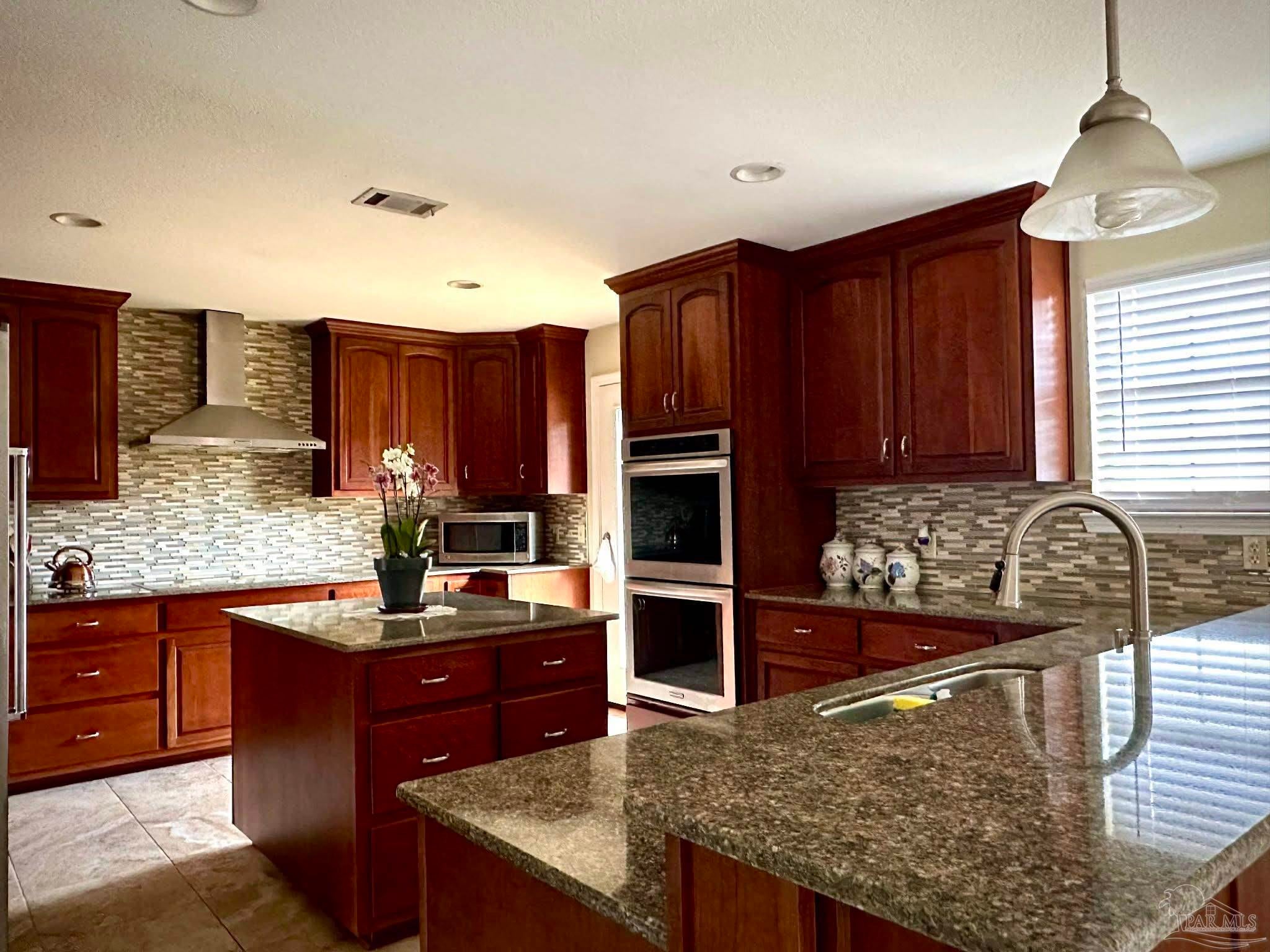 This beautiful all-brick home has been meticulously cared for by its homeowners and it truly shows. The kitchen has been thoughtfully remodeled into a gourmet space, featuring a 3x4 island for extra prep and counter space, abundant cabinet storage—including 52-inch upper cabinets—granite countertops, a double oven and a full KitchenAid appliance package. Both bathrooms have been tastefully updated with granite countertops and modern finishes. The hall bath offers a relaxing jacuzzi tub with tile surround, while the master bath features a walk-in shower with elegant tile detailing. The home is equipped with a geothermal heating and cooling system for exceptional comfort and efficiency. Additional features include a 2-car garage and a sprinkler system for easy lawn maintenance. Nestled in a peaceful, tree-lined neighborhood, the property sits on a generous 1/3-acre lot with a spacious front and backyard. The backyard is large enough to add a swimming pool and is perfect for gatherings and outdoor entertaining. Conveniently located just minutes from NAS Pensacola, downtown and our stunning white-sand, emerald beaches, this home offers comfort, tranquility and unbeatable access to Pensacola’s best attractions. With 3 generous bedrooms, 2 full baths and a charming wood-burning brick fireplace, this home is ready to welcome its next proud owners.