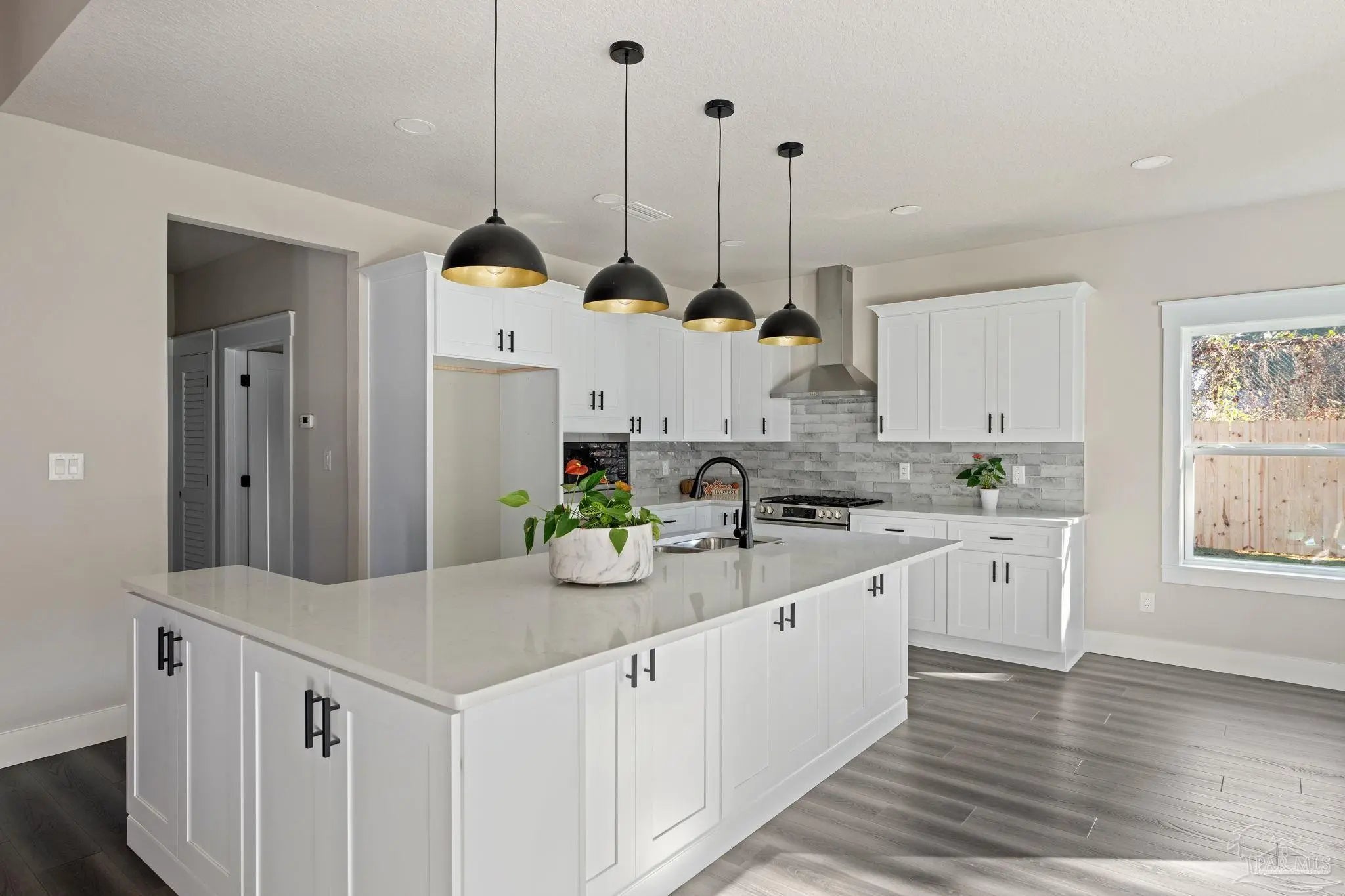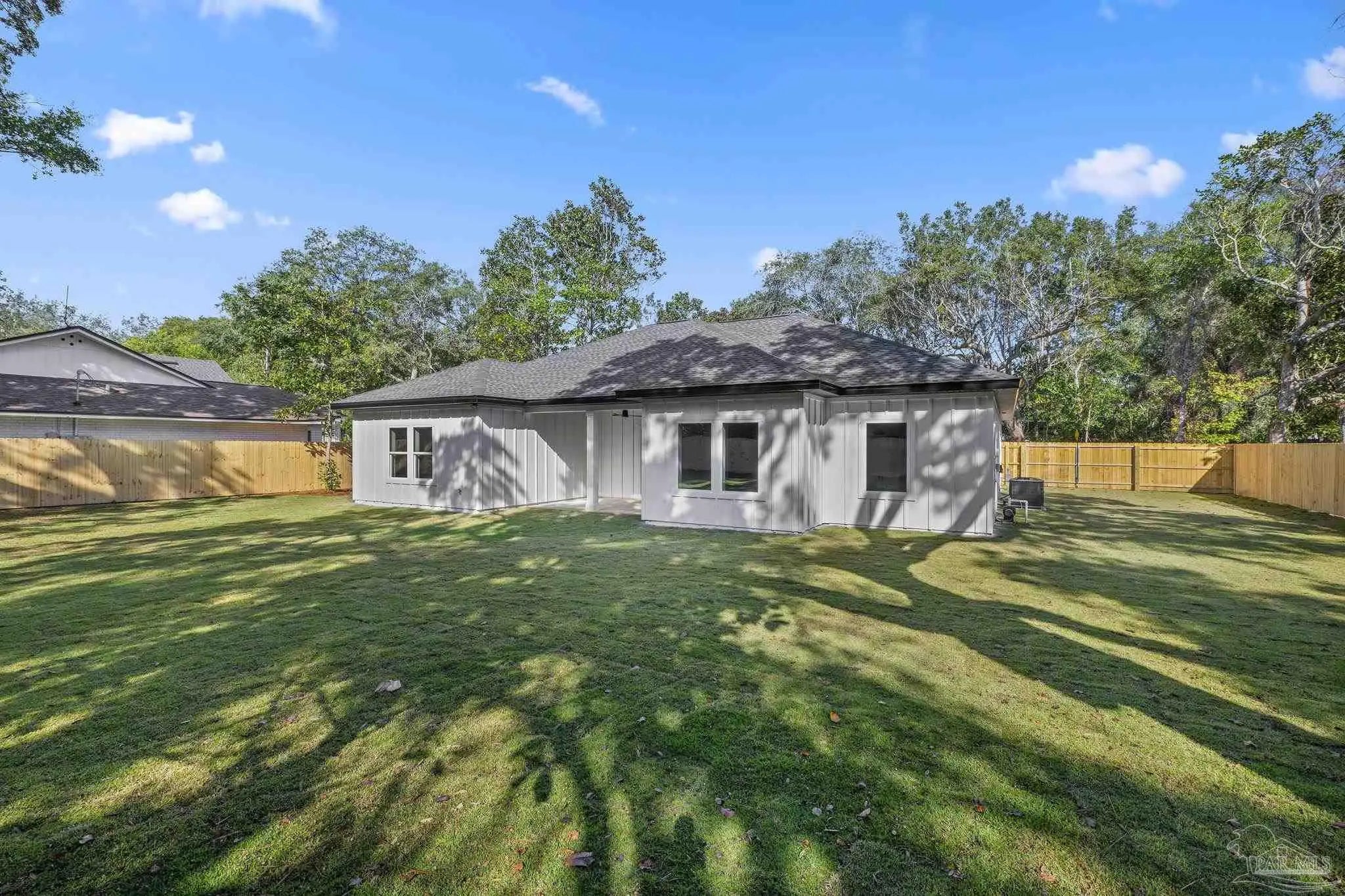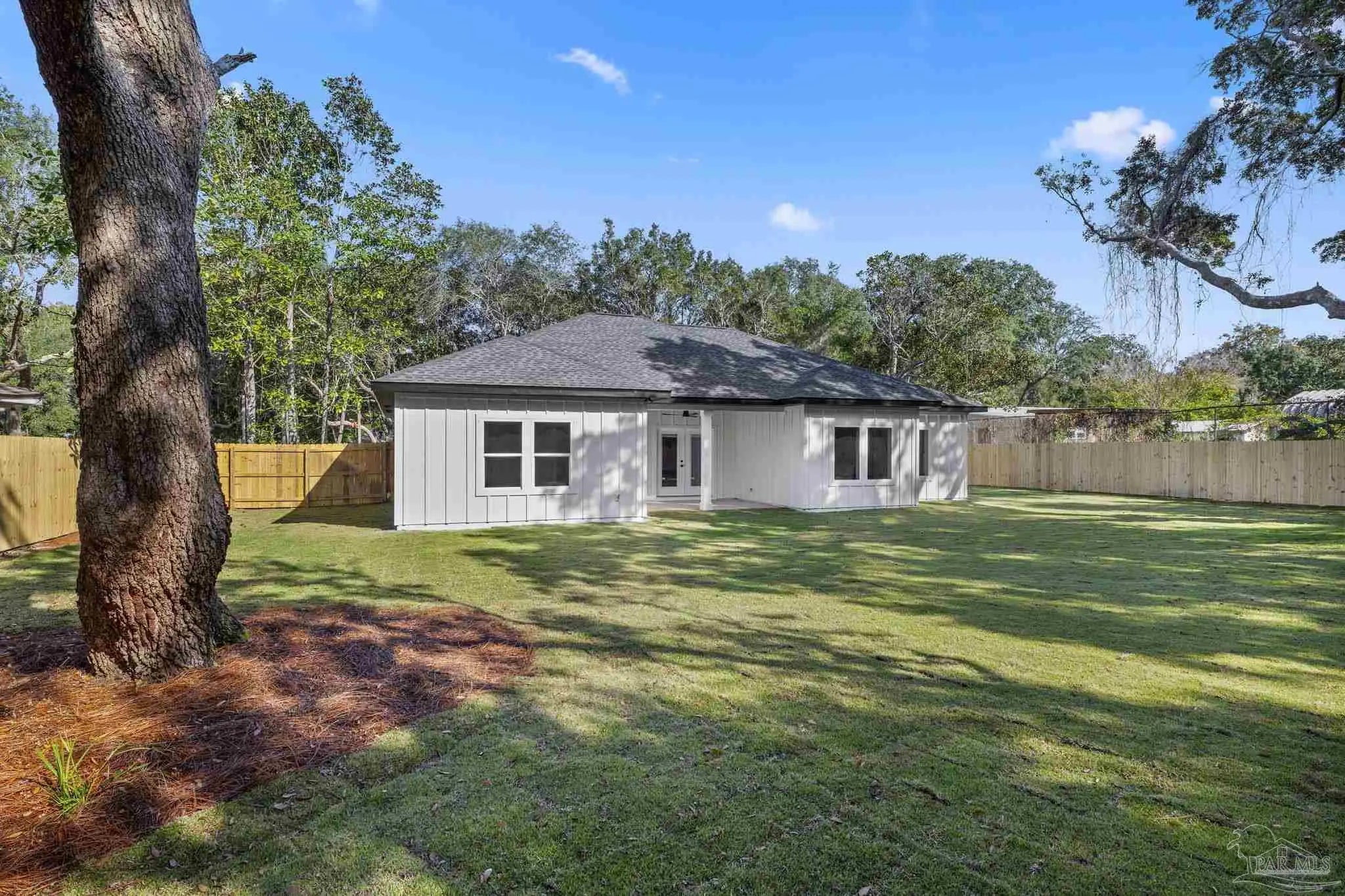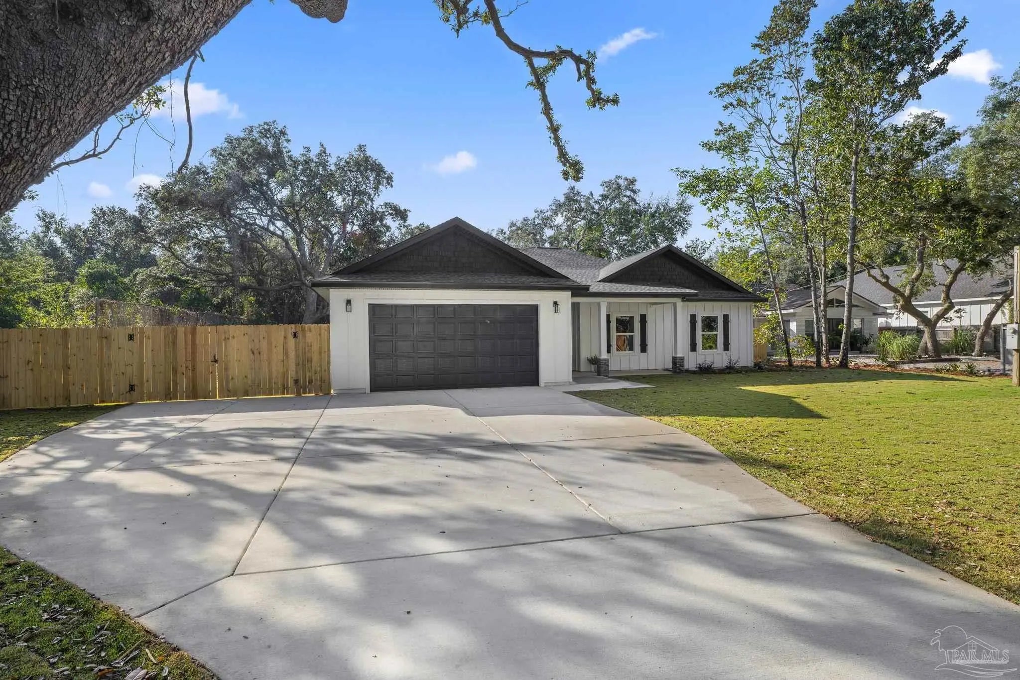 Set on a shaded street across from the bay, this custom-built 3-bedroom, 2-bath home offers an ideal mix of comfort and coastal charm. The open floor plan features a spacious living area centered around an electric fireplace, filled with natural light and complemented by upgraded luxury vinyl plank flooring and custom lighting throughout. The kitchen includes quartz countertops, custom cabinetry, stainless steel appliances, and a gas range. The primary suite provides a relaxing retreat with dual walk-in closets, a soaking tub, separate tiled shower, and double vanities. Two additional bedrooms and a full guest bath offer plenty of room for family or visitors. A large laundry room with built-in cabinetry and desk space adds functionality, while the oversized two-car garage provides ample storage. Outside, the home features a covered front porch and a covered back patio overlooking a fenced backyard with upgraded Zoysia grass and plenty of space to add a pool. Ideally located near shopping, dining, and the area’s sugar-white beaches, this home combines thoughtful design with the best of Gulf Breeze living.