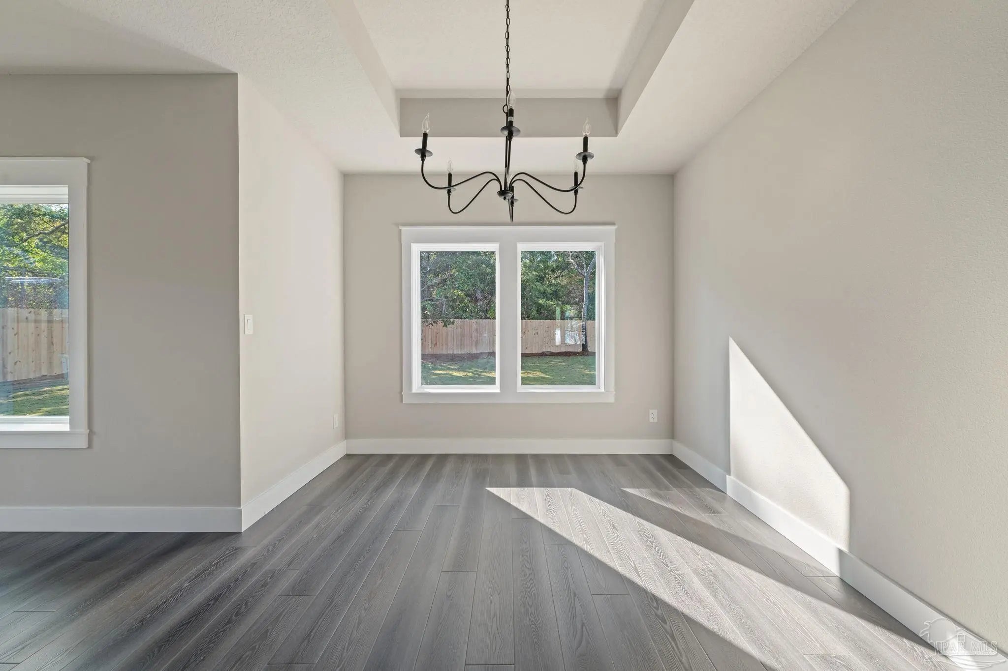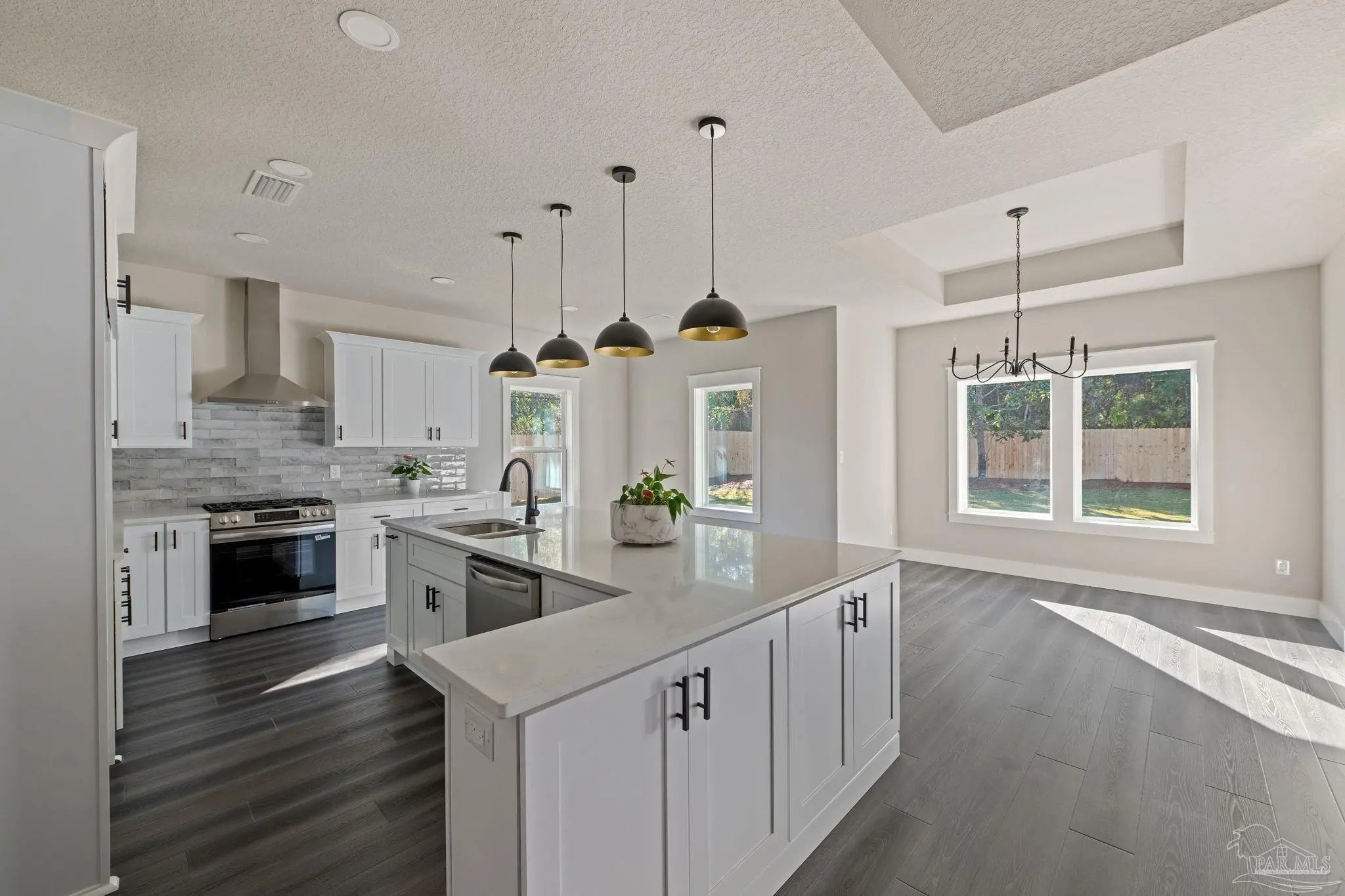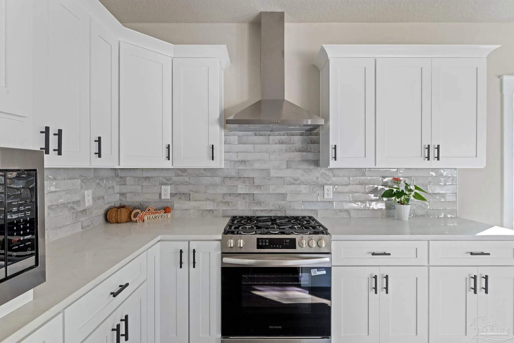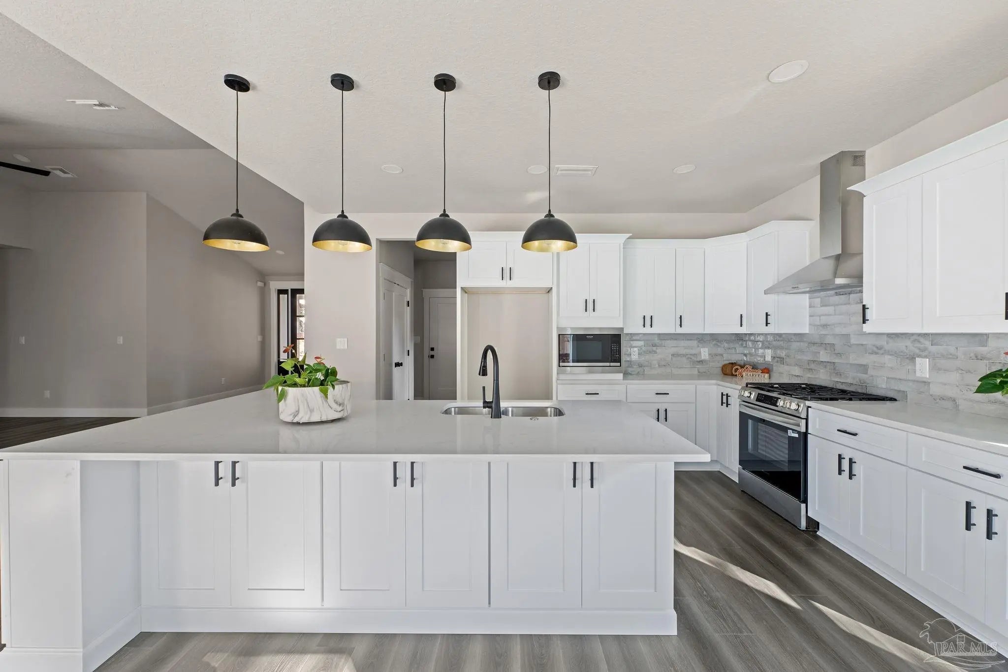Set on a shaded street across from the bay, this custom-built 3-bedroom, 2-bath home offers an ideal mix of comfort and coastal charm. The open floor plan features a spacious living area centered around an electric fireplace, filled with natural light and complemented by upgraded luxury vinyl plank flooring and custom lighting throughout. The kitchen includes quartz countertops, custom cabinetry, stainless steel appliances, and a gas range. The primary suite provides a relaxing retreat with dual walk-in closets, a soaking tub, separate tiled shower, and double vanities. Two additional bedrooms and a full guest bath offer plenty of room for family or visitors. A large laundry room with built-in cabinetry and desk space adds functionality, while the oversized two-car garage provides ample storage. Outside, the home features a covered front porch and a covered back patio overlooking a fenced backyard with upgraded Zoysia grass and plenty of space to add a pool. Ideally located near shopping, dining, and the area’s sugar-white beaches, this home combines thoughtful design with the best of Gulf Breeze living.