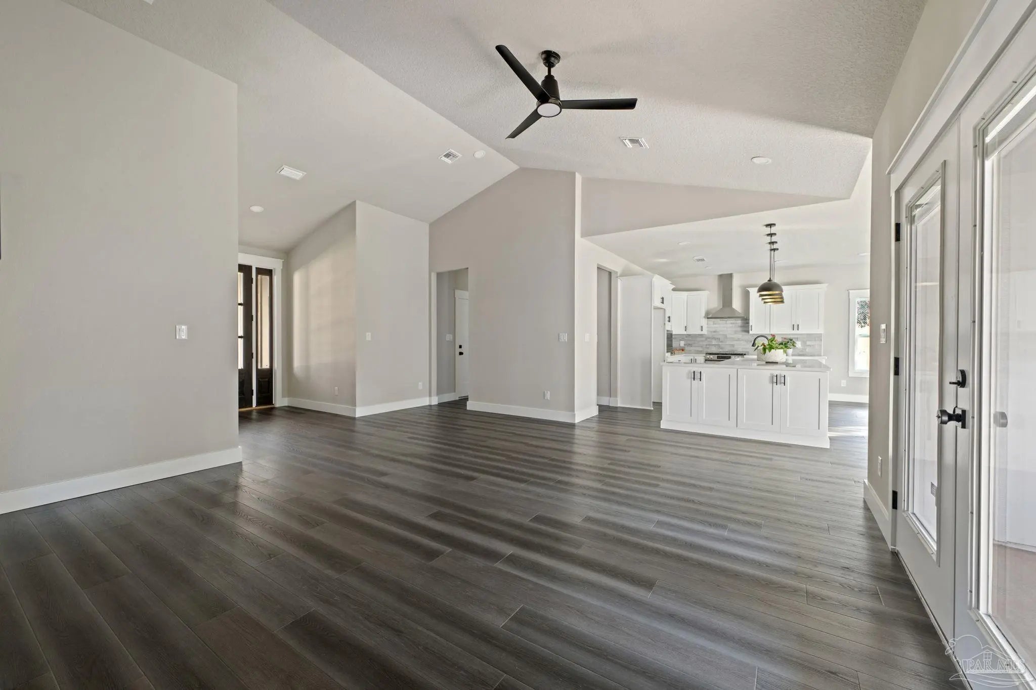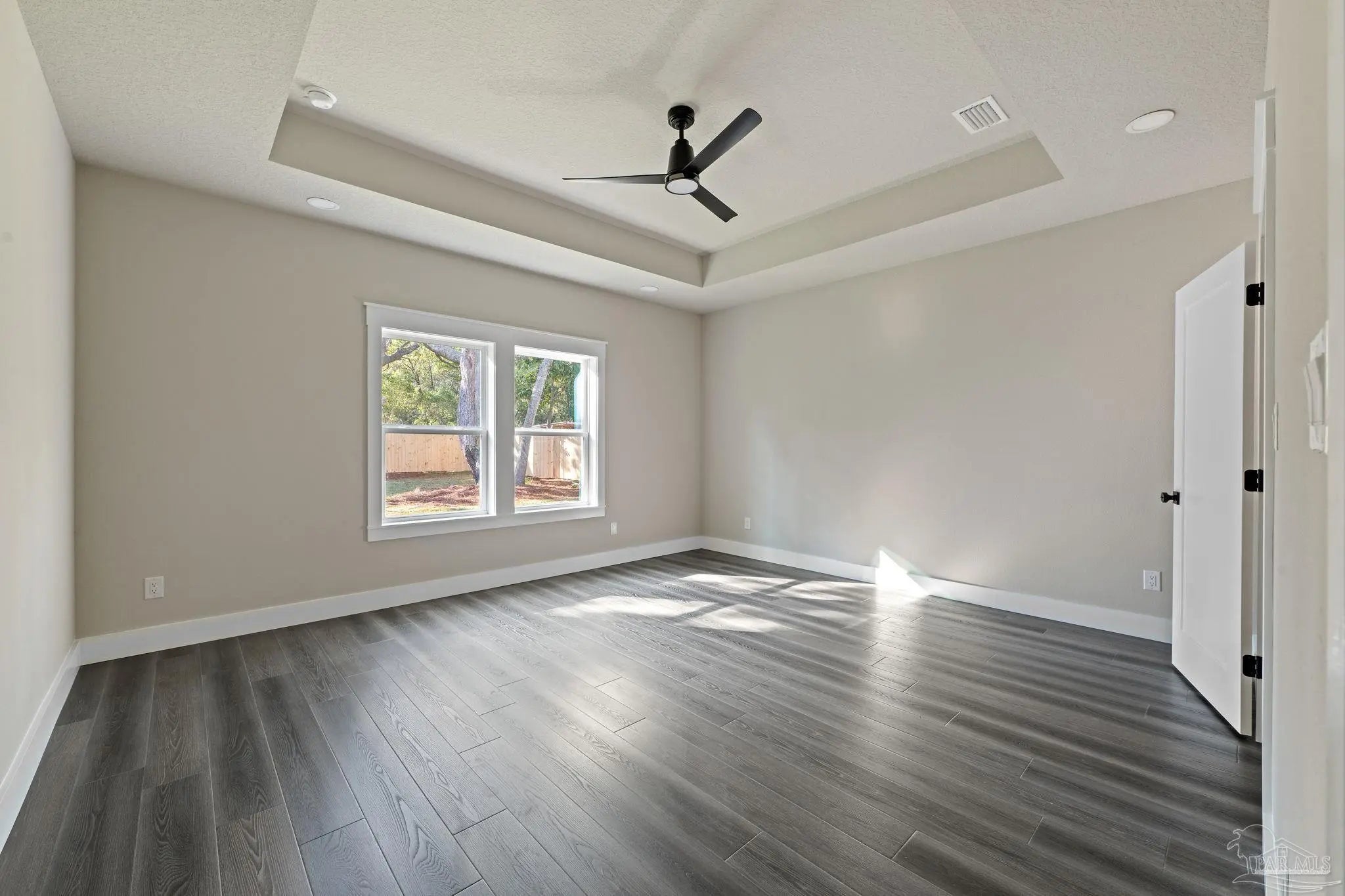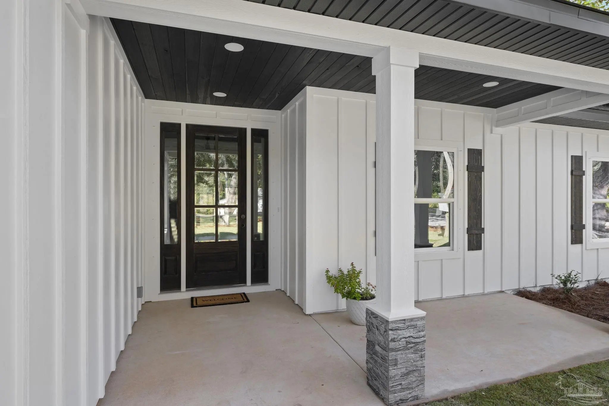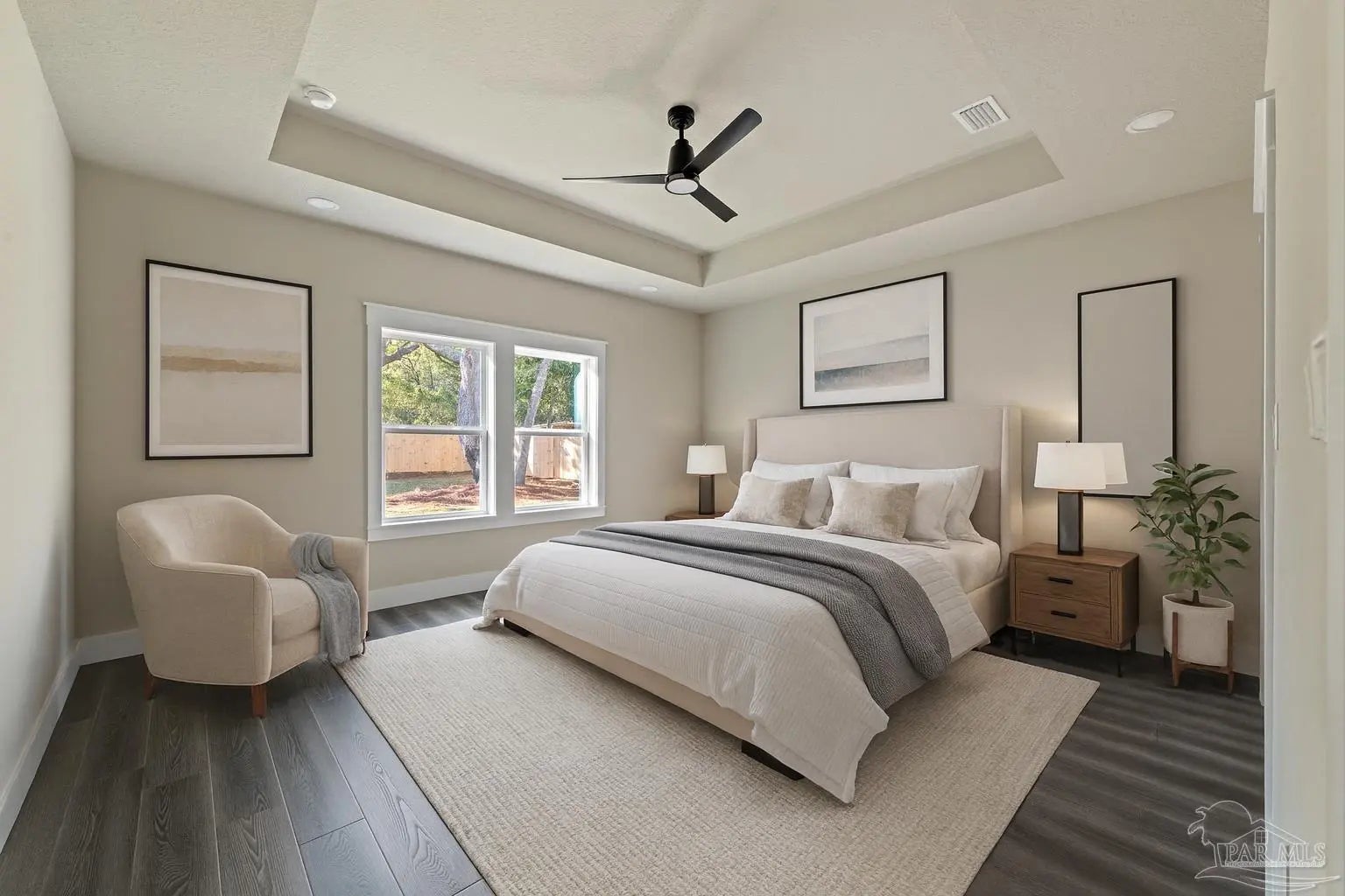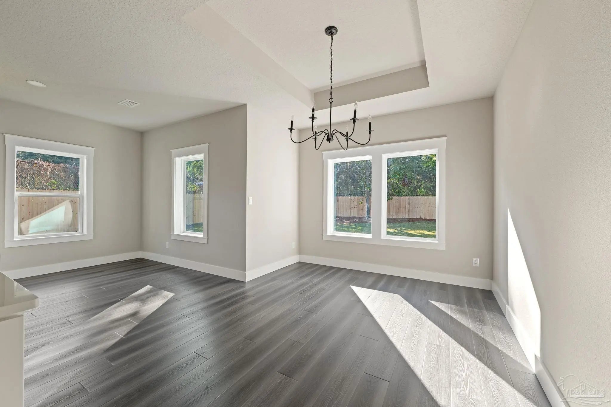 Set on a shaded street across from the bay, this custom-built 3-bedroom, 2-bath home offers an ideal mix of comfort and coastal charm. The open floor plan features a spacious living area centered around an electric fireplace, filled with natural light and complemented by upgraded luxury vinyl plank flooring and custom lighting throughout. The kitchen includes quartz countertops, custom cabinetry, stainless steel appliances, and a gas range. The primary suite provides a relaxing retreat with dual walk-in closets, a soaking tub, separate tiled shower, and double vanities. Two additional bedrooms and a full guest bath offer plenty of room for family or visitors. A large laundry room with built-in cabinetry and desk space adds functionality, while the oversized two-car garage provides ample storage. Outside, the home features a covered front porch and a covered back patio overlooking a fenced backyard with upgraded Zoysia grass and plenty of space to add a pool. Ideally located near shopping, dining, and the area’s sugar-white beaches, this home combines thoughtful design with the best of Gulf Breeze living.