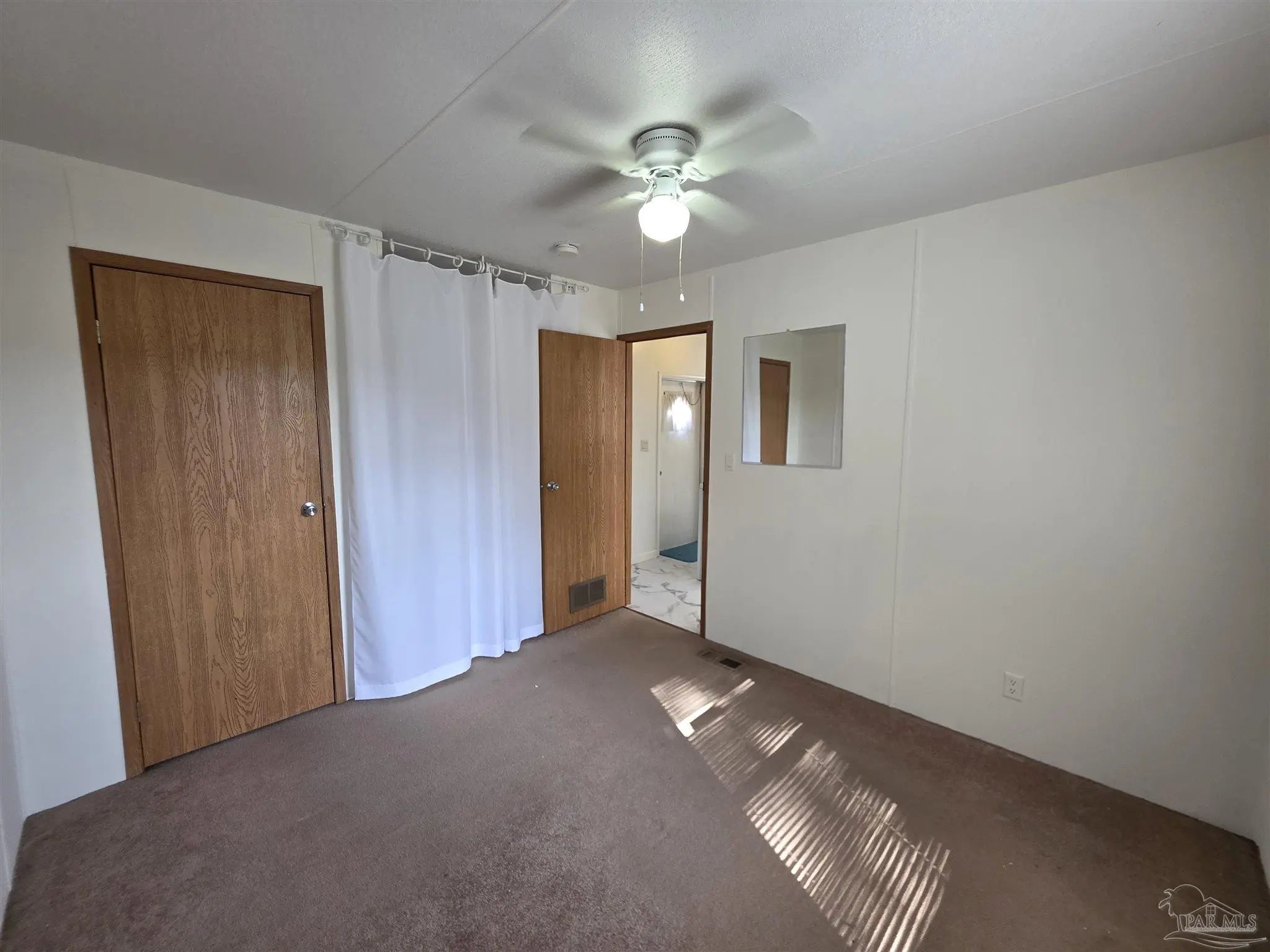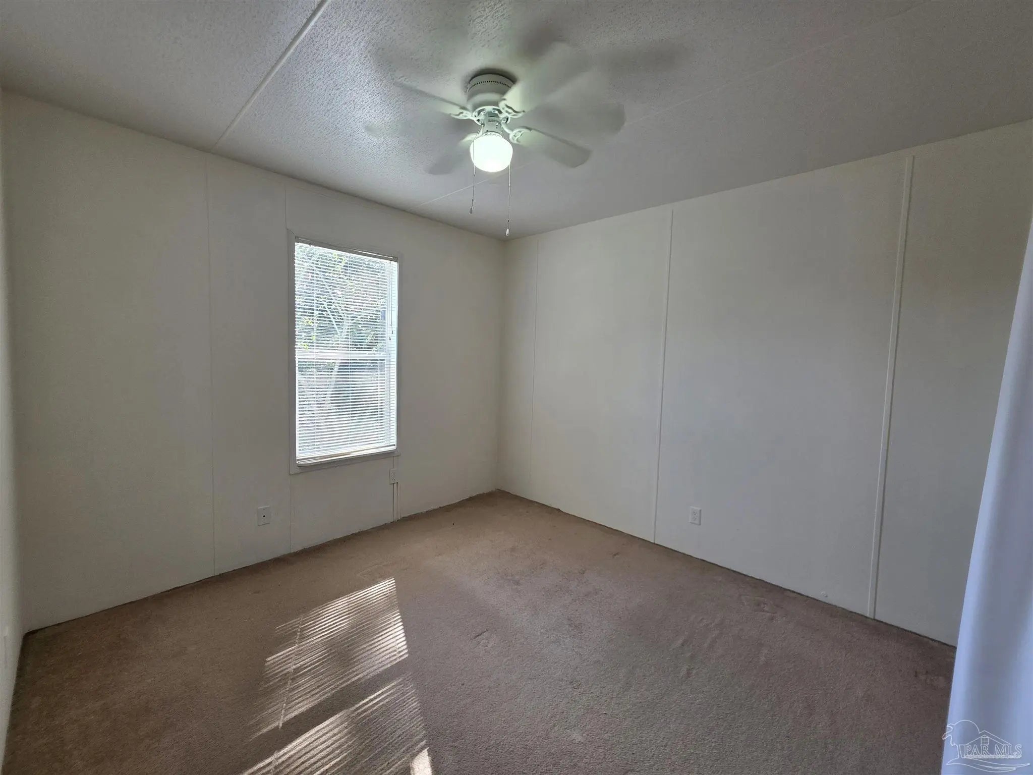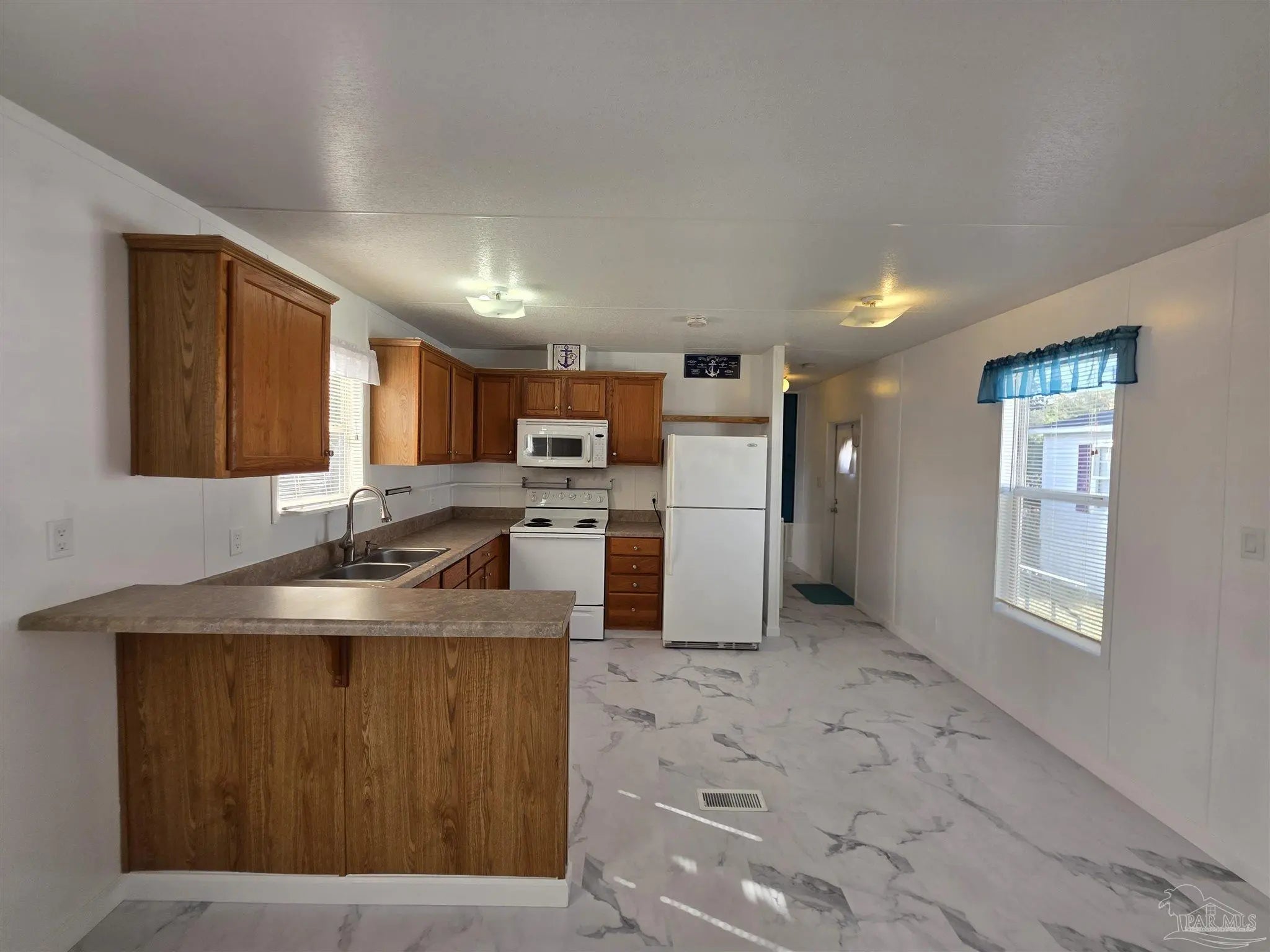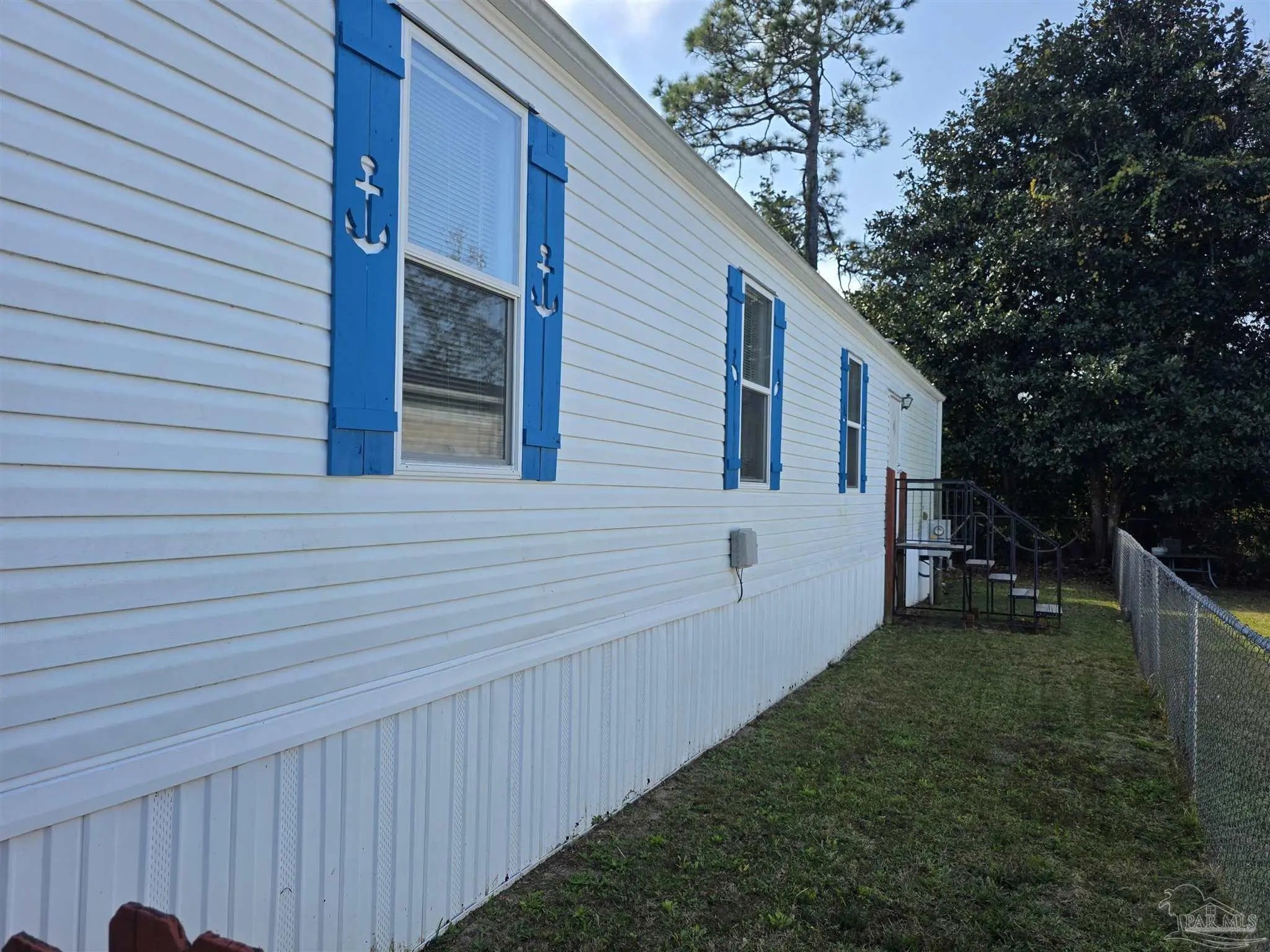 Welcome to this charming 3 bedroom, 1 bath mobile home in Bayou Grande Villas, located in Southwest Pensacola. This home features an open floor plan with a kitchen/dining combo, which includes a breakfast bar and a pantry for all your culinary needs. The bright and airy living room is perfect for entertaining or relaxing in the evening. The split bedroom layout offers privacy, and the master bedroom includes an extra closet for storage. The home is all-electric and offers an indoor laundry area with washer/dryer hookups. Enjoy carpeting in the bedrooms and new vinyl flooring throughout the rest of the home. Energy-efficient amenities include double-pane windows, central heating and air, and ceiling fans. Outside, the spacious front deck is ideal for soaking up the Florida sunshine, while the side yard features a private gate leading to a greenway with seating for quiet moments in nature. The property is adorned with fruit trees and blueberry bushes for your enjoyment. No pets or roommates allowed. Residents also have access to a community pool, dock, boat ramp, and storage area for large vehicles and boats. Conveniently located near the back gate of NAS Pensacola, Naval Hospital, PSC, Perdido Key, and the beaches.