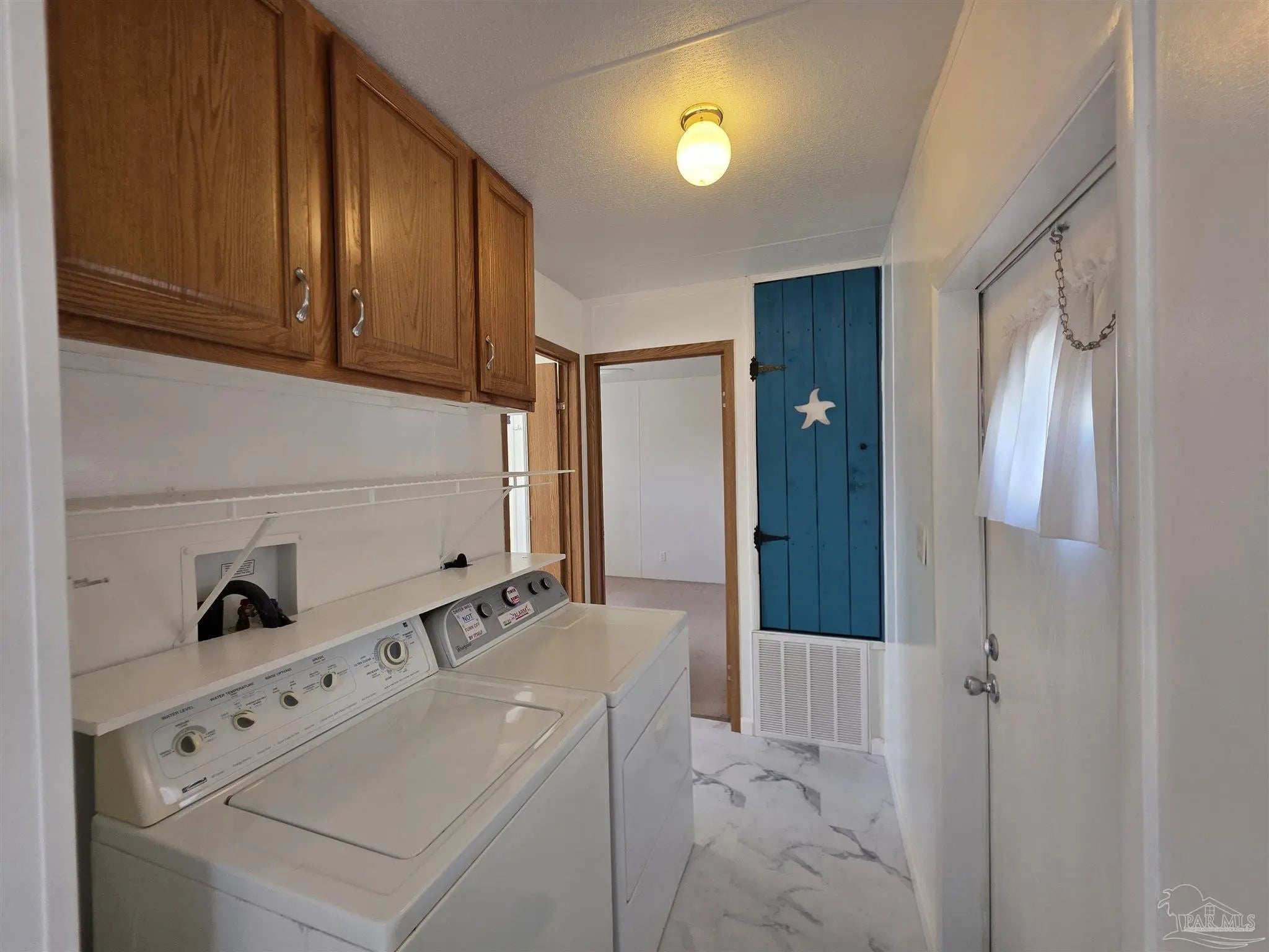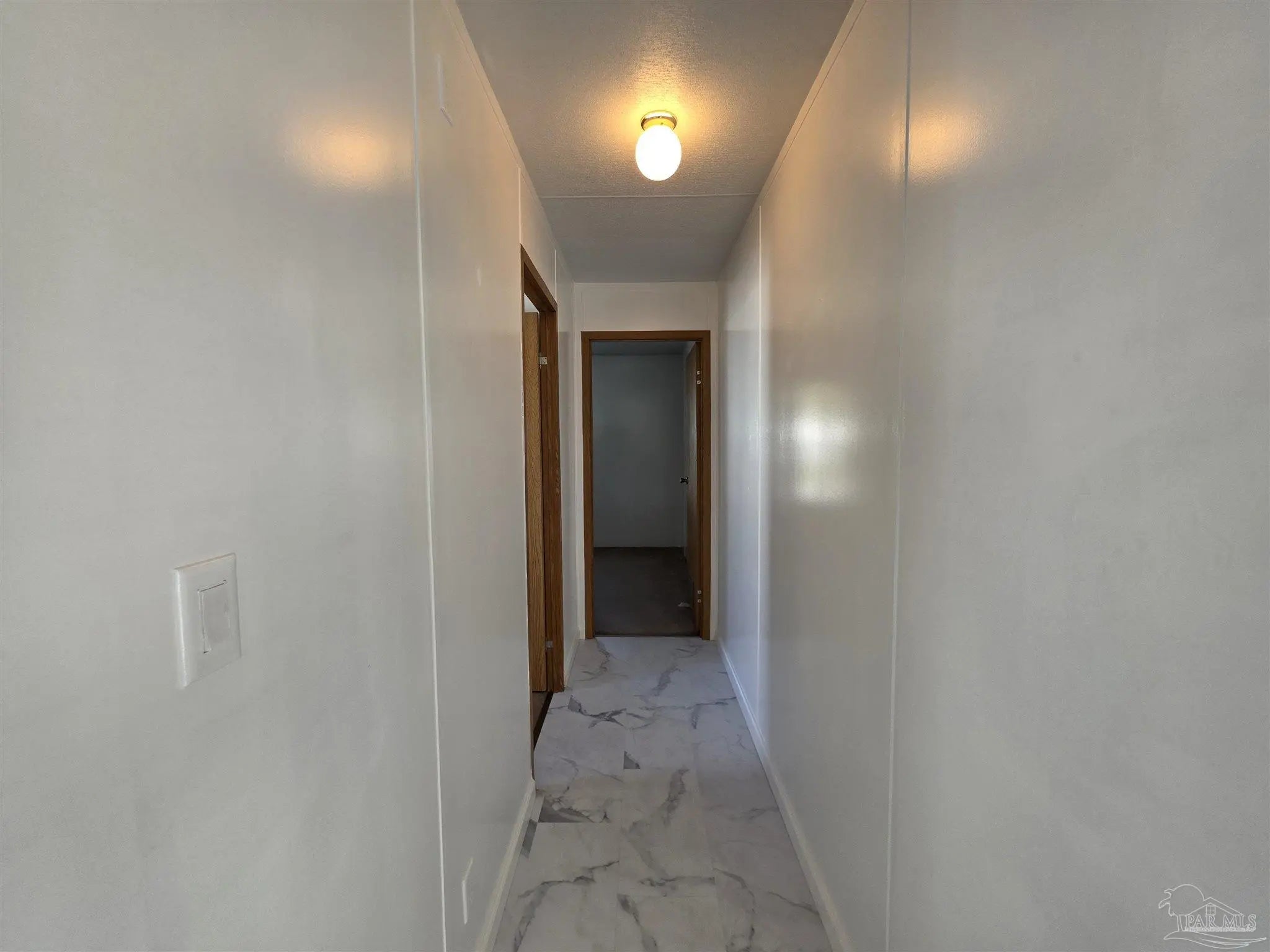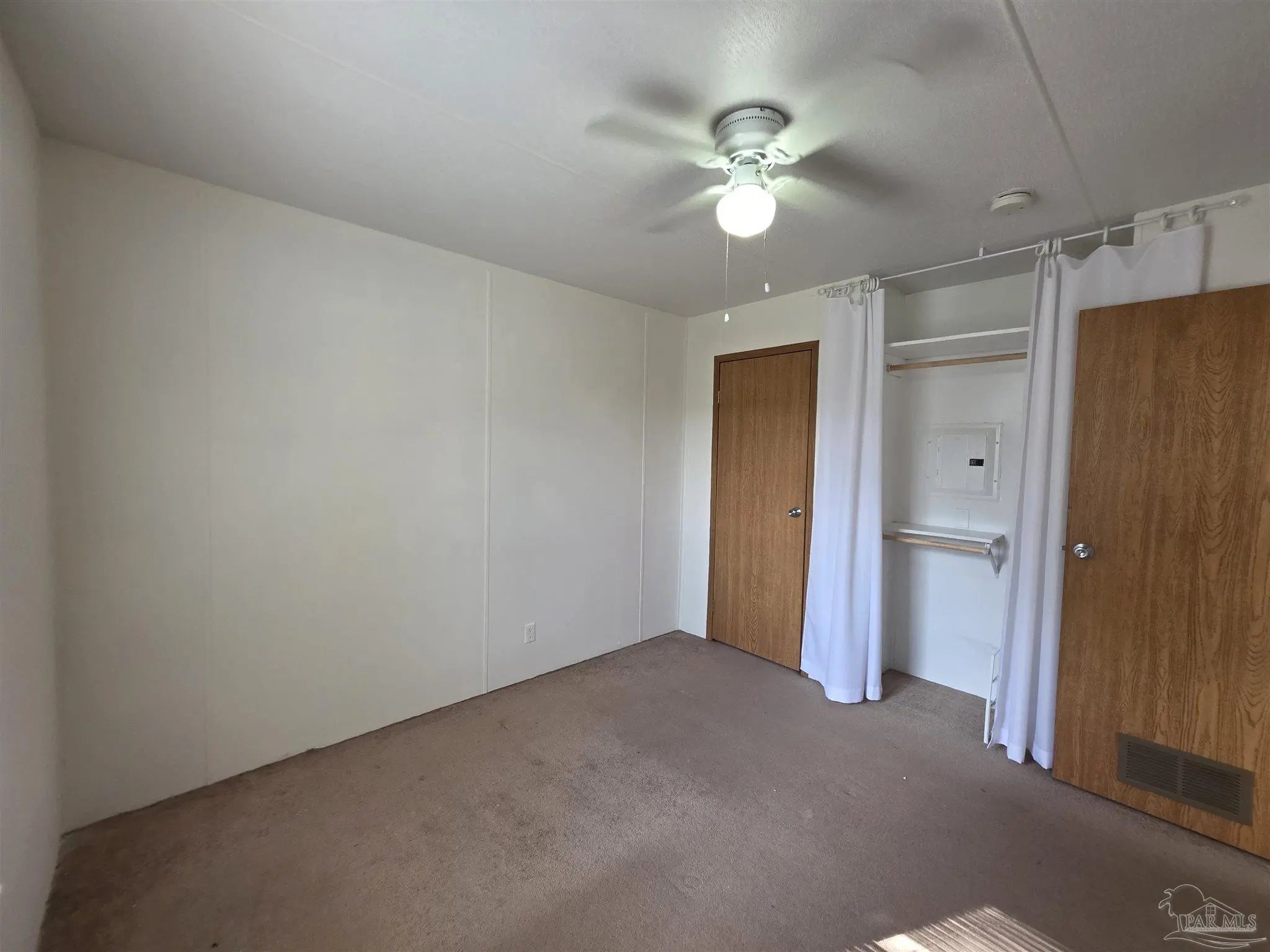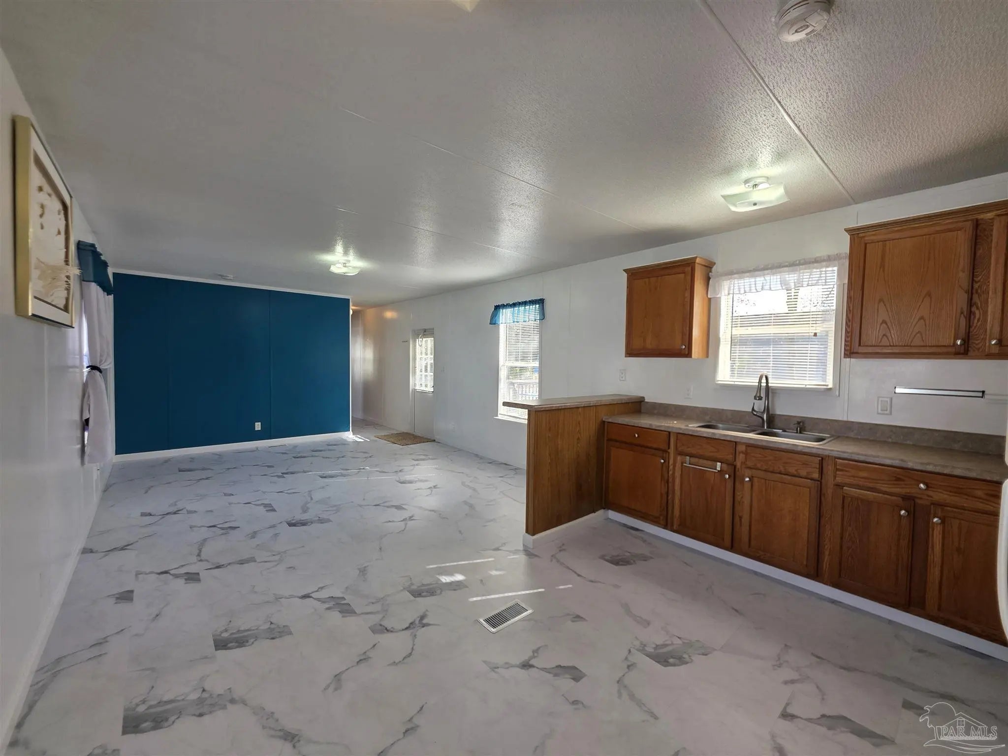 Welcome to this charming 3 bedroom, 1 bath mobile home in Bayou Grande Villas, located in Southwest Pensacola. This home features an open floor plan with a kitchen/dining combo, which includes a breakfast bar and a pantry for all your culinary needs. The bright and airy living room is perfect for entertaining or relaxing in the evening. The split bedroom layout offers privacy, and the master bedroom includes an extra closet for storage. The home is all-electric and offers an indoor laundry area with washer/dryer hookups. Enjoy carpeting in the bedrooms and new vinyl flooring throughout the rest of the home. Energy-efficient amenities include double-pane windows, central heating and air, and ceiling fans. Outside, the spacious front deck is ideal for soaking up the Florida sunshine, while the side yard features a private gate leading to a greenway with seating for quiet moments in nature. The property is adorned with fruit trees and blueberry bushes for your enjoyment. No pets or roommates allowed. Residents also have access to a community pool, dock, boat ramp, and storage area for large vehicles and boats. Conveniently located near the back gate of NAS Pensacola, Naval Hospital, PSC, Perdido Key, and the beaches.