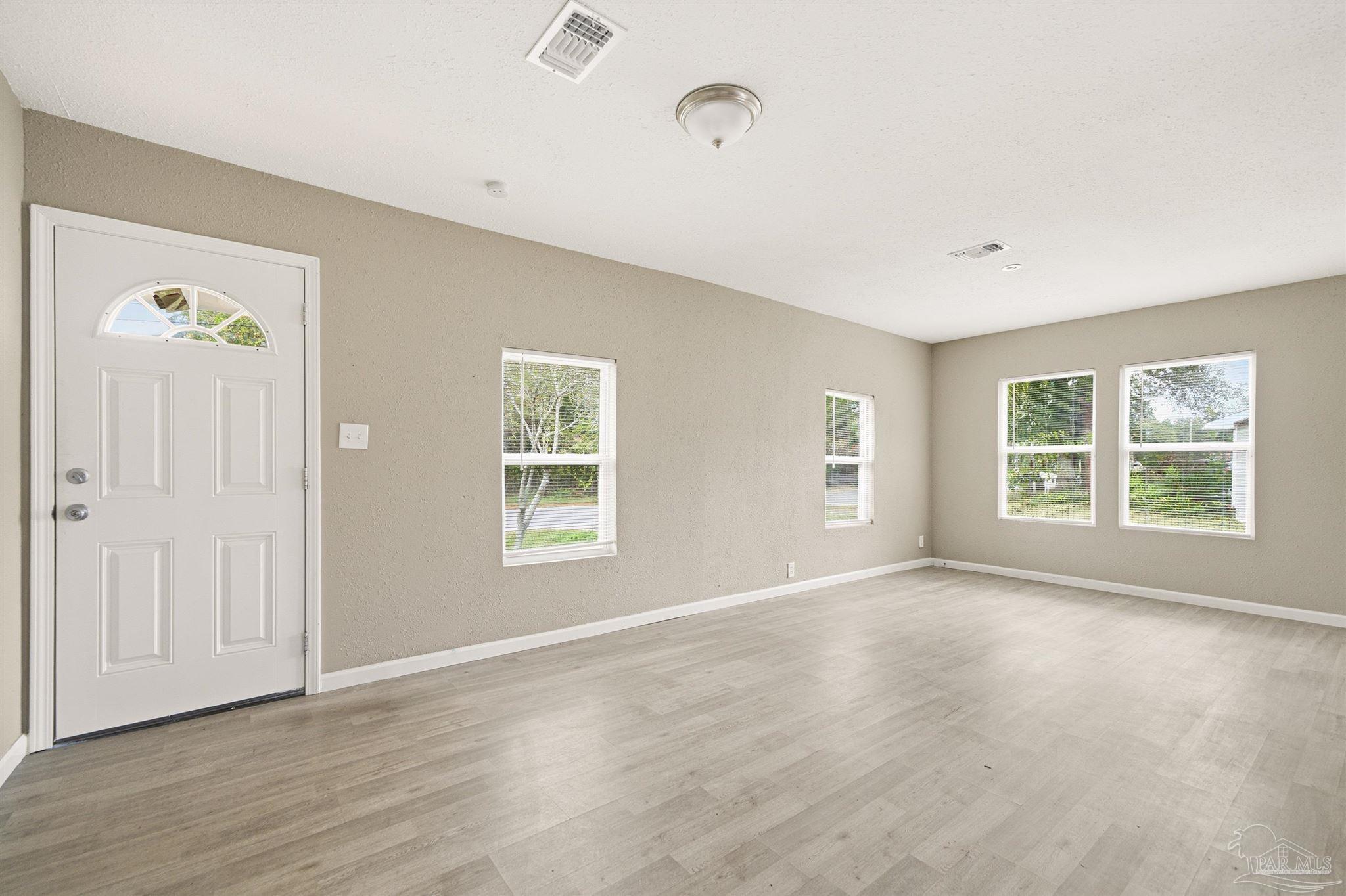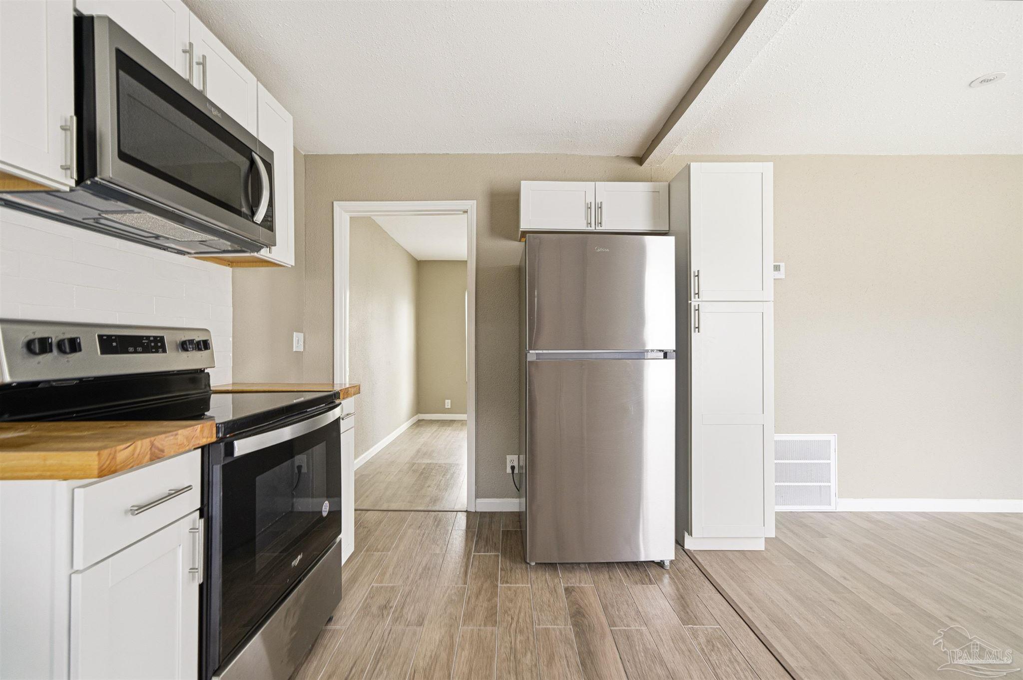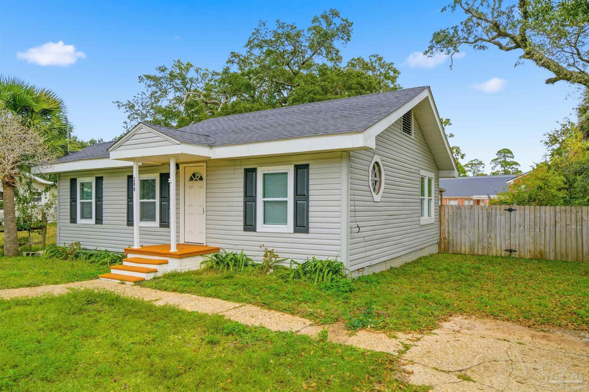206 S 2nd Street is a charming 3 bedroom, 2 bath Pensacola cottage offering 1,040 square feet of bright, inviting living space. The home features sunny interiors with LVP flooring, modern ceiling fans throughout, and a unique circular window in the bedroom that adds architectural interest. The all-white kitchen blends classic and modern style with shaker cabinetry, butcher block countertops, white subway tile backsplash, and stainless steel appliances. The bathroom includes marble-look tile for an elevated feel. Outside, enjoy a beautiful yard shaded by mature trees and plenty of room to relax or garden, along with a covered back patio that extends your living area outdoors. The location offers easy access to everyday essentials and major corridors. Situated just off Navy Blvd, you’re close to grocery stores, restaurants, and daily conveniences, as well as quick routes to downtown Pensacola, NAS Pensacola, and local beaches. A great spot for anyone seeking comfort and convenience without sacrificing charm. Schedule your private showing today!