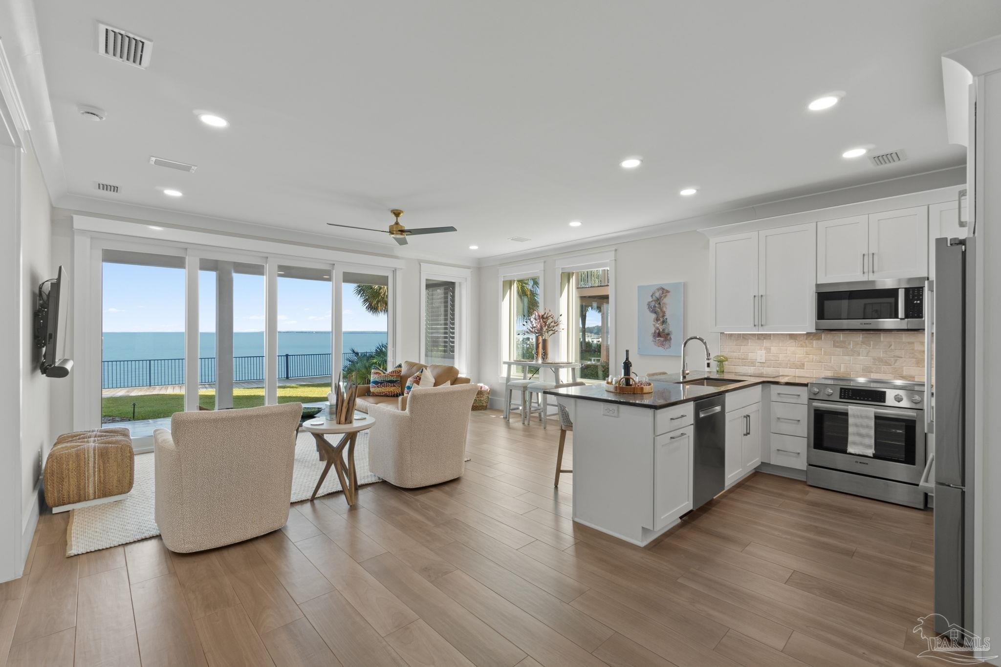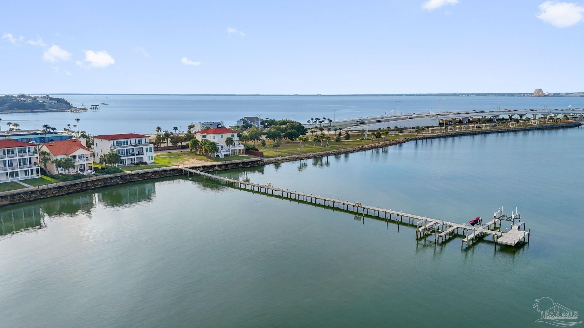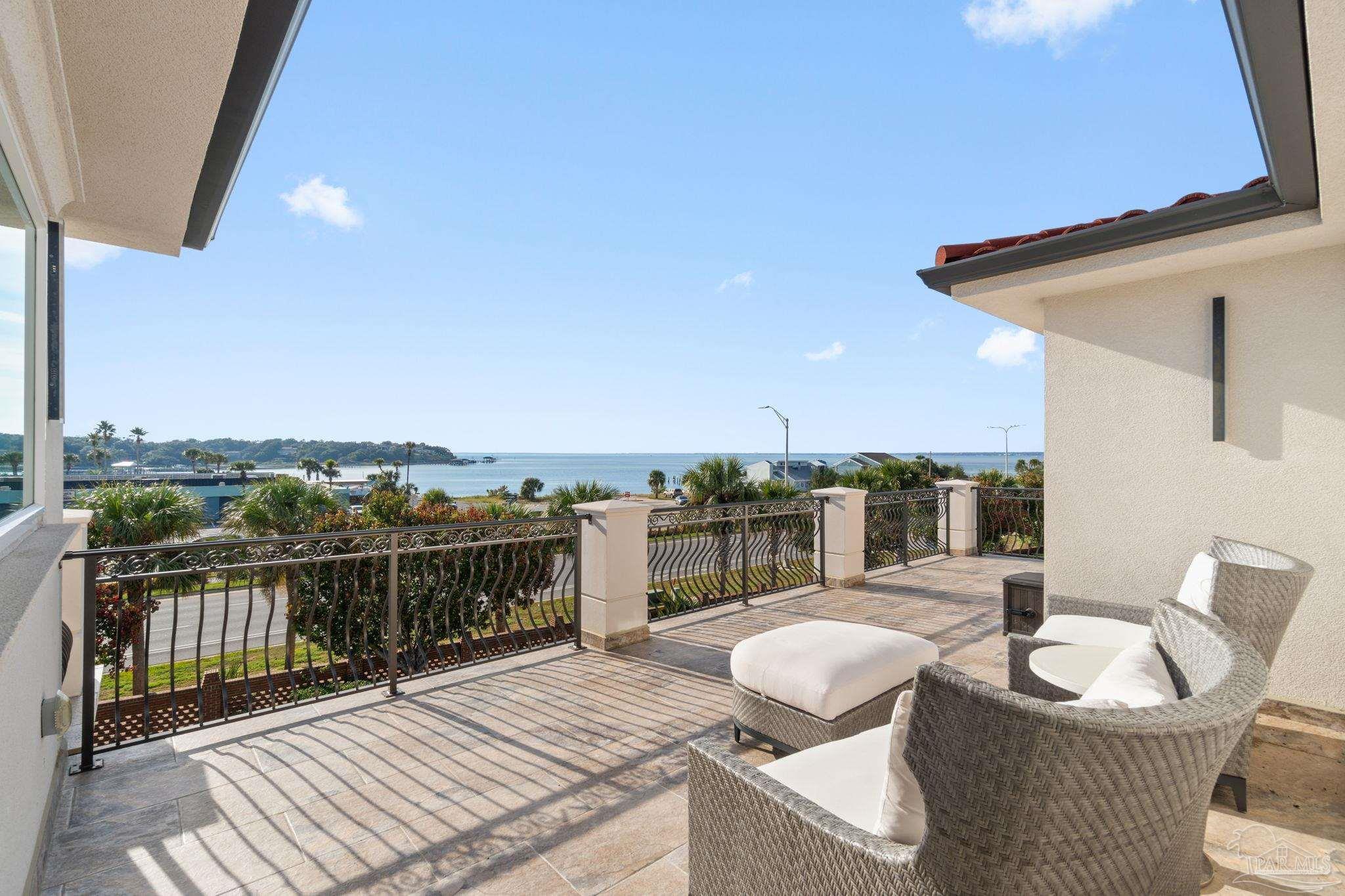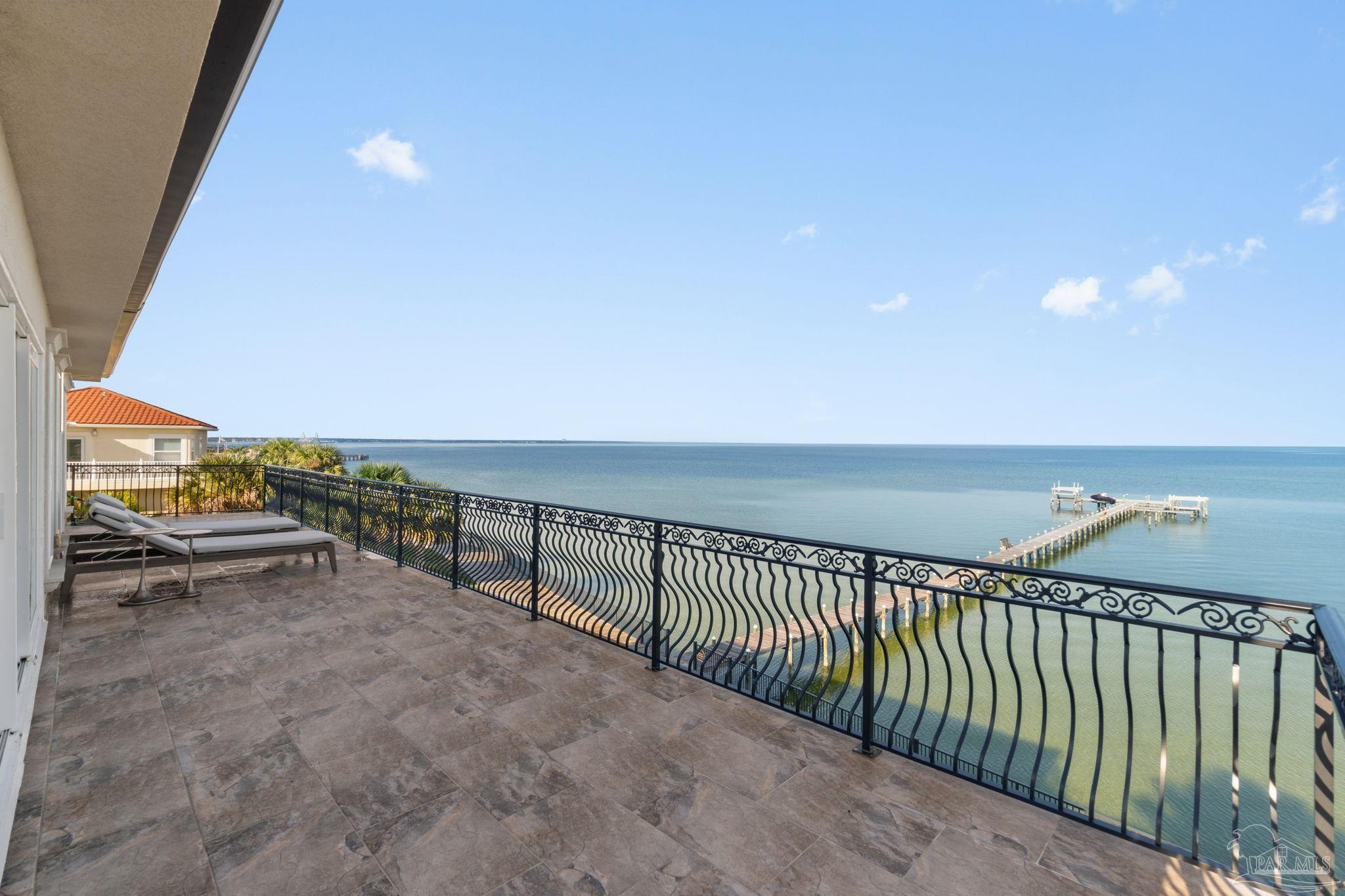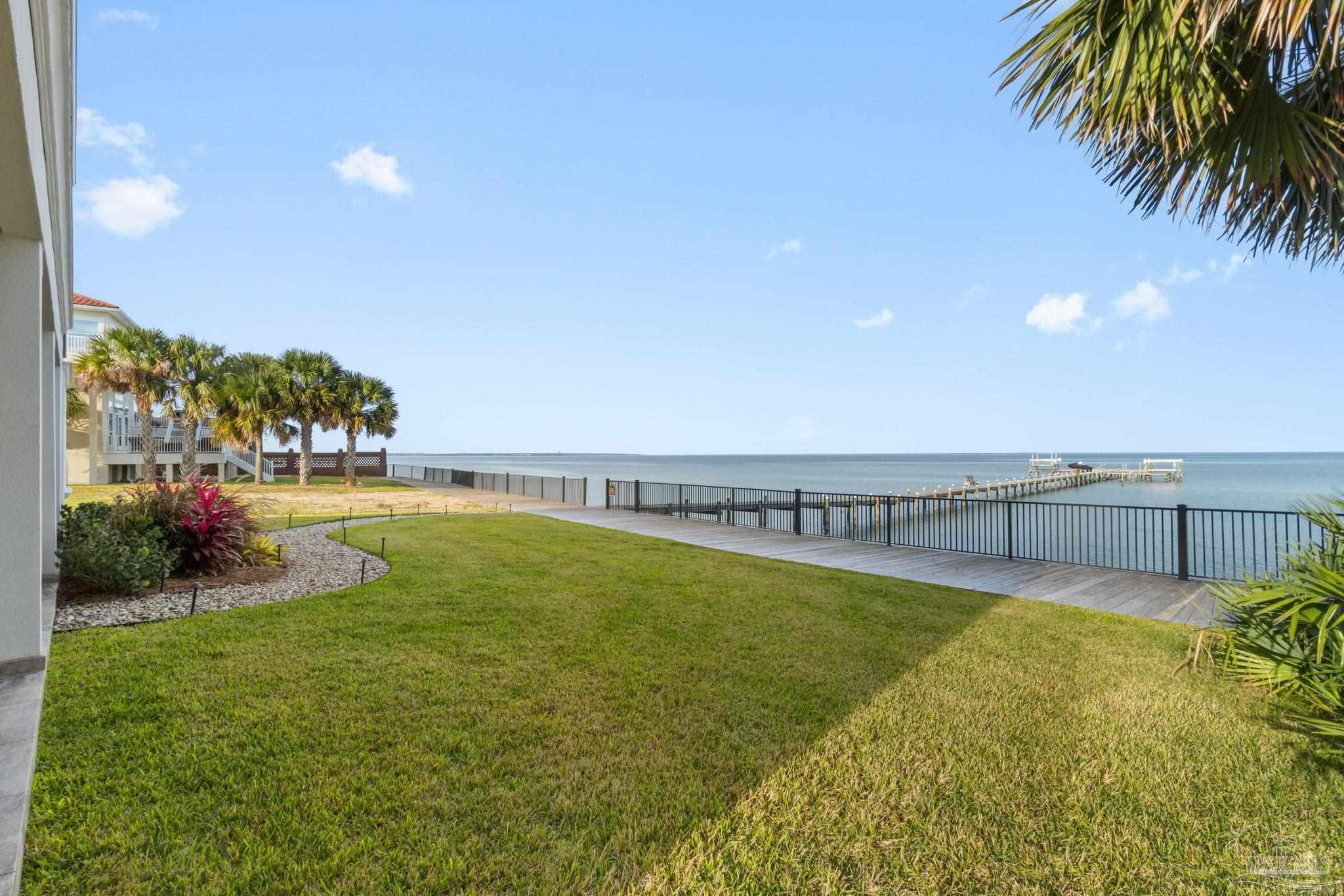 Stunning custom waterfront residence on Pensacola Bay featuring 72 feet of waterfront and private dock. This beautiful home is 4,609 SF with 4 bedrooms, 6 full baths and 1 half bath and elevator. Guest suite on first floor complete with own kitchen, living room, bedroom and full bath. Second floor serves as main living offering open kitchen, family room,bar and formal dining room. Large primary suite with sitting area overlooking Pensacola Bay. Sliding doors open from the family room to a large covered balcony creating effortless flow for entertaining. The third floor has a large media room with sliding doors that open to a large open balcony, 2 additional bedrooms each with full baths and bar. A rare opportunity to own exceptional waterfront property in Gulf Breeze proper.