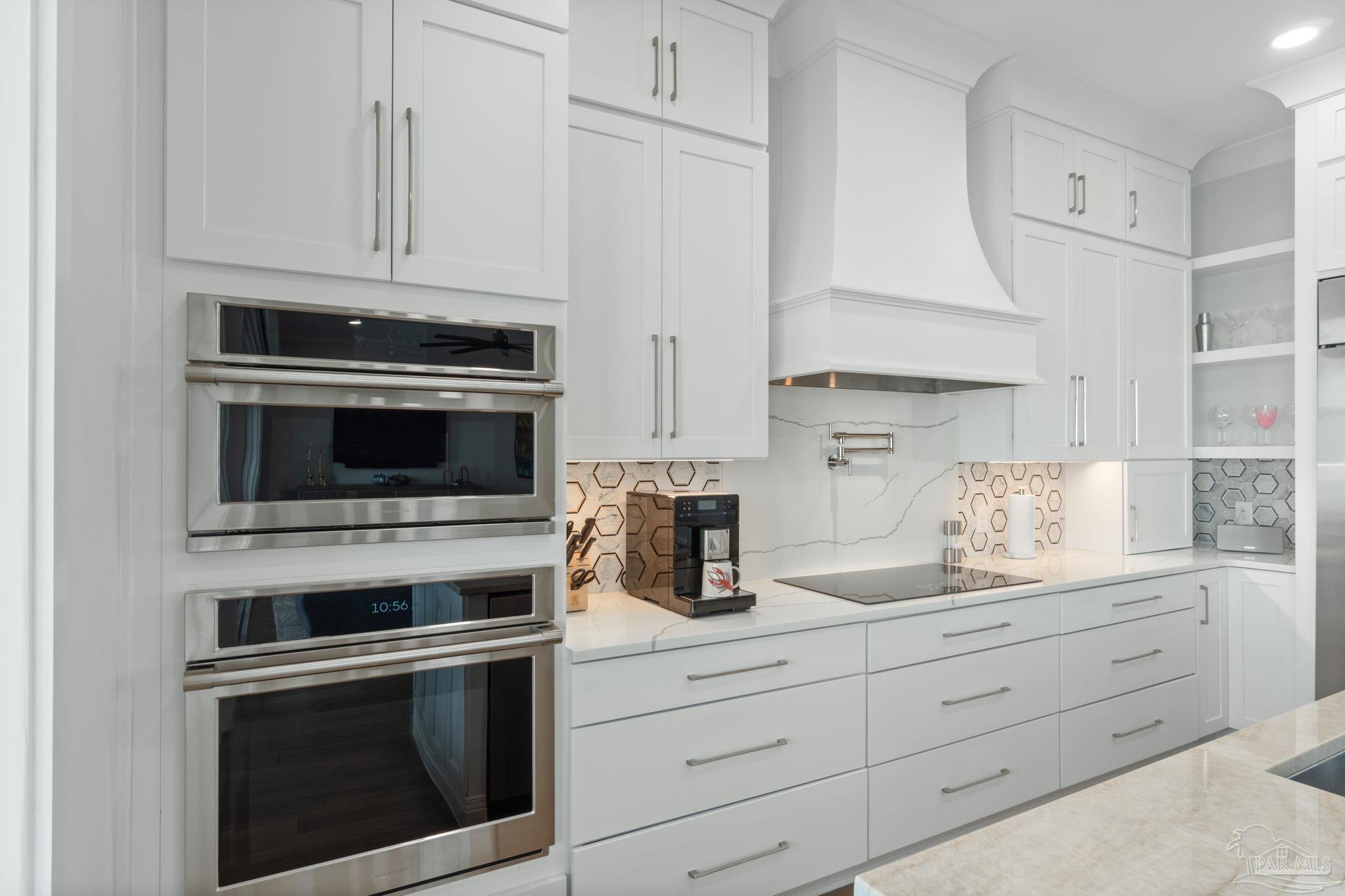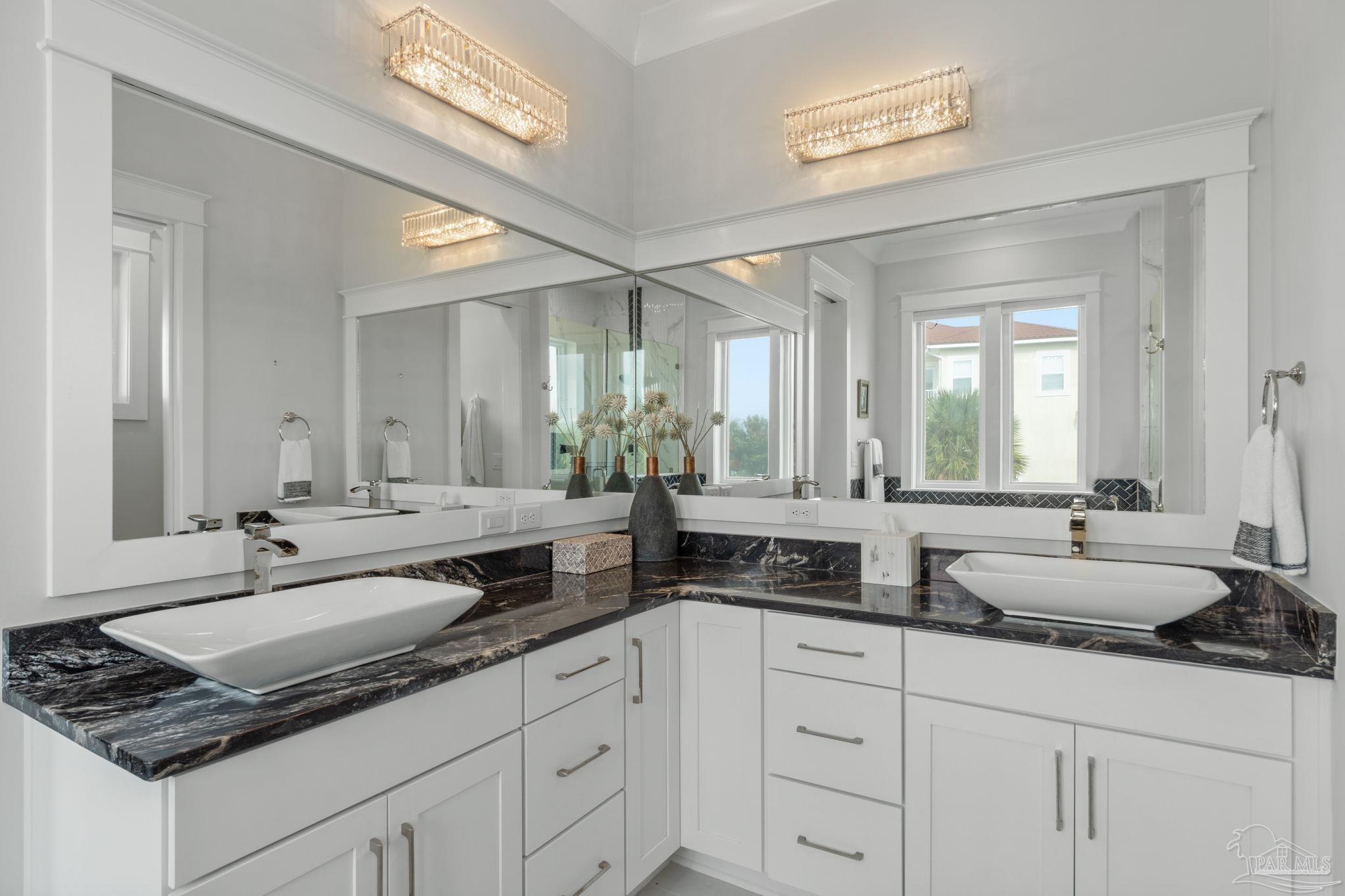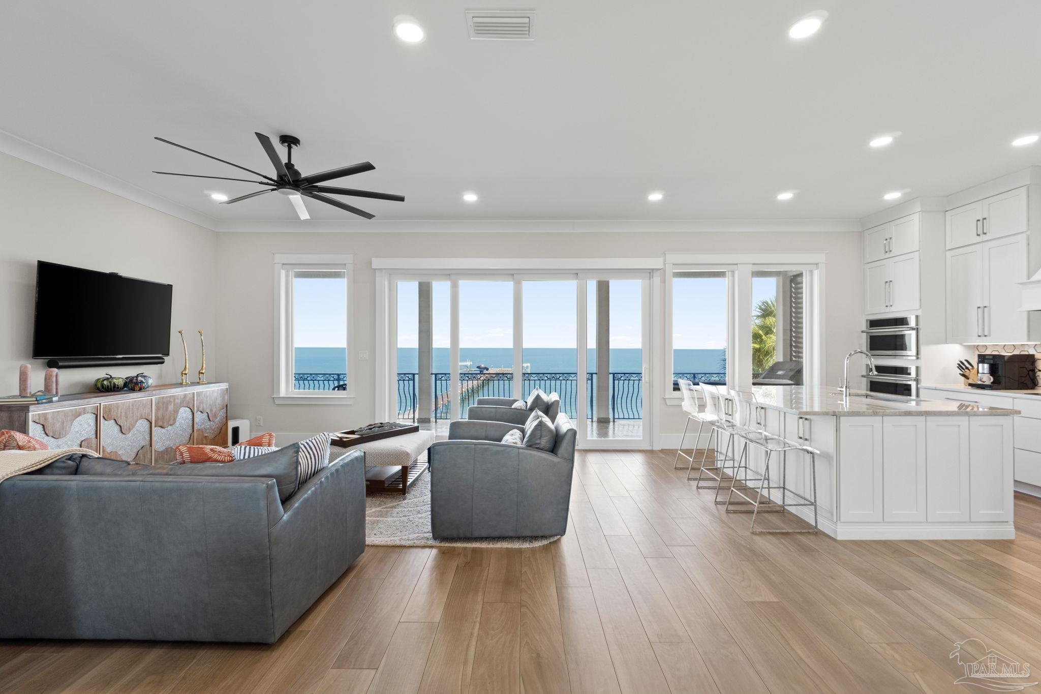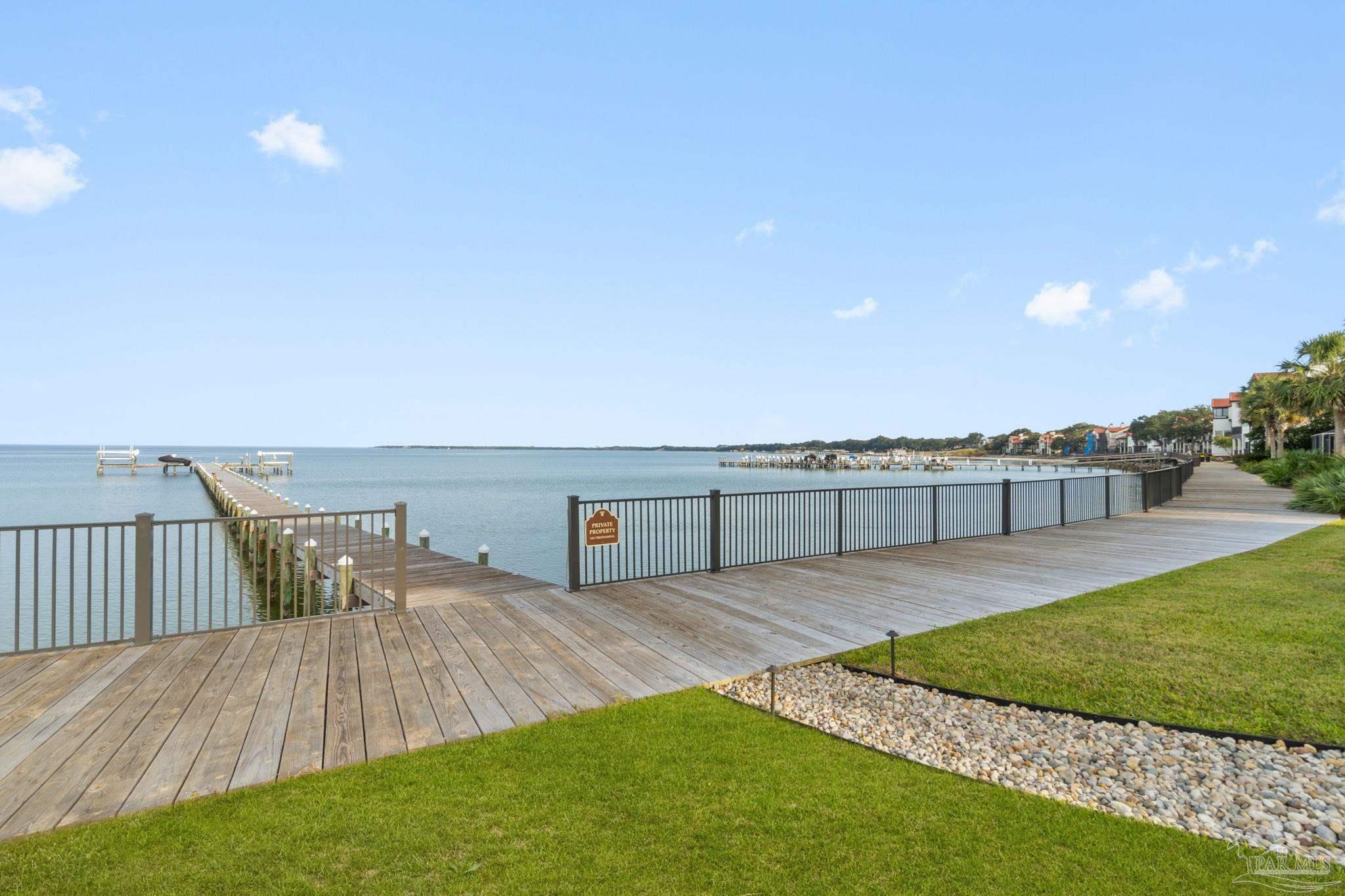 Stunning custom waterfront residence on Pensacola Bay featuring 72 feet of waterfront and private dock. This beautiful home is 4,609 SF with 4 bedrooms, 6 full baths and 1 half bath and elevator. Guest suite on first floor complete with own kitchen, living room, bedroom and full bath. Second floor serves as main living offering open kitchen, family room,bar and formal dining room. Large primary suite with sitting area overlooking Pensacola Bay. Sliding doors open from the family room to a large covered balcony creating effortless flow for entertaining. The third floor has a large media room with sliding doors that open to a large open balcony, 2 additional bedrooms each with full baths and bar. A rare opportunity to own exceptional waterfront property in Gulf Breeze proper.