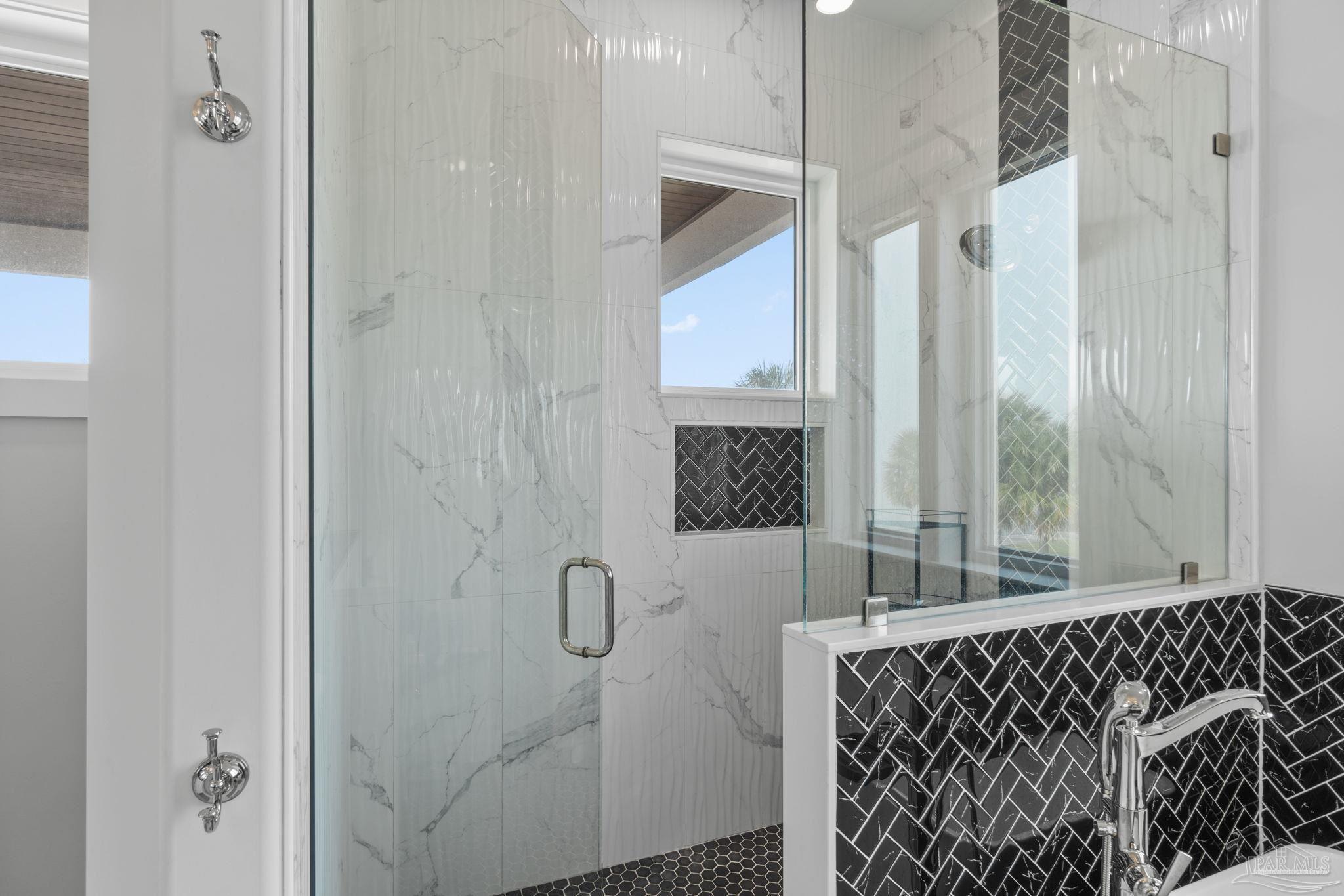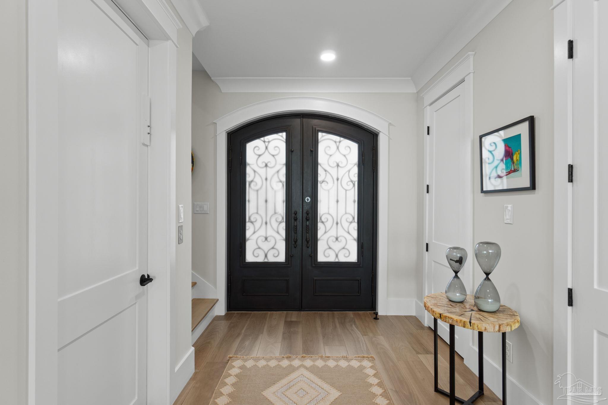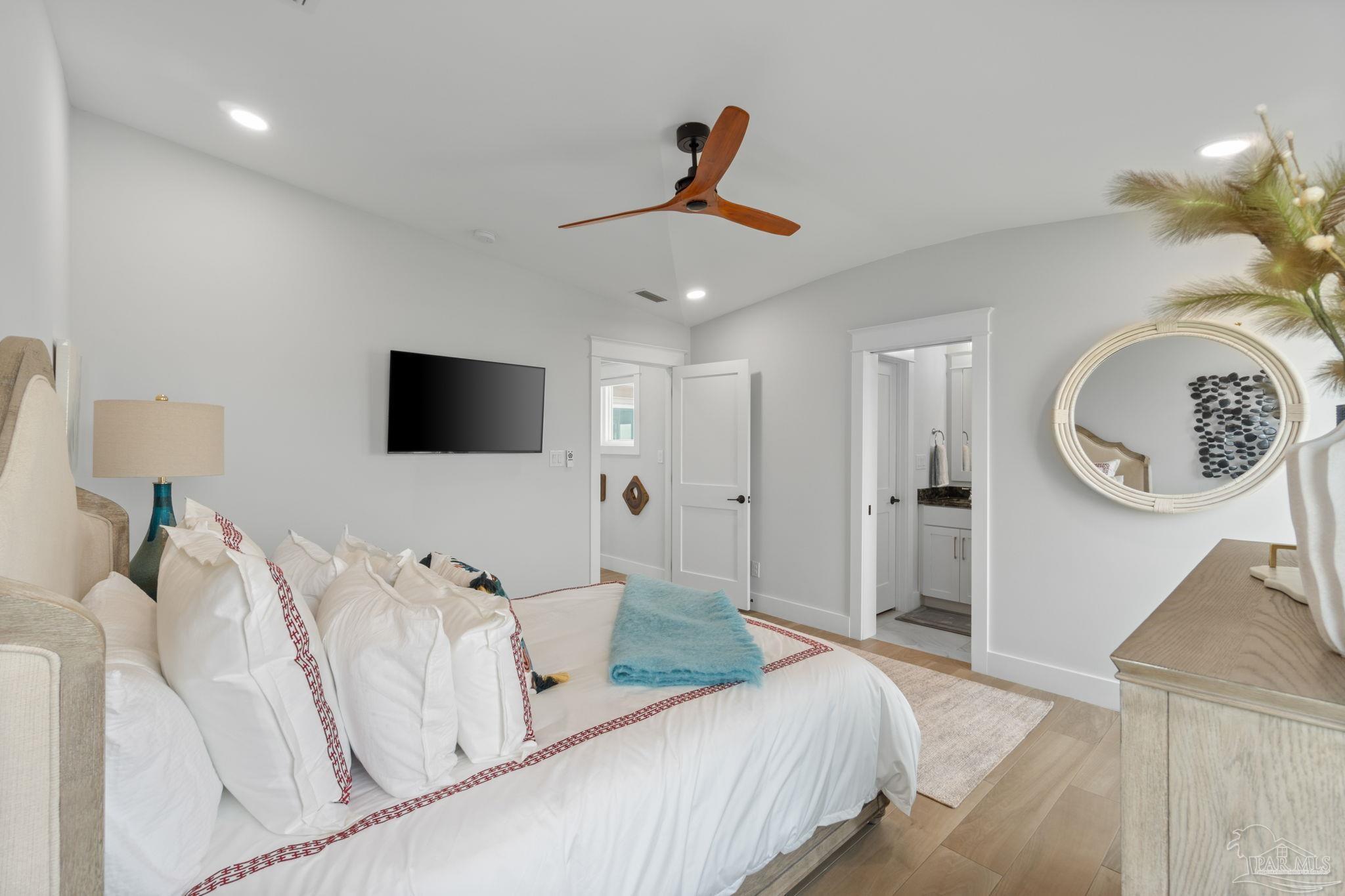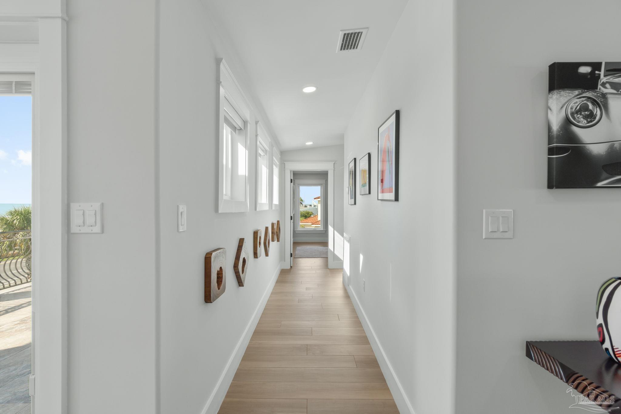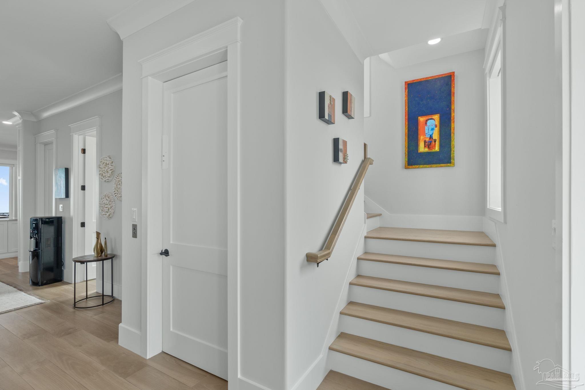 Stunning custom waterfront residence on Pensacola Bay featuring 72 feet of waterfront and private dock. This beautiful home is 4,609 SF with 4 bedrooms, 6 full baths and 1 half bath and elevator. Guest suite on first floor complete with own kitchen, living room, bedroom and full bath. Second floor serves as main living offering open kitchen, family room,bar and formal dining room. Large primary suite with sitting area overlooking Pensacola Bay. Sliding doors open from the family room to a large covered balcony creating effortless flow for entertaining. The third floor has a large media room with sliding doors that open to a large open balcony, 2 additional bedrooms each with full baths and bar. A rare opportunity to own exceptional waterfront property in Gulf Breeze proper.