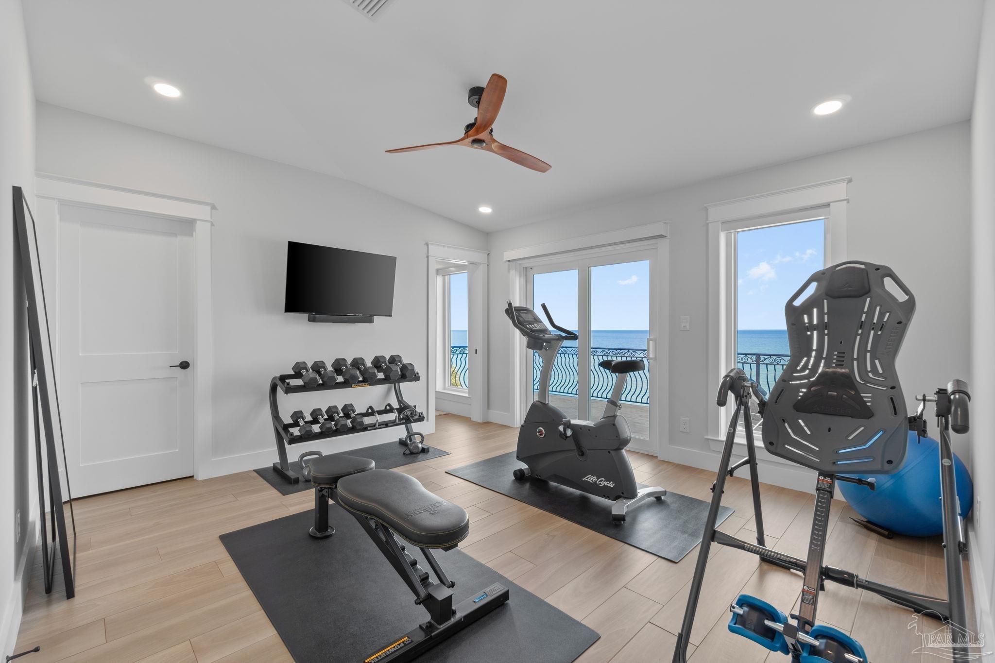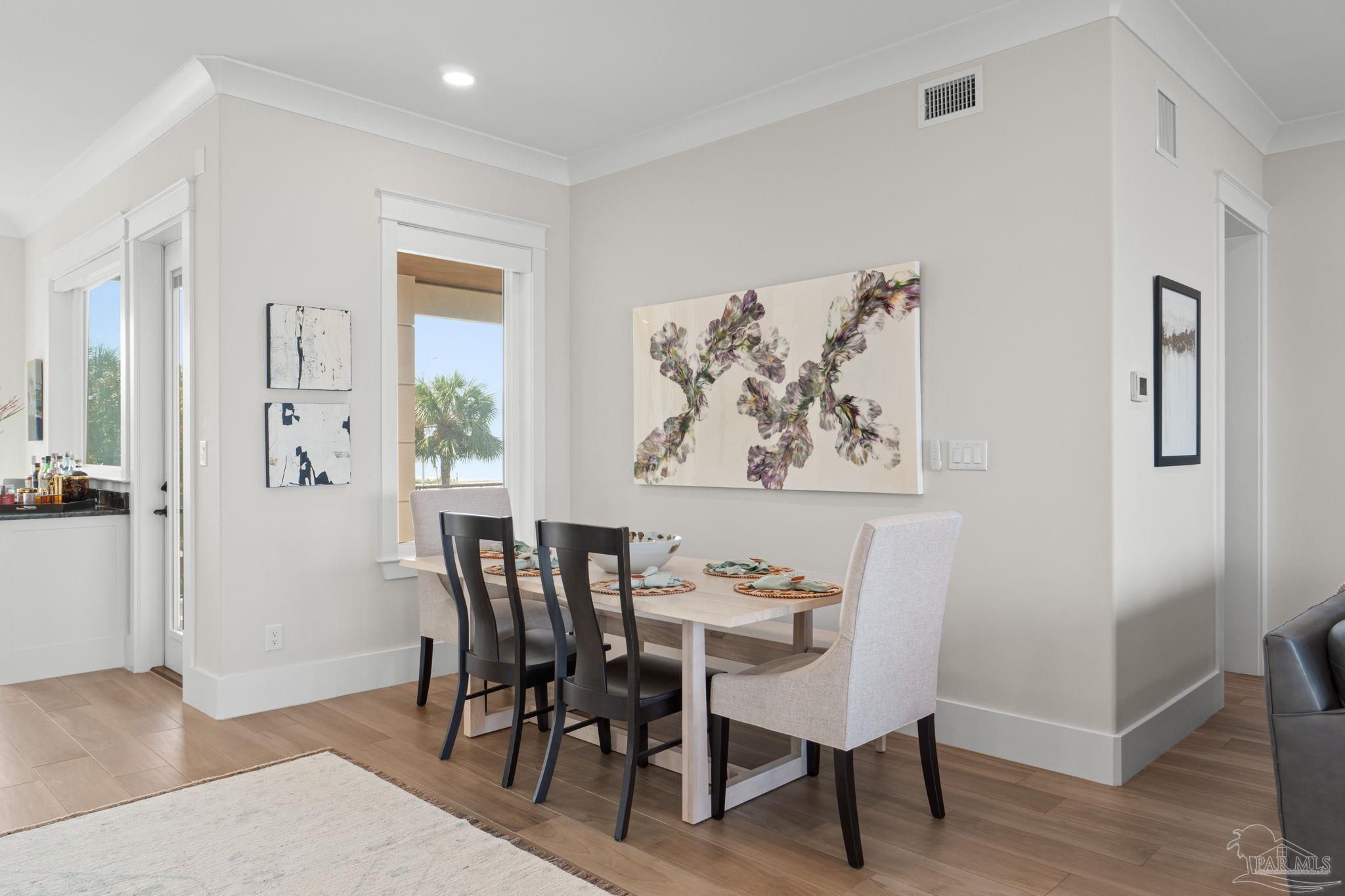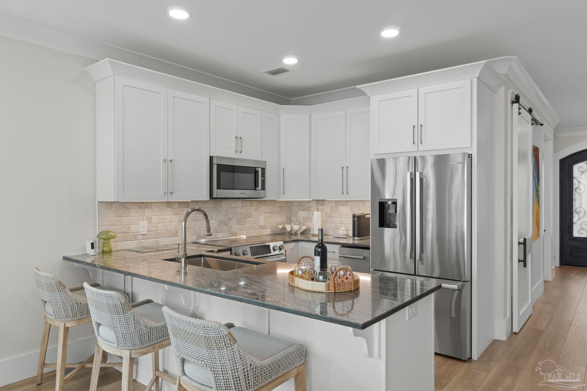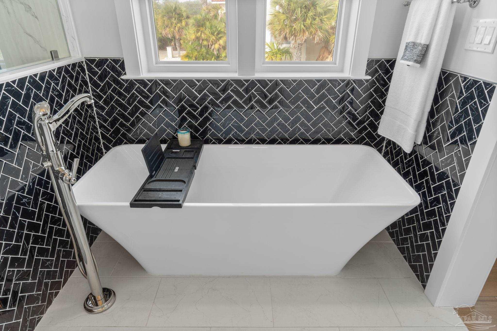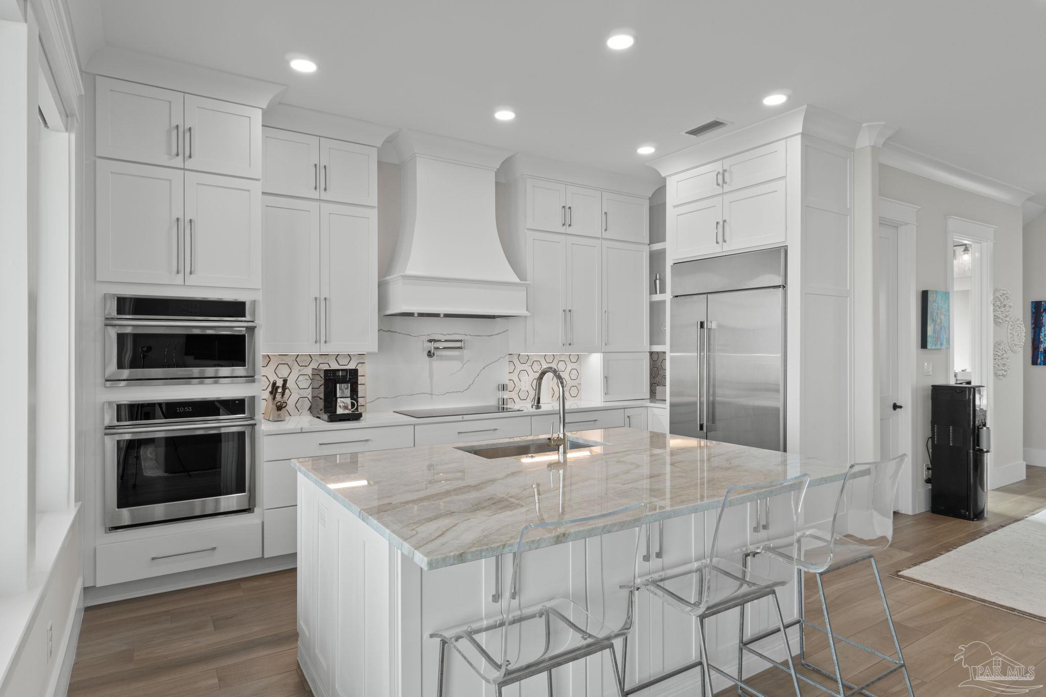 Stunning custom waterfront residence on Pensacola Bay featuring 72 feet of waterfront and private dock. This beautiful home is 4,609 SF with 4 bedrooms, 6 full baths and 1 half bath and elevator. Guest suite on first floor complete with own kitchen, living room, bedroom and full bath. Second floor serves as main living offering open kitchen, family room,bar and formal dining room. Large primary suite with sitting area overlooking Pensacola Bay. Sliding doors open from the family room to a large covered balcony creating effortless flow for entertaining. The third floor has a large media room with sliding doors that open to a large open balcony, 2 additional bedrooms each with full baths and bar. A rare opportunity to own exceptional waterfront property in Gulf Breeze proper.