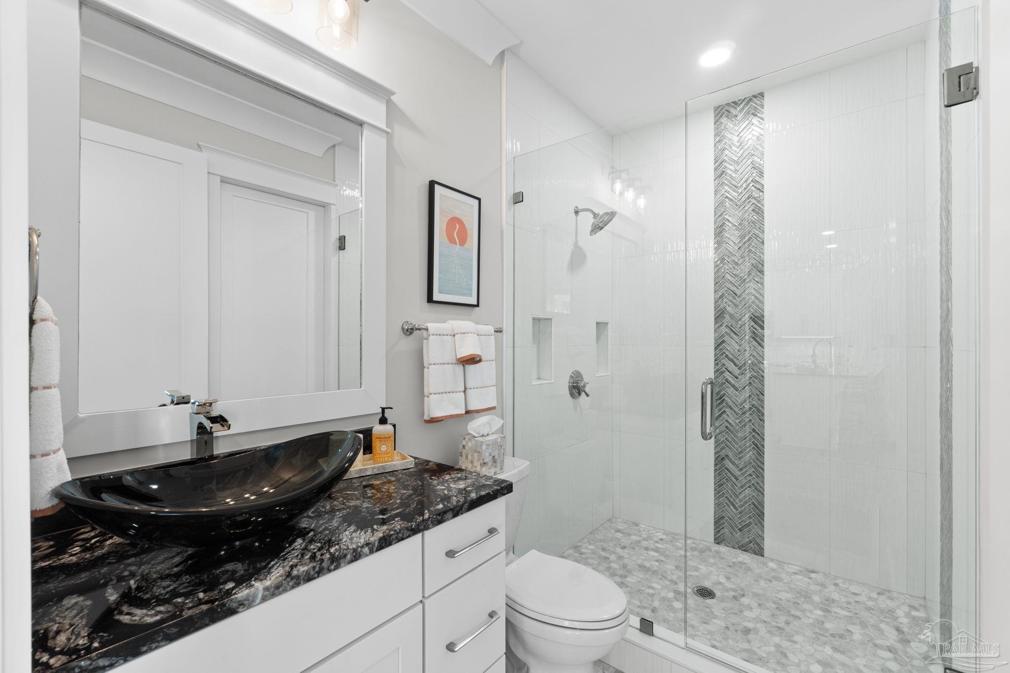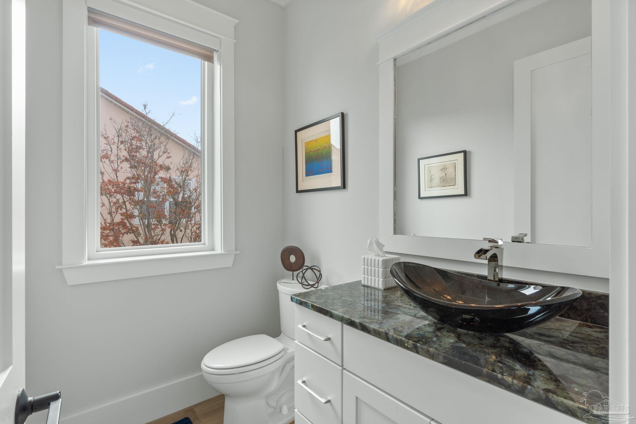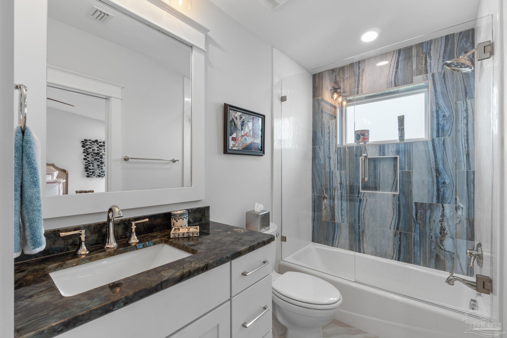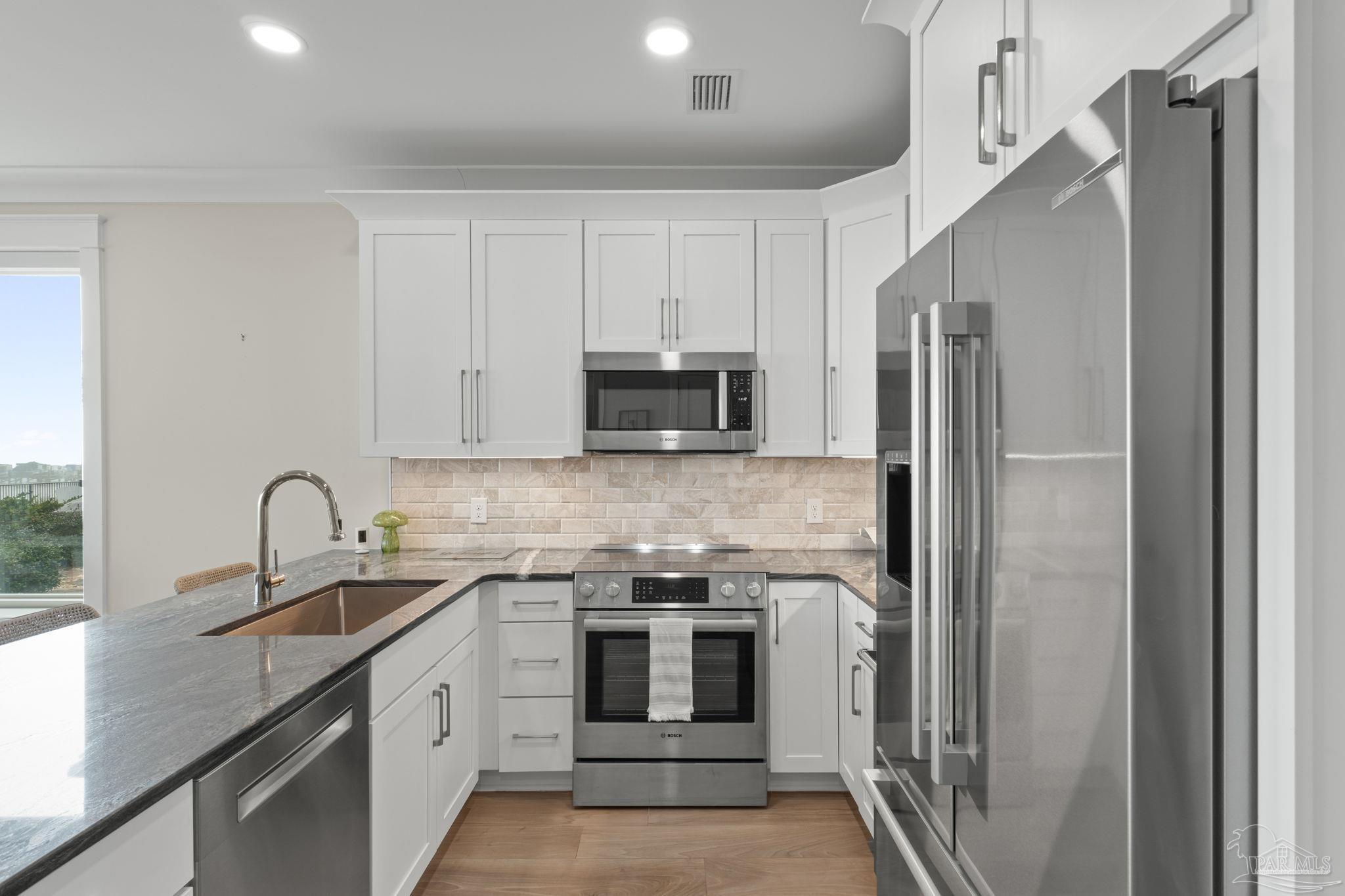 Stunning custom waterfront residence on Pensacola Bay featuring 72 feet of waterfront and private dock. This beautiful home is 4,609 SF with 4 bedrooms, 6 full baths and 1 half bath and elevator. Guest suite on first floor complete with own kitchen, living room, bedroom and full bath. Second floor serves as main living offering open kitchen, family room,bar and formal dining room. Large primary suite with sitting area overlooking Pensacola Bay. Sliding doors open from the family room to a large covered balcony creating effortless flow for entertaining. The third floor has a large media room with sliding doors that open to a large open balcony, 2 additional bedrooms each with full baths and bar. A rare opportunity to own exceptional waterfront property in Gulf Breeze proper.