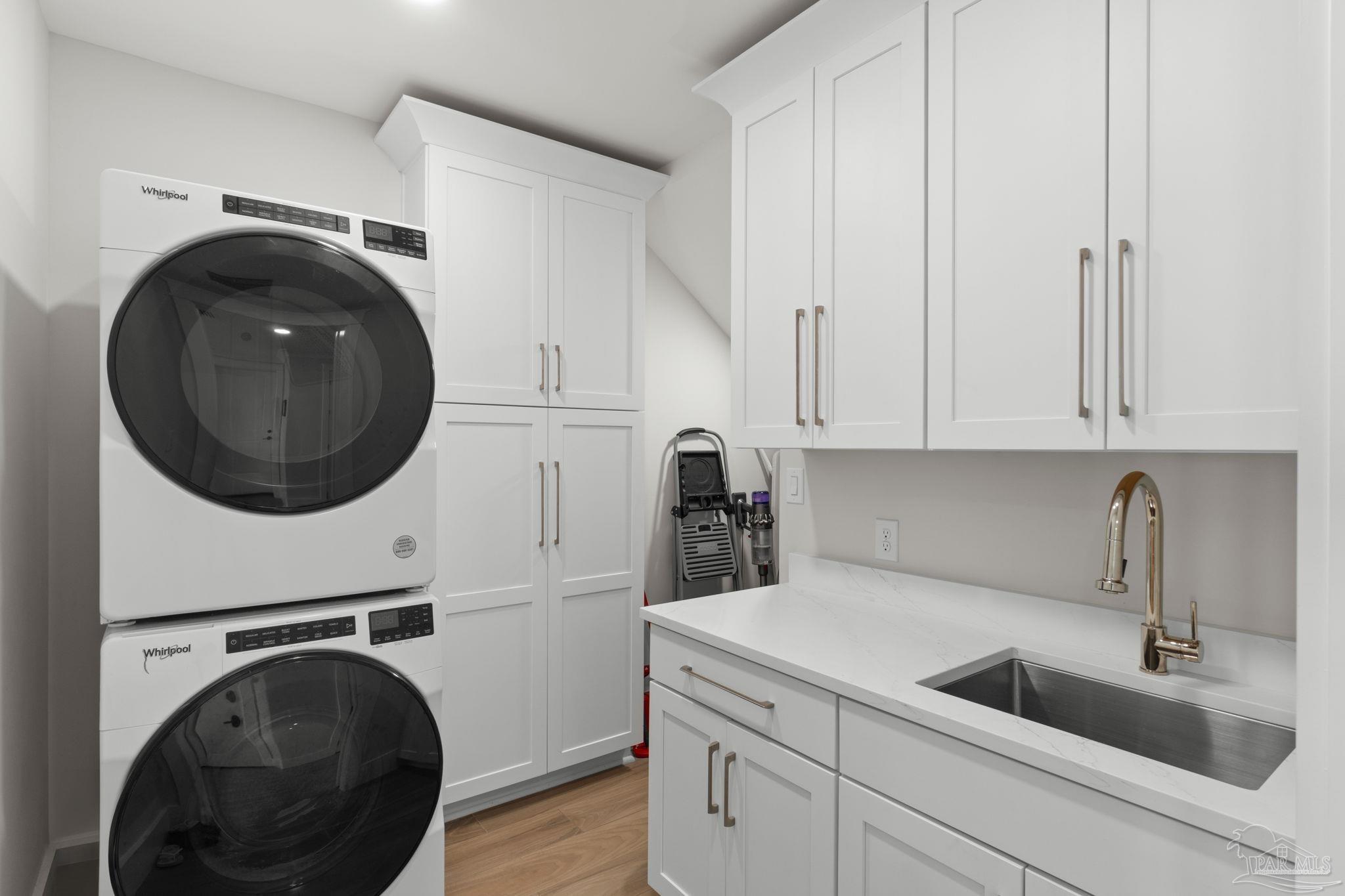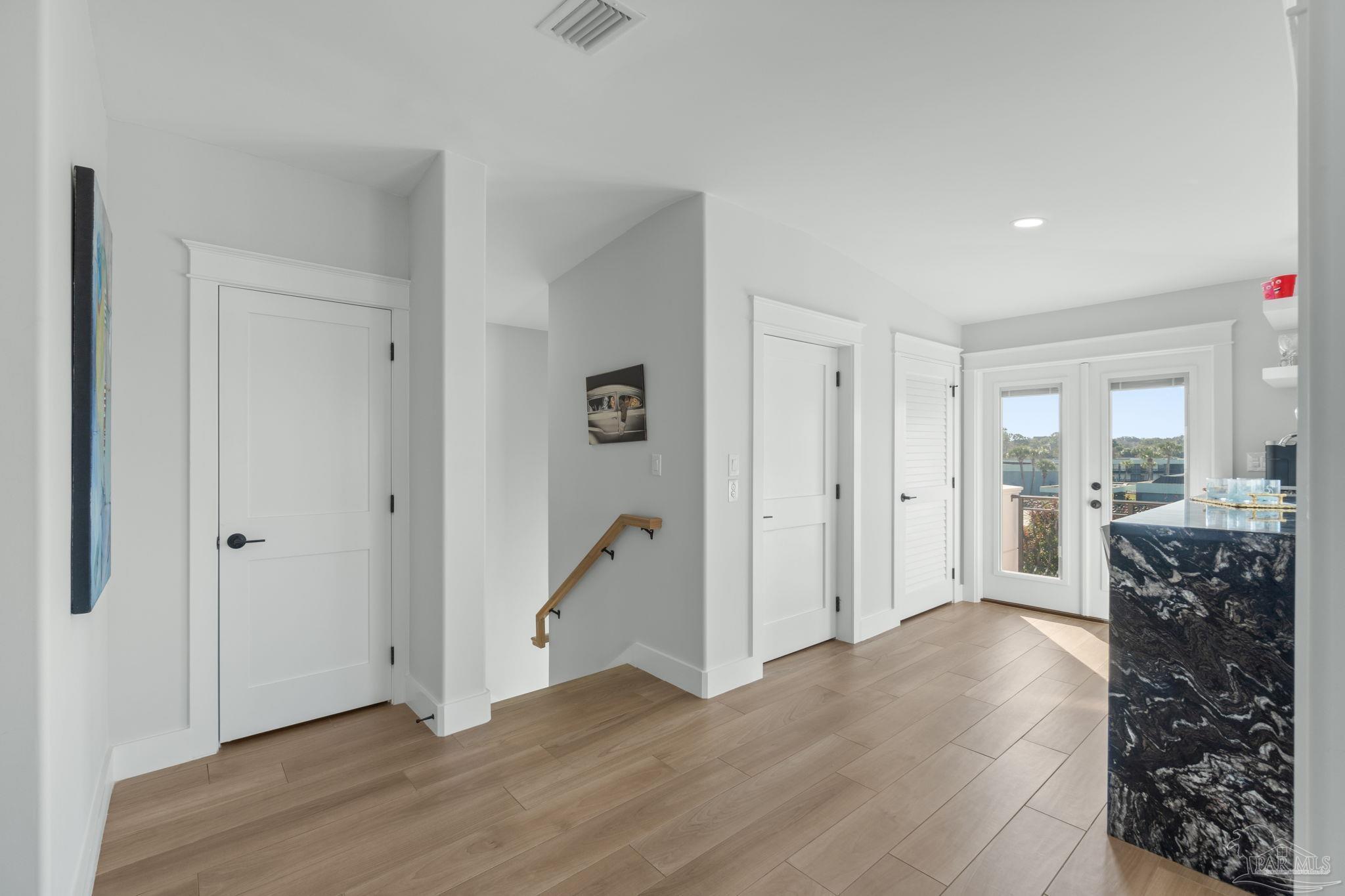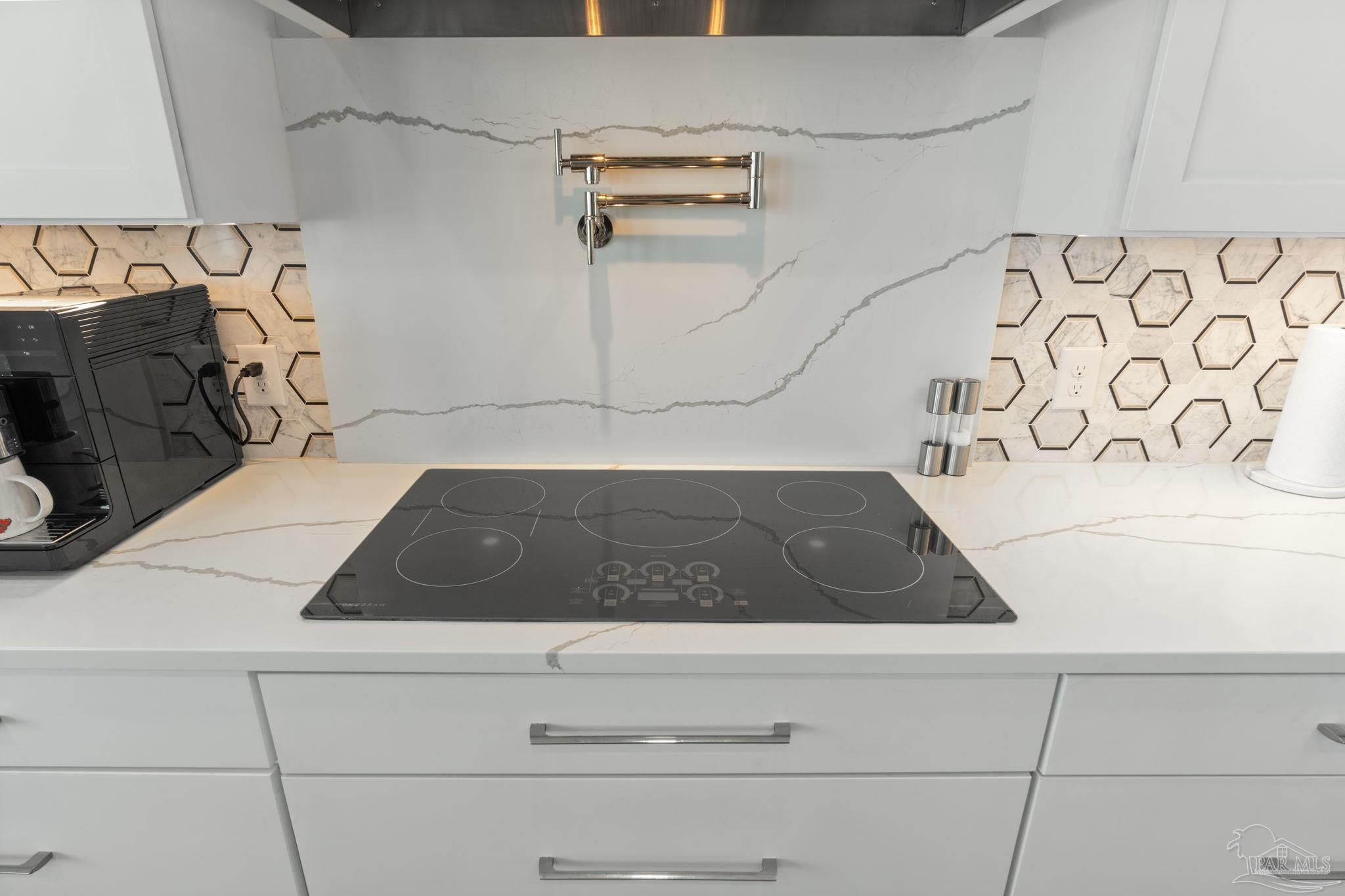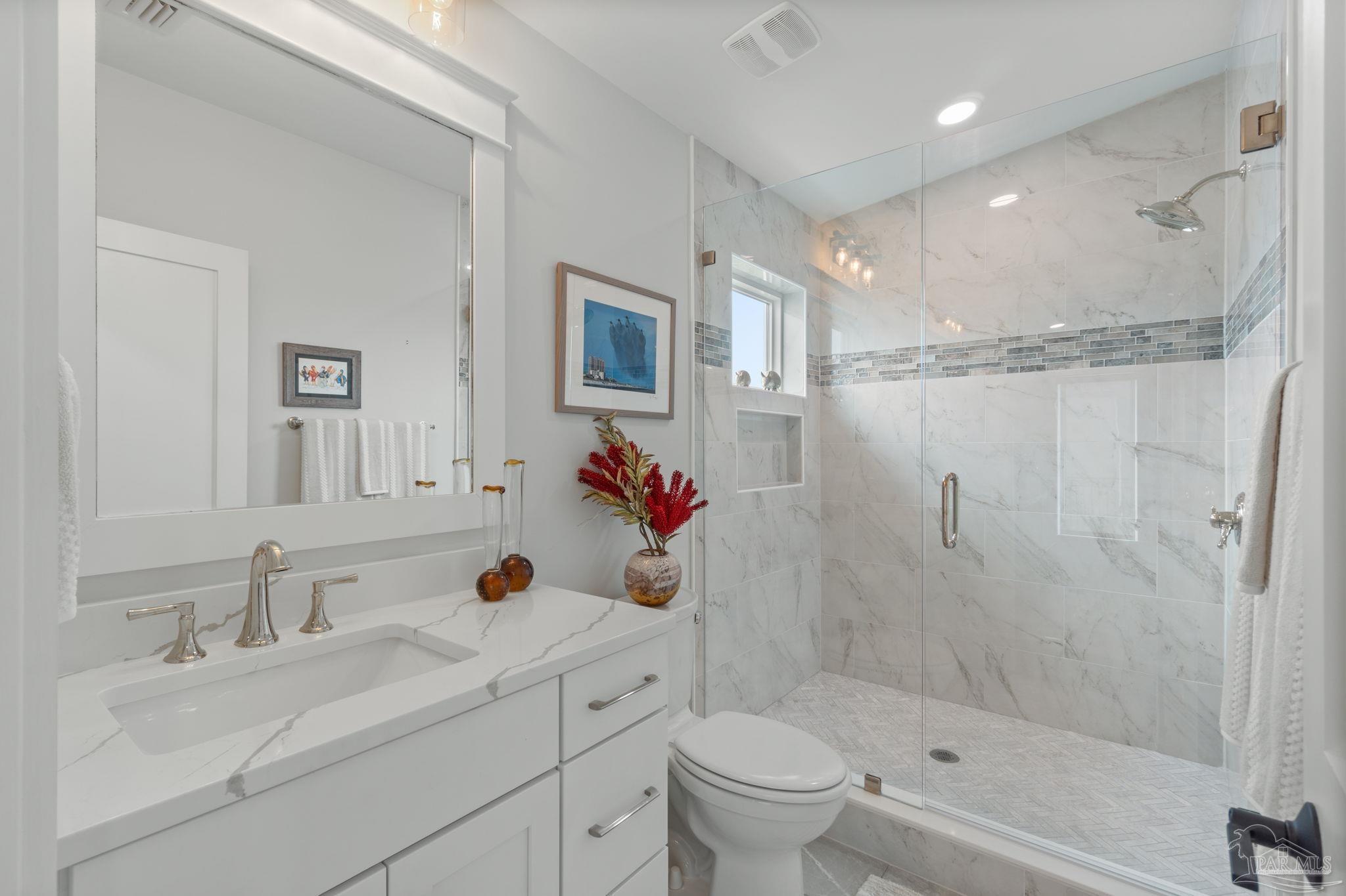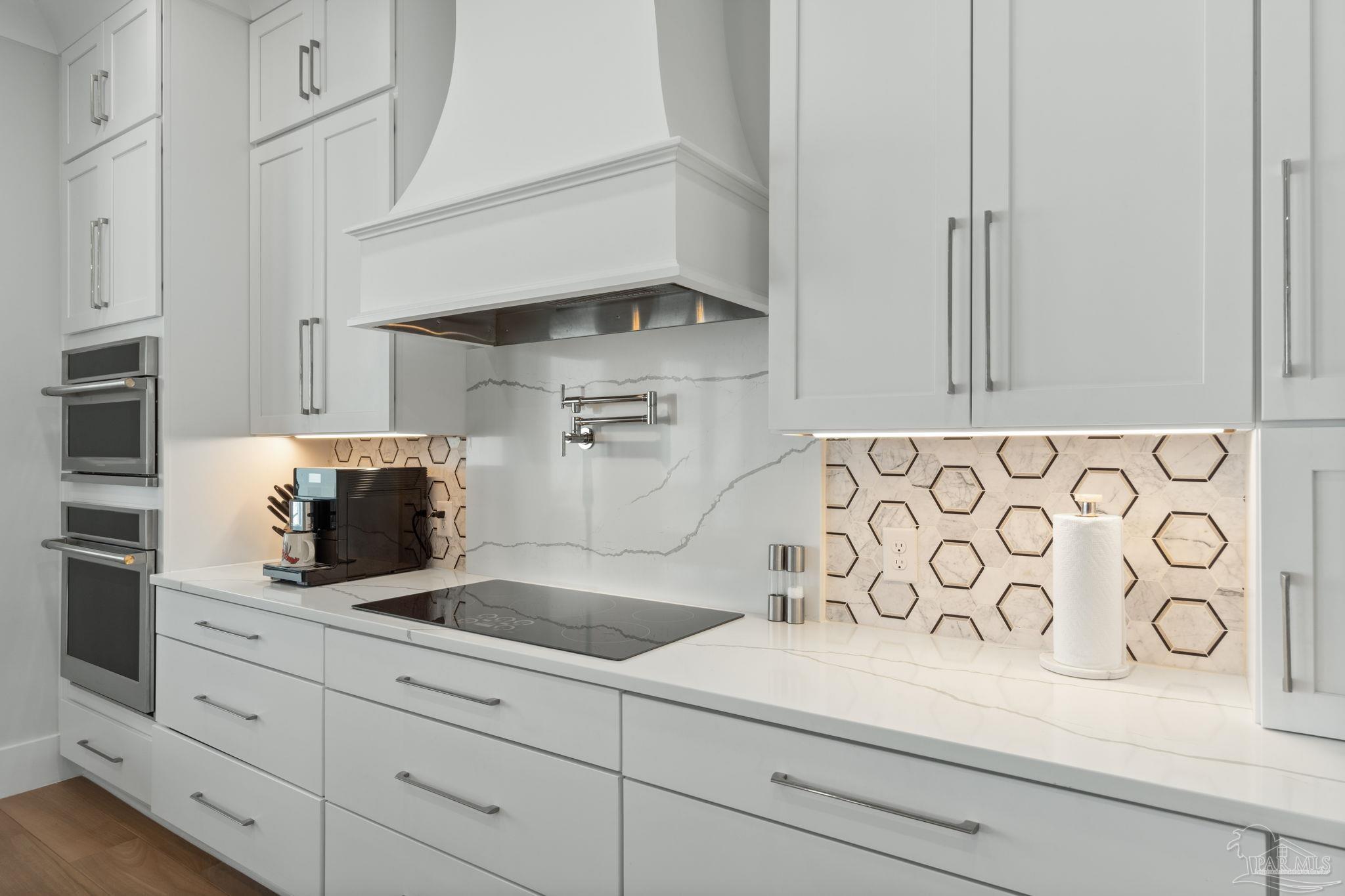 Stunning custom waterfront residence on Pensacola Bay featuring 72 feet of waterfront and private dock. This beautiful home is 4,609 SF with 4 bedrooms, 6 full baths and 1 half bath and elevator. Guest suite on first floor complete with own kitchen, living room, bedroom and full bath. Second floor serves as main living offering open kitchen, family room,bar and formal dining room. Large primary suite with sitting area overlooking Pensacola Bay. Sliding doors open from the family room to a large covered balcony creating effortless flow for entertaining. The third floor has a large media room with sliding doors that open to a large open balcony, 2 additional bedrooms each with full baths and bar. A rare opportunity to own exceptional waterfront property in Gulf Breeze proper.