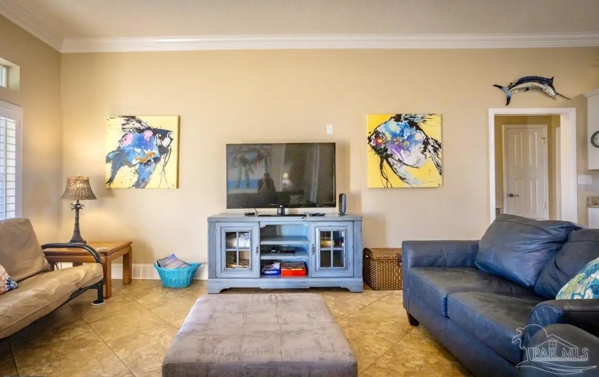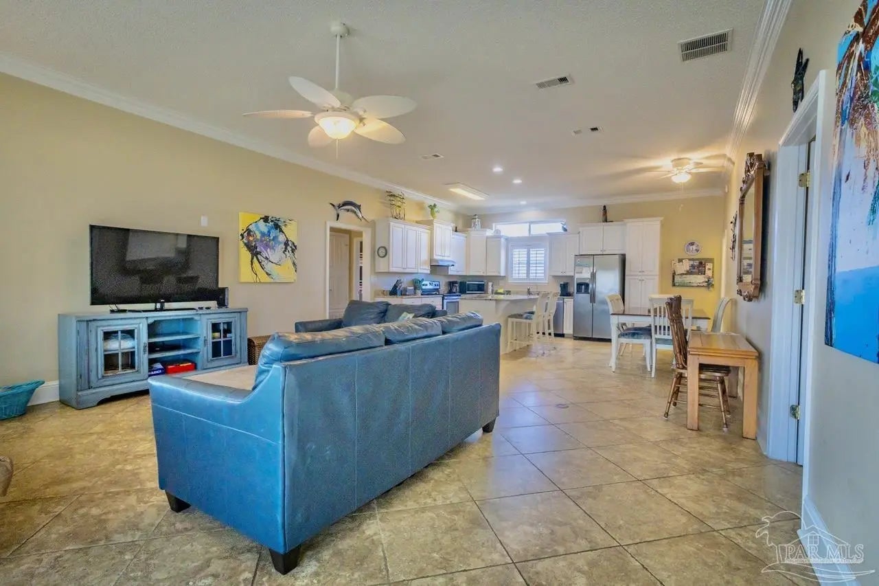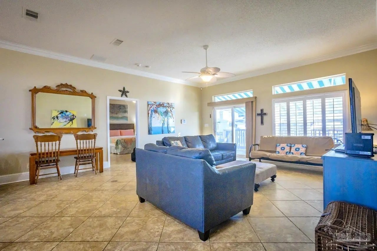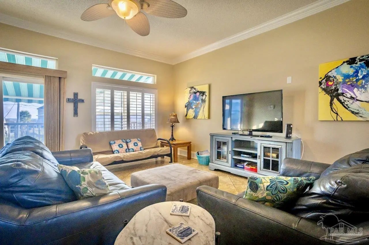 Escape to the beautiful Emerald Coast and enjoy this well-designed beachside home offering comfort, versatility, and inviting indoor-outdoor living just moments from the Gulf. Light-filled and spacious, the open layout connects the kitchen, dining, and living areas for easy everyday living and entertaining. High ceilings, crown molding, and tile flooring extend throughout the split floor plan, which includes three bedrooms, two full baths, a generous lower-level recreation room, and ample storage. The home is offered fully furnished as shown, providing a convenient turn-key option for personal use or rental opportunities in accordance with local guidelines. The kitchen features granite countertops, an island with seating, abundant cabinetry, and an open design that supports both casual meals and larger gatherings. Step outside to your private heated saltwater pool, added in 2021, along with a spacious pool deck ideal for lounging and outdoor dining. An outdoor shower adds convenience after a day at the beach. Note: Some pool-area furniture shown in marketing materials is a rendering. Outdoor living continues with a covered patio and a versatile recreation room equipped for indoor entertainment complete with a basketball shooting game, ping pong and foosball table. Upstairs, the front deck offers a view toward the water, and a remote-controlled awning provides shade on sunny days. Beach access is located close to the home, with convenient access to local dining, shopping, and activities along the Beach and Boardwalk. Recent updates include a 2024 HVAC system, 2023 roof, 2021 salt water heated pool, an exterior AC deck replaced in 2025, and a reverse osmosis water system in the kitchen. This coastal property combines upgrades, comfort, and location for an enjoyable beachside living experience.