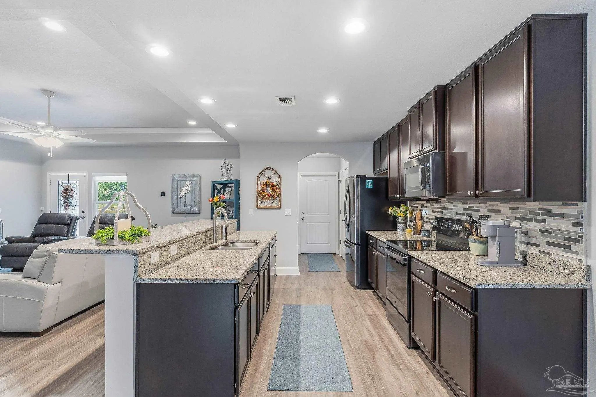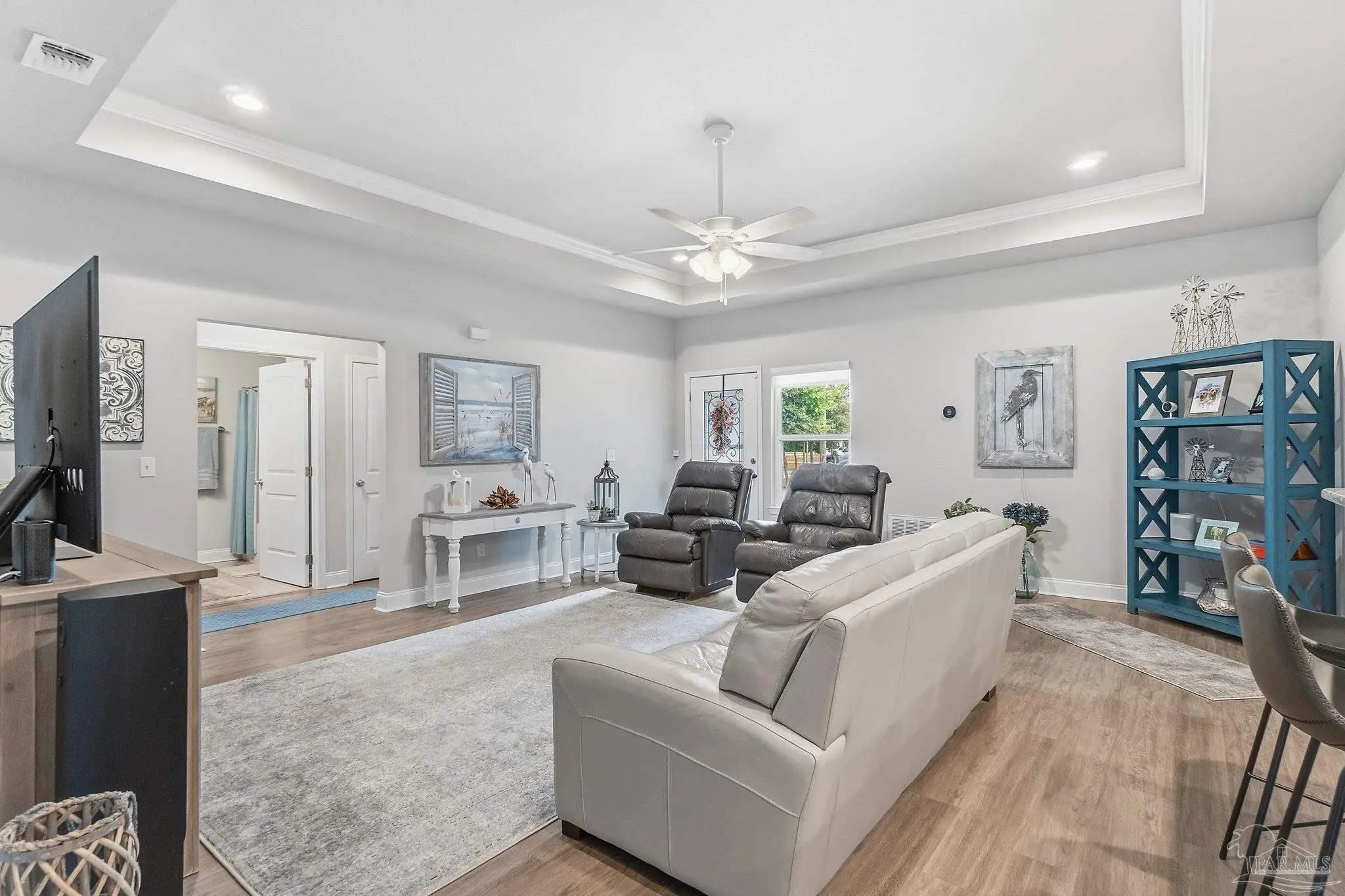 Holley by the Sea – Pristine, Move-In-Ready beauty! 3-Bedroom All-Brick! Impeccably maintained 3-bed, 2-bath all-brick home on a generous lot – lives like a single-family residence. Spotless, bright, and truly move-in ready with an open layout, luxury wood-look vinyl plank flooring, granite counters, soft-close cabinetry, and ceiling fans throughout. Elegant tray ceilings with crown molding grace the living room and spacious primary suite. Chef-friendly kitchen features upgraded stainless GE slide-in range, microwave, refrigerator, and sunny breakfast nook. Tranquil owner’s suite offers tray ceiling, Shivakashi granite double vanity, low-maintenance tile-look seamless shower with glass doors (Seamless tile like insert – no grout!), and convenient walk-in closet. Two additional bedrooms provide flexibility, for guests, extra office or family members. Stand-out features: Whole-home water filtration system Upgraded appliances (GE Stove and Dishwasher, with LG Fridge) Washer & dryer included High-end Hunter Douglas top-down/bottom-up shades Expansive screened lanai with two ceiling fans 6-ft privacy fence + hurricane fabric shields Separate laundry & pantry 1 year home warranty included! Enjoy a large, fully fenced backyard and oversized screened lanai – perfect for relaxing or entertaining.Holley by the Sea resort amenities minutes away: huge pool with slide, tennis/pickleball, gym, private beach, boat launch & more – all for low HOA dues. Just 8 miles to Navarre Beach! Pride of ownership shines throughout – schedule your showing today!