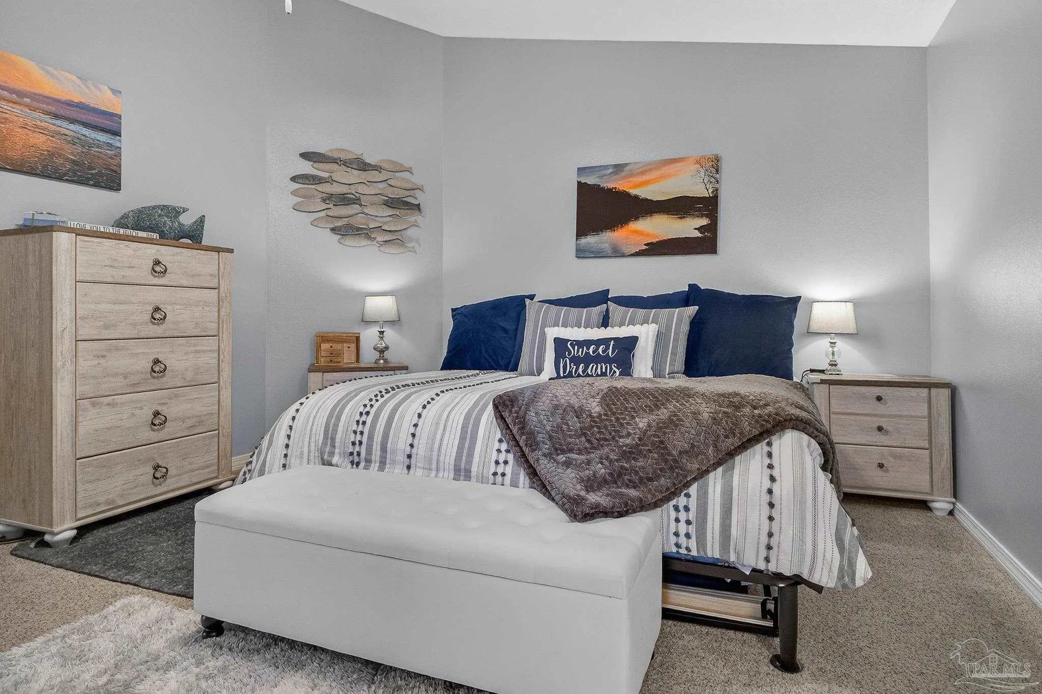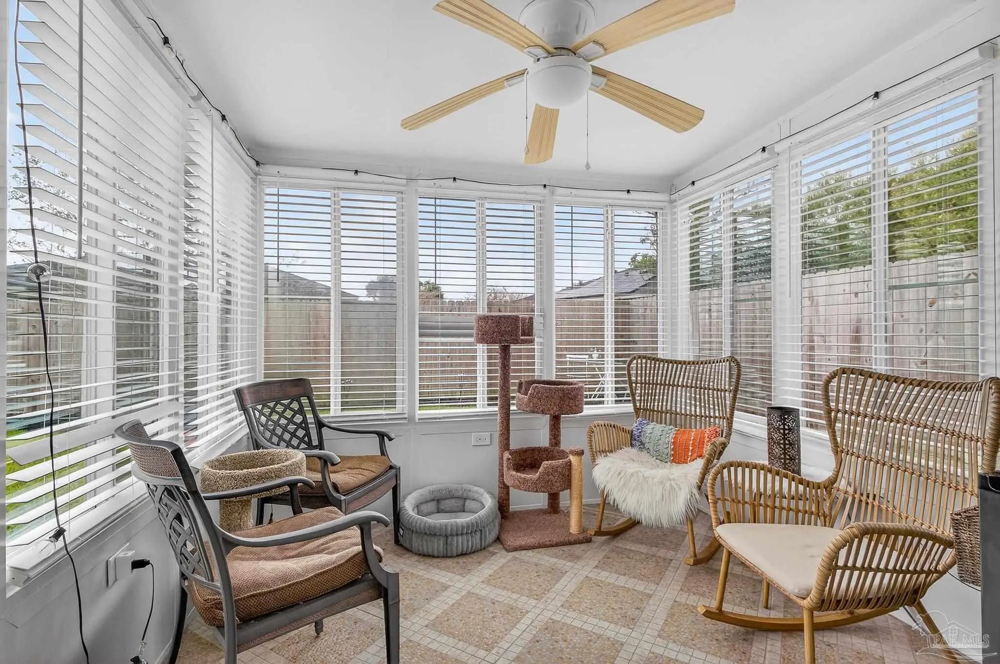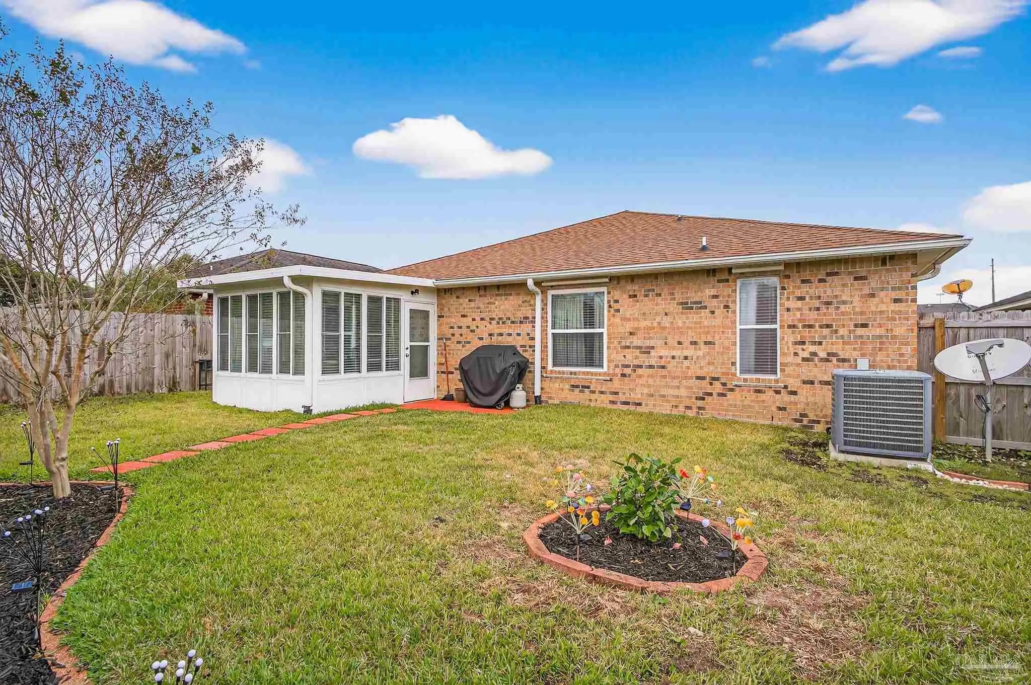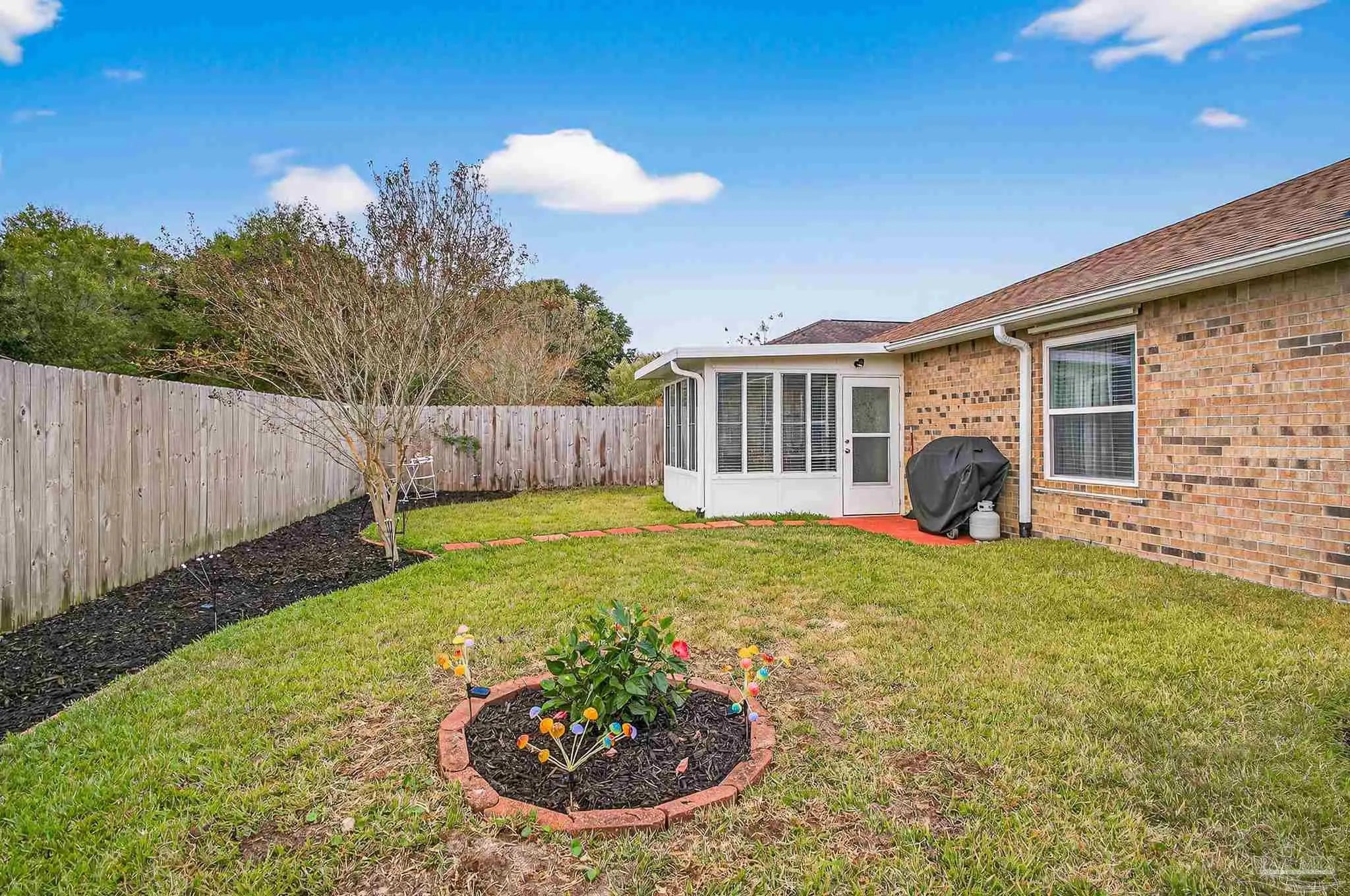 Come experience the charm of Tiburon West, conveniently located off Pace Patriot Boulevard in Pace, Florida, between Jernigan Road and Chumuckla Highway. This home is close to the Pace Fire District, Library, Pace High School, and S.S. Dixon Elementary School. As you step onto the slate-tiled covered porch, you’ll be greeted by the wood flooring of the foyer, which flows throughout the main areas of the home. This three-bedroom, two-bathroom patio-style home with low-maintenance brick siding features an open concept and a split floor plan that offers privacy for everyone. The primary suite, with a private bathroom, walk-in closet, garden tub, and separate shower, is tucked away in the back. The additional bedrooms are off the living room, providing easy access to the guest bathroom. The living room features high ceilings, plant ledges, and cathedral ceilings, while the kitchen boasts a divided-sink with a pull-down faucet, breakfast bar, stainless steel appliances, and plenty of space to store all your kitchen gadgets in the abundant cabinets and large pantry. The formal dining room overlooks the sunroom and the kitchen. The sunroom offers an extended living area perfect for entertaining, reading, or simply relaxing. Other features include 2” white blinds, a sprinkler system, security system, a transfer switch for a portable generator, new windows in 2016, a fenced-in backyard, a low-maintenance yard, gutters, and hurricane shutters. Schedule your private tour today and discover what this home has to offer!