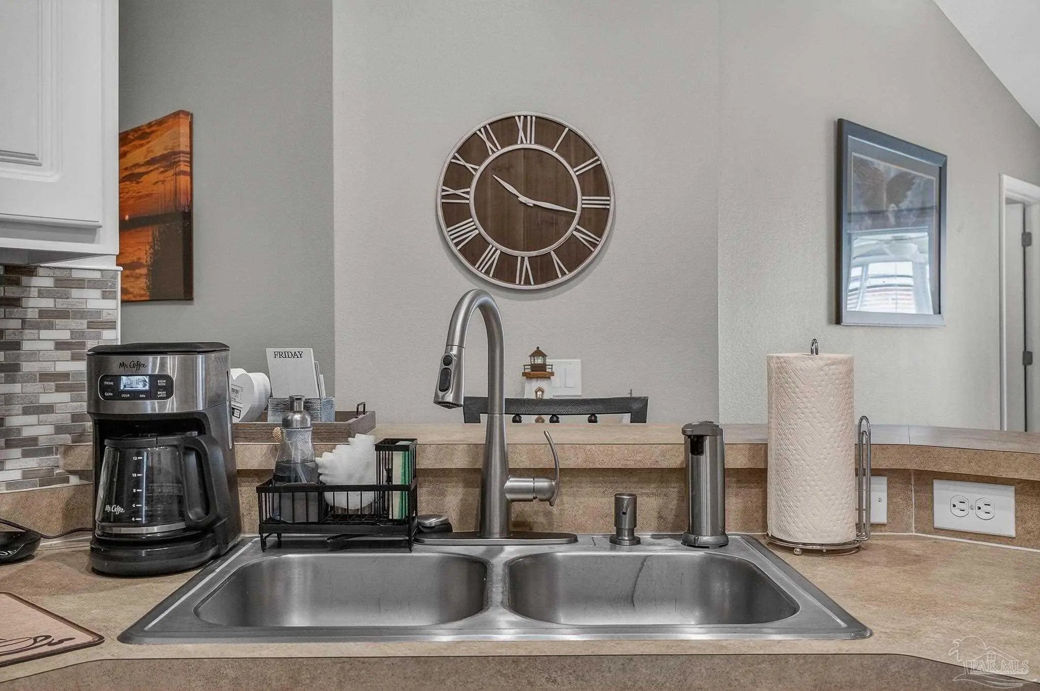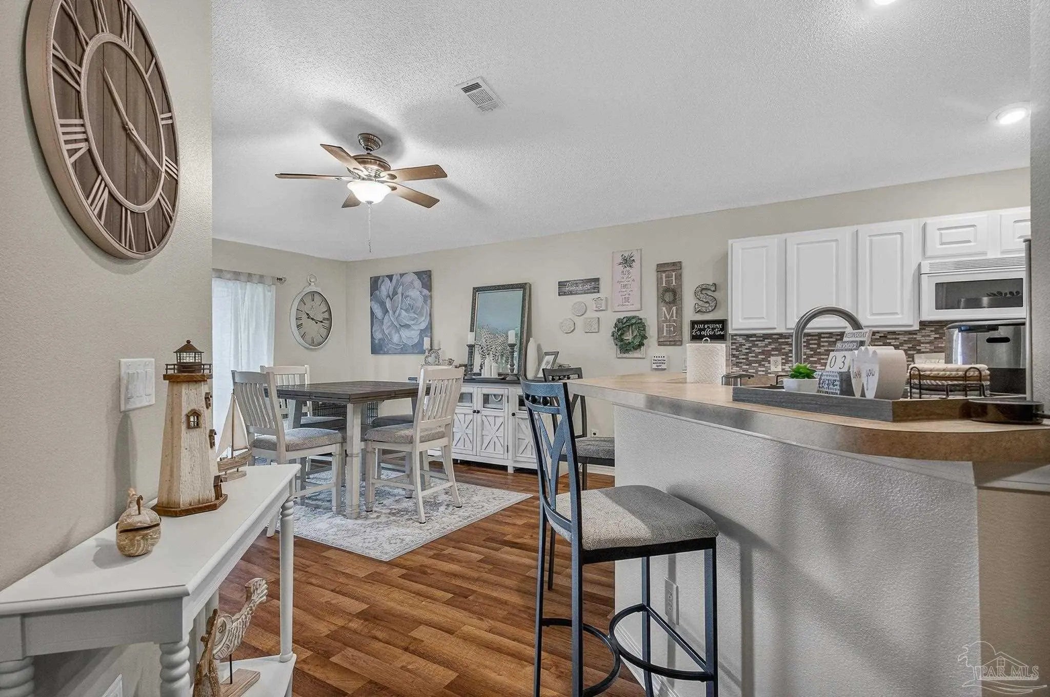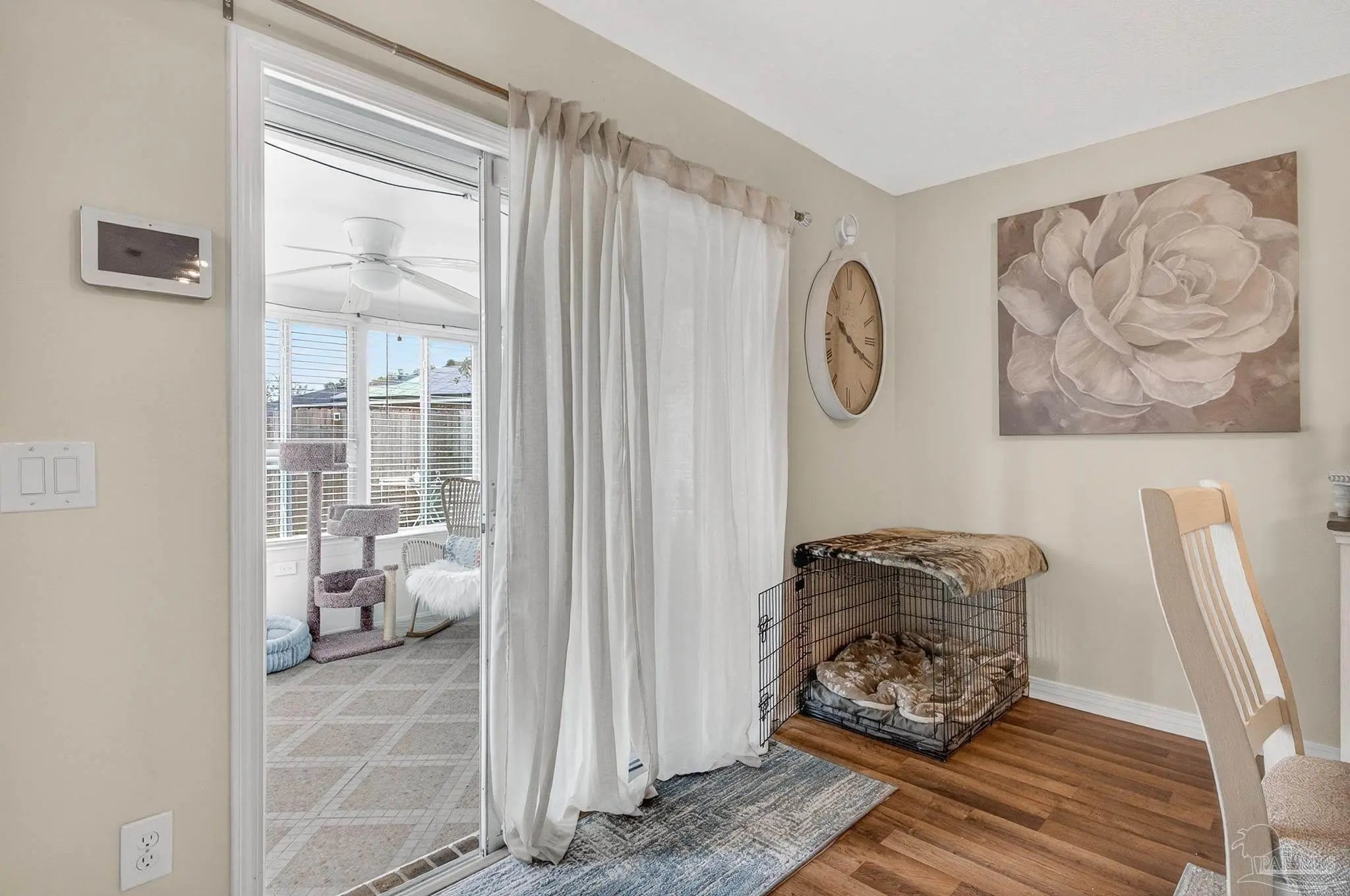 Come experience the charm of Tiburon West, conveniently located off Pace Patriot Boulevard in Pace, Florida, between Jernigan Road and Chumuckla Highway. This home is close to the Pace Fire District, Library, Pace High School, and S.S. Dixon Elementary School. As you step onto the slate-tiled covered porch, you’ll be greeted by the wood flooring of the foyer, which flows throughout the main areas of the home. This three-bedroom, two-bathroom patio-style home with low-maintenance brick siding features an open concept and a split floor plan that offers privacy for everyone. The primary suite, with a private bathroom, walk-in closet, garden tub, and separate shower, is tucked away in the back. The additional bedrooms are off the living room, providing easy access to the guest bathroom. The living room features high ceilings, plant ledges, and cathedral ceilings, while the kitchen boasts a divided-sink with a pull-down faucet, breakfast bar, stainless steel appliances, and plenty of space to store all your kitchen gadgets in the abundant cabinets and large pantry. The formal dining room overlooks the sunroom and the kitchen. The sunroom offers an extended living area perfect for entertaining, reading, or simply relaxing. Other features include 2” white blinds, a sprinkler system, security system, a transfer switch for a portable generator, new windows in 2016, a fenced-in backyard, a low-maintenance yard, gutters, and hurricane shutters. Schedule your private tour today and discover what this home has to offer!