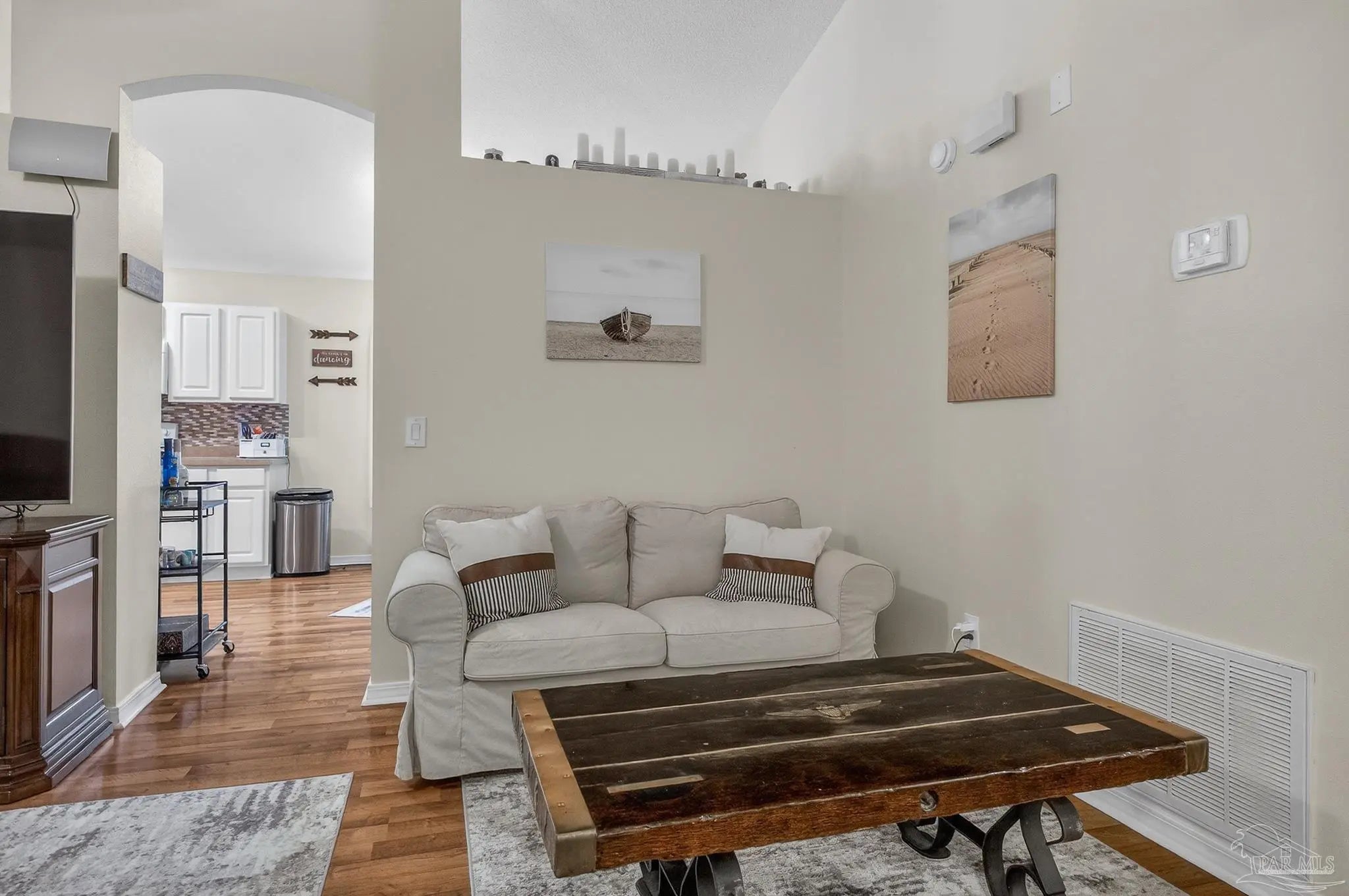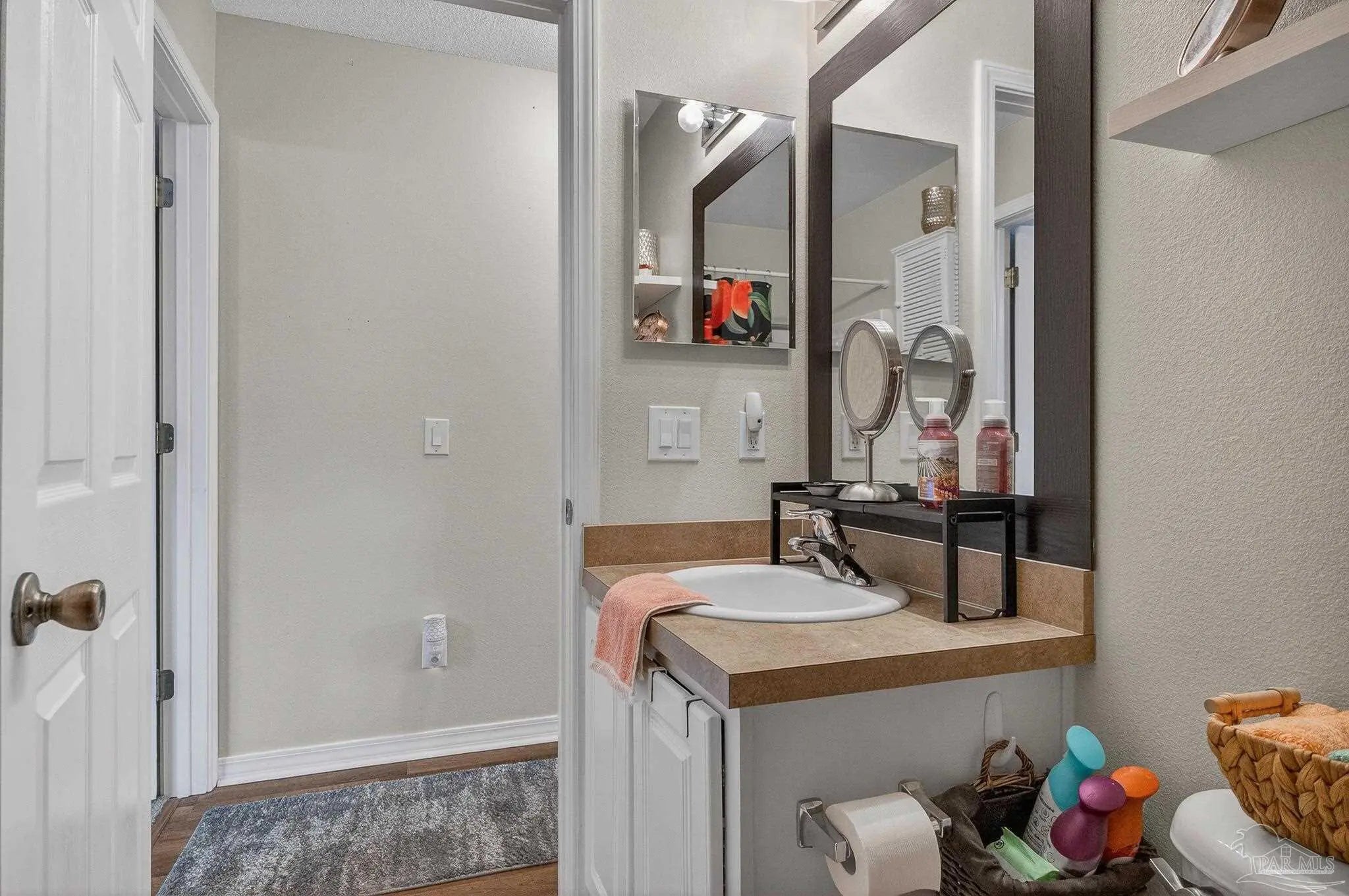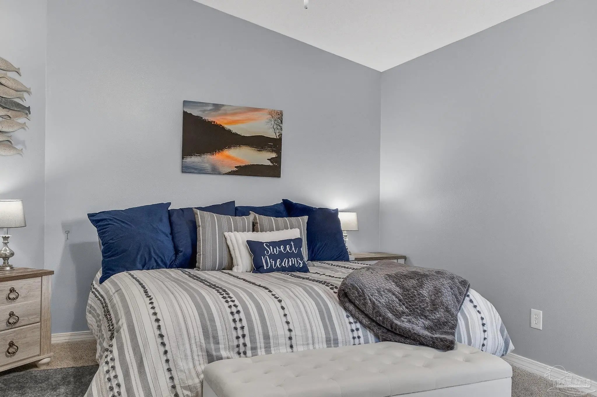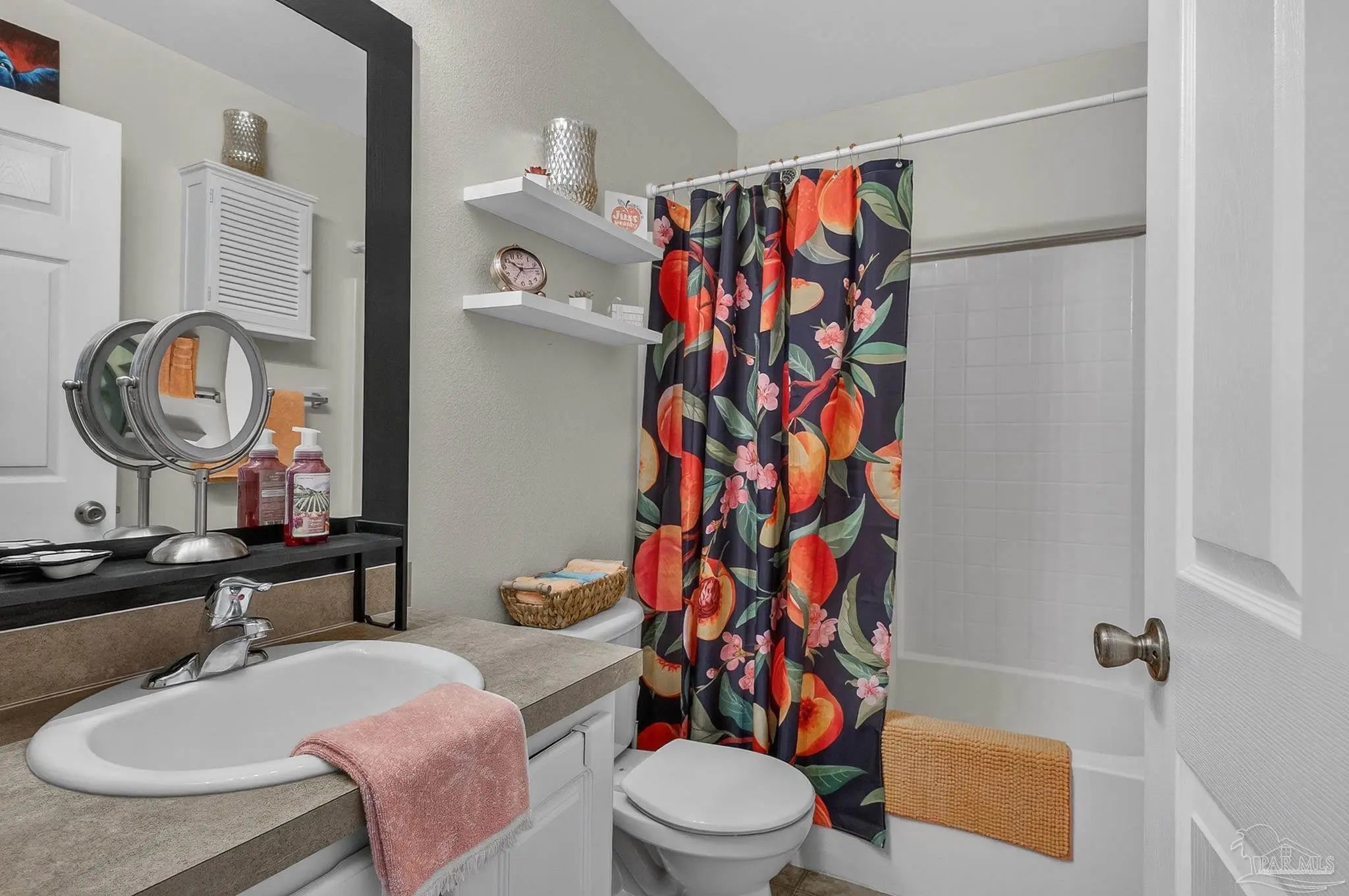 Come experience the charm of Tiburon West, conveniently located off Pace Patriot Boulevard in Pace, Florida, between Jernigan Road and Chumuckla Highway. This home is close to the Pace Fire District, Library, Pace High School, and S.S. Dixon Elementary School. As you step onto the slate-tiled covered porch, you’ll be greeted by the wood flooring of the foyer, which flows throughout the main areas of the home. This three-bedroom, two-bathroom patio-style home with low-maintenance brick siding features an open concept and a split floor plan that offers privacy for everyone. The primary suite, with a private bathroom, walk-in closet, garden tub, and separate shower, is tucked away in the back. The additional bedrooms are off the living room, providing easy access to the guest bathroom. The living room features high ceilings, plant ledges, and cathedral ceilings, while the kitchen boasts a divided-sink with a pull-down faucet, breakfast bar, stainless steel appliances, and plenty of space to store all your kitchen gadgets in the abundant cabinets and large pantry. The formal dining room overlooks the sunroom and the kitchen. The sunroom offers an extended living area perfect for entertaining, reading, or simply relaxing. Other features include 2” white blinds, a sprinkler system, security system, a transfer switch for a portable generator, new windows in 2016, a fenced-in backyard, a low-maintenance yard, gutters, and hurricane shutters. Schedule your private tour today and discover what this home has to offer!