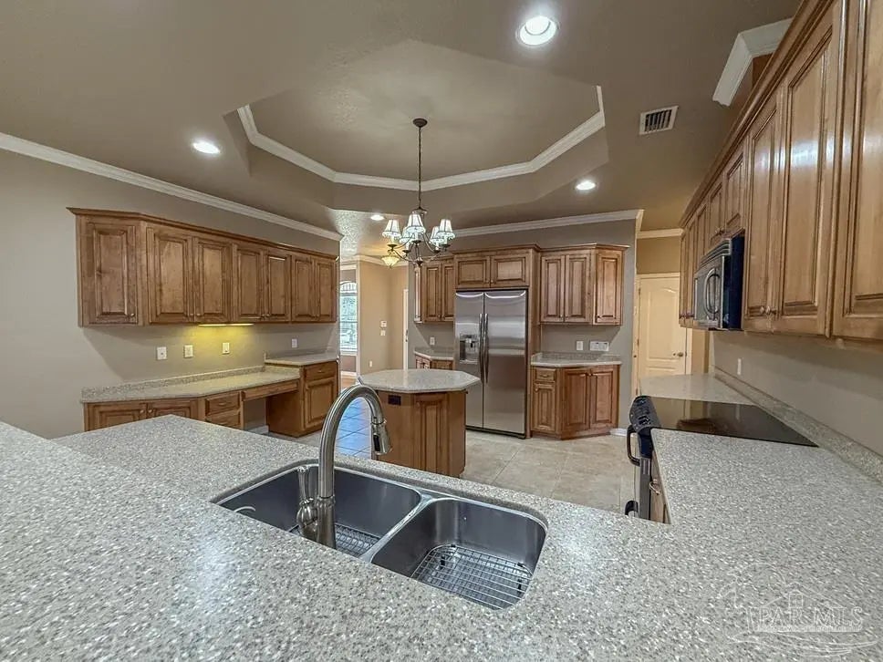 This custom home built by Sandy Wyatt is available in desirable Heather Oaks. No HOA neighborhood only 19 homes, new privacy fence with wooded backyard, 1 year old roof & HVAC, and no rent restrictions. The quiet cul-de-sac location is convenient, and the spacious kitchen is truly the heart of this home. It features a Butler’s pantry, beautiful wood cabinetry, lazy Susan and Cambria countertops. Crown molding throughout the kitchen, dining and living areas is balanced by tall baseboards, travertine and wood flooring. Enjoy a view of the back yard from the casual seating area, it features a hearth and fireplace for your holiday decorations. The split floorplan is ideal for peace and quiet. The Main Suite has an adjoining office with private access to the back porch. The main bath has been tastefully updated and has 3 closets! The custom corner shower has an impressive glass door, updated lighting, vanity with quartz counters and water closet. The formal dining area in front of the home for your showcase pieces and the Den in back is a perfectly relaxed space. Three large bedrooms have custom closet shelving solutions, and one with a large walk-in. The Roof is 1 year old (12/24), there is a sprinkler system with an irrigation well, automatic garage door openers, Fabric Shield hurricane protection, ergonomic lever door handles, extra water faucets on exterior, pull-down attic stairs, upgraded brick package, and the list goes on. Every detail was important in the design and building of this exceptional home; come see for yourself and make this your home!