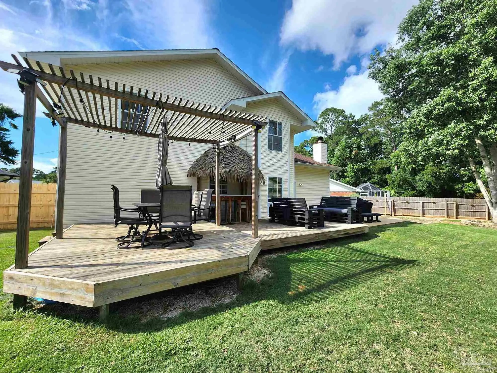 This gorgeous two-story gem sits on a large lot in a highly sought-after neighborhood. With 3 spacious bedrooms and 2.5 modern baths, this updated home is ready for you to move in and start making memories. Nestled in a quiet cul-de-sac, you'll love the convenience of being close to top-rated restaurants, shopping centers, UWF, parks, and medical facilities – everything you need just minutes away! The open floor plan seamlessly connects the living room to the formal dining area, perfect for entertaining. Throughout the living room, dining room, and all upstairs bedrooms, you'll find new luxury vinyl plank flooring, adding a touch of elegance and ease of maintenance. The oversized galley-style kitchen is a chef's dream, featuring ample cabinet space, a deep single-bowl sink, and sleek stainless steel appliances, including a refrigerator. Just off the kitchen, discover a huge pantry with built-in storage shelving and convenient washer/dryer hookups. Ascend the custom-made staircase to the second level, where a large bonus room/office with a closet awaits. The master suite is a private retreat, boasting a fully remodeled bathroom with double vanities, exquisite tile work, a luxurious shower, a separate water closet, and a walk-in closet with chic barn door access. Step into the backyard and be amazed by the fantastic entertaining space. Enjoy summer nights on the large deck, relax at the built-in tiki bar with TV hookup, or unwind under the charming pergola. The beautifully landscaped yard provides the perfect backdrop for outdoor gatherings and relaxation. Don't miss out on this captivating home. Pets approved by owner approval only. Visit www.navytonavy.com to apply online. $75 App fee per adult, half off for active military. Subject to credit check, background check, employment verification, and rental verification. CERTIFIED Funds required for move in!
