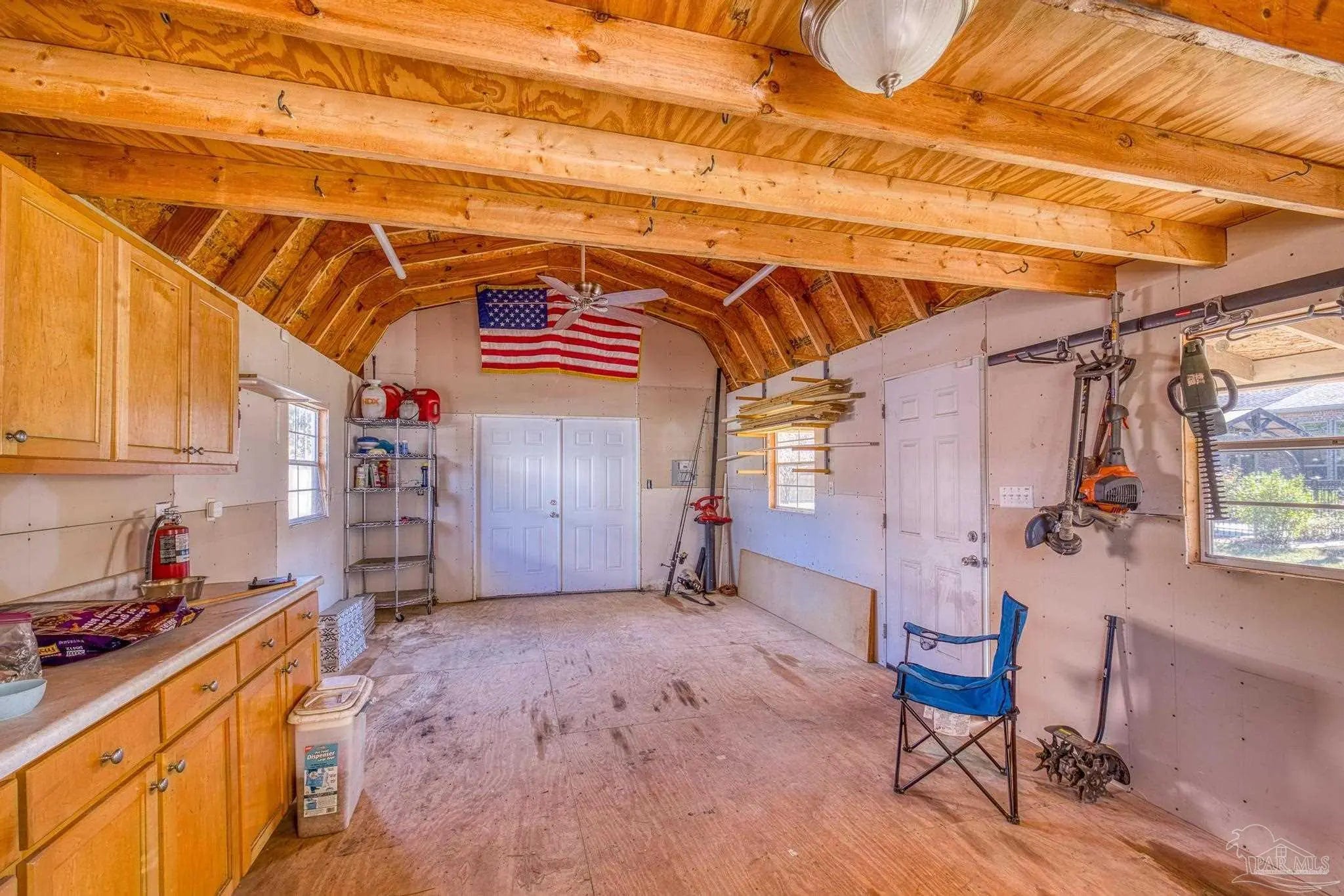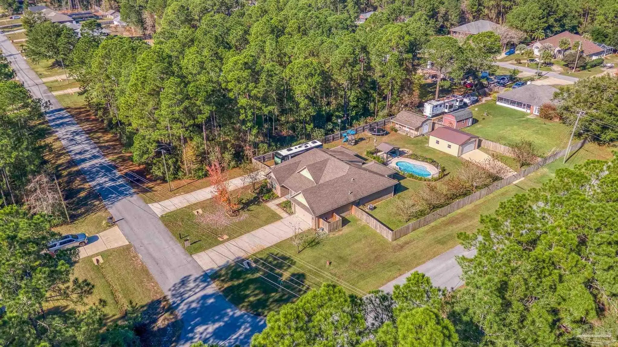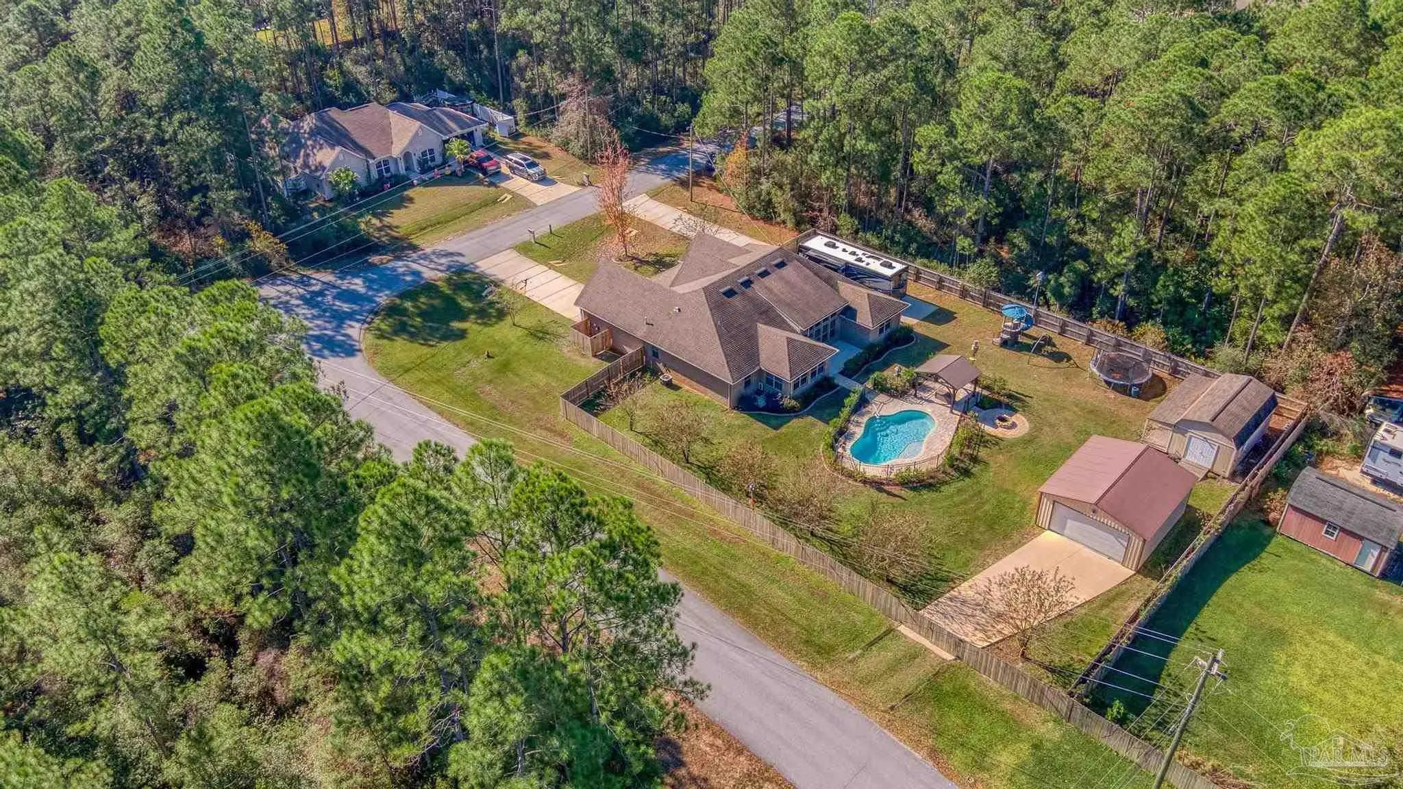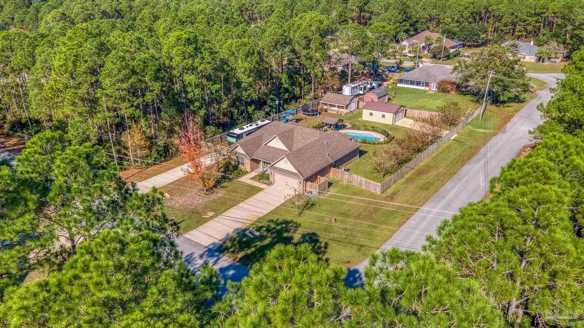 Welcome to this stunning nearly 3,000 sq. ft. all-brick home offering 4 bedrooms, 3 bathrooms, and a dedicated office that could easily serve as a fifth bedroom. Step inside to beautifully tiled floors throughout the main living areas, with plush carpet in the bedrooms for added comfort. The modern open-concept floor plan features a chef’s kitchen equipped with quartz countertops, gas cooktop, wall oven, microwave/convection oven, stainless steel appliances, and a brand-new refrigerator. An oversized island and large walk-in pantry complete this impressive space. The great room boasts elegant coffered boxed ceilings and recessed lighting, with a formal dining room just steps away—perfect for entertaining. The luxurious master suite includes a trey ceiling, a cozy sitting area, and a spa-like bath with a garden tub, tiled shower, double quartz vanity, and an oversized closet. Enjoy peace of mind with a whole-house gas generator. Outside, the two-car oversized attached garage is complemented by a detached two-car garage/workshop with electricity and its own concrete drive. Additional features include a powered shed with nearby water access and an RV pad with hookups. Your private backyard oasis awaits with an in-ground gunite pool featuring a tanning ledge, child safety fence, paver patio, gazebo, and fire pit. Situated on a corner lot over half an acre, this home offers exceptional privacy while being conveniently close to Navarre Beach. Located in the sought-after Holley by the Sea community, you'll enjoy access to resort-style amenities including multiple pools, a recreation center, tennis courts, a picnic area, and more.