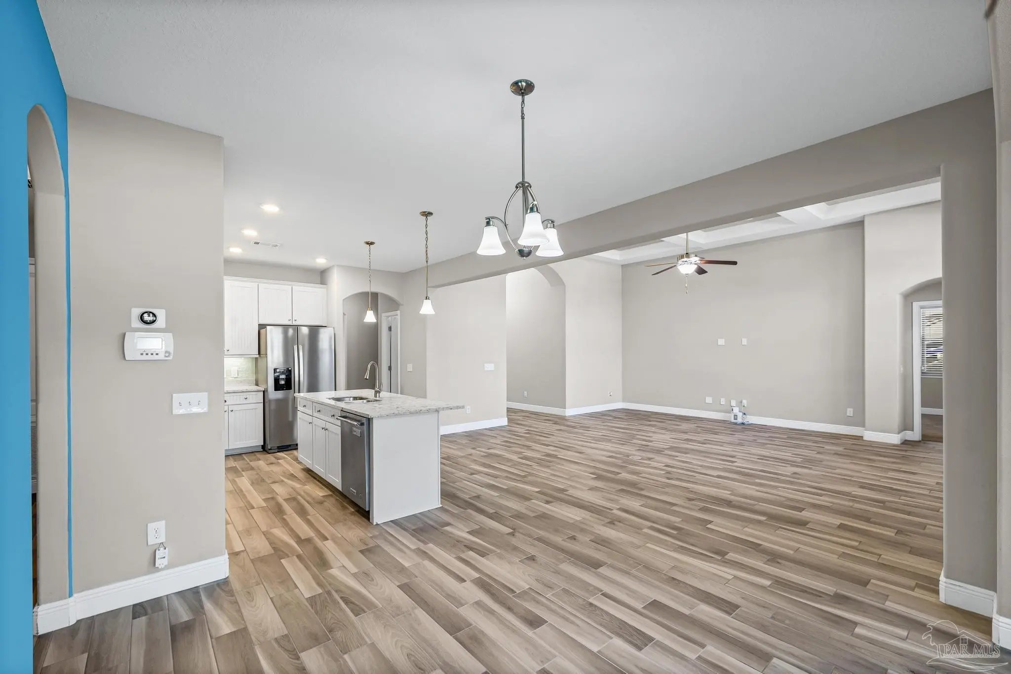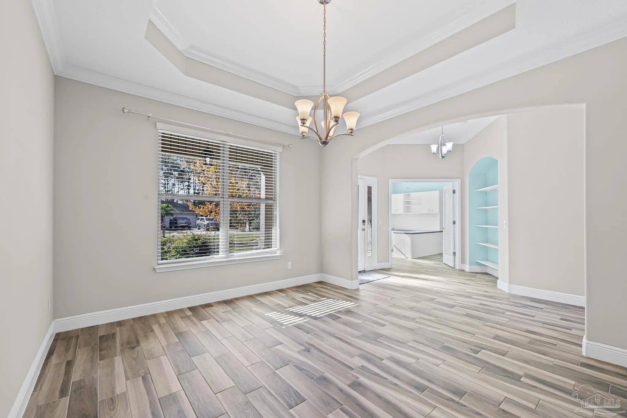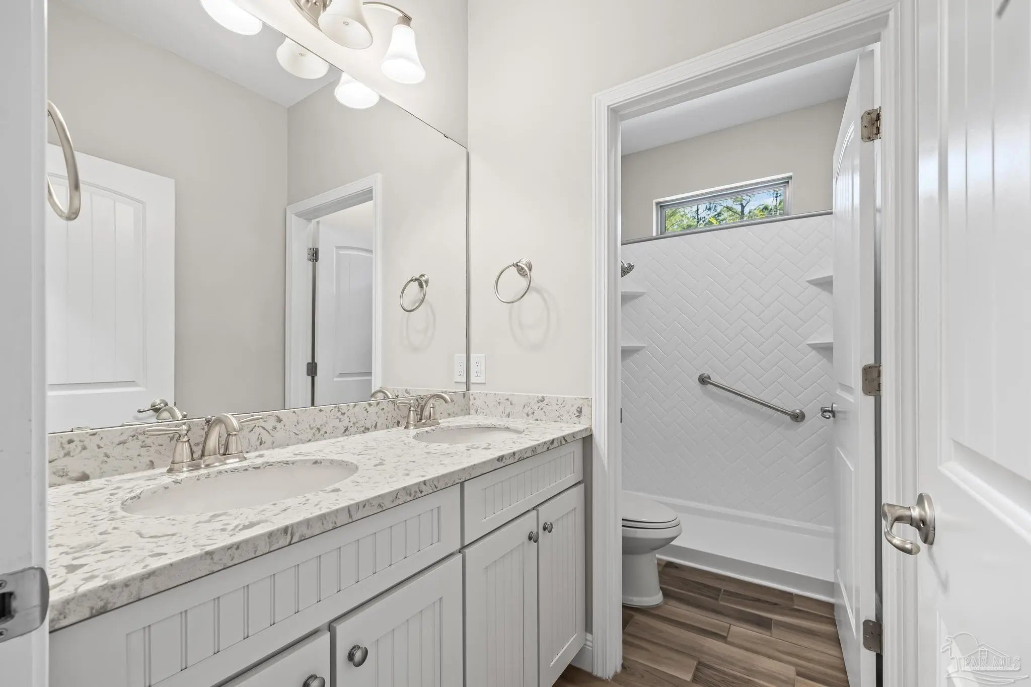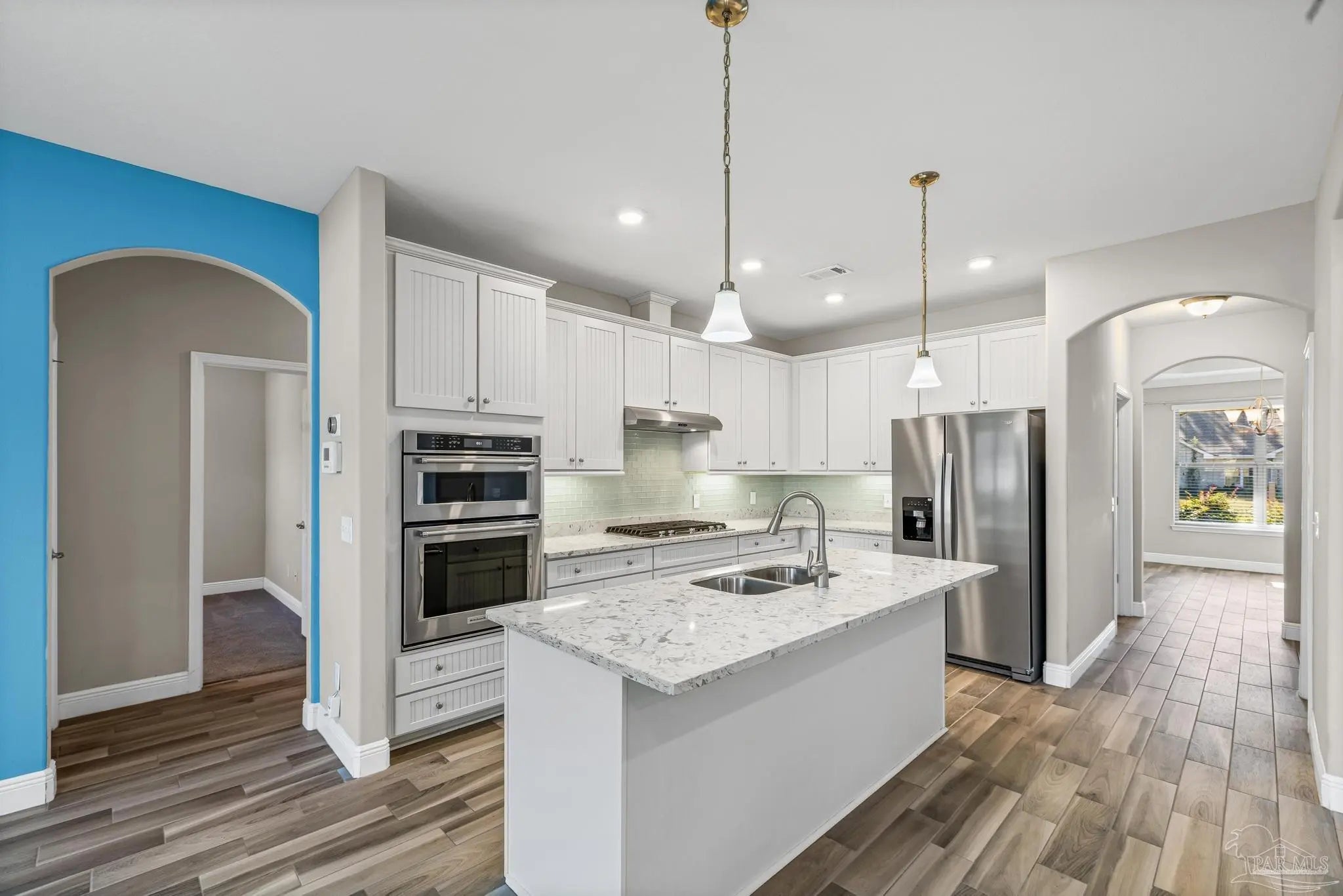 Welcome to this stunning nearly 3,000 sq. ft. all-brick home offering 4 bedrooms, 3 bathrooms, and a dedicated office that could easily serve as a fifth bedroom. Step inside to beautifully tiled floors throughout the main living areas, with plush carpet in the bedrooms for added comfort. The modern open-concept floor plan features a chef’s kitchen equipped with quartz countertops, gas cooktop, wall oven, microwave/convection oven, stainless steel appliances, and a brand-new refrigerator. An oversized island and large walk-in pantry complete this impressive space. The great room boasts elegant coffered boxed ceilings and recessed lighting, with a formal dining room just steps away—perfect for entertaining. The luxurious master suite includes a trey ceiling, a cozy sitting area, and a spa-like bath with a garden tub, tiled shower, double quartz vanity, and an oversized closet. Enjoy peace of mind with a whole-house gas generator. Outside, the two-car oversized attached garage is complemented by a detached two-car garage/workshop with electricity and its own concrete drive. Additional features include a powered shed with nearby water access and an RV pad with hookups. Your private backyard oasis awaits with an in-ground gunite pool featuring a tanning ledge, child safety fence, paver patio, gazebo, and fire pit. Situated on a corner lot over half an acre, this home offers exceptional privacy while being conveniently close to Navarre Beach. Located in the sought-after Holley by the Sea community, you'll enjoy access to resort-style amenities including multiple pools, a recreation center, tennis courts, a picnic area, and more.