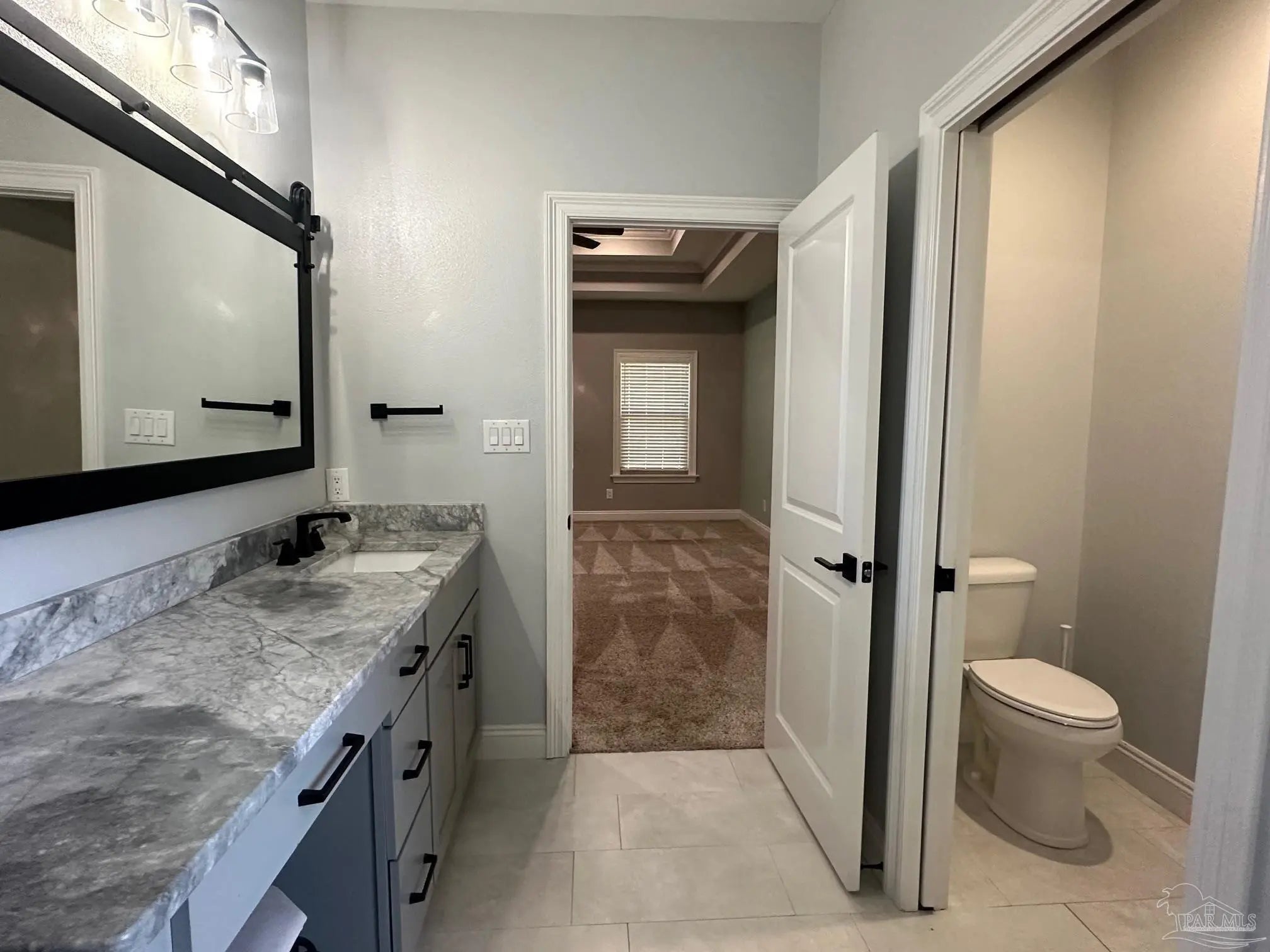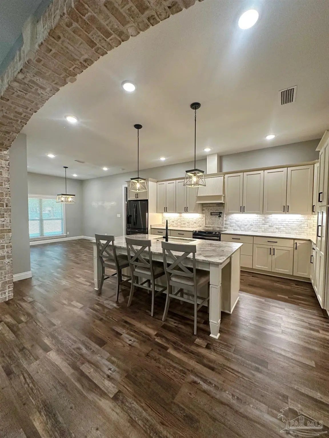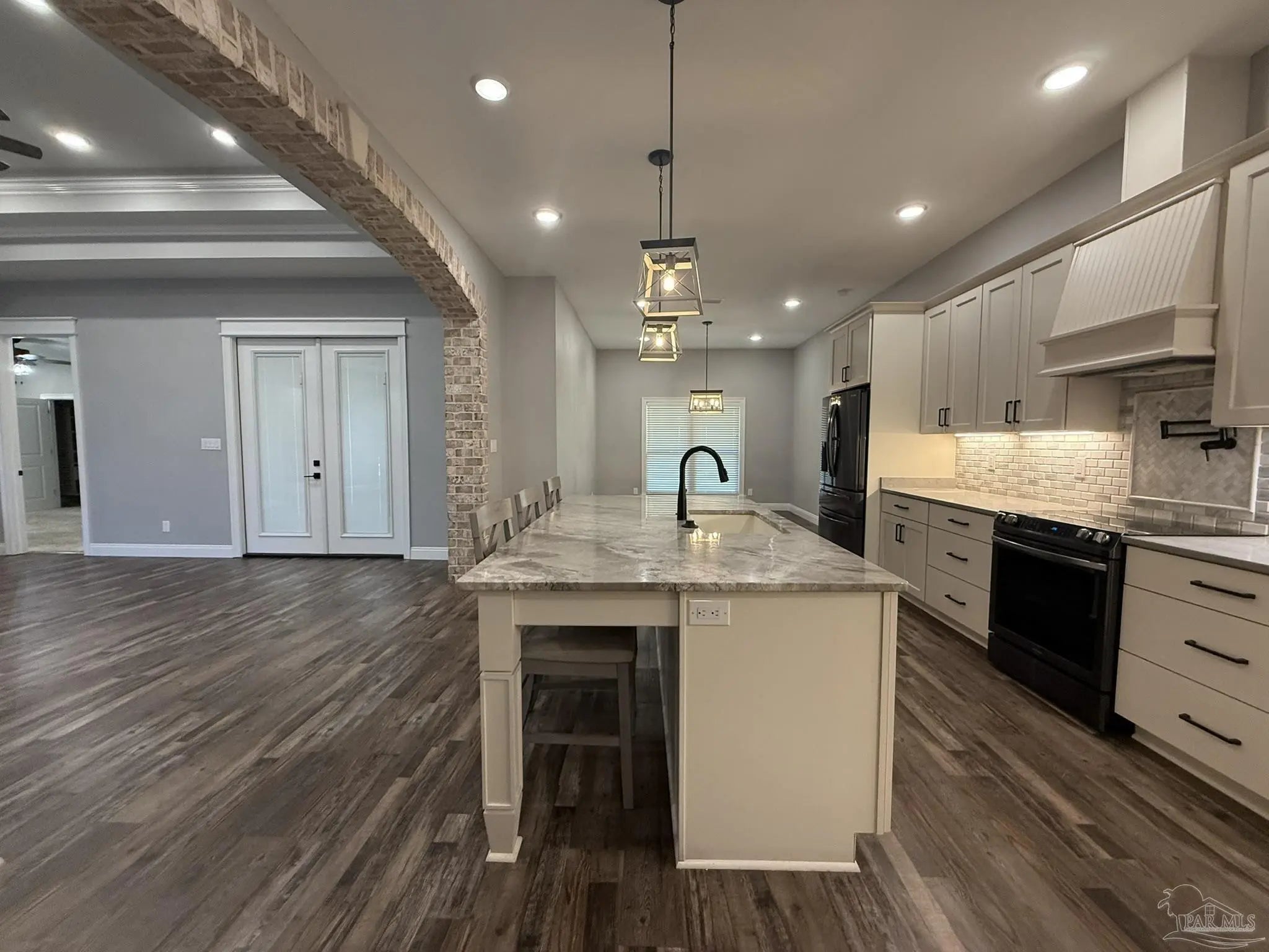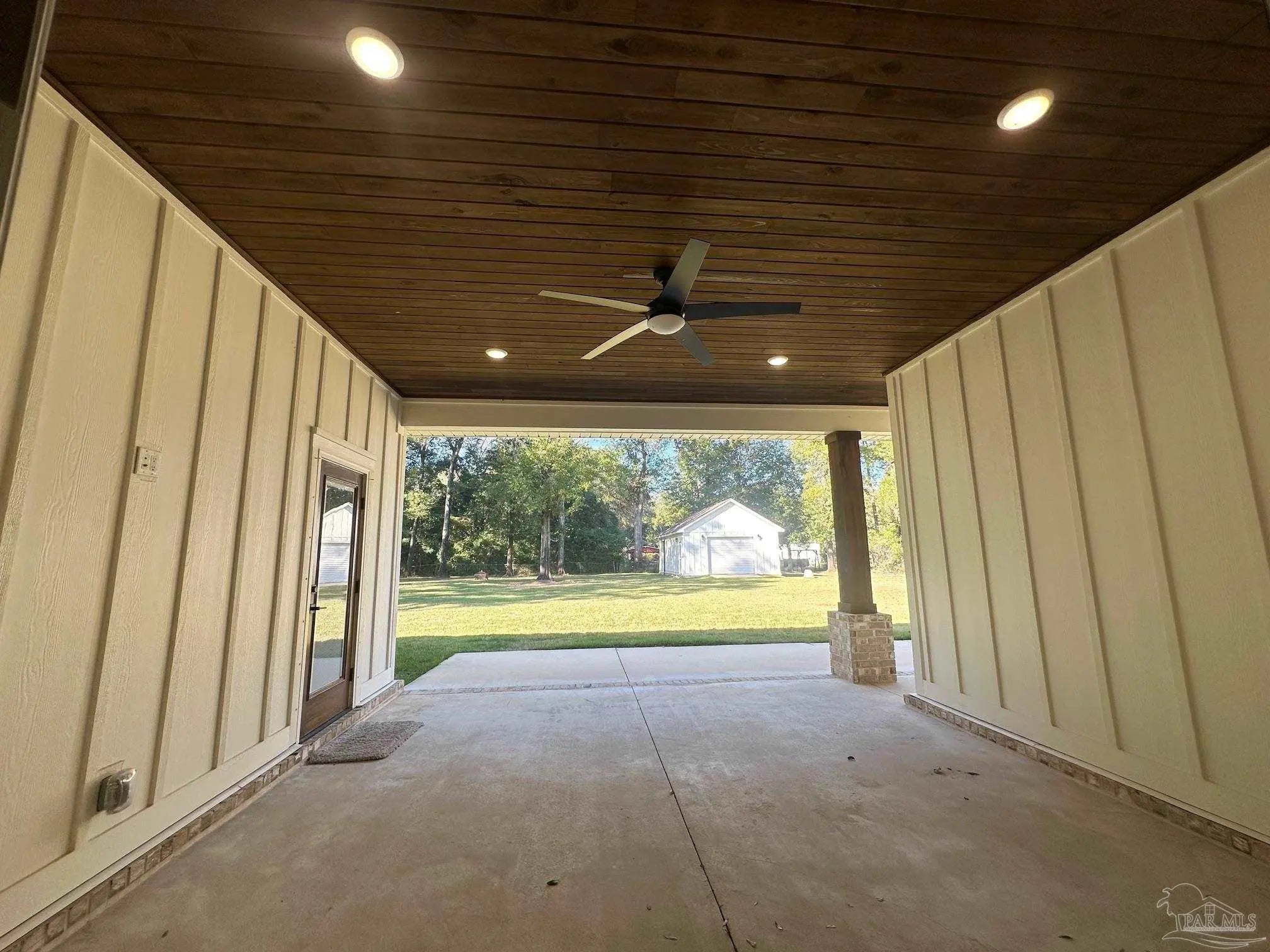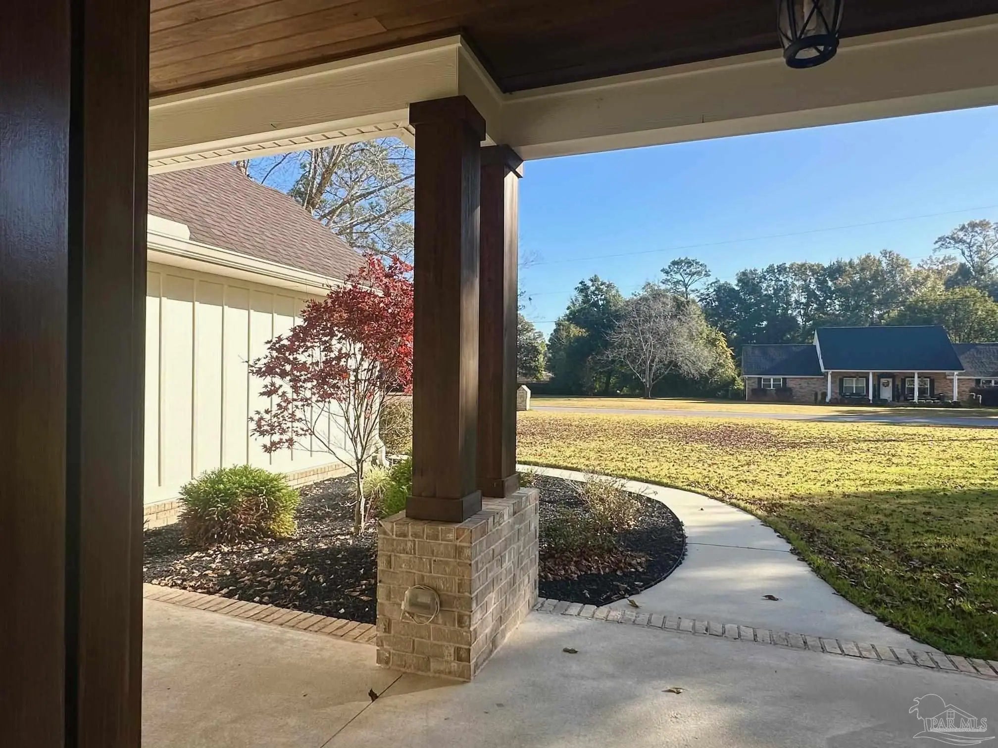 East facing, wonderfully planned home with 2 primary suites located on .98 acres!! The 2-car garage plus a detached garage (both have overhead storage) with 20x20 living area provide usage options. All bedrooms have walk-in closets with high grade shelving. Ornate nested-tray ceilings adorn the dining area, the great room and the main primary bedroom. This home has quality through-out and attention to detail! From brick archway, executive grade trim work & fixtures, window framing, chair rail to self-close pocket doors. Ceilings are all at least 9 feet and soar up to 12' in the crown of the tray. Windows have wood blinds; exit doors have built in blinds. Windows have impact resistant glass so you won't have to be putting up storm shutters every time the weather changes! Flooring is luxury vinyl plank (wood look) in most common areas, tile in baths and carpet in bedrooms. The floorplan is very flexible! Dining area could be repurposed because kitchen has a wonderful built-in marble top island & table (with deep sink) & Breakfast nook. The island marble was hand selected and quarried near New Orleans. There is a beverage bar & mounted pot filler over stove. The main bedroom connects to huge galley-style laundry room; laundry also connects to common area so the floorplan flows easily. Main bath has two dressing areas, a real tile shower, an amazing walk-in closet with built-ins and a garden tub! 2-car garage has pedestrian door, opener, large attic access and 8x20' floored storage above garage. Attic is foam sealed and HVAC is 20 seer, 3-zone, high efficiency heat pump hot water heater. Rear yard was planned around possibility of inground pool. The electrical is already in place and 16x18 covered rear porch has access to a full bath so it can transition to lanai. The porch ceilings are exquisite tongue-in-groove stained cypress. Driveway has extra parking pad; lawn is established carpet of luxurious Zoysia. Built in surround sound & programmable lighting convey.