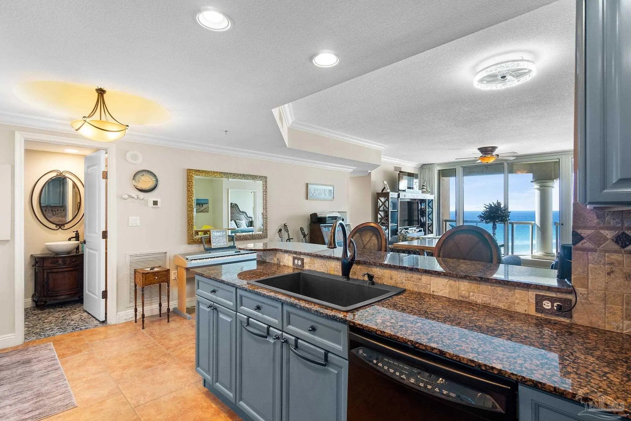 Gulf views and unbelievable sunsets year-round! This move-in-ready condo is perfectly suited as an investment property, second home, or full-time residence. Freshly painted and featuring new cabinetry throughout, the home is fully furnished with a few exceptions and thoughtfully designed to offer a view from every room. The open-concept kitchen, dining, and living area creates an inviting space for entertaining or relaxing, enhanced by low-maintenance ceramic tile flooring and granite countertops. This two-bedroom, two-and-a-half-bathroom residence offers two well-appointed suites, each with balcony access. The primary suite features generous closet space, dual sinks, a separate shower, and a jetted tub, while the additional bedroom suite includes a private ensuite bathroom with a tiled shower and tub combination, providing comfort and privacy for guests. A conveniently located in-unit laundry area and a half bath just off the kitchen add to the home’s functionality. Major upgrades include a new air conditioning system and a new water heater, ensuring peace of mind for years to come. One garage parking space and a storage unit convey with the property. Residents enjoy five-star amenities including multiple pools, spa, fitness center, and tennis courts. With breathtaking Gulf views, modern updates, and resort-style amenities, this condo is truly a complete, turnkey opportunity.