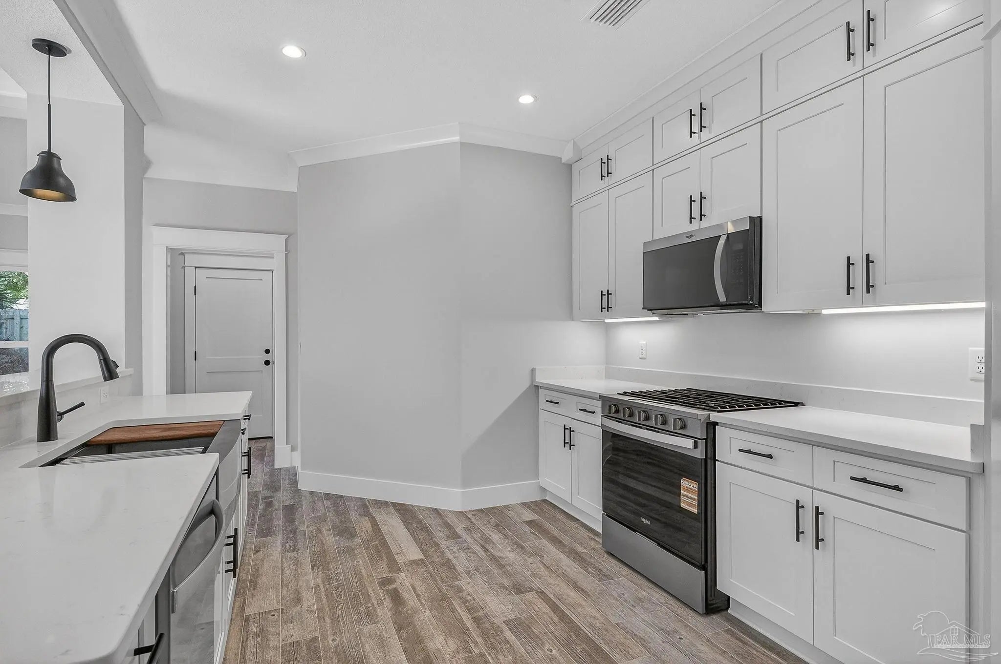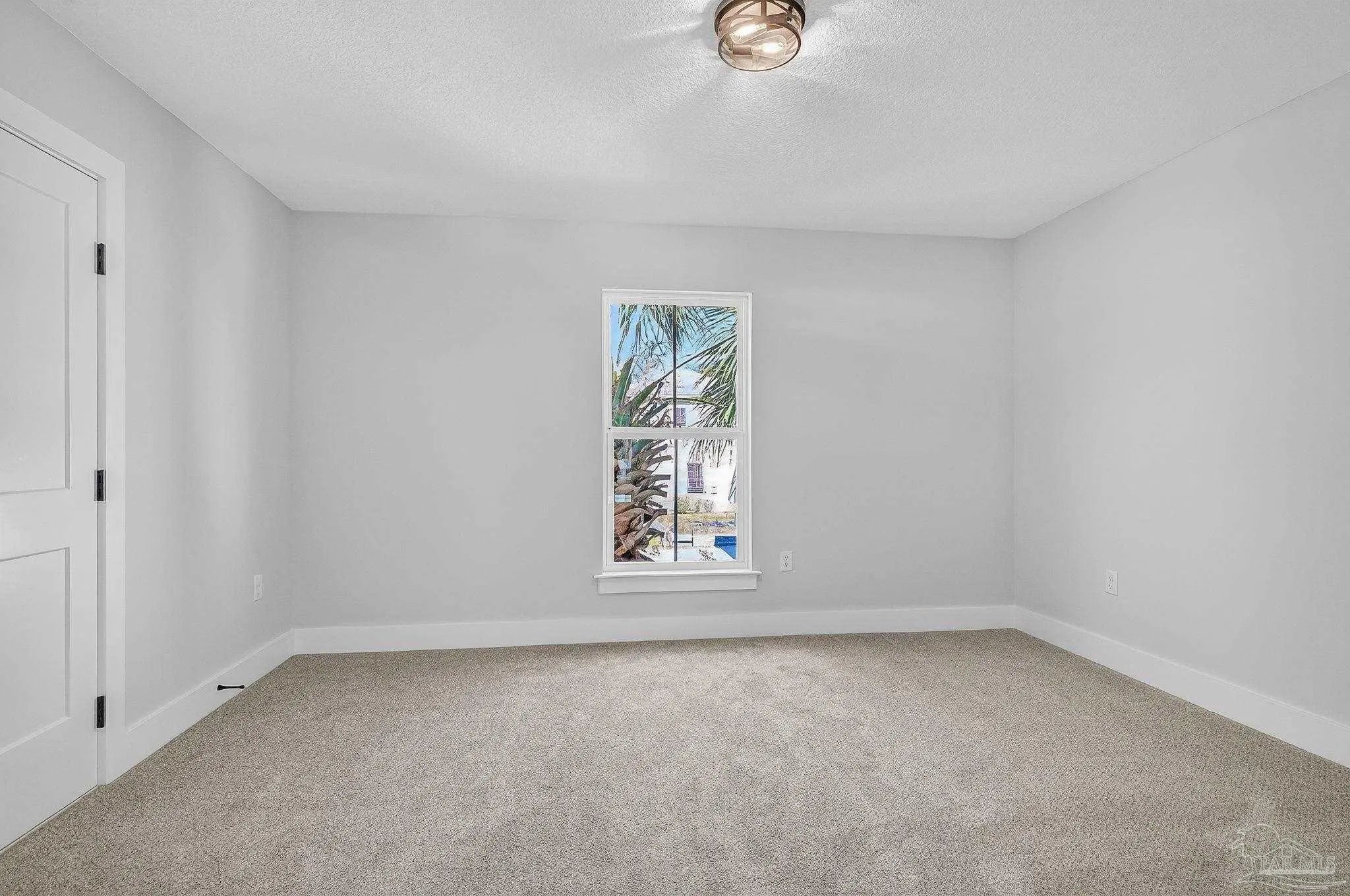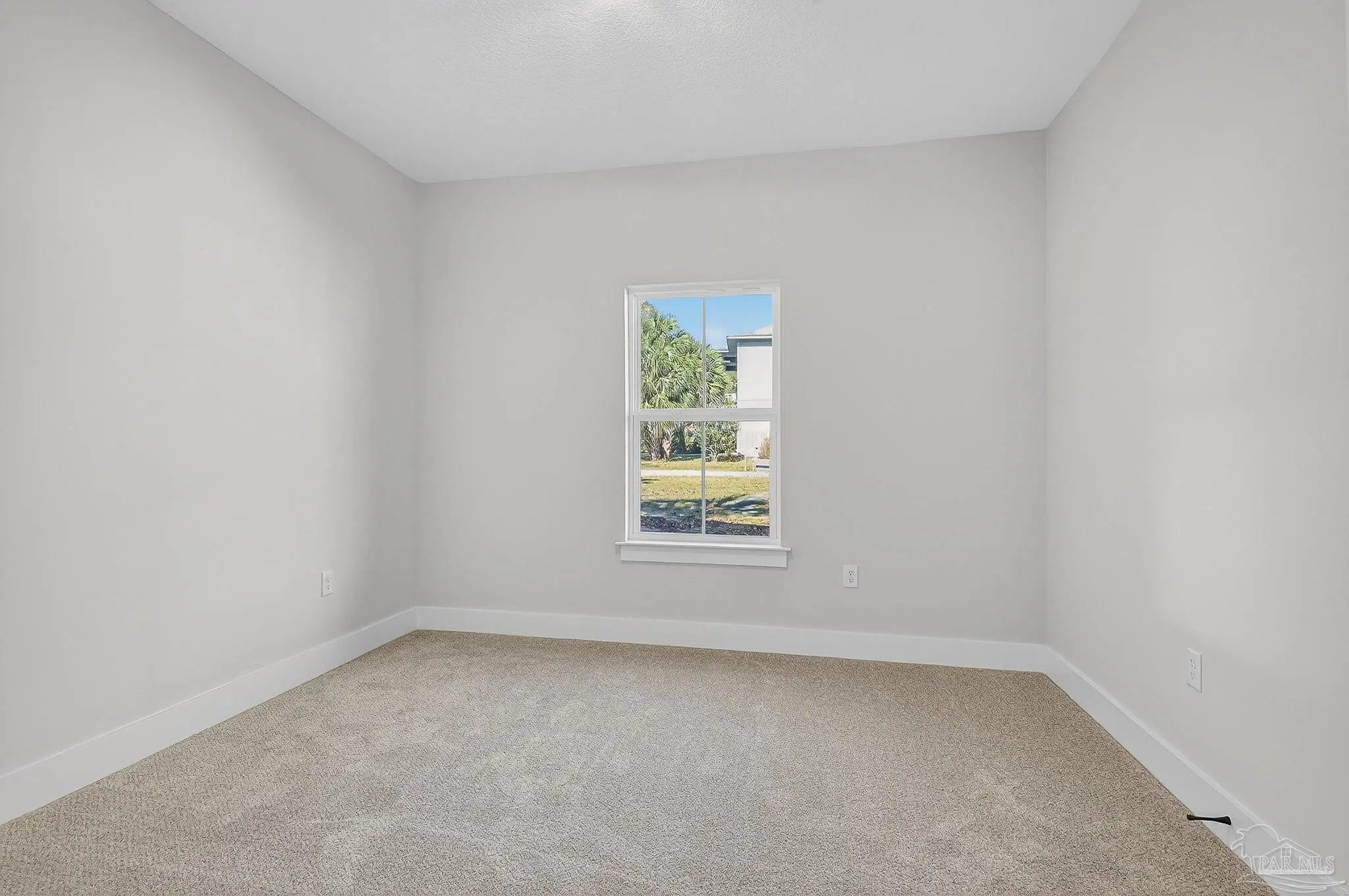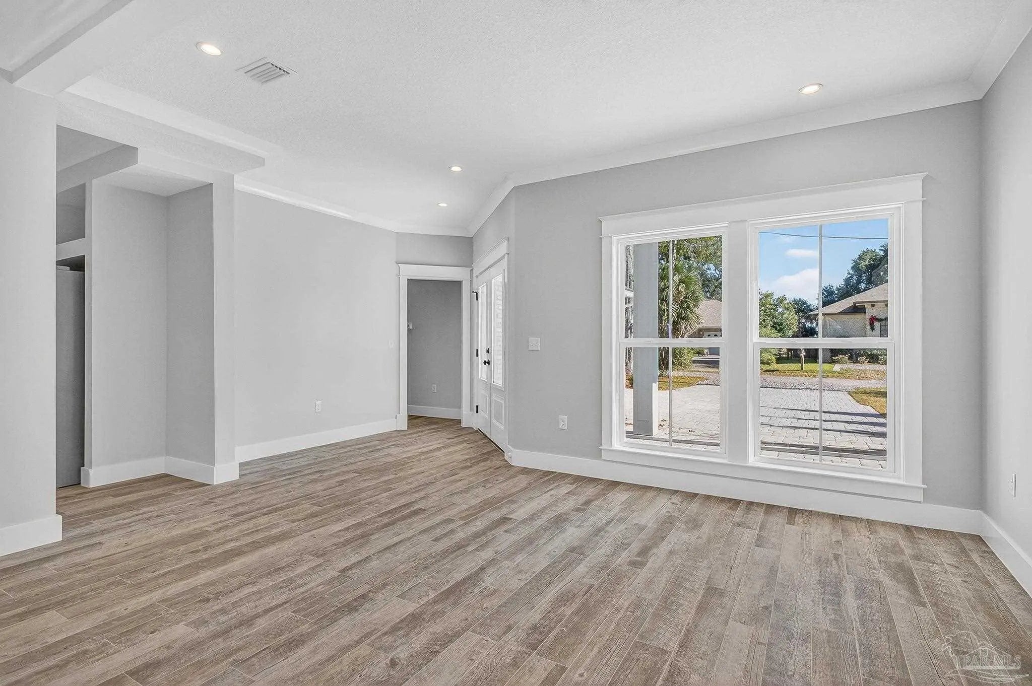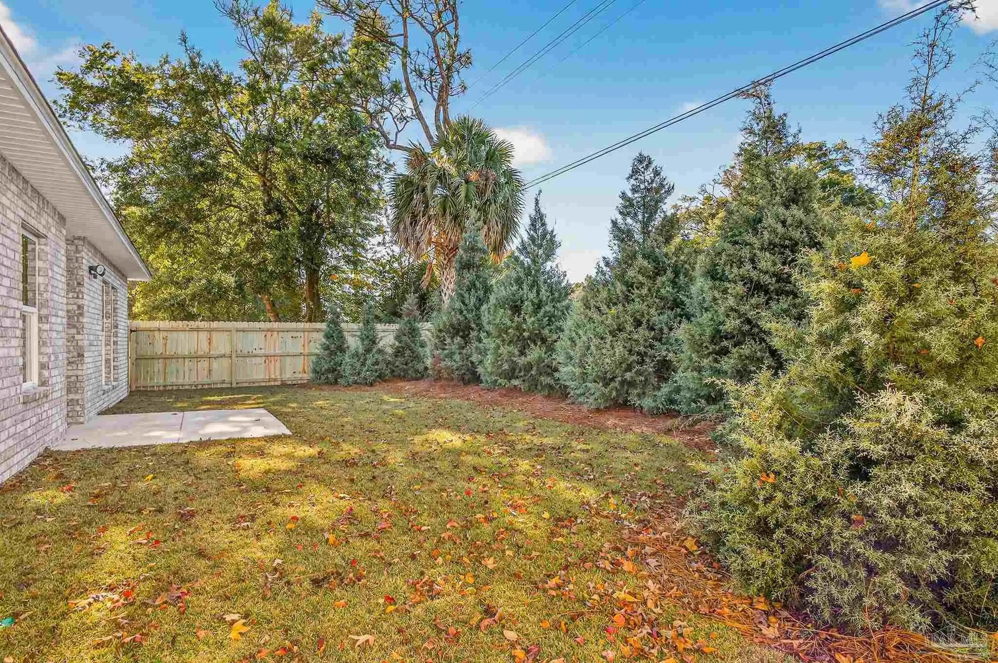 This newly built home is conveniently situated just minutes from local shopping and dining options, including a grocery store, bakery, bistro, and more. It offers a charming coastal vibe and is only a short drive to downtown Pensacola and Pensacola Beach. The inviting paver driveway leads up to the house and the side-entry two-car garage. Under the covered front porch, you'll find the main entrance, which welcomes you with plenty of natural light and high ceilings. The open concept living room and kitchen are on the main floor, along with the primary suite, a full guest bathroom with a tile wall shower, a guest bedroom, and a laundry room. The kitchen features modern white cabinets, quartz countertops, a stainless steel gas range, refrigerator, dishwasher, and a full pantry with built-in shelves. Both the kitchen and living room have wood-look tile plank flooring. The primary suite offers a spacious bedroom with a tray ceiling and soft ambient lighting, tile flooring, and peaceful views of the lush backyard trees. The primary bathroom includes a double vanity with quartz countertops, a relaxing free-standing tub, and a beautiful tile shower with a frameless glass door. It also provides two closets for plenty of storage. Upstairs, there's a full bathroom with a tile wall shower, two additional bedrooms, and a versatile bonus room with a linen closet. The South-facing upstairs bedroom has a partial water view of the Bay. The roof and exterior walls feature upgraded insulation. Out back, you'll find a privacy fence, an open patio, and vibrant landscaping that offers both sound dampening and privacy. Additional features include impact-resistant windows and front door, a tankless gas water heater, and yard sprinkler system. Schedule a showing to see this home today!