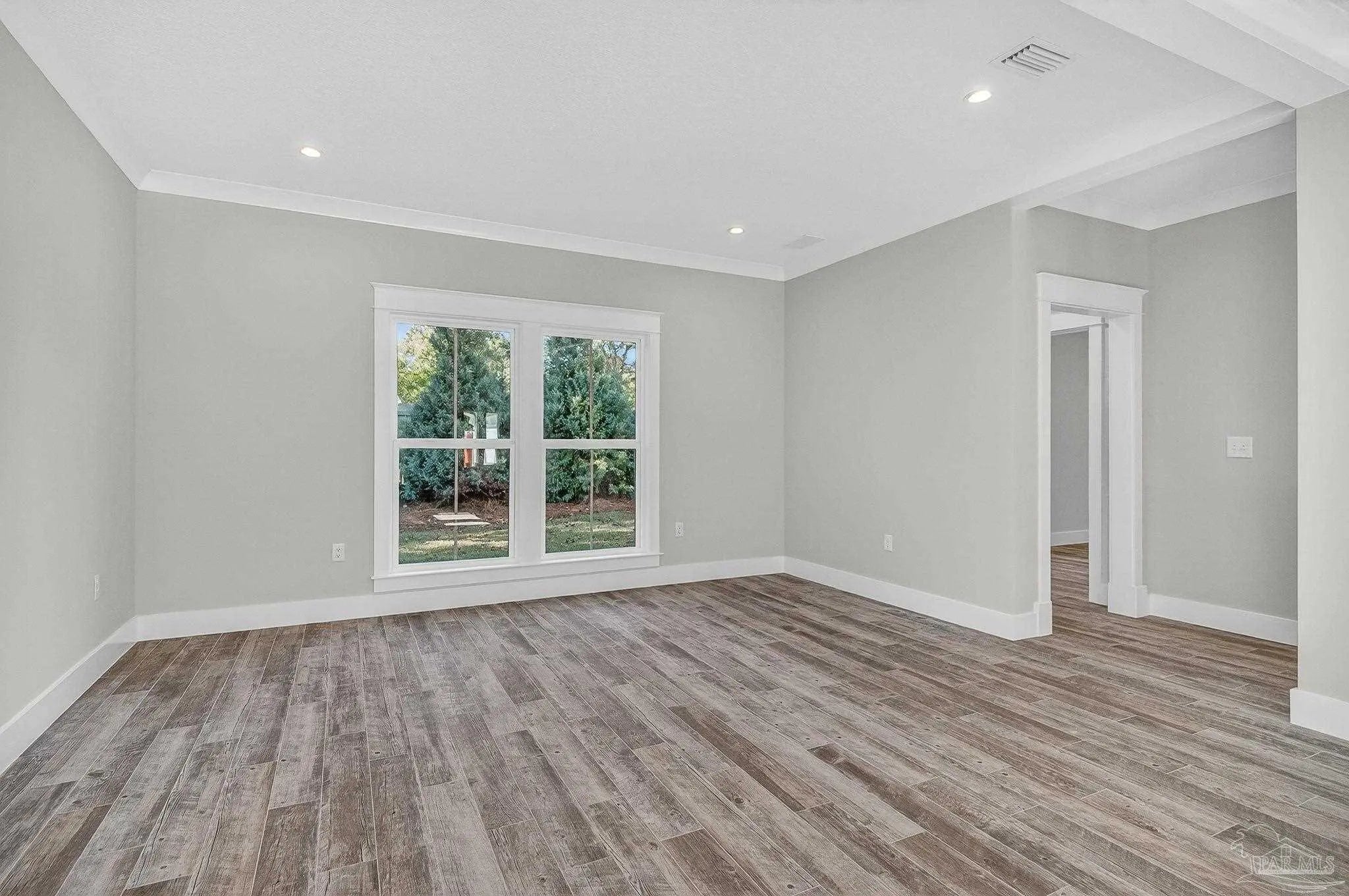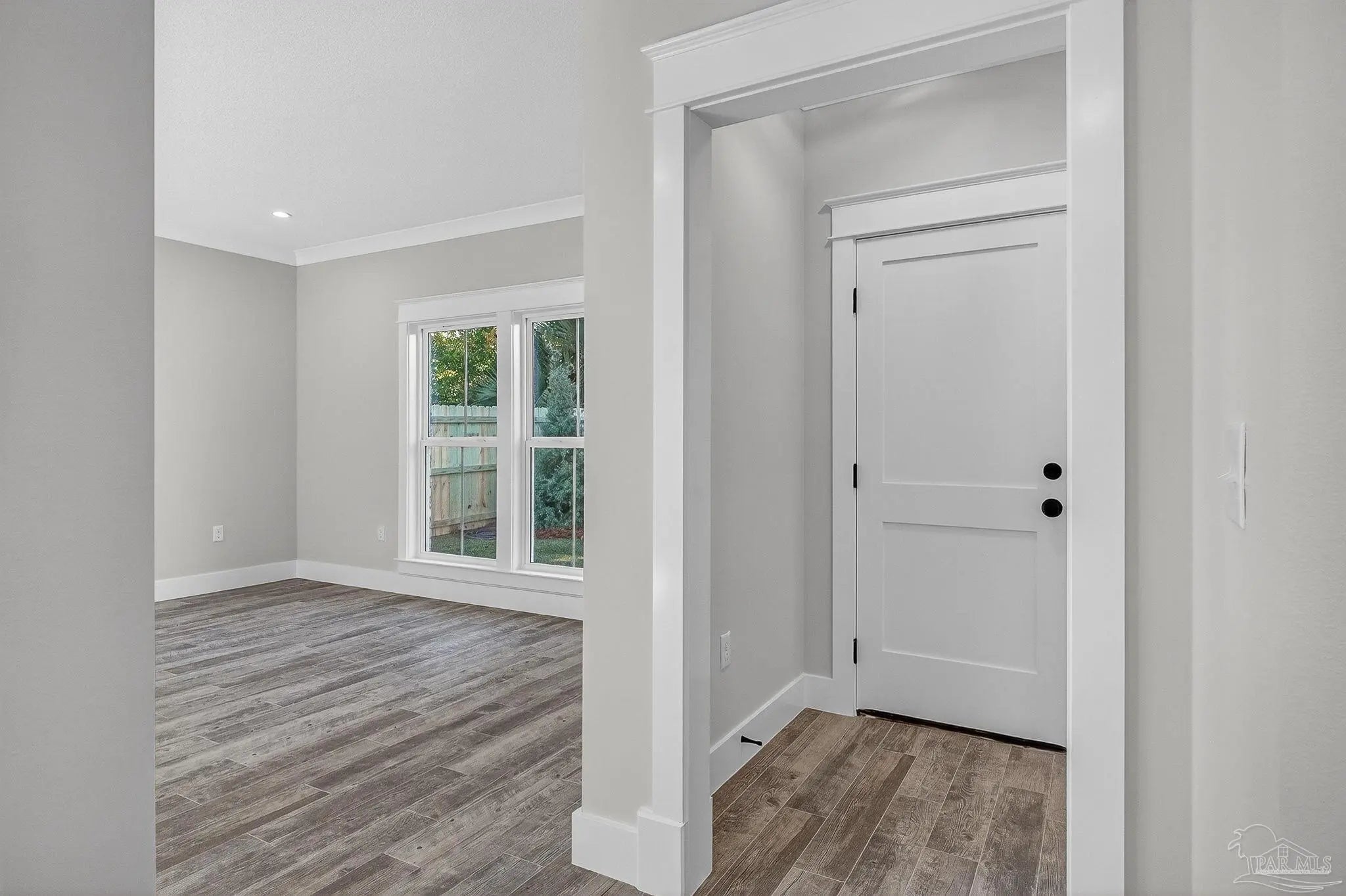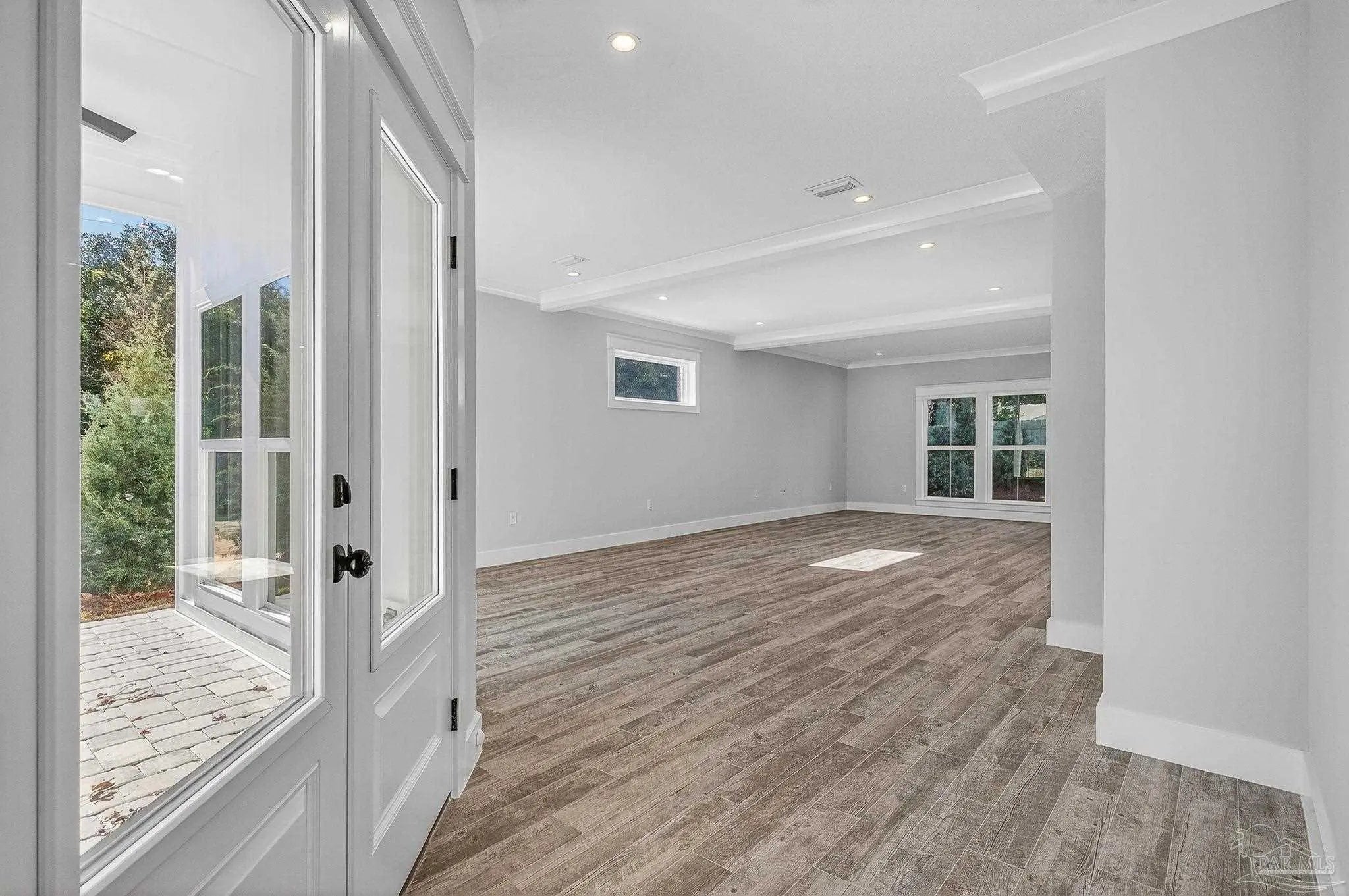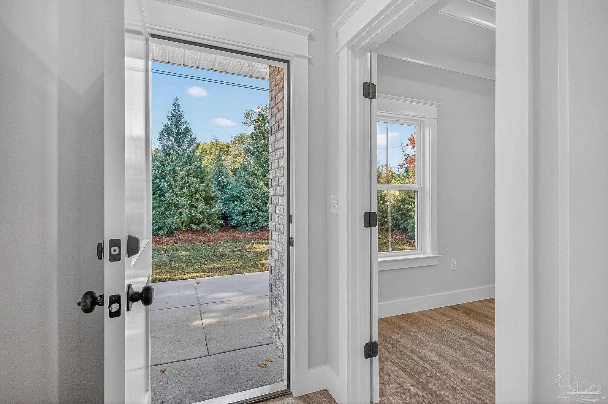 This newly built home is conveniently situated just minutes from local shopping and dining options, including a grocery store, bakery, bistro, and more. It offers a charming coastal vibe and is only a short drive to downtown Pensacola and Pensacola Beach. The inviting paver driveway leads up to the house and the side-entry two-car garage. Under the covered front porch, you'll find the main entrance, which welcomes you with plenty of natural light and high ceilings. The open concept living room and kitchen are on the main floor, along with the primary suite, a full guest bathroom with a tile wall shower, a guest bedroom, and a laundry room. The kitchen features modern white cabinets, quartz countertops, a stainless steel gas range, refrigerator, dishwasher, and a full pantry with built-in shelves. Both the kitchen and living room have wood-look tile plank flooring. The primary suite offers a spacious bedroom with a tray ceiling and soft ambient lighting, tile flooring, and peaceful views of the lush backyard trees. The primary bathroom includes a double vanity with quartz countertops, a relaxing free-standing tub, and a beautiful tile shower with a frameless glass door. It also provides two closets for plenty of storage. Upstairs, there's a full bathroom with a tile wall shower, two additional bedrooms, and a versatile bonus room with a linen closet. The South-facing upstairs bedroom has a partial water view of the Bay. The roof and exterior walls feature upgraded insulation. Out back, you'll find a privacy fence, an open patio, and vibrant landscaping that offers both sound dampening and privacy. Additional features include impact-resistant windows and front door, a tankless gas water heater, and yard sprinkler system. Schedule a showing to see this home today!
