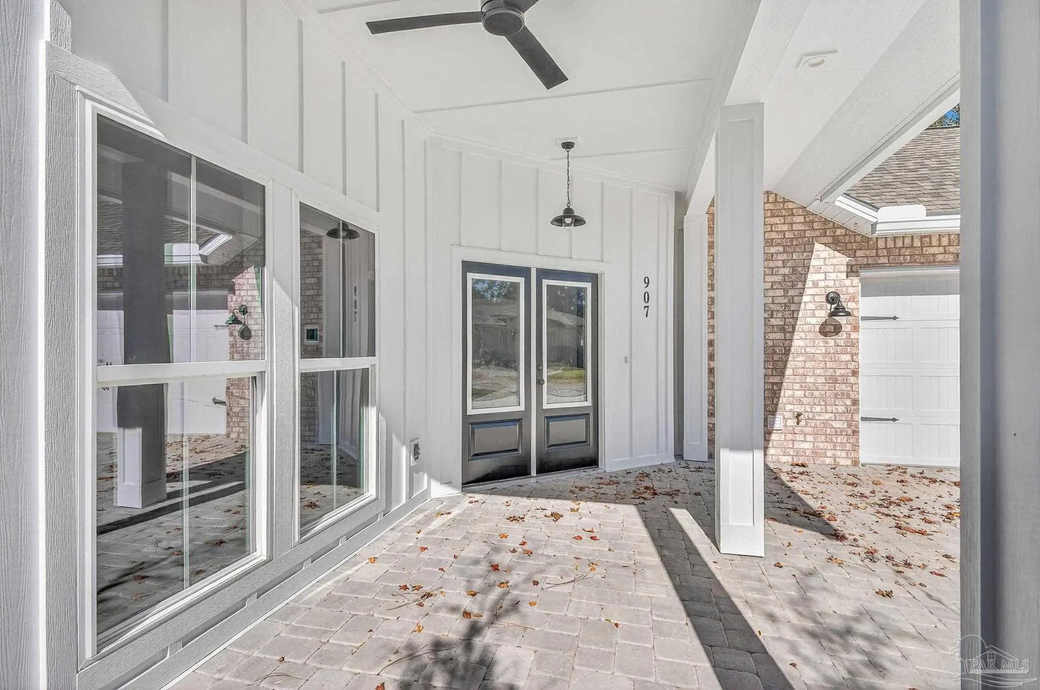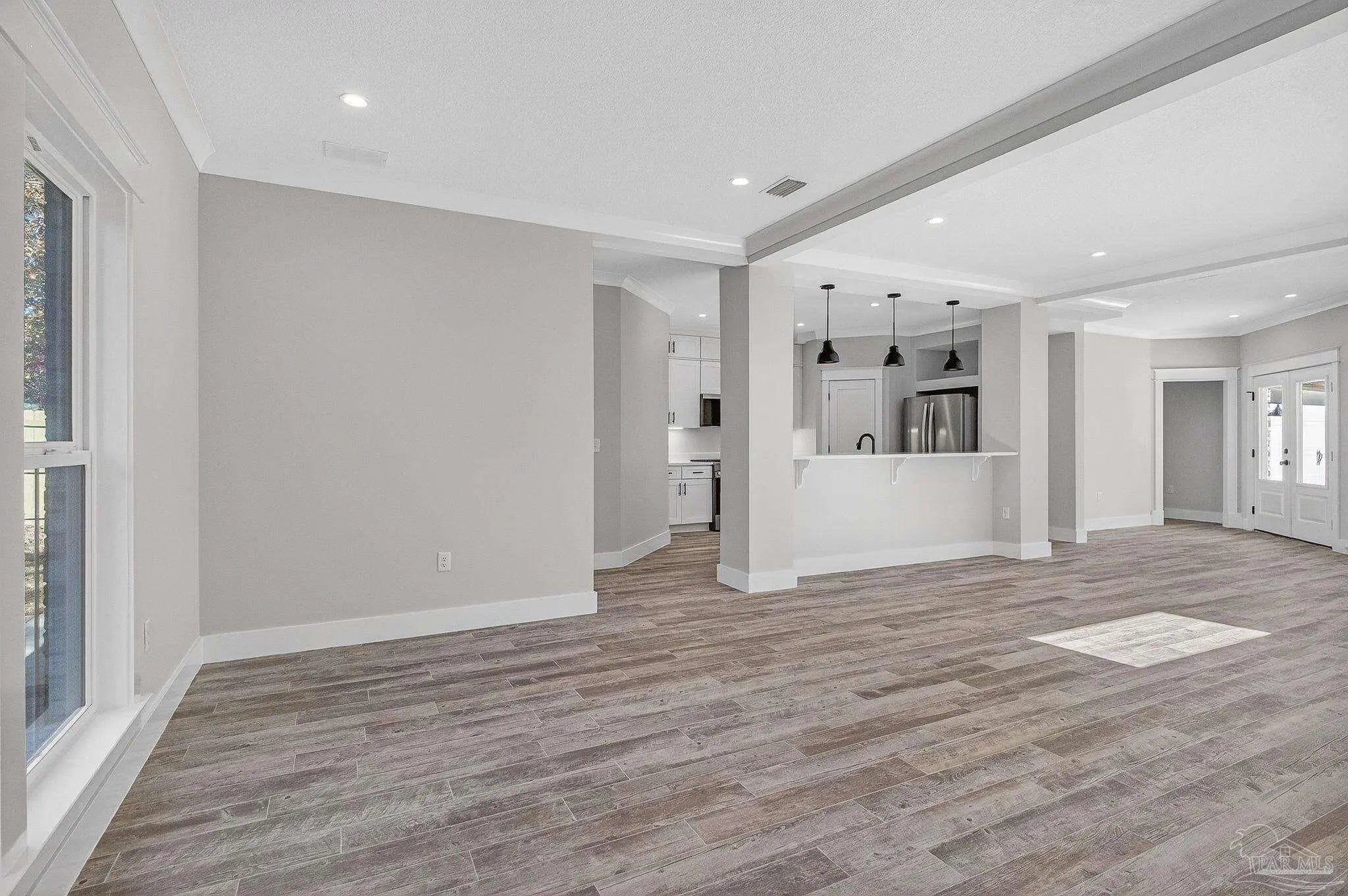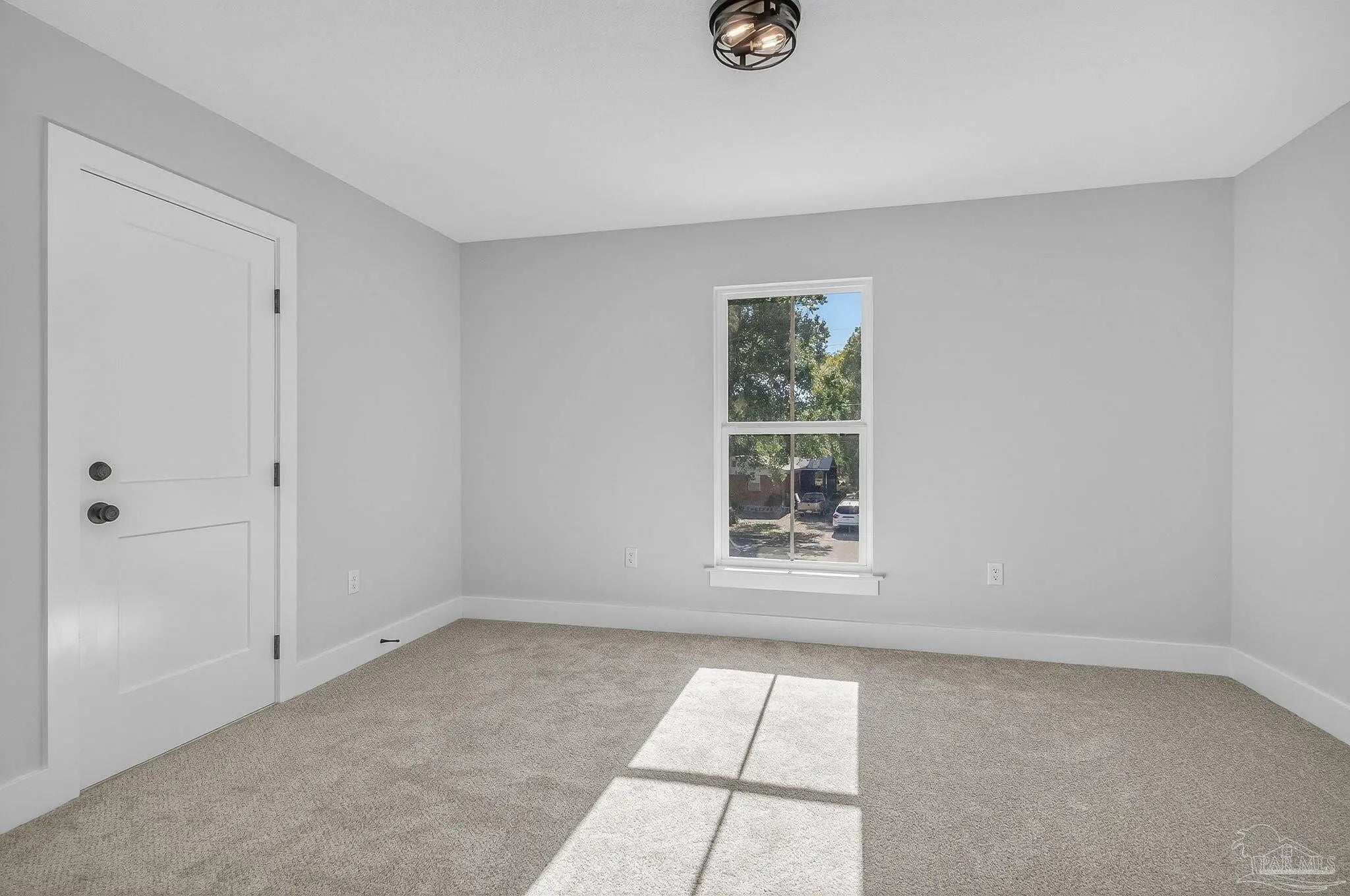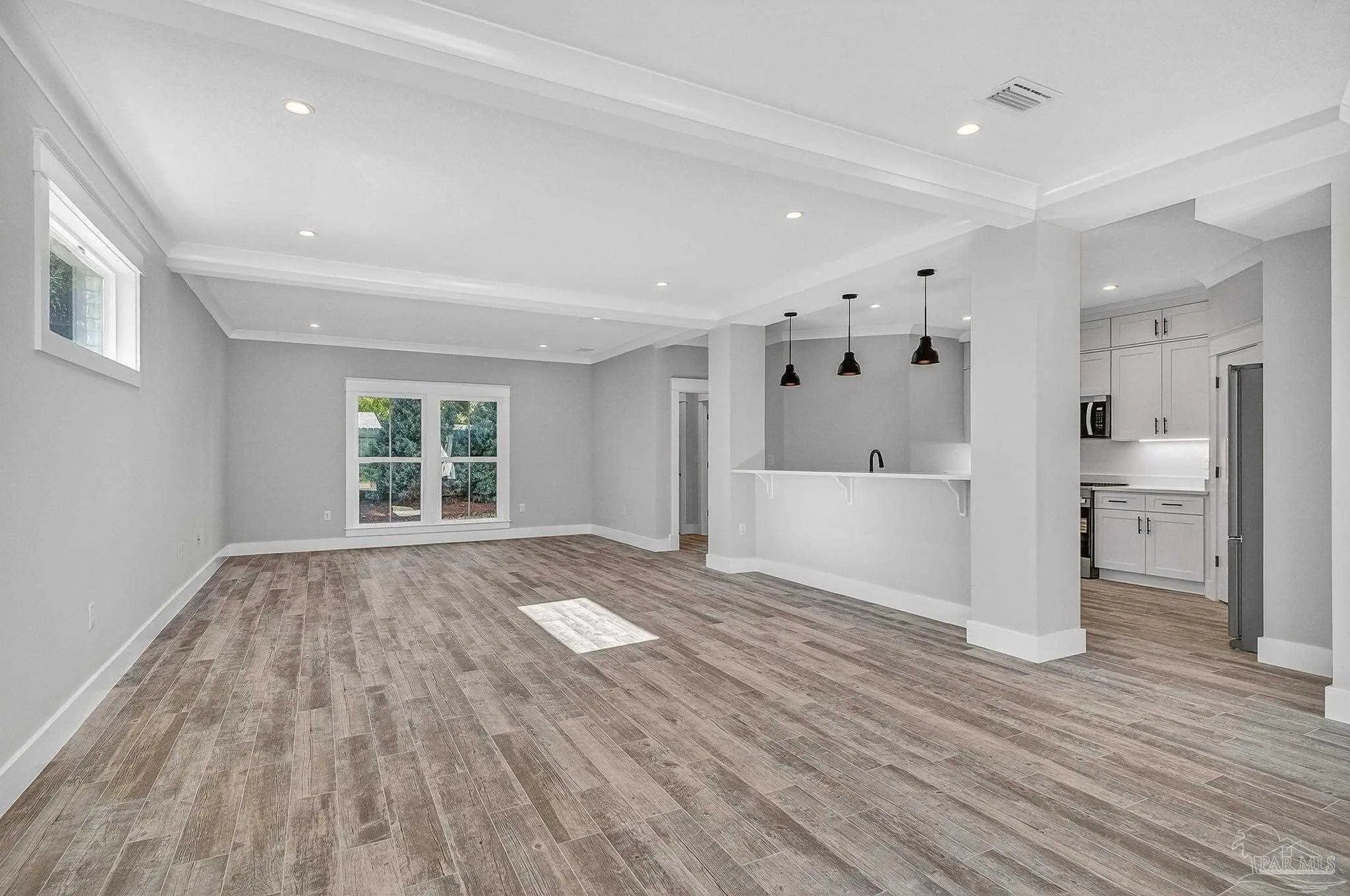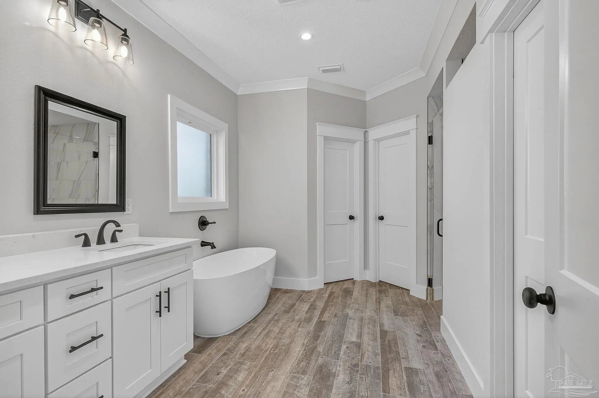 This newly built home is conveniently situated just minutes from local shopping and dining options, including a grocery store, bakery, bistro, and more. It offers a charming coastal vibe and is only a short drive to downtown Pensacola and Pensacola Beach. The inviting paver driveway leads up to the house and the side-entry two-car garage. Under the covered front porch, you'll find the main entrance, which welcomes you with plenty of natural light and high ceilings. The open concept living room and kitchen are on the main floor, along with the primary suite, a full guest bathroom with a tile wall shower, a guest bedroom, and a laundry room. The kitchen features modern white cabinets, quartz countertops, a stainless steel gas range, refrigerator, dishwasher, and a full pantry with built-in shelves. Both the kitchen and living room have wood-look tile plank flooring. The primary suite offers a spacious bedroom with a tray ceiling and soft ambient lighting, tile flooring, and peaceful views of the lush backyard trees. The primary bathroom includes a double vanity with quartz countertops, a relaxing free-standing tub, and a beautiful tile shower with a frameless glass door. It also provides two closets for plenty of storage. Upstairs, there's a full bathroom with a tile wall shower, two additional bedrooms, and a versatile bonus room with a linen closet. The South-facing upstairs bedroom has a partial water view of the Bay. The roof and exterior walls feature upgraded insulation. Out back, you'll find a privacy fence, an open patio, and vibrant landscaping that offers both sound dampening and privacy. Additional features include impact-resistant windows and front door, a tankless gas water heater, and yard sprinkler system. Schedule a showing to see this home today!