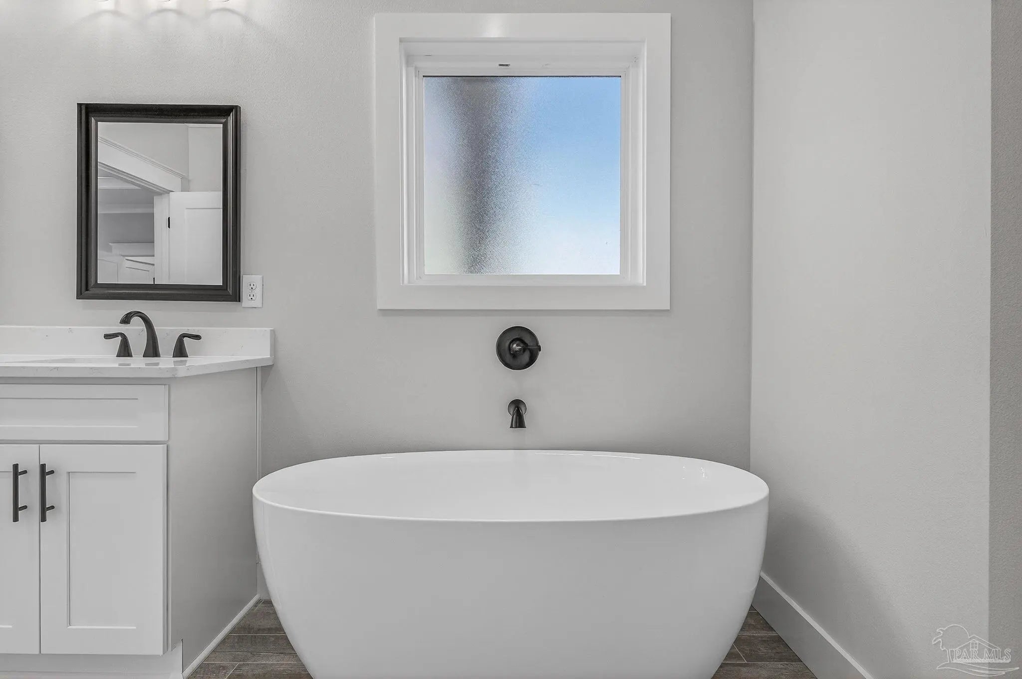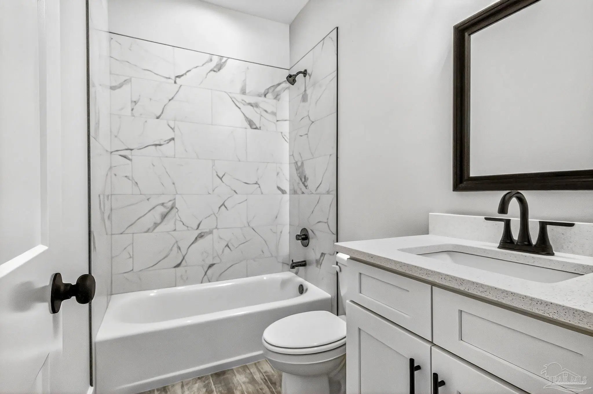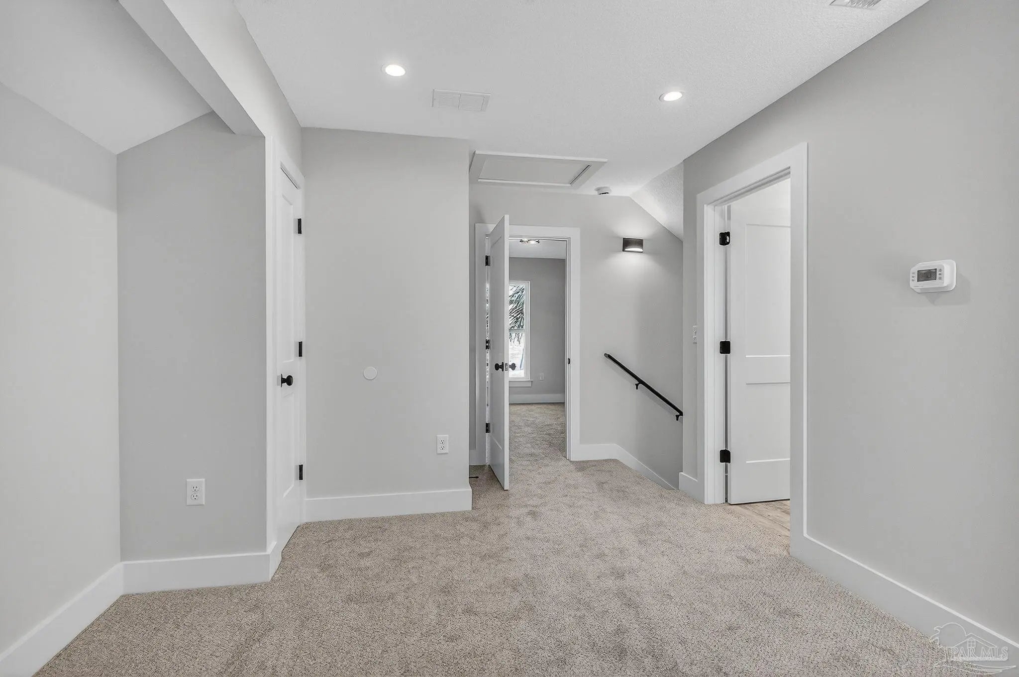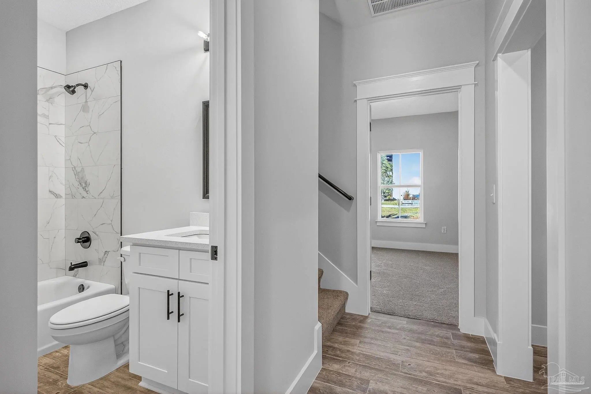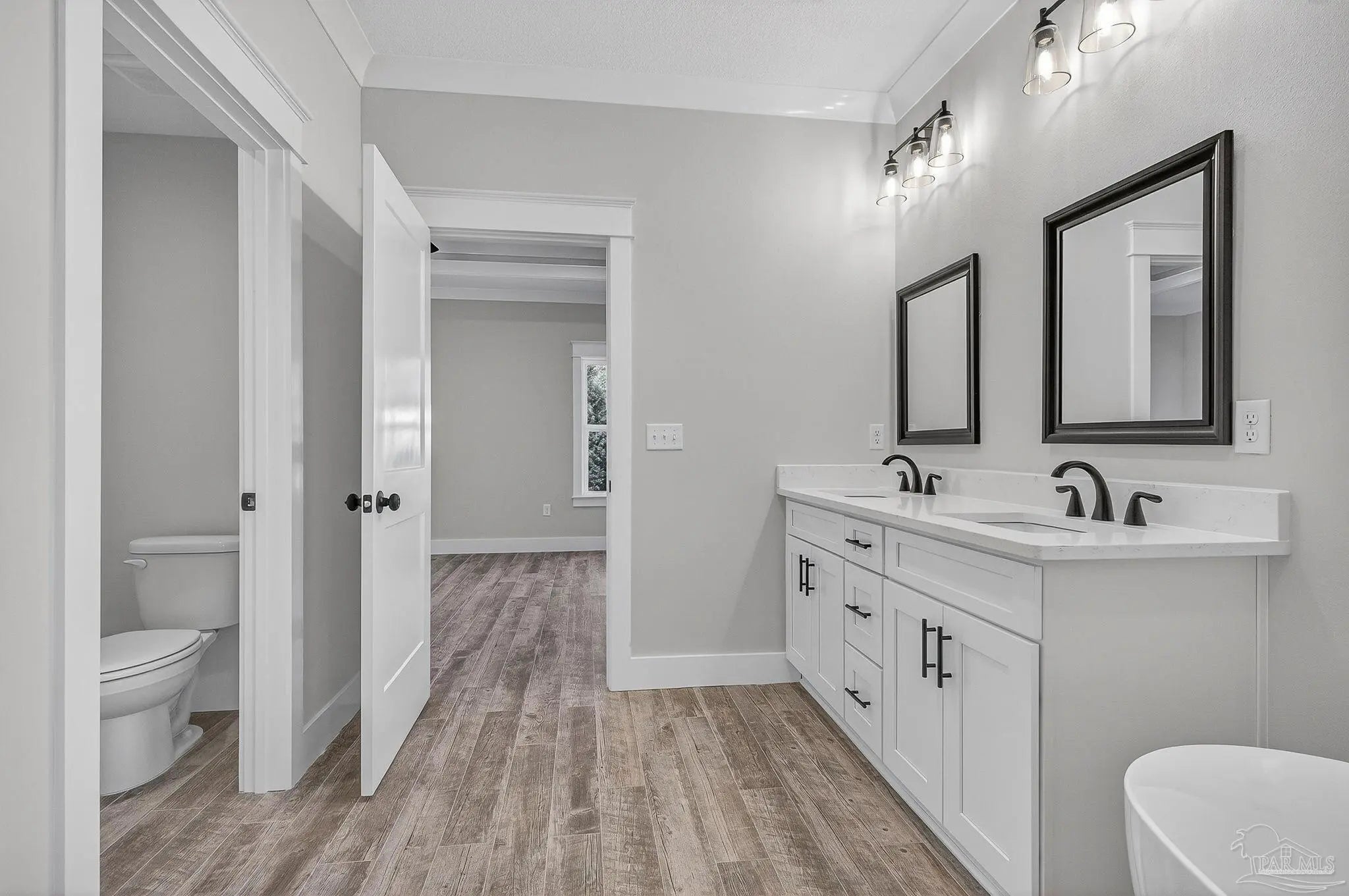 This newly built home is conveniently situated just minutes from local shopping and dining options, including a grocery store, bakery, bistro, and more. It offers a charming coastal vibe and is only a short drive to downtown Pensacola and Pensacola Beach. The inviting paver driveway leads up to the house and the side-entry two-car garage. Under the covered front porch, you'll find the main entrance, which welcomes you with plenty of natural light and high ceilings. The open concept living room and kitchen are on the main floor, along with the primary suite, a full guest bathroom with a tile wall shower, a guest bedroom, and a laundry room. The kitchen features modern white cabinets, quartz countertops, a stainless steel gas range, refrigerator, dishwasher, and a full pantry with built-in shelves. Both the kitchen and living room have wood-look tile plank flooring. The primary suite offers a spacious bedroom with a tray ceiling and soft ambient lighting, tile flooring, and peaceful views of the lush backyard trees. The primary bathroom includes a double vanity with quartz countertops, a relaxing free-standing tub, and a beautiful tile shower with a frameless glass door. It also provides two closets for plenty of storage. Upstairs, there's a full bathroom with a tile wall shower, two additional bedrooms, and a versatile bonus room with a linen closet. The South-facing upstairs bedroom has a partial water view of the Bay. The roof and exterior walls feature upgraded insulation. Out back, you'll find a privacy fence, an open patio, and vibrant landscaping that offers both sound dampening and privacy. Additional features include impact-resistant windows and front door, a tankless gas water heater, and yard sprinkler system. Schedule a showing to see this home today!