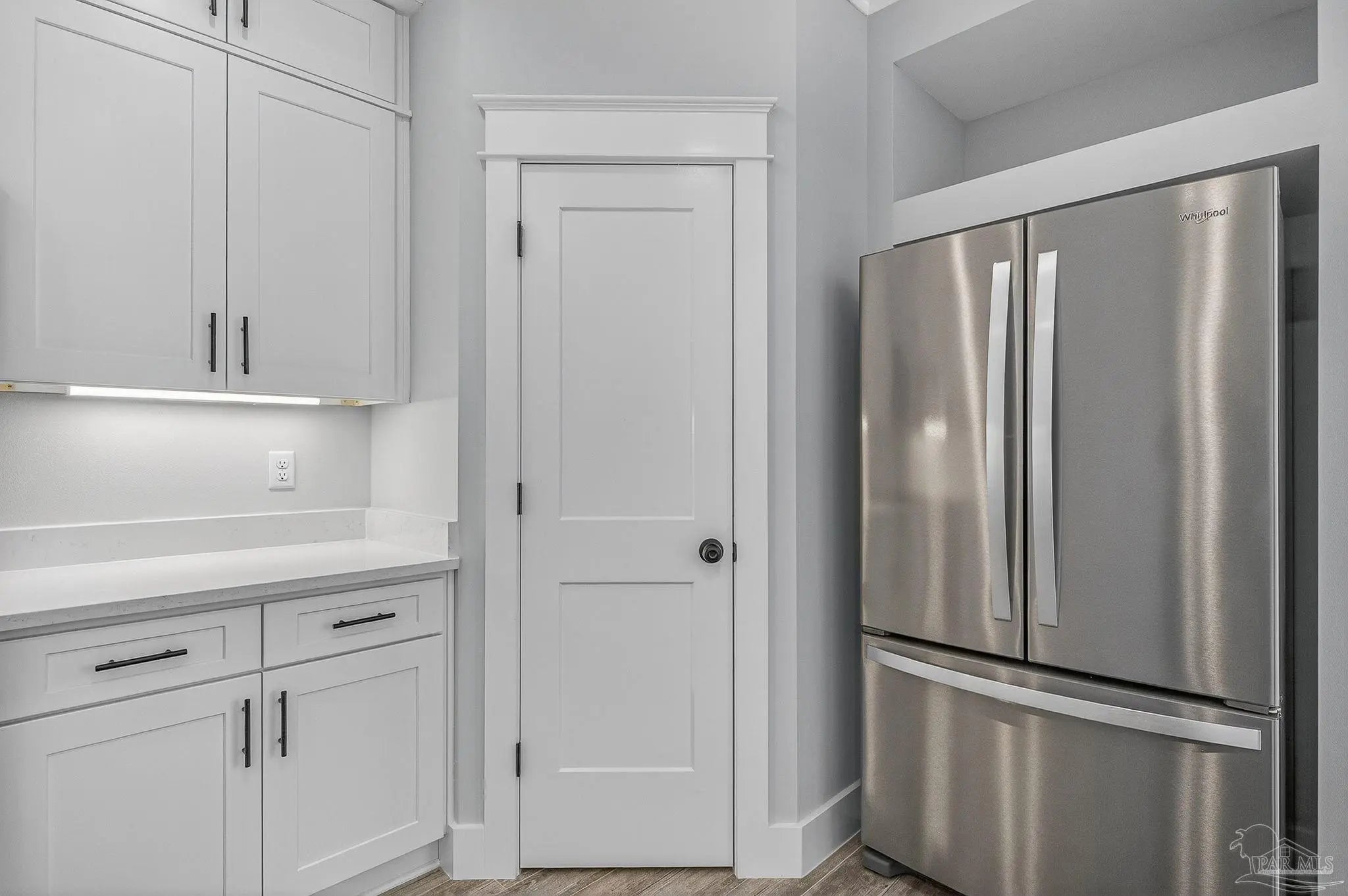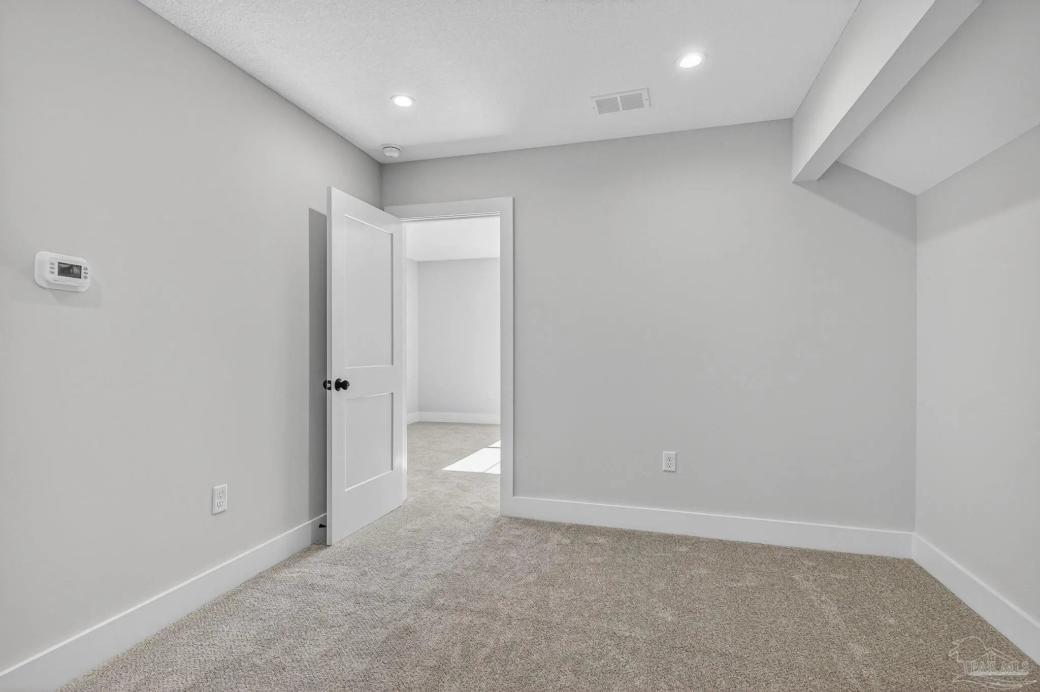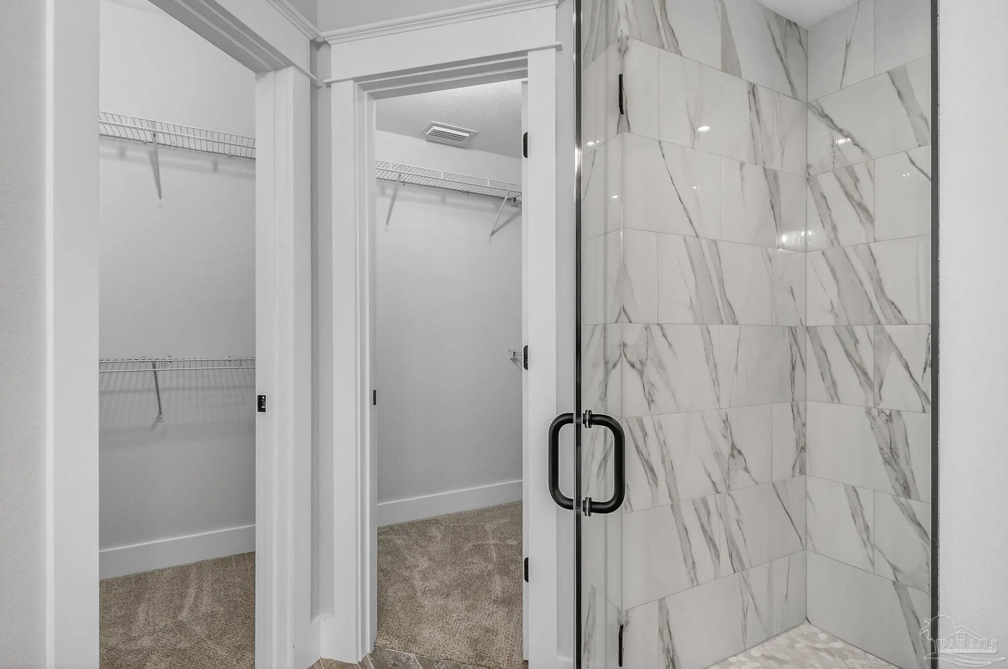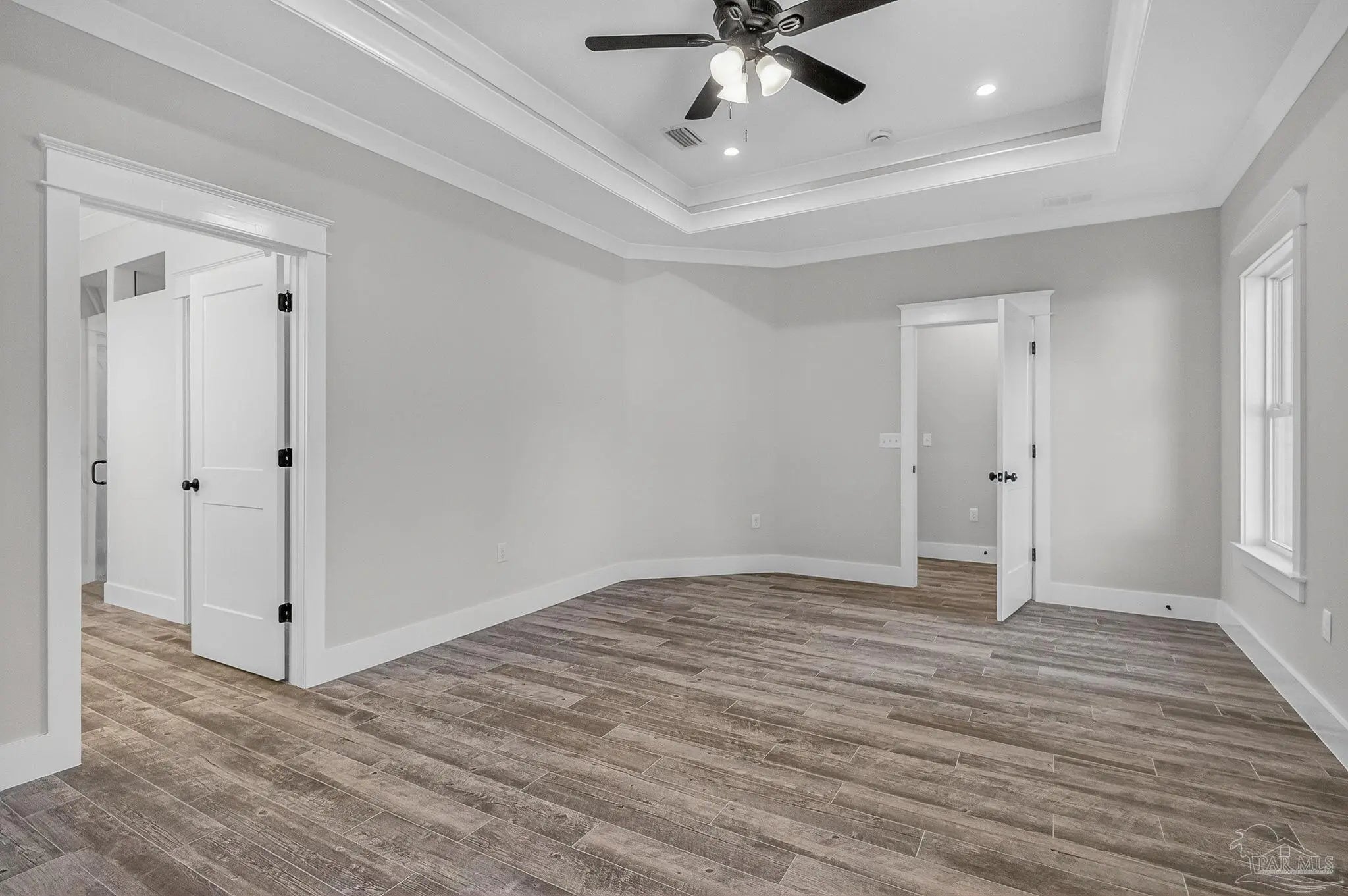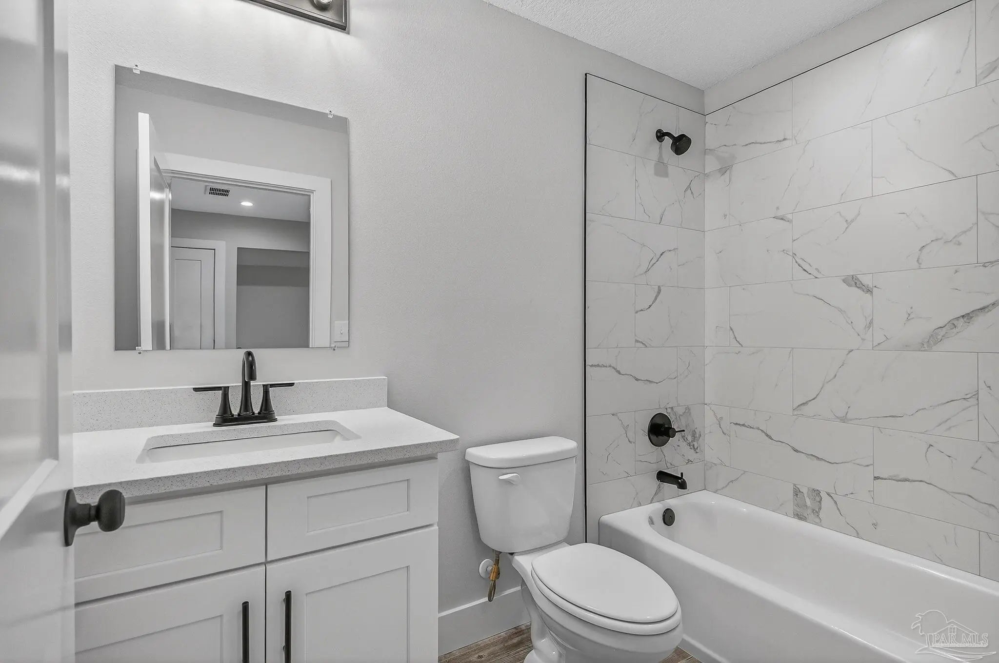 This newly built home is conveniently situated just minutes from local shopping and dining options, including a grocery store, bakery, bistro, and more. It offers a charming coastal vibe and is only a short drive to downtown Pensacola and Pensacola Beach. The inviting paver driveway leads up to the house and the side-entry two-car garage. Under the covered front porch, you'll find the main entrance, which welcomes you with plenty of natural light and high ceilings. The open concept living room and kitchen are on the main floor, along with the primary suite, a full guest bathroom with a tile wall shower, a guest bedroom, and a laundry room. The kitchen features modern white cabinets, quartz countertops, a stainless steel gas range, refrigerator, dishwasher, and a full pantry with built-in shelves. Both the kitchen and living room have wood-look tile plank flooring. The primary suite offers a spacious bedroom with a tray ceiling and soft ambient lighting, tile flooring, and peaceful views of the lush backyard trees. The primary bathroom includes a double vanity with quartz countertops, a relaxing free-standing tub, and a beautiful tile shower with a frameless glass door. It also provides two closets for plenty of storage. Upstairs, there's a full bathroom with a tile wall shower, two additional bedrooms, and a versatile bonus room with a linen closet. The South-facing upstairs bedroom has a partial water view of the Bay. The roof and exterior walls feature upgraded insulation. Out back, you'll find a privacy fence, an open patio, and vibrant landscaping that offers both sound dampening and privacy. Additional features include impact-resistant windows and front door, a tankless gas water heater, and yard sprinkler system. Schedule a showing to see this home today!