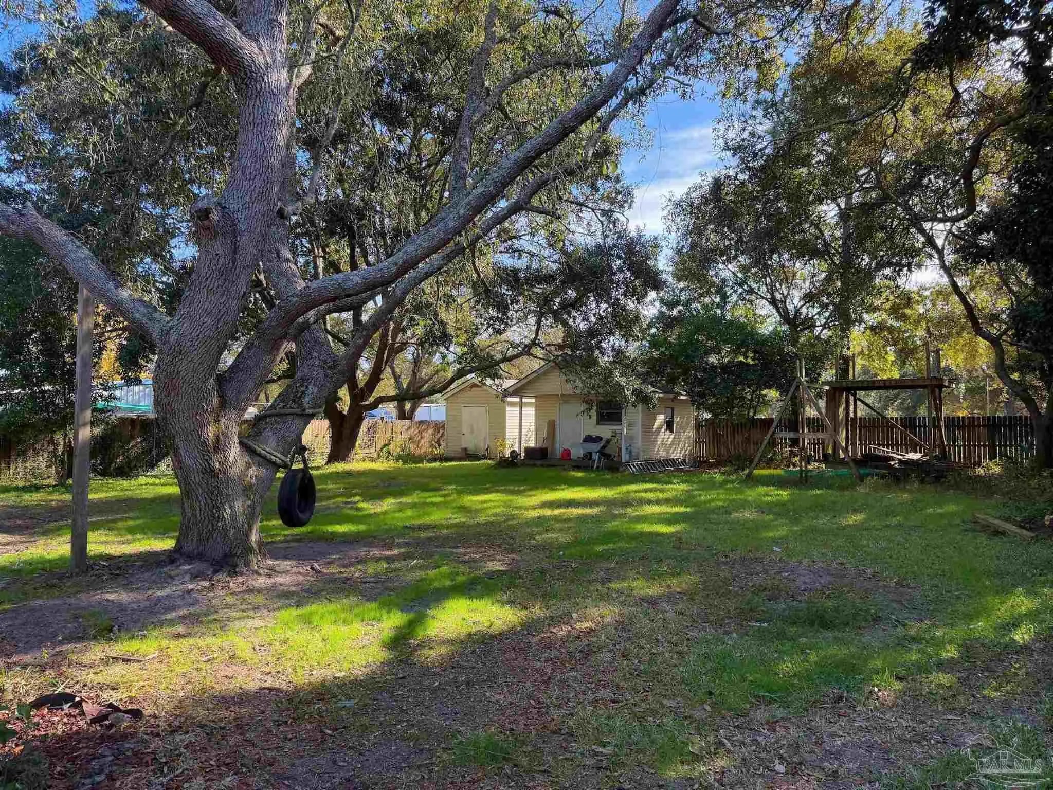 This well-maintained 3-bedroom, 2-bath home in Navarre has no HOA and is located in flood zone X. It features 1,714 sqft of tiled living space and a split-bedroom floor plan that offers privacy and flexible living. The updated kitchen includes granite countertops, black stainless appliances, a farmhouse sink, a large island with storage, and a pantry. The family room features plant ledges and French doors leading to a fully privacy-fenced backyard. A separate dining room or home office with a barn door adds versatility. The primary suite includes two walk-in closets and a bath with a garden tub. Bathrooms feature updated fixtures, with a new vanity in the second bath. Updates include a newer roof (2022) and HVAC (2022). Convenient access to bases and beaches.