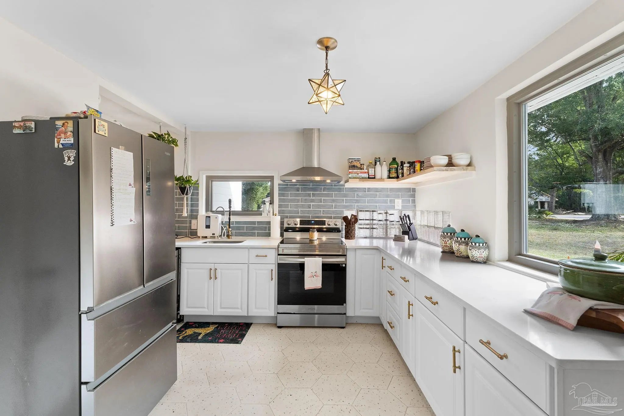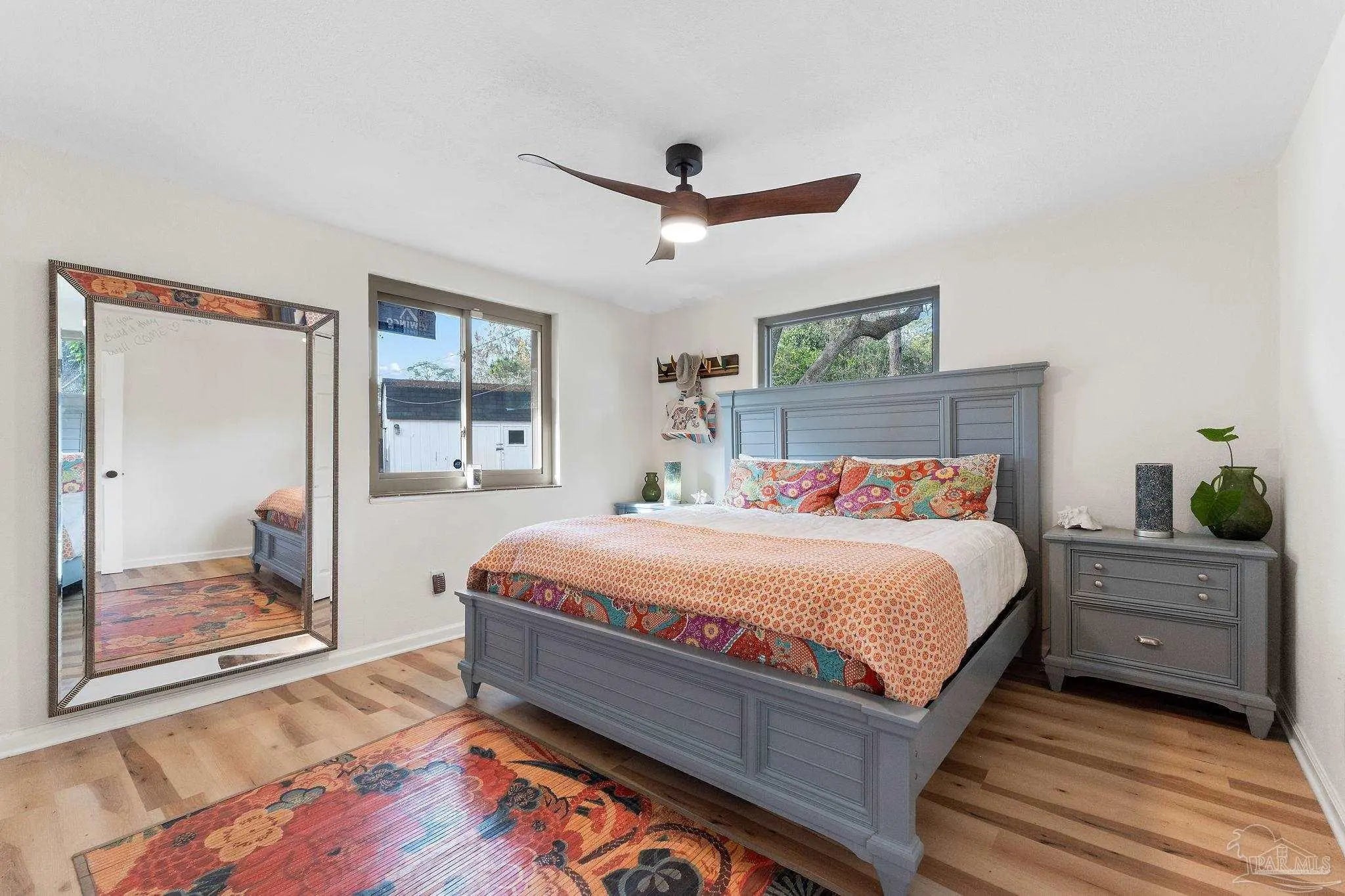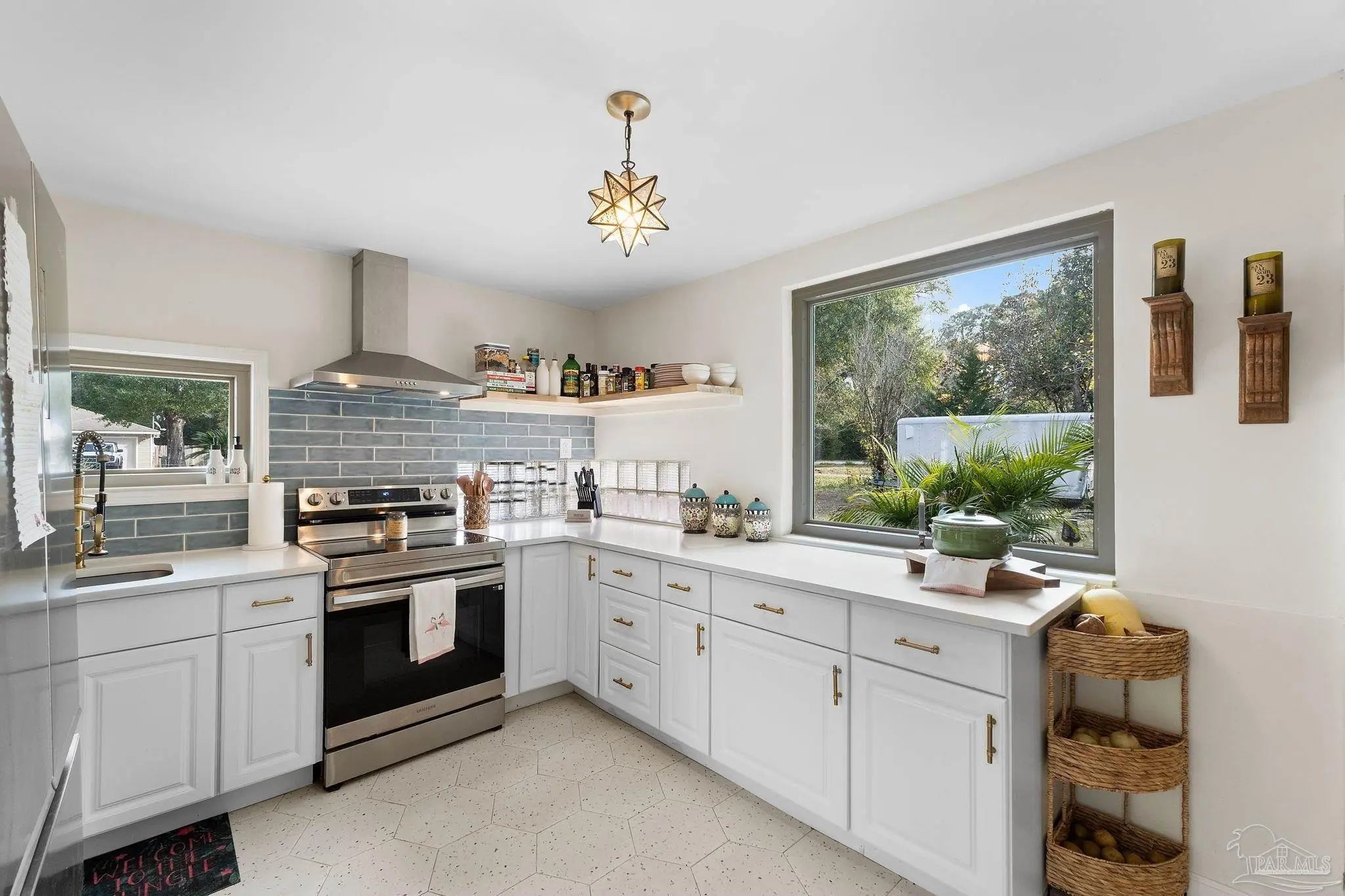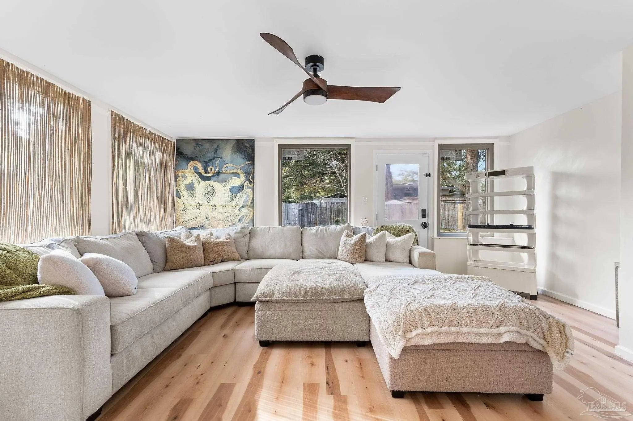 Discover modern charm and timeless design at 415 BREMEN AVE, a beautifully updated contemporary home with a distinctive Frank Lloyd Wright–inspired feel, situated on a spacious 100 X 140 DOUBLE CORNER LOT in the heart of Beach Haven. This exceptional property has been thoughtfully updated with a NEW ROOF, BRAND NEW IMPACT WINDOWS (INSTALLED THIS SUMMER), BRAND NEW WHOLE HOUSE GENERATOR, HVAC SYSTEM, KITCHEN, AND BATHROOMS, and CERAMIC TILE FLOORING IN THE KITCHEN AND BATHROOMS, offering both peace of mind and stylish living. Step inside to a warm and inviting interior featuring a WOOD-BURNING FIREPLACE, tall ceilings in the formal living and dining areas, and a bright, open LARGE DEN WITH AN ADJACENT ENCLOSED FLORIDA ROOM—ideal for everyday living or entertaining. The EXTRA-LARGE BEDROOMS provide comfortable private retreats for family and guests alike. Outdoors, the FULLY FENCED BACKYARD offers endless possibilities, with ample space to create a pool, outdoor entertaining area, or lush garden oasis. The generous DOUBLE LOT PROVIDES AMPLE SPACE FOR STORING OUTDOOR TOYS INCLUDING BOATS AND JET SKIS, a rare find in this area. Enjoy easy access to the water with BOAT RAMPS JUST A THREE-MINUTE DRIVE AWAY, and take in a truly unique local experience as you WATCH THE BLUE ANGELS FLY OVER AND PRACTICE from the comfort of your own property. Ideally located just minutes from PERDIDO KEY BEACHES, SHOPPING, AND DINING, this home perfectly blends contemporary updates with classic architectural appeal. A rare opportunity to own a move-in-ready home on a generous lot in a highly desirable location.
