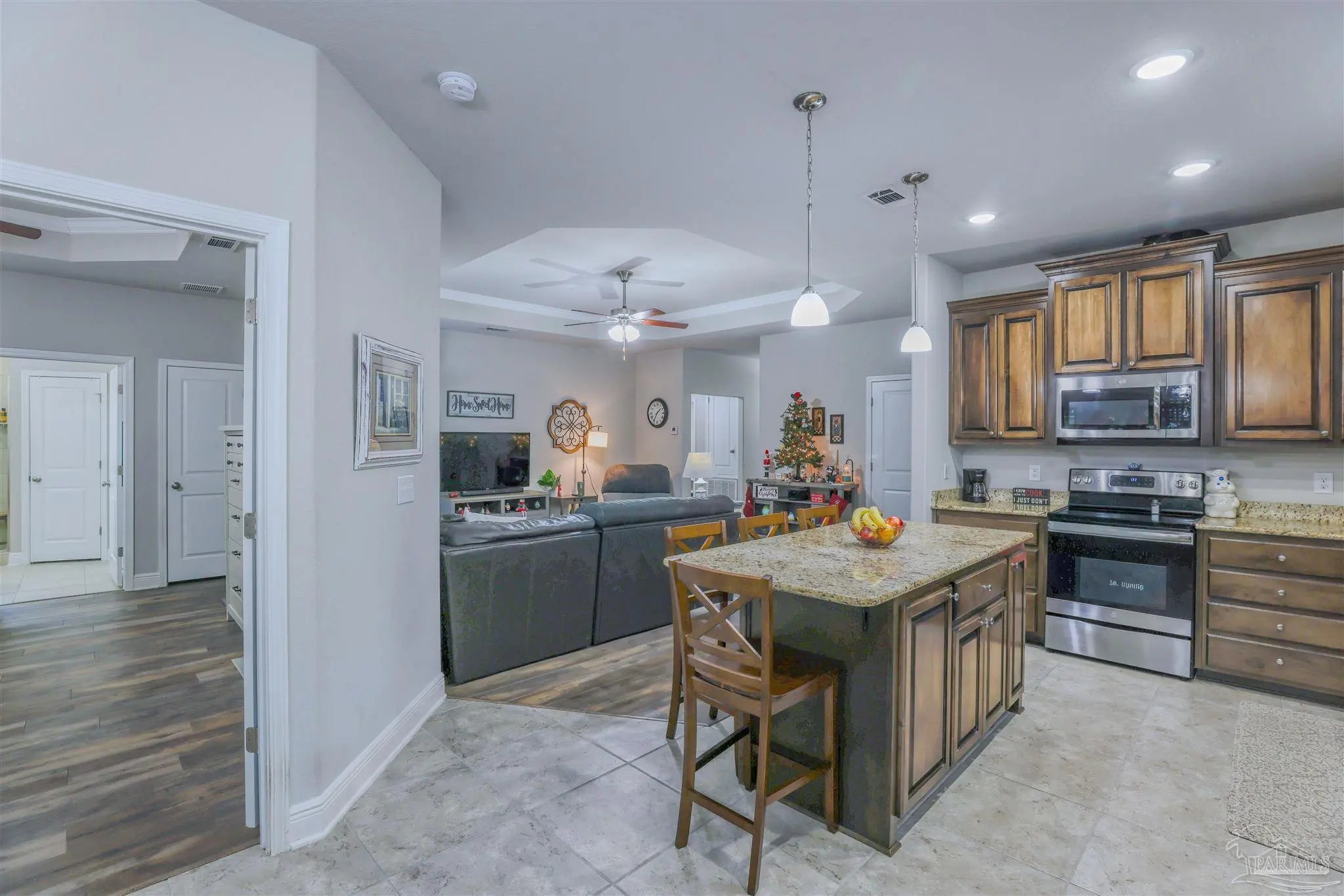 Here is your completely MOVE-IN READY home that has everything you have been looking for! As you enter the FOYER you instantly see the beautiful LVP FLOORING throughout! The right side of the home keeps the 2 additional BEDROOMS and the FULL BATHROOM tucked in a hallway for both ease of access and privacy. The FAMILY ROOM is spacious with both tall ceilings and the tray ceiling for that special touch! It is connected to the KITCHEN and provides plenty of room for entertaining with the GRANITE COUNTER TOP ISLAND. The stainless steel appliances give the space a luxury feel and invite you to come stir up some good vittles. Even the DINING AREA is open to the kitchen and adds plenty of seating for family and guests. The MASTER BEDROOM AND BATH are tucked off the back of the house for privacy and provides a nice view to the back yard. The MASTER BATHROOM has been improved with a very large WALK IN SHOWER and EXTRA CLOSET SPACE. The BACK PORCH is SCREENED for year around enjoyment to keep you both shaded and free from the mosquitoes and flying bugs. It has extra durable screen that is very low maintenance. The back yard is PRIVACY FENCED for your little ones and special critters. Behind the back fence is a GREEN BELT for the community and this gives you PRIVACY AND NATURE!! Schedule your showing quickly!