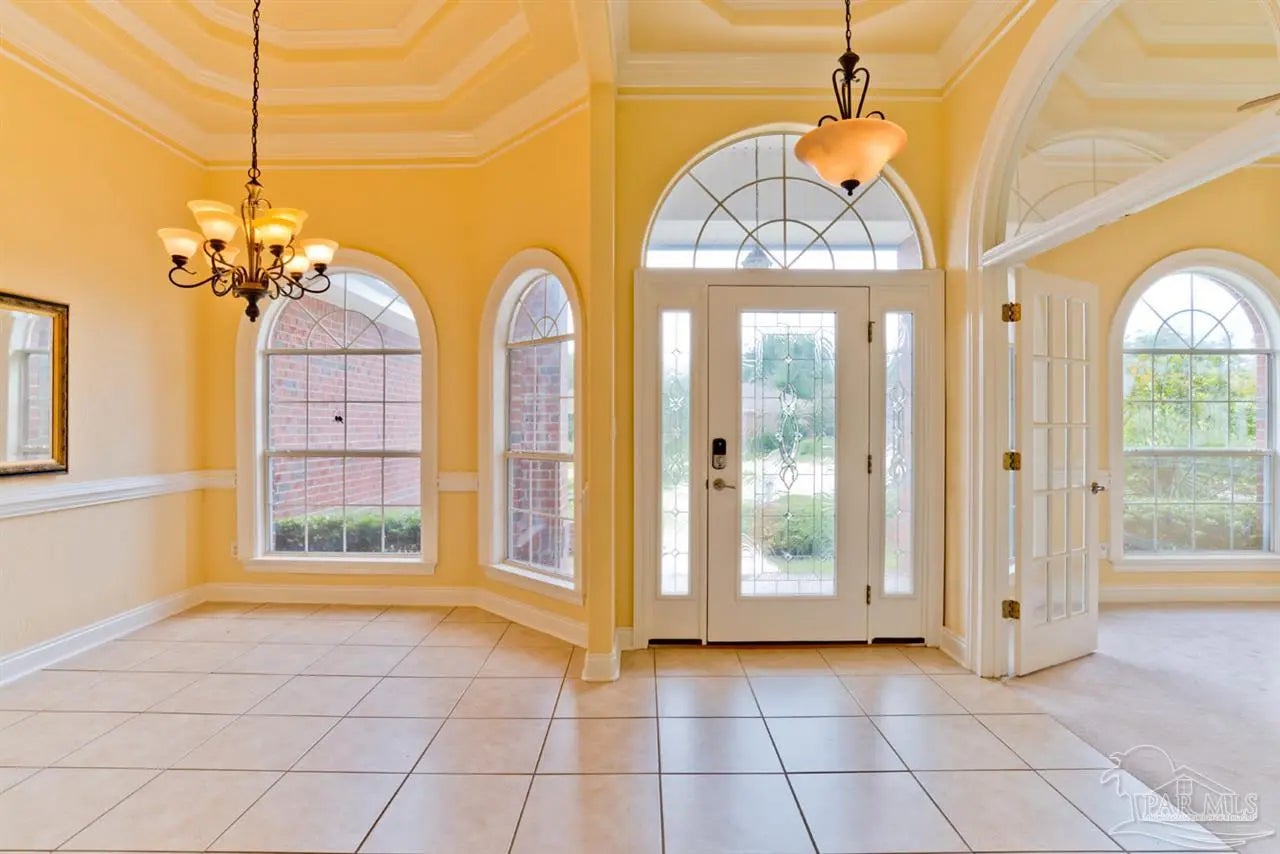Cozy home located in the serene gated Island community of Russell Bayou, with a community pool and tennis court. This brick exterior split/open floorplan home on a quiet cul-de-sac stands out within the desirable Hellen Caro Elementary School district. The open living area features high ceilings, arched windows, (bringing in lots of natural light), a gas fireplace with wood mantle, chair rail in the dining area (double trey ceiling), office with French doors, accordion doors into the sun room, and custom finishes/millwork throughout. The kitchen includes granite countertops, stainless appliances (gas range/wall ovens), and nook (chair rail). Master suite is an oasis with a double trey ceiling, exterior doors to backyard patio, two walk-in closets, separate vanities, oversized tiled shower and whirlpool tub. Across the home are the other bedrooms (walk-in closets) with a Jack n' Jill bath finished with granite counters, separate vanities, and a tiled tub/shower. The large fenced backyard (plenty of room for a pool) even has a private outdoor shower. This location (surrounded by boating waters and mature trees) is just minutes to the white sand beaches of Perdido Key, close to restaurants, boat launch, parks, medical clinics, and 30 minutes to downtown Pensacola. Interior painted (white) in 2023 with new carpet. New roof in 2021, HVAC unit in 2017. Walk and bike on island. Accessible to Intracoastal waterway for fishing and kayaking/canoeing and boating.