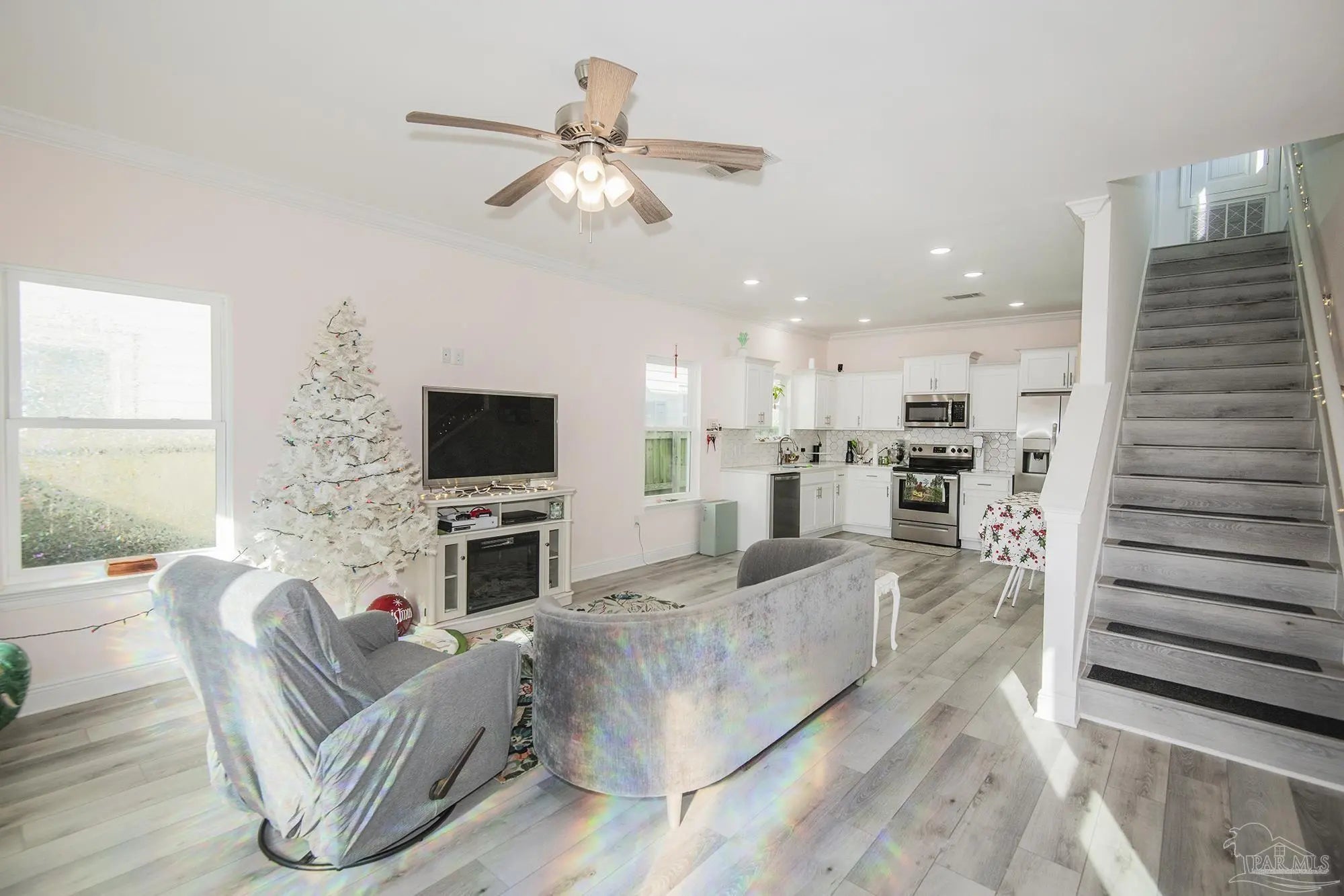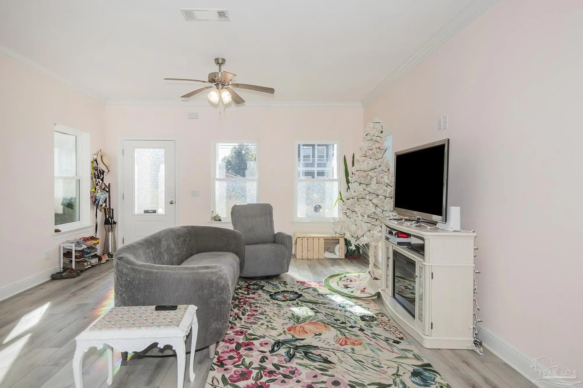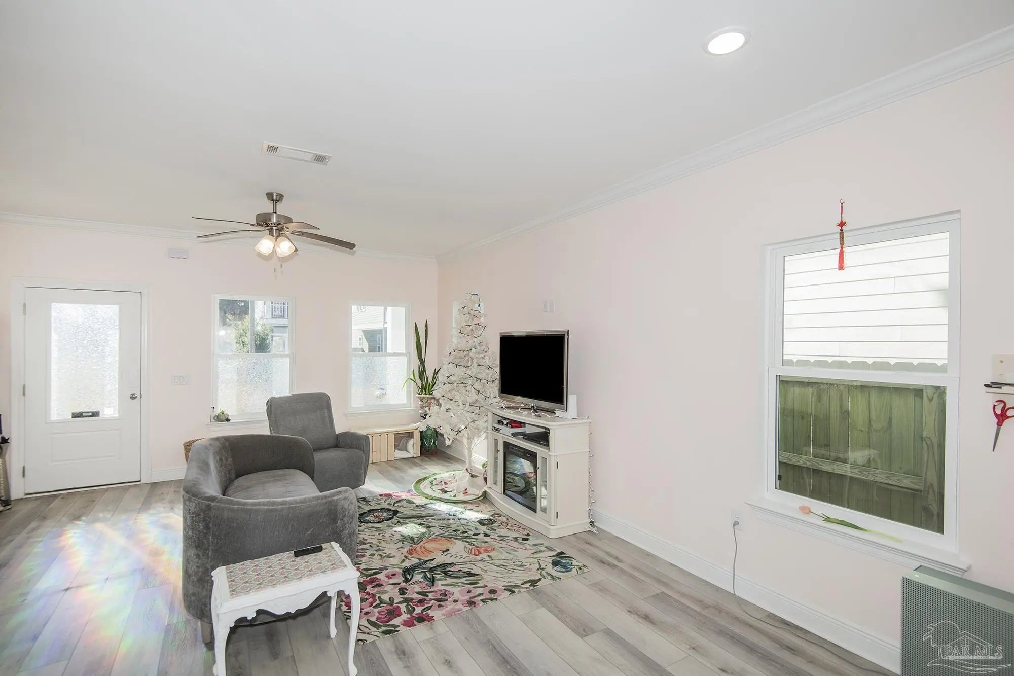A bright and cozy modern retreat you will love calling home right in Pensacola’s beloved downtown! With construction completed in 2020, this 3-bed, 3-bath, one-owner home has been very well maintained and is just blocks from the beautiful new Bruce Beach and Maritime Park, as well as Ever’man Co-op Grocery and Palafox Street! Stroll downtown to enjoy the local restaurant scene, art, and culture, or relax at home on one of your four covered porches- each about 16’ long- two on the front of the house and two on the back. This home has the enviable feature of that additional 4th balcony off the rear upstairs bedroom, something that was omitted on most of the other new-builds in the area. When you enter this home, you’ll notice the gorgeous natural light let in by the large windows and feel right at home as you step in to your own personal sanctuary. The open-concept kitchen has quartz countertops,all Fridgadire appliances to include a smooth-top stove/oven, side-by-side fridge, built-in stainless-steel microwave, and a dispose-all. The downstairs bedroom could easily be used as an office if desired, and both the primary bedroom along with the 3rd additional bedroom are upstairs, each with their own private balconies and bathrooms. There are 3 full bathrooms in total, featuring quartz and granite countertops, a tiled shower in the primary, and tub/shower combos. The washer and convey "As Is".There is a lovely, shaded backyard with a privacy fence and the home has a current bond through Rocky’s Pest Control. There is absolutely no heavy lifting to do here besides your moving boxes- you can simply move in and relax- you’re home now!