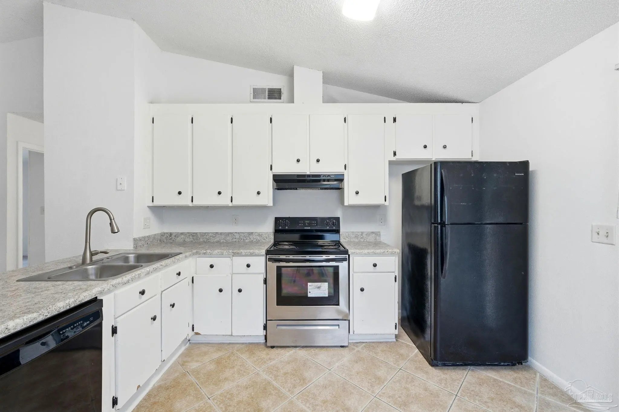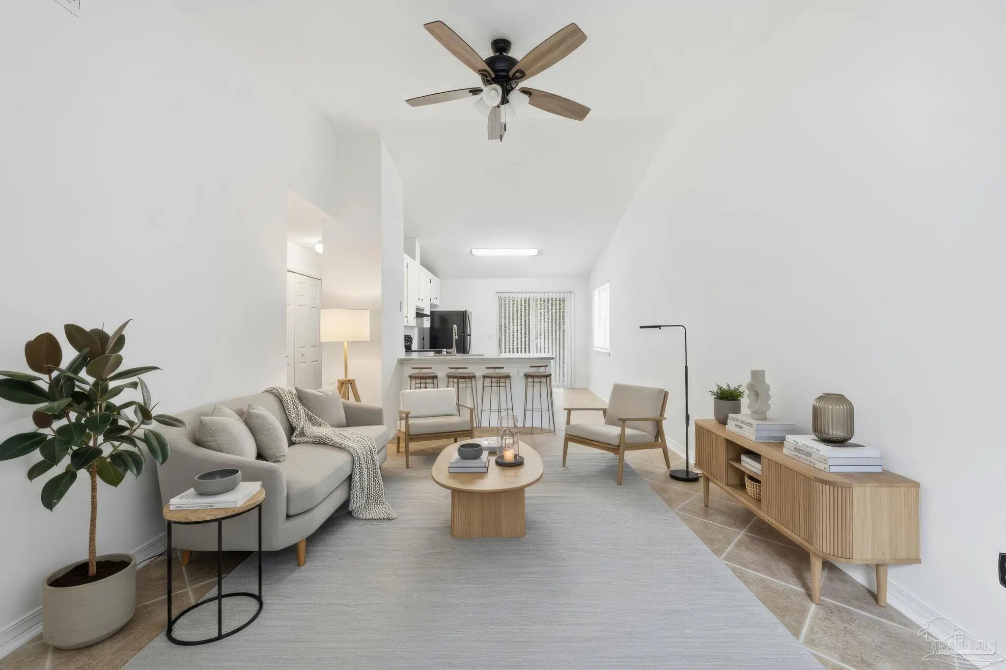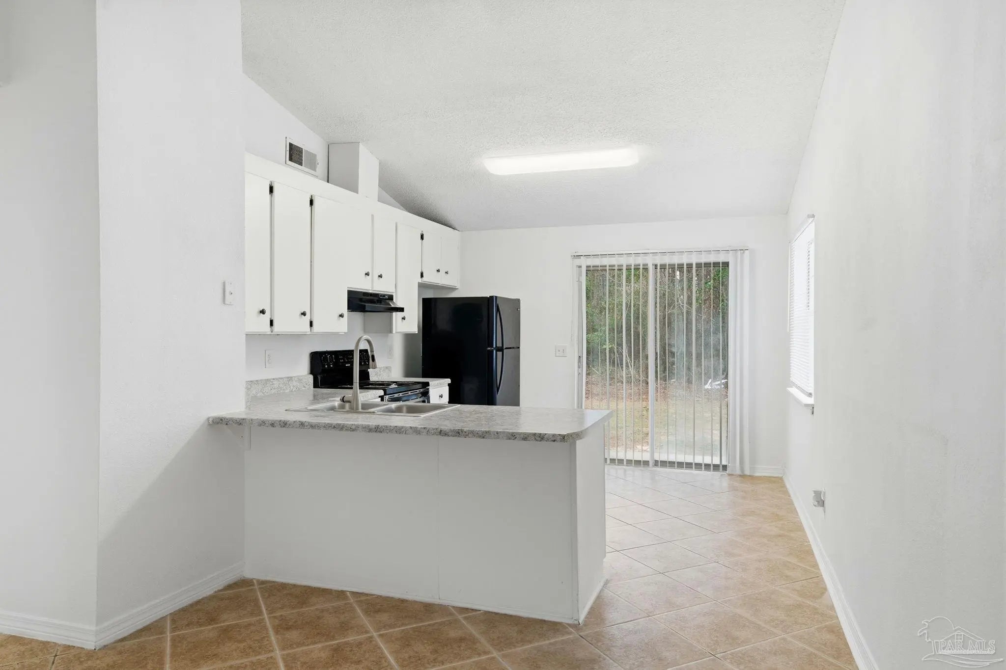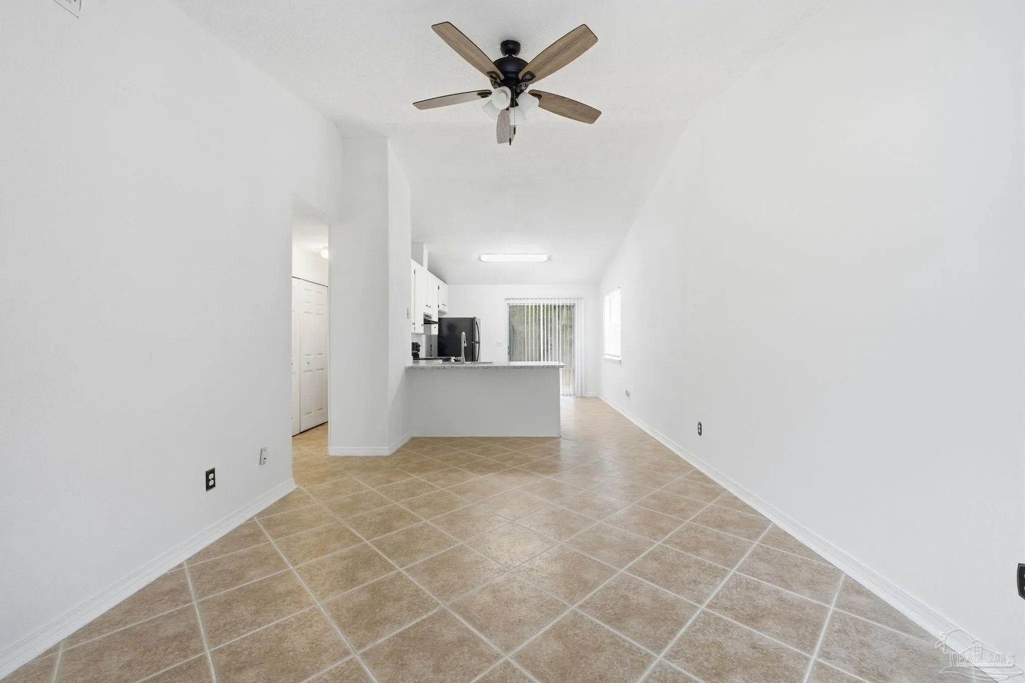 This charming 2-bedroom, 1-bath home is move-in ready and thoughtfully updated throughout. The welcoming entry opens into a spacious family room featuring a high vaulted ceiling and a modern ceiling fan that adds both style and comfort. This open space flows seamlessly into the kitchen and dining area, creating an inviting layout ideal for everyday living. The kitchen offers a breakfast bar, crisp white cabinetry, and a coordinated mix of black and stainless-steel appliances, including a range/oven, dishwasher, and refrigerator. The two bedrooms are located in the hall. Between them is the full bathroom featuring a newer vanity with a granite countertop, a comfort-height toilet, and a tub with a shower surround insert. A utility room and linen closet are also conveniently located in the hallway. Durable 16-inch tile flooring runs through the family room, kitchen, dining area, hallway, and bath, while both bedrooms feature newer, soft carpet for added comfort. Recent upgrades include a 2021 roof, a 2023 HVAC system, and fresh interior and exterior paint. Situated on a deep 170-foot lot, the backyard provides generous outdoor space along with a covered back patio, offering a quiet place to relax or entertain. A great home, priced to sell, make plans to tour it today.