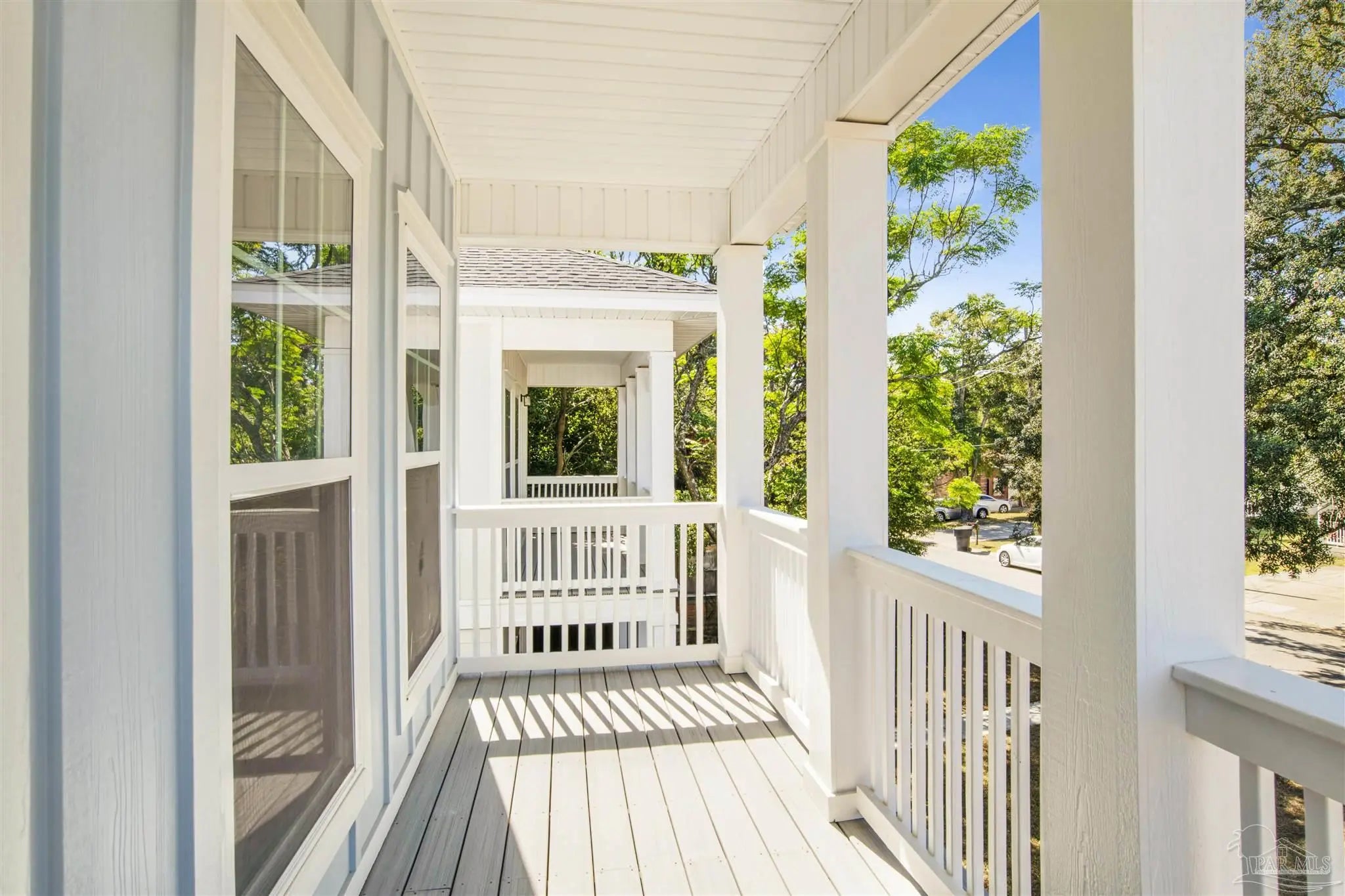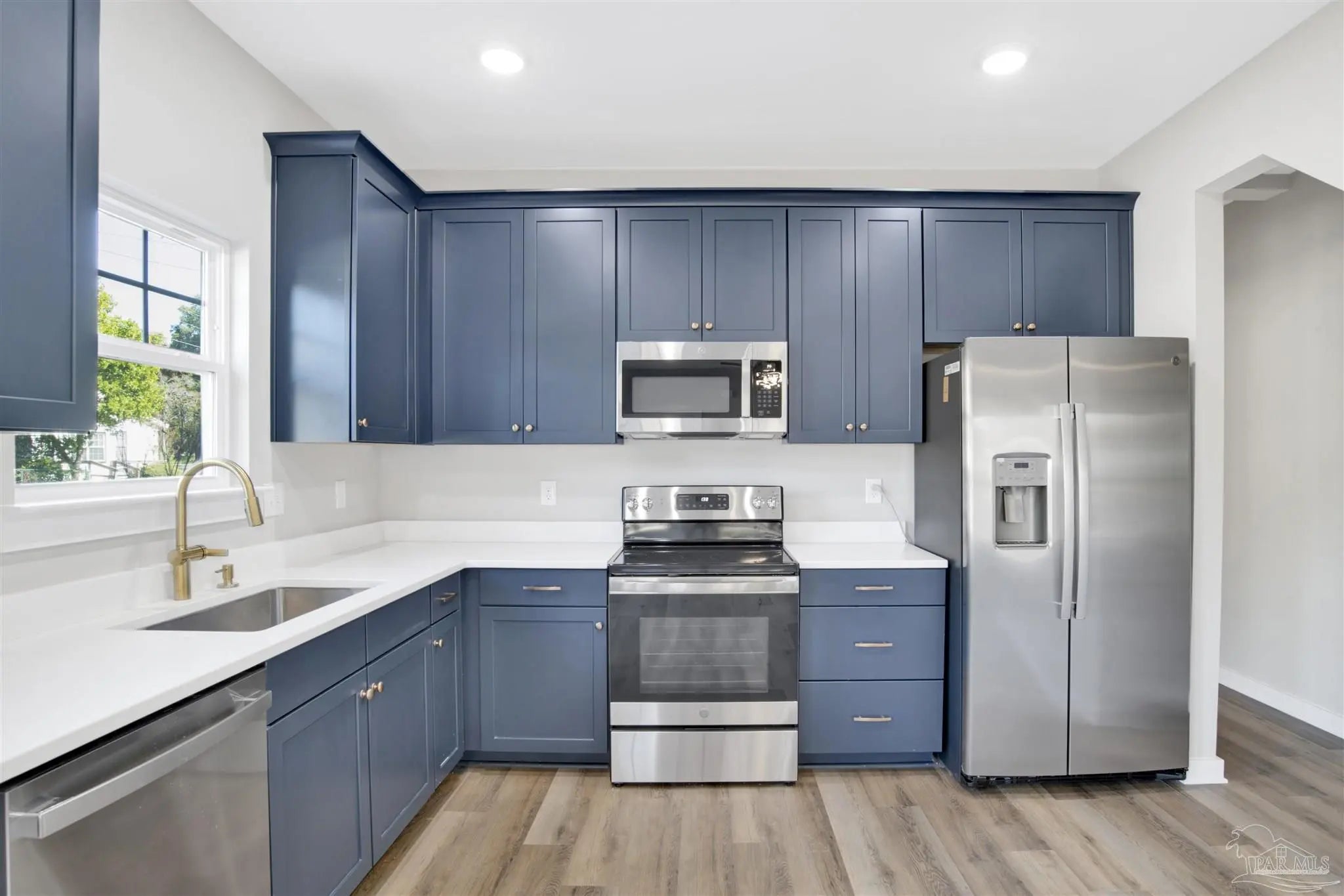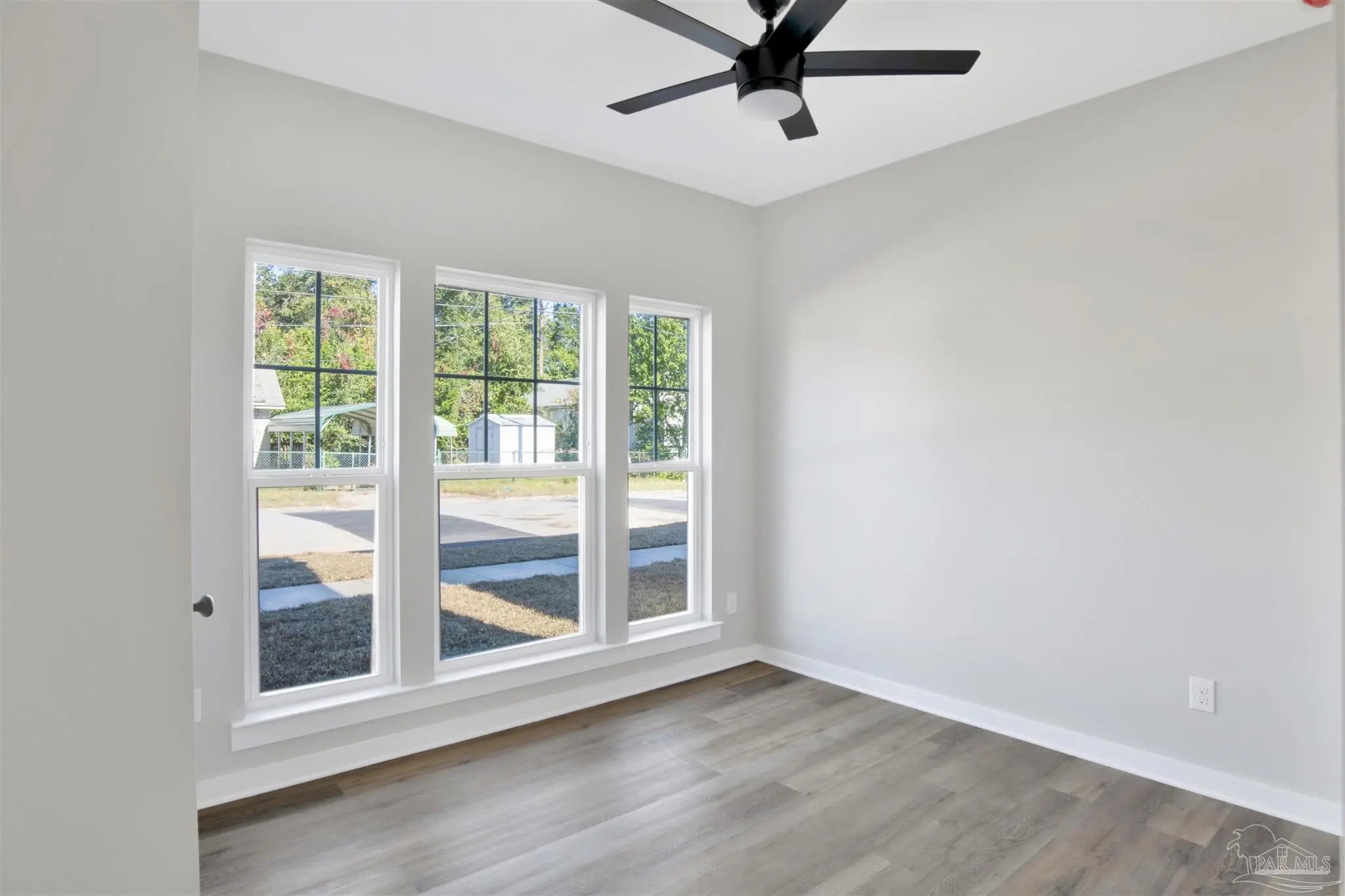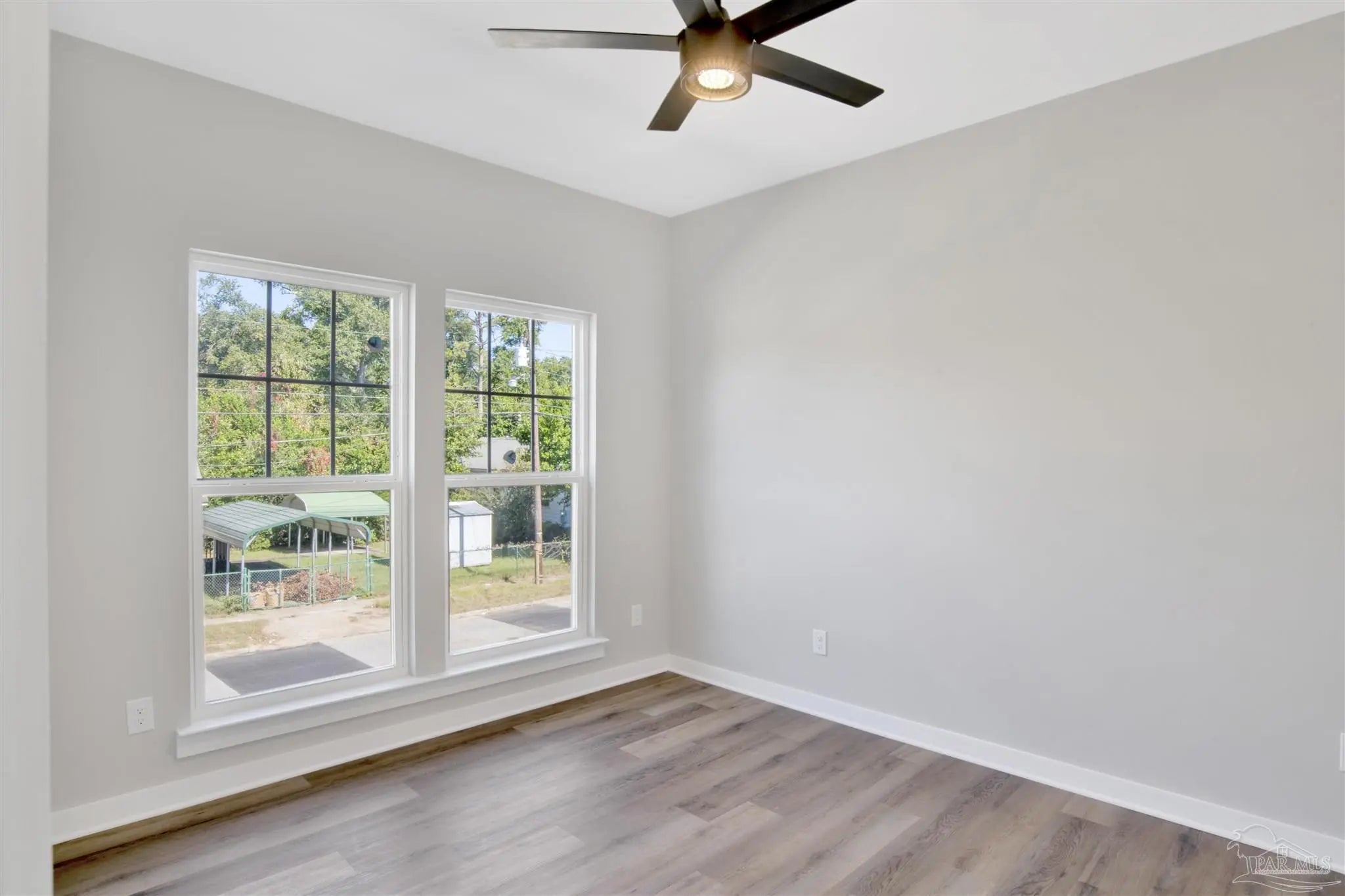 **Available now. This pet-friendly property features a small fenced yard with water and lawn maintenance included in the rent.** Constructed in 2023, this new build offers contemporary finishes throughout. The living areas are enhanced by luxury vinyl plank flooring, complemented by tiled bathroom floors. The master bathroom boasts a tiled shower with dual shower heads for an elevated experience. The kitchen features white quartz countertops, blue cabinetry, and modern brass fixtures. Designed with roommates in mind, the home comprises three bedrooms, each with its own private bath. Ideally located near downtown Pensacola and a short drive from Pensacola Beach, this residence combines modern luxury with convenience.