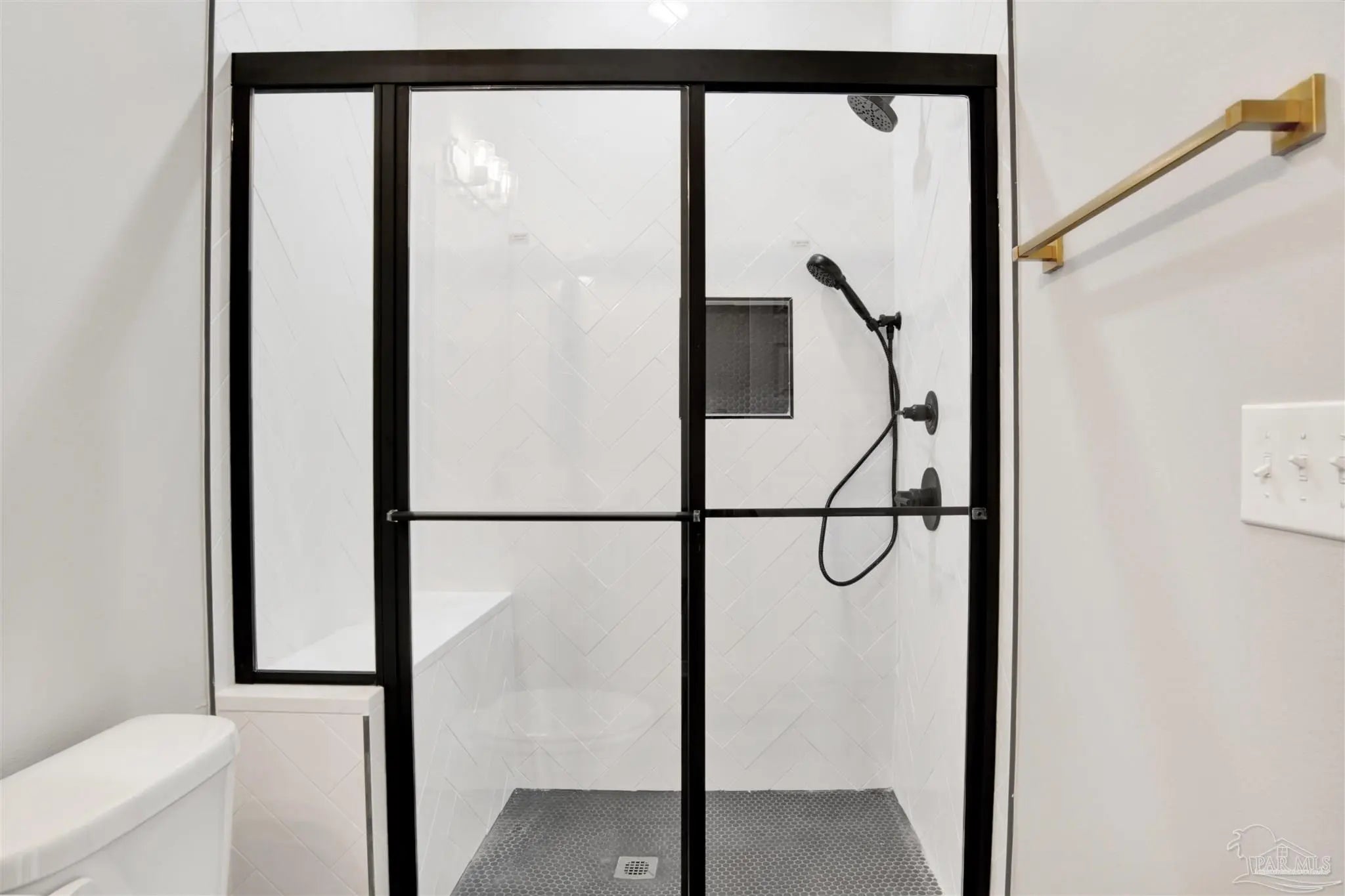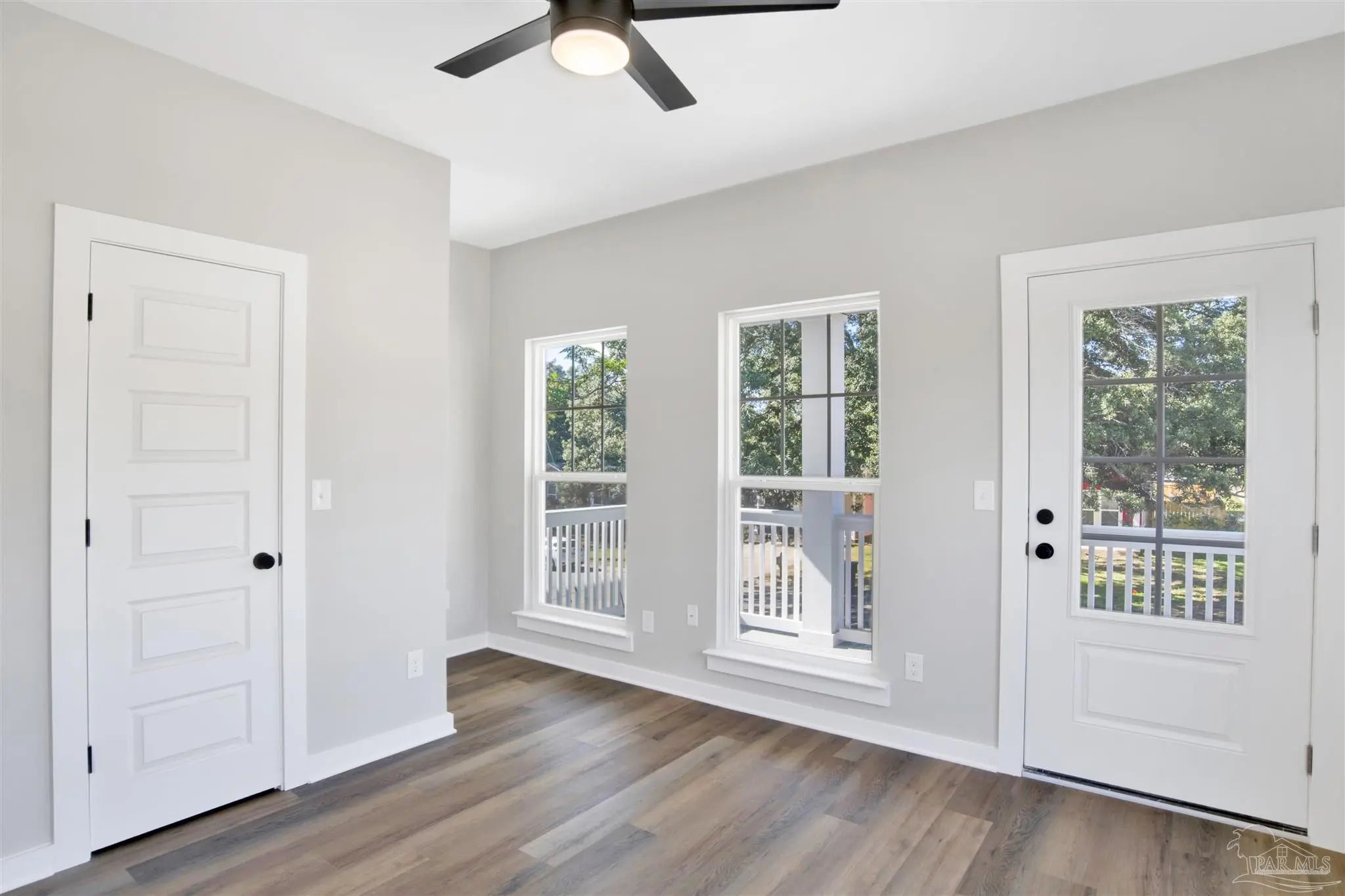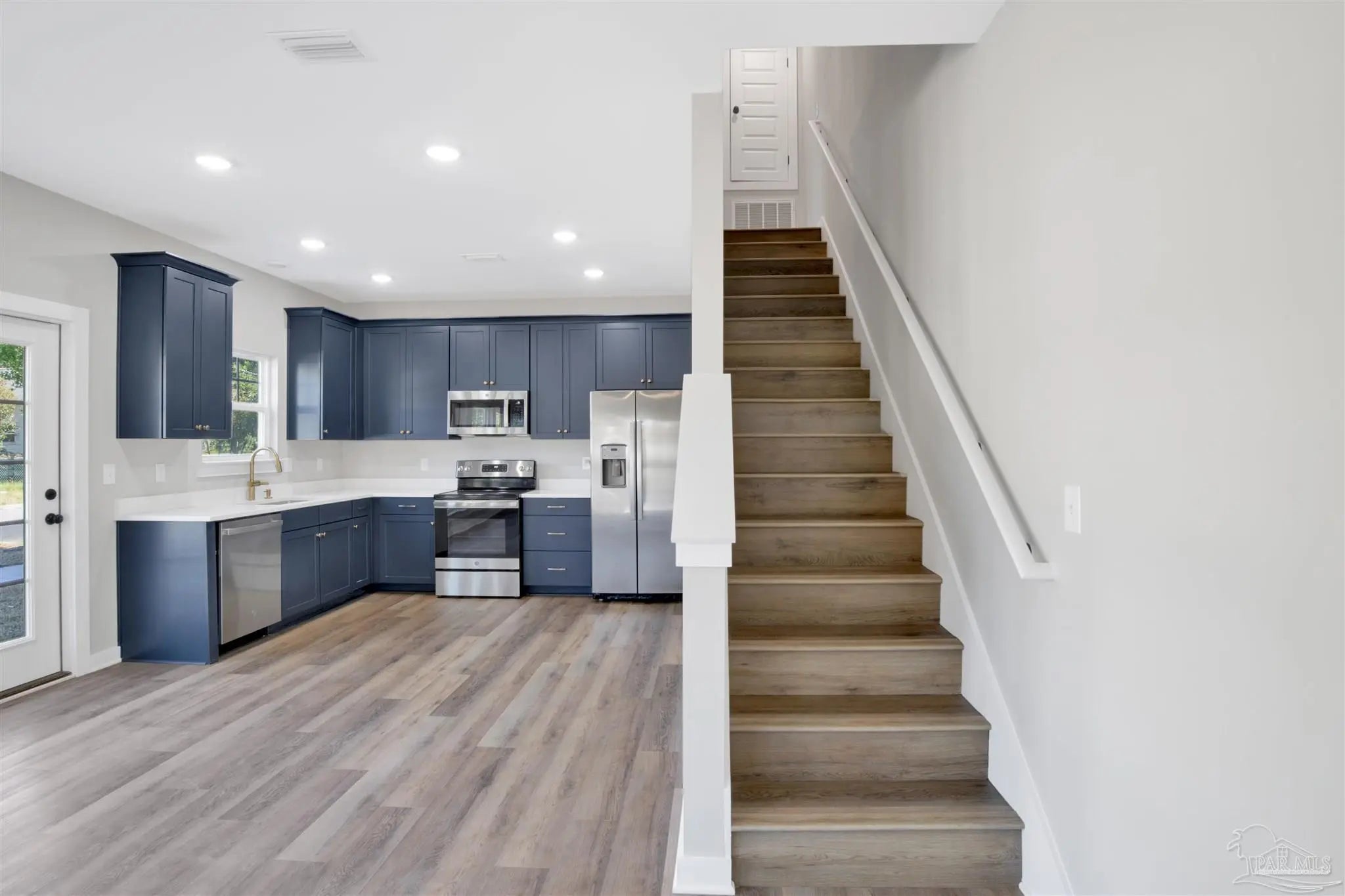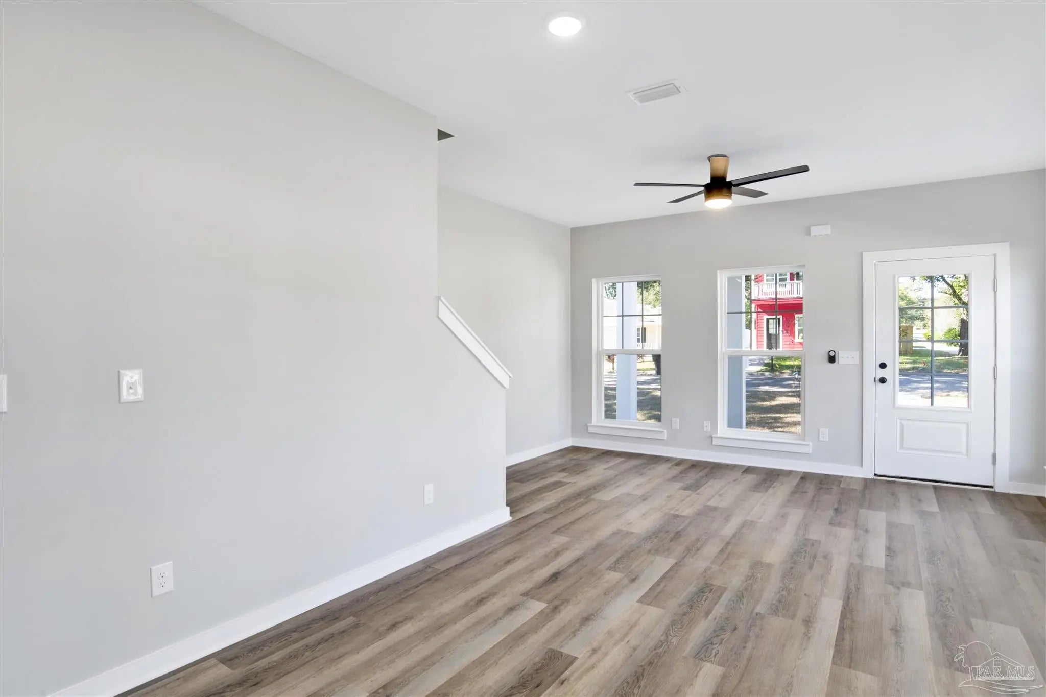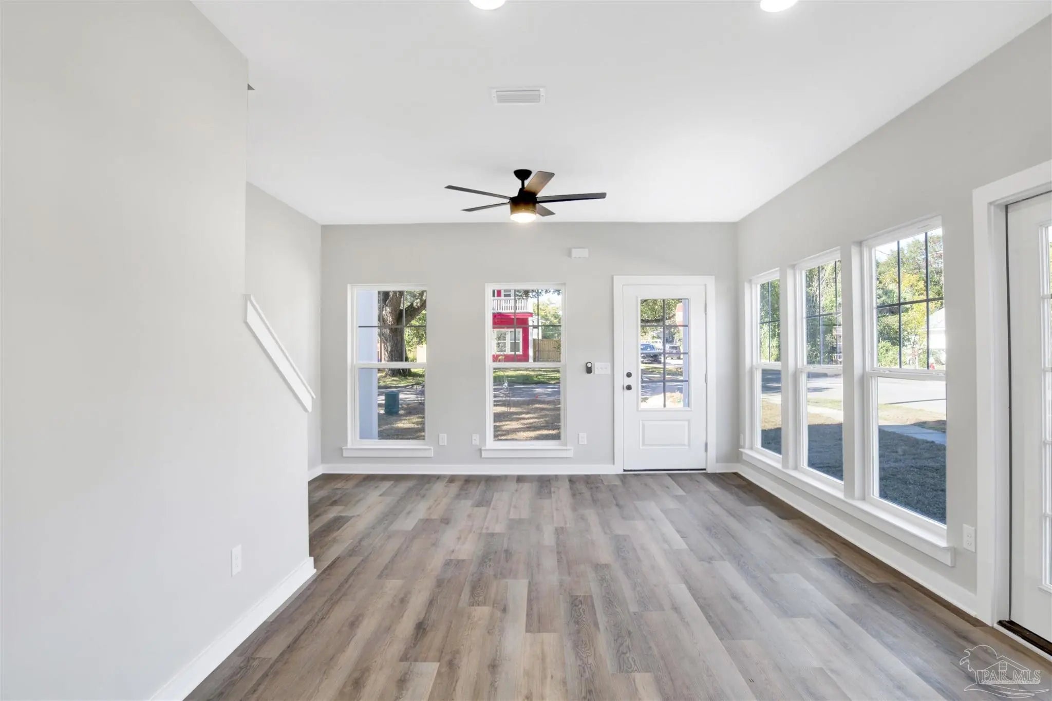 **Available now. This pet-friendly property features a small fenced yard with water and lawn maintenance included in the rent.** Constructed in 2023, this new build offers contemporary finishes throughout. The living areas are enhanced by luxury vinyl plank flooring, complemented by tiled bathroom floors. The master bathroom boasts a tiled shower with dual shower heads for an elevated experience. The kitchen features white quartz countertops, blue cabinetry, and modern brass fixtures. Designed with roommates in mind, the home comprises three bedrooms, each with its own private bath. Ideally located near downtown Pensacola and a short drive from Pensacola Beach, this residence combines modern luxury with convenience.