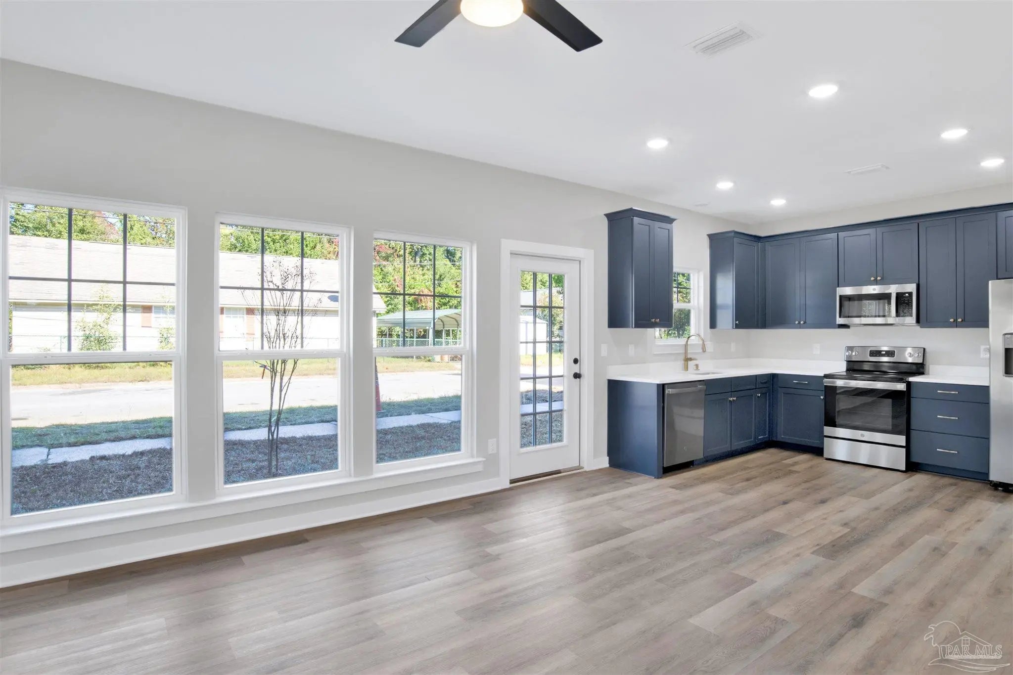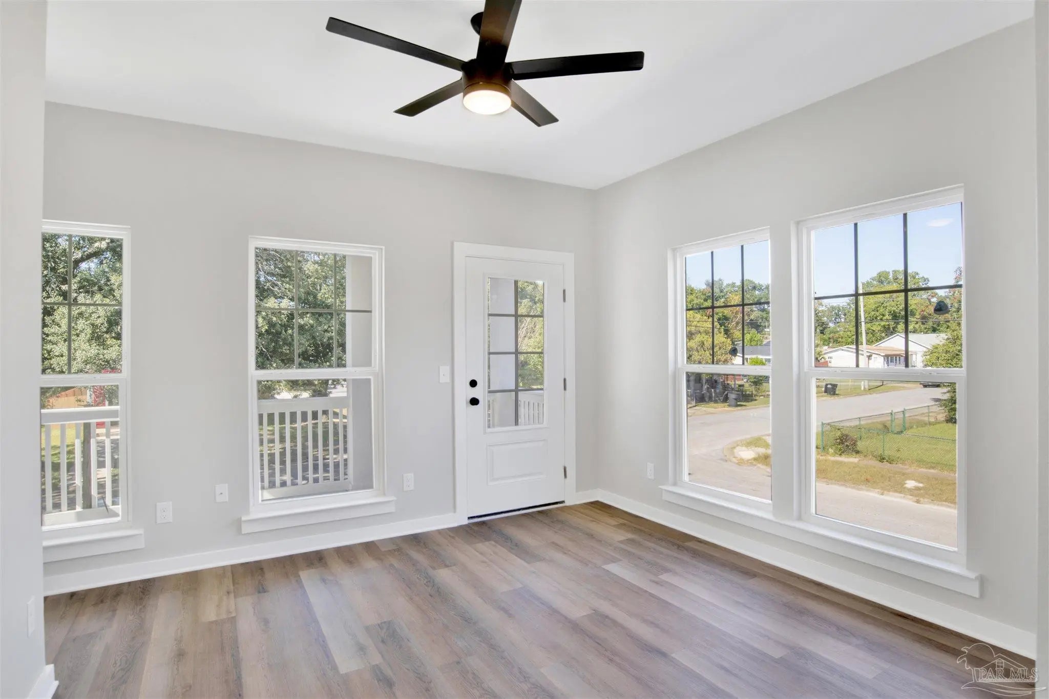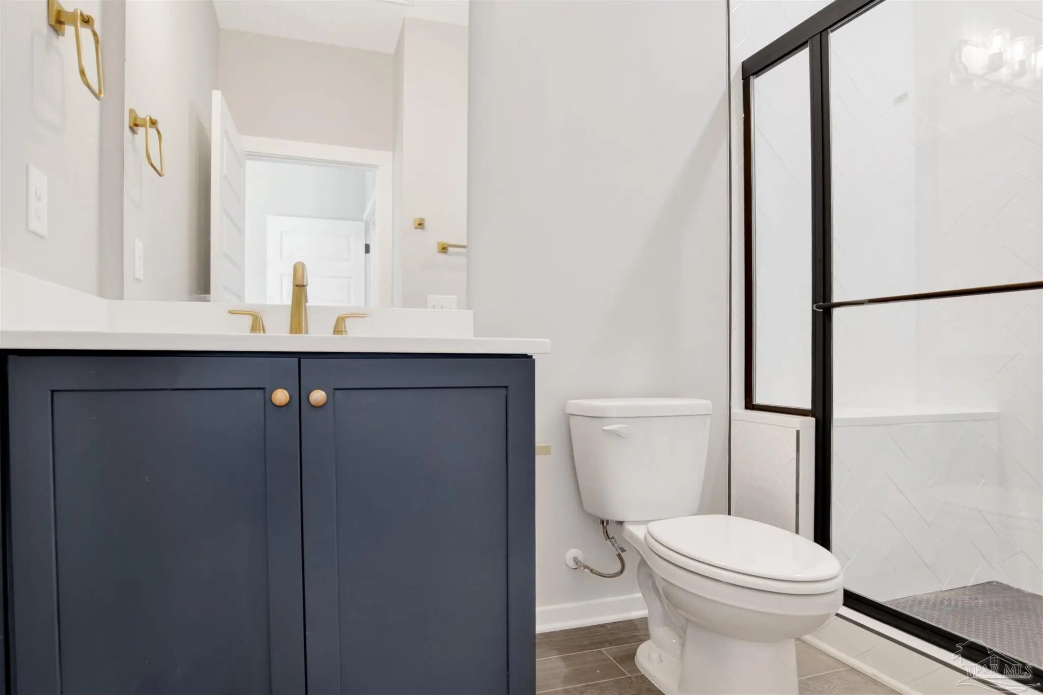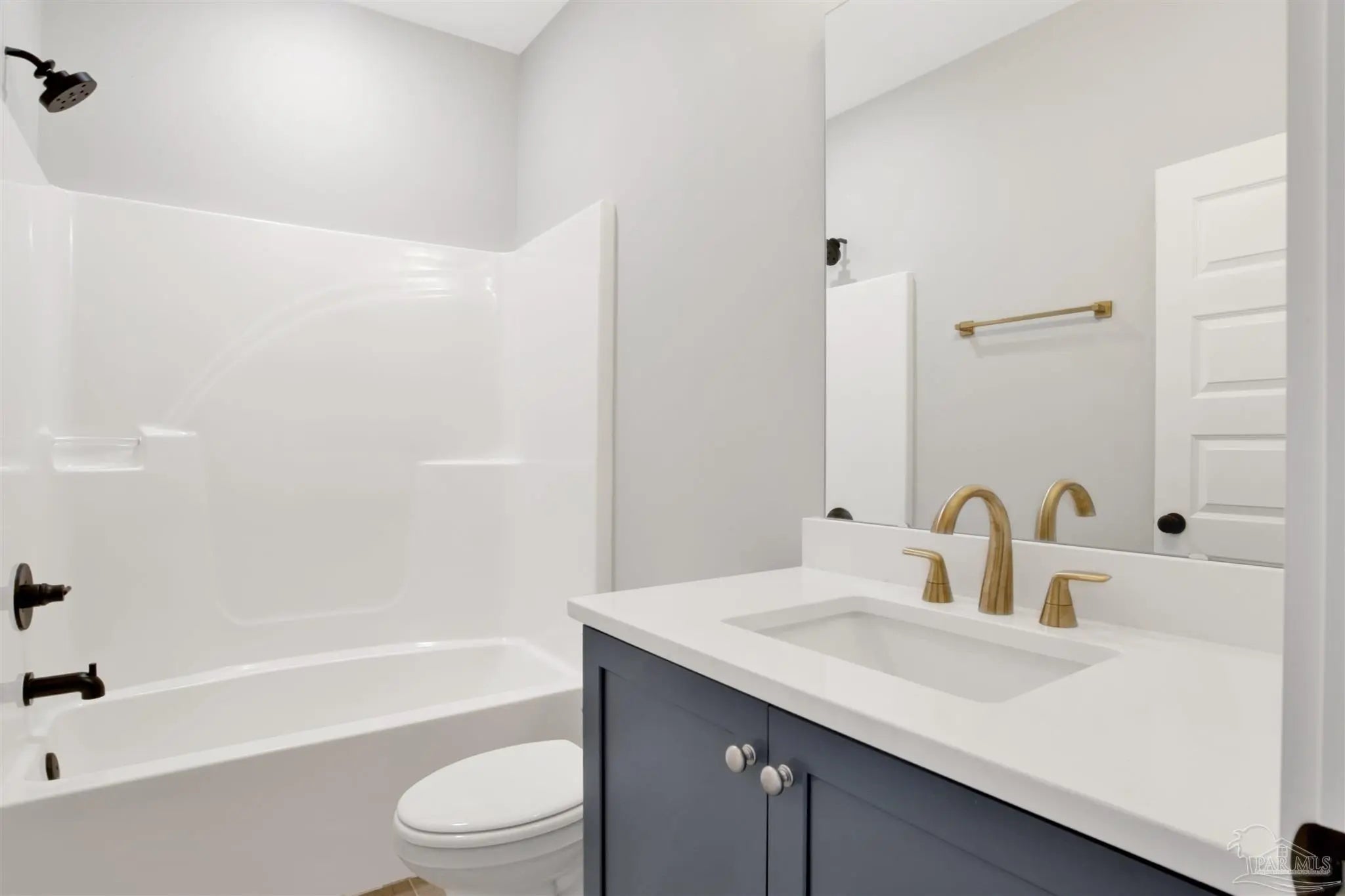 **Available now. This pet-friendly property features a small fenced yard with water and lawn maintenance included in the rent.** Constructed in 2023, this new build offers contemporary finishes throughout. The living areas are enhanced by luxury vinyl plank flooring, complemented by tiled bathroom floors. The master bathroom boasts a tiled shower with dual shower heads for an elevated experience. The kitchen features white quartz countertops, blue cabinetry, and modern brass fixtures. Designed with roommates in mind, the home comprises three bedrooms, each with its own private bath. Ideally located near downtown Pensacola and a short drive from Pensacola Beach, this residence combines modern luxury with convenience.