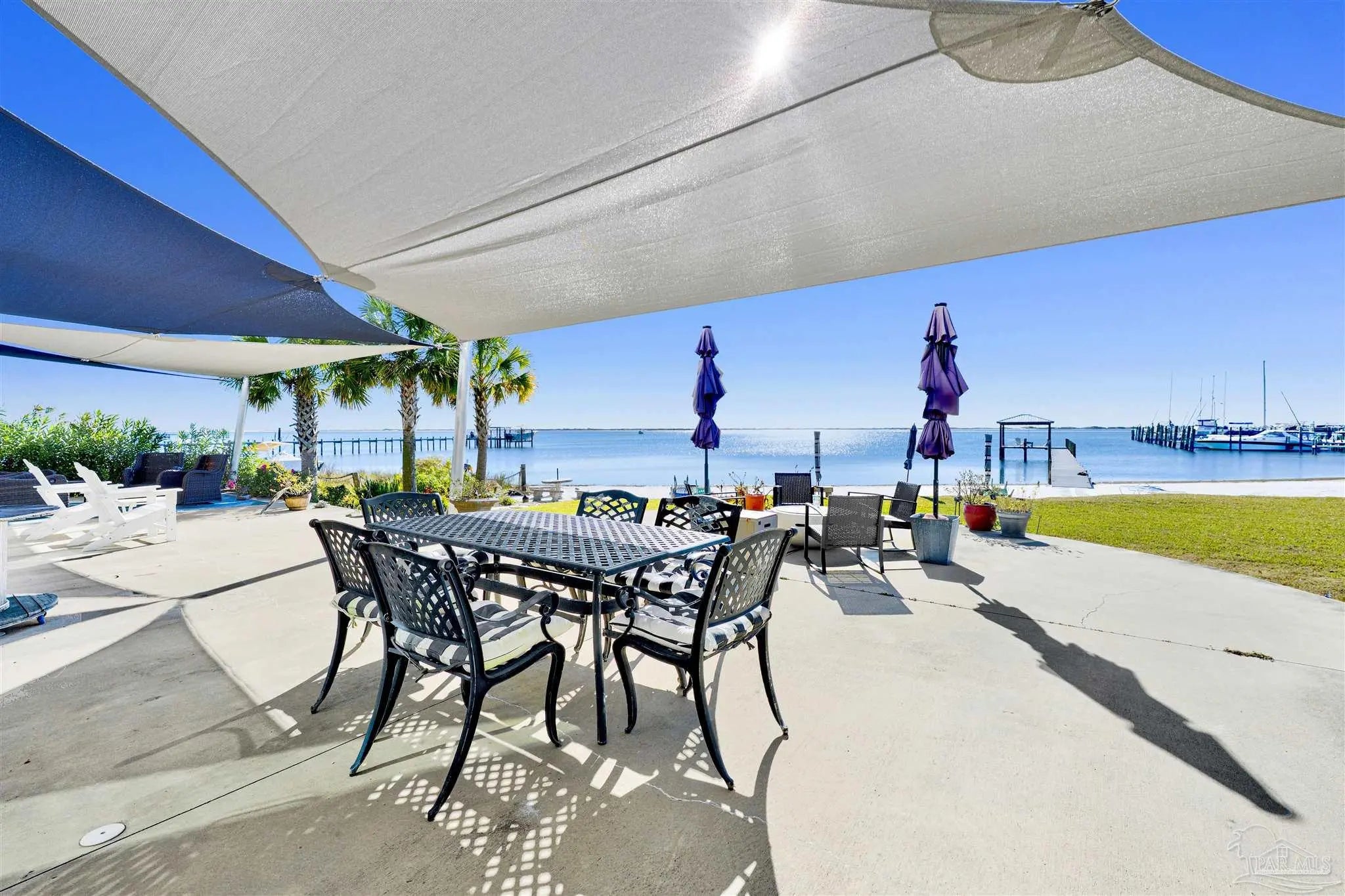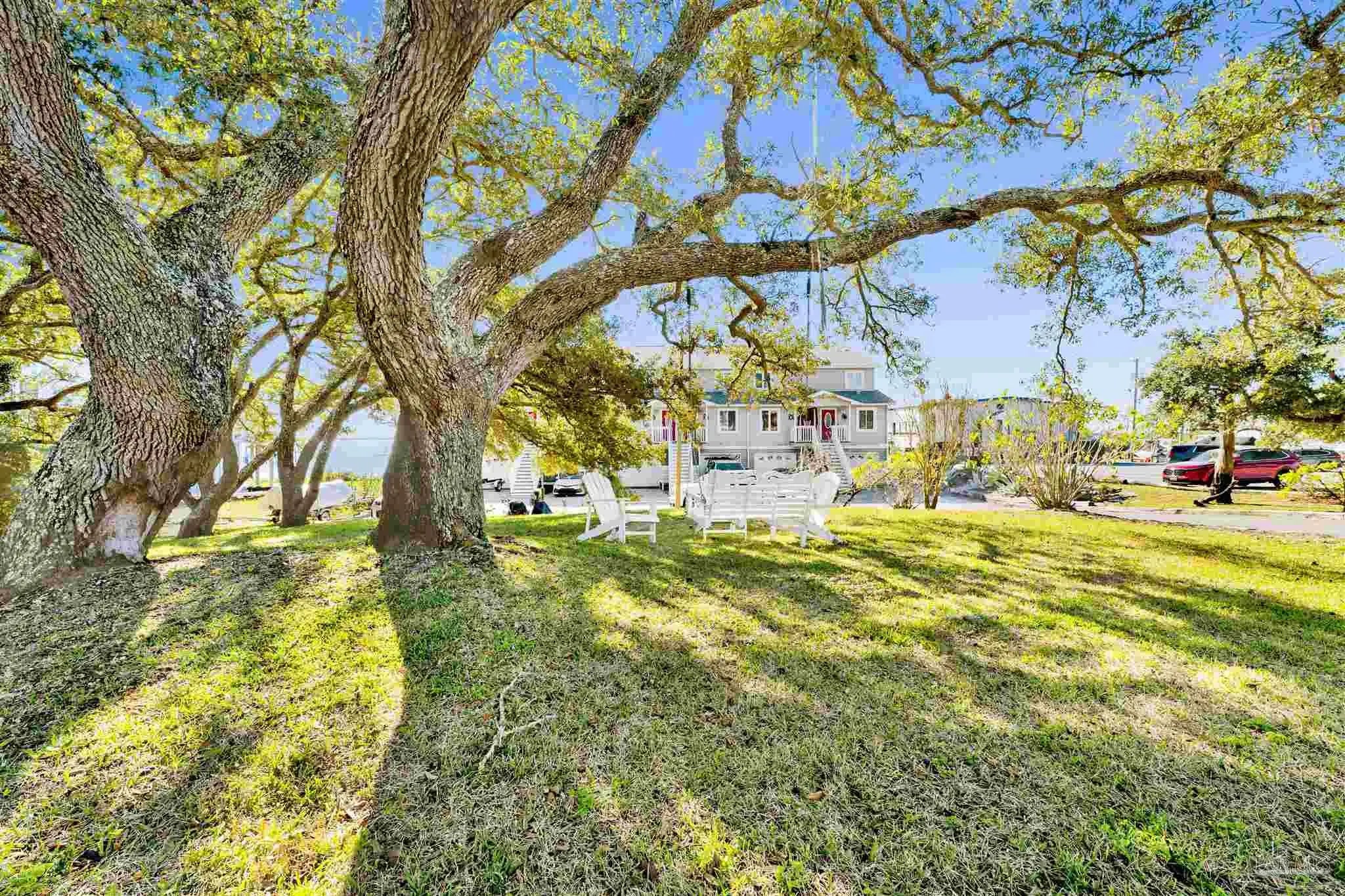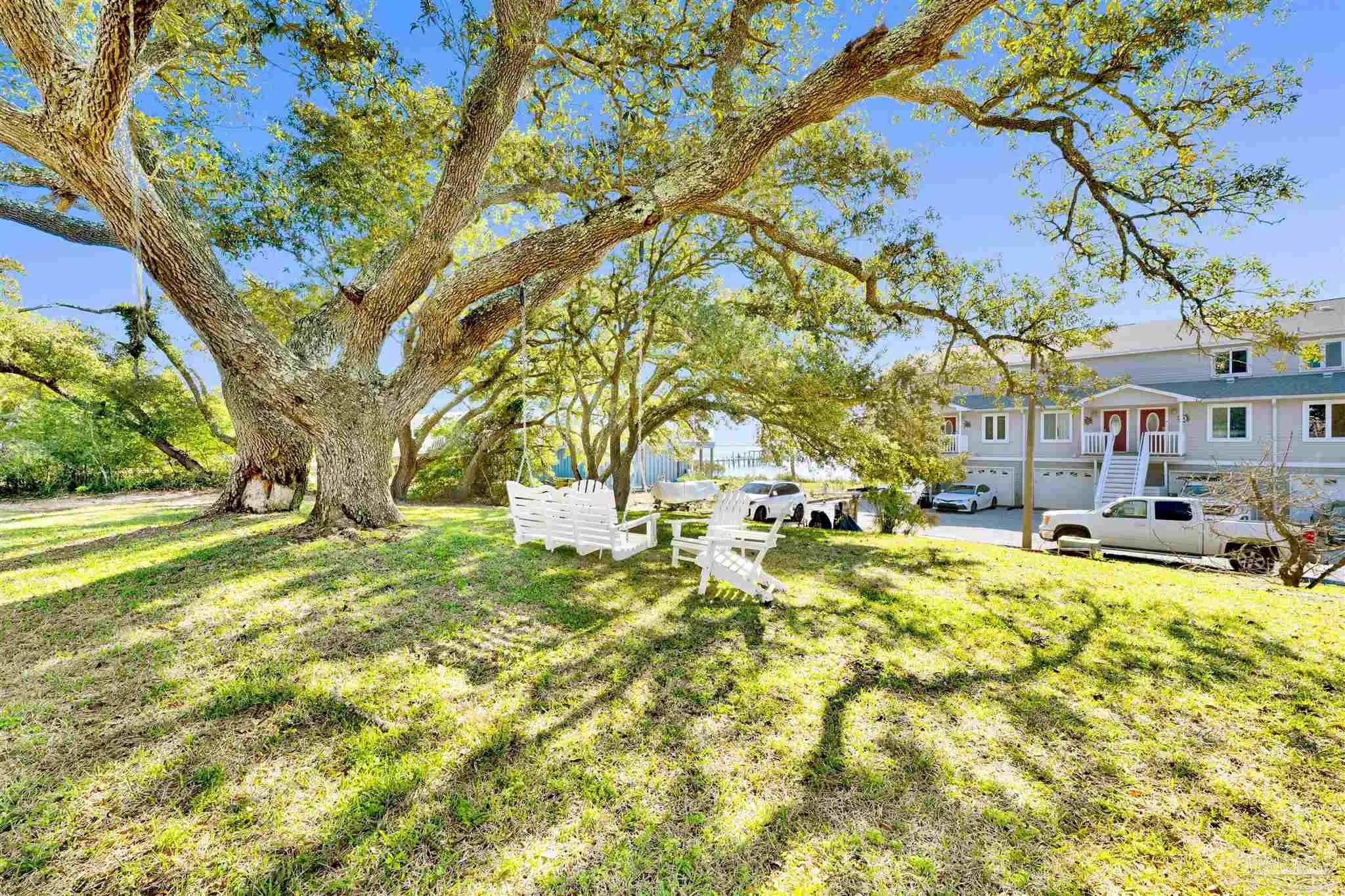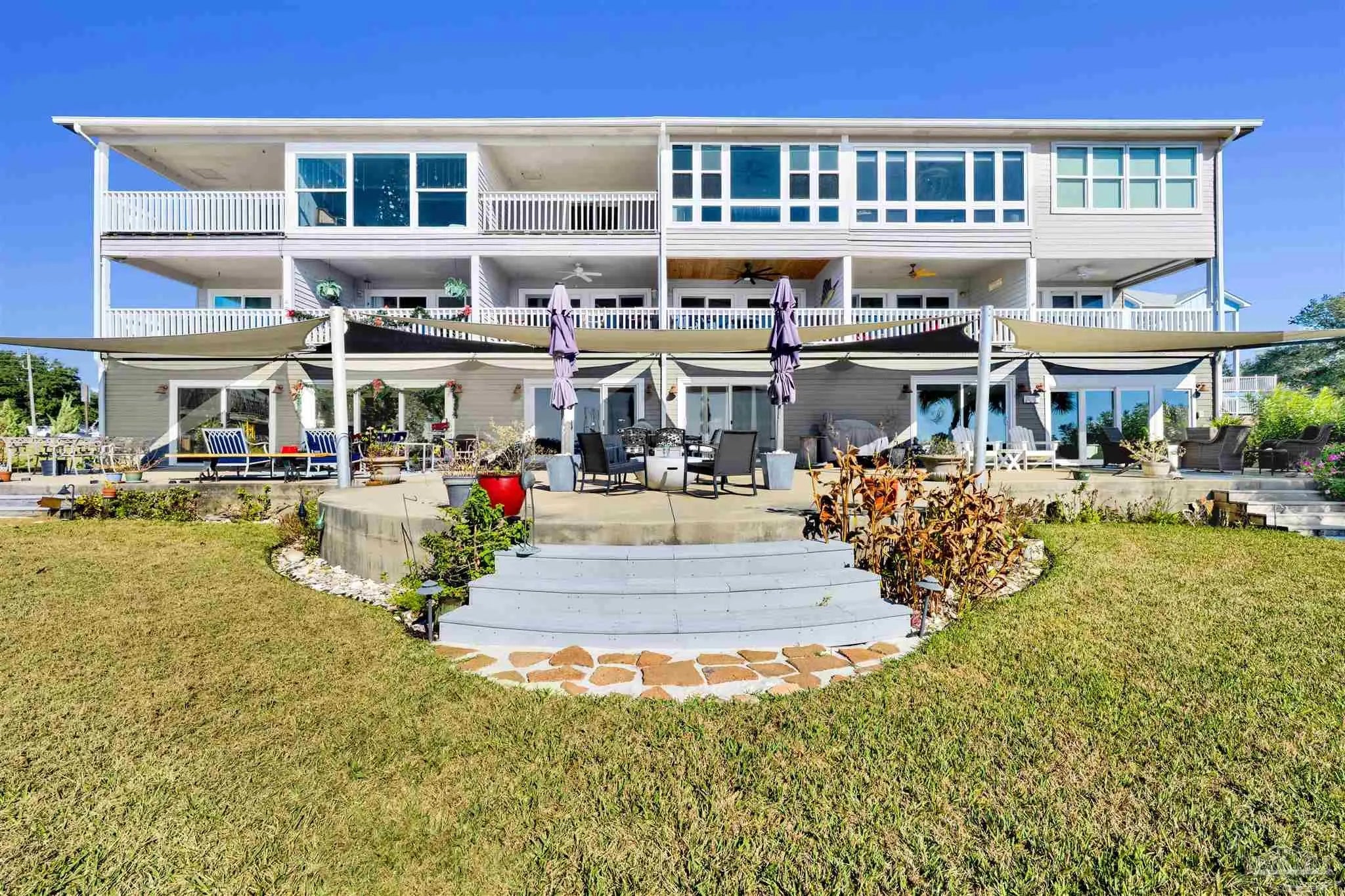 Enjoy living on gorgeous Grand Lagoon with stunning direct blue green water views from all three levels of this beautifully updated 2 Bedroom, 2.5 Bath residence! Recent upgrades include a kitchen remodel with granite counters, new cabinetry, durable 12mm LVP flooring, 2023 appliances with wine cooler, all new sliding glass doors, and an HVAC system replaced just two years ago. Private Community Pier with new composite decking! Outdoor living shines with a new sun sail, fire pit, and direct access to serene surroundings. The upper level hosts a spacious primary suite with an en-suite bath and expansive windows framing beautiful water views, and an additional bedroom with en-suite full bath. A secondary living area on the lower level opens to the back patio, creating a seamless indoor-outdoor flow ideal for relaxing or entertaining. The ground level also features a private gym space along with a garage with workshop area, perfect for hobbies or storage. Boat lovers will appreciate the yacht club next door with social memberships and boat slips - minutes from Pensacola Pass! Take in sweeping views of Big Lagoon, Gulf Islands National Seashore, and the Gulf. The property's location makes this a rare opportunity for both full-time living or a coastal retreat. Make sure to watch the Virtual Tour Video! Buyer to verify all information during due diligence.